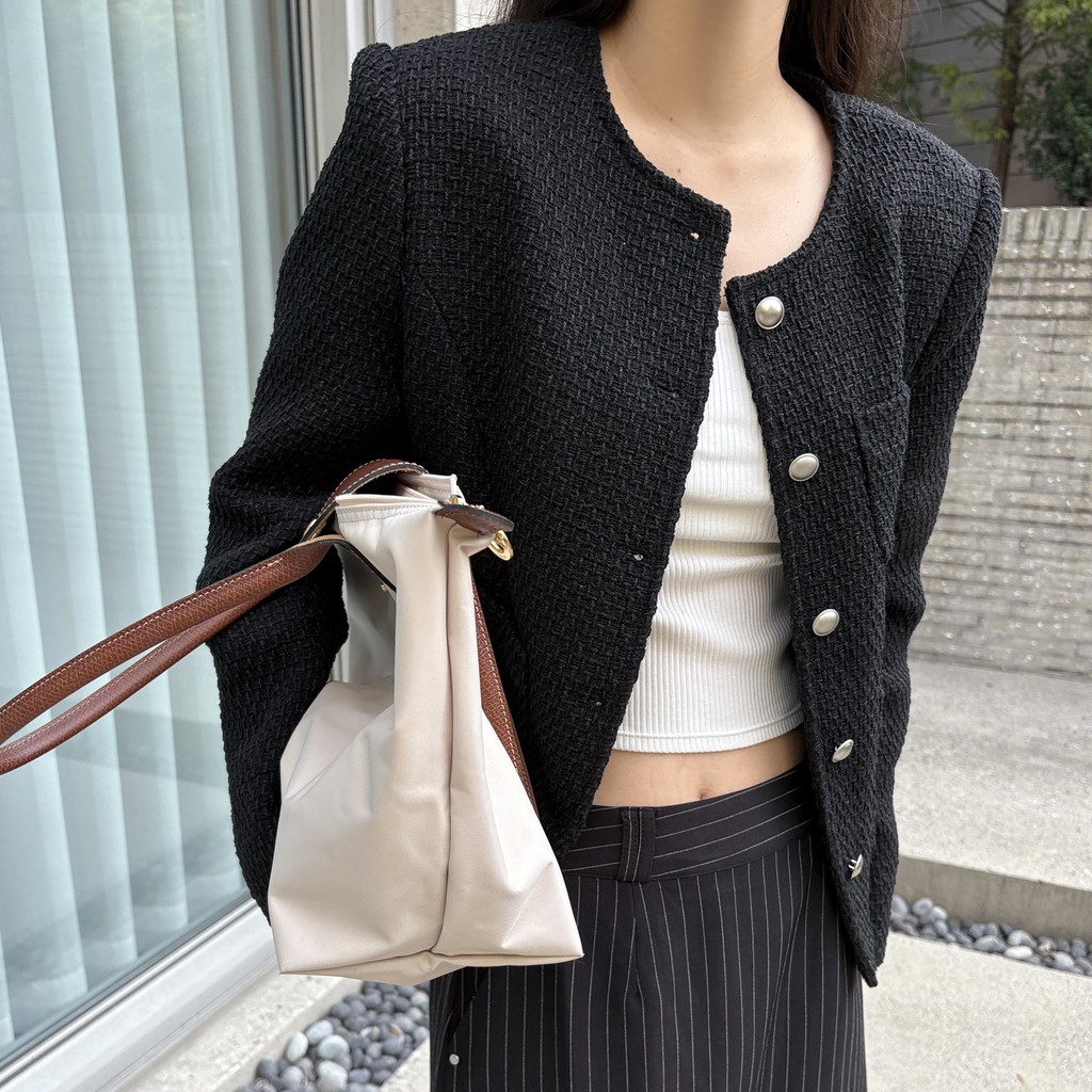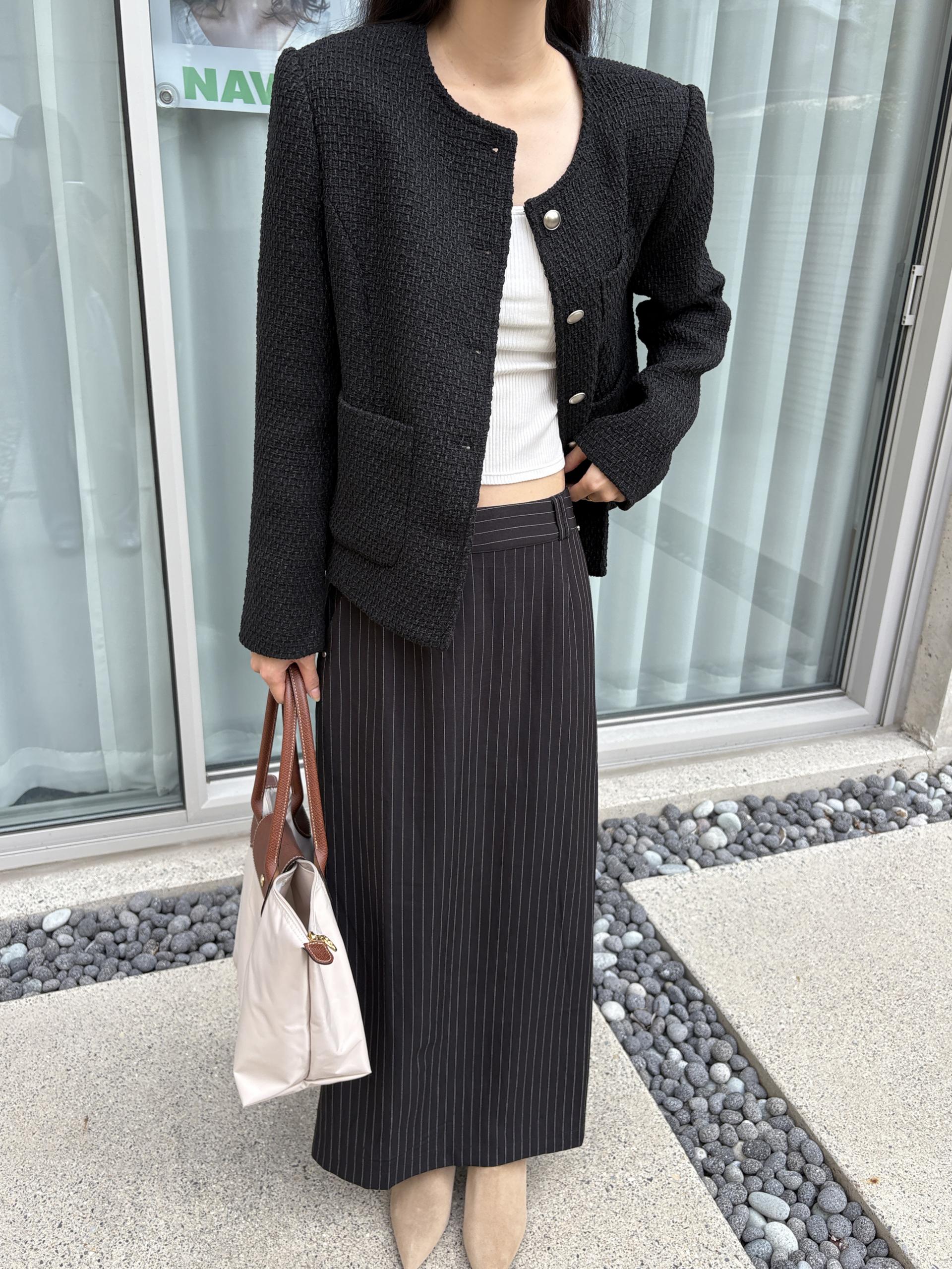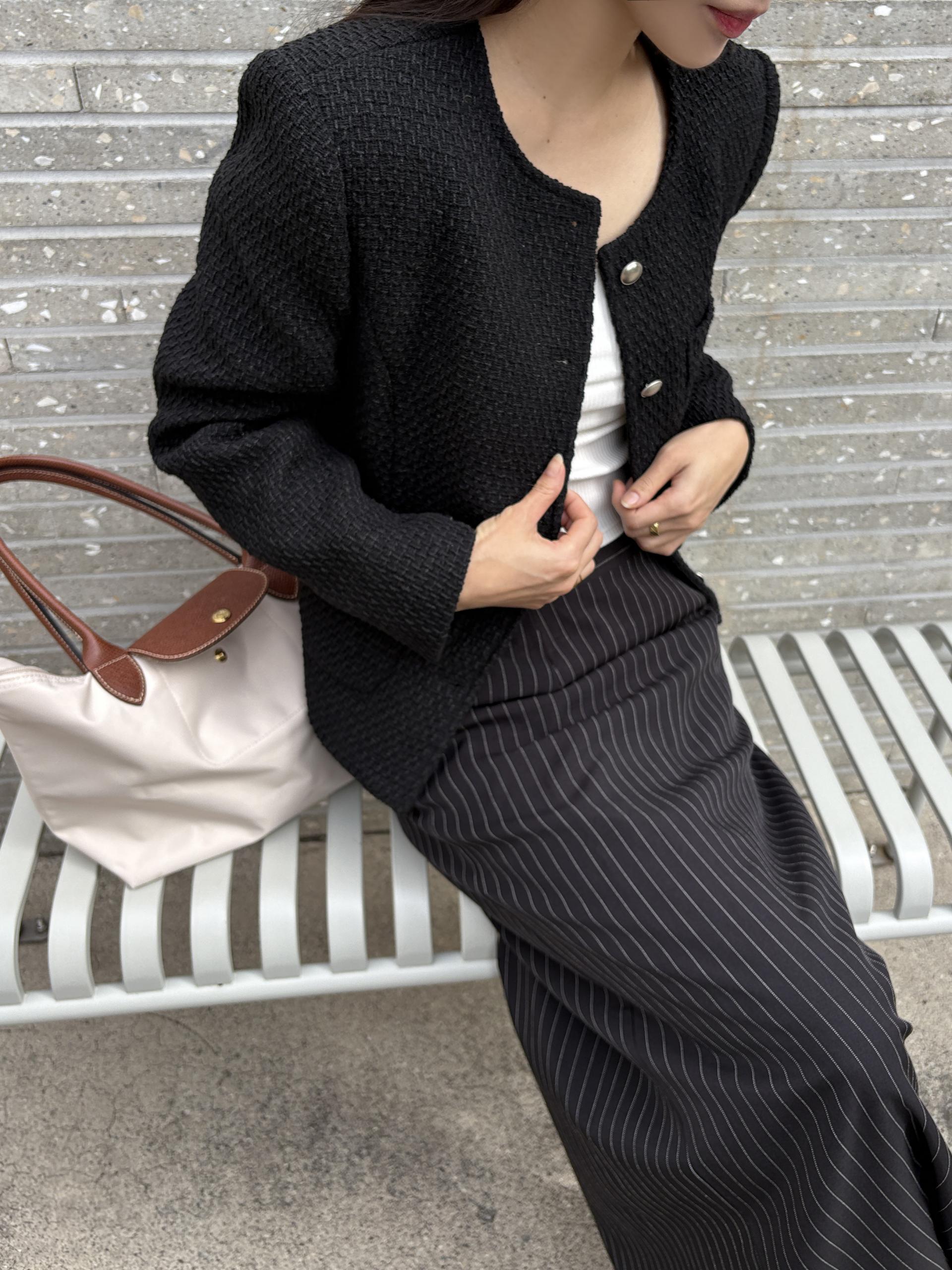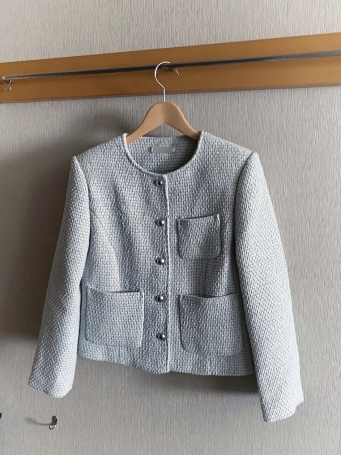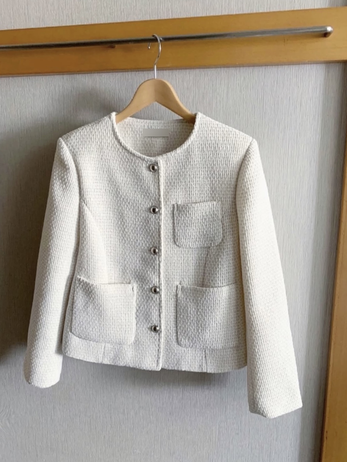 세련된 무드가 느껴지는 노카라 트위드 자켓입니다.