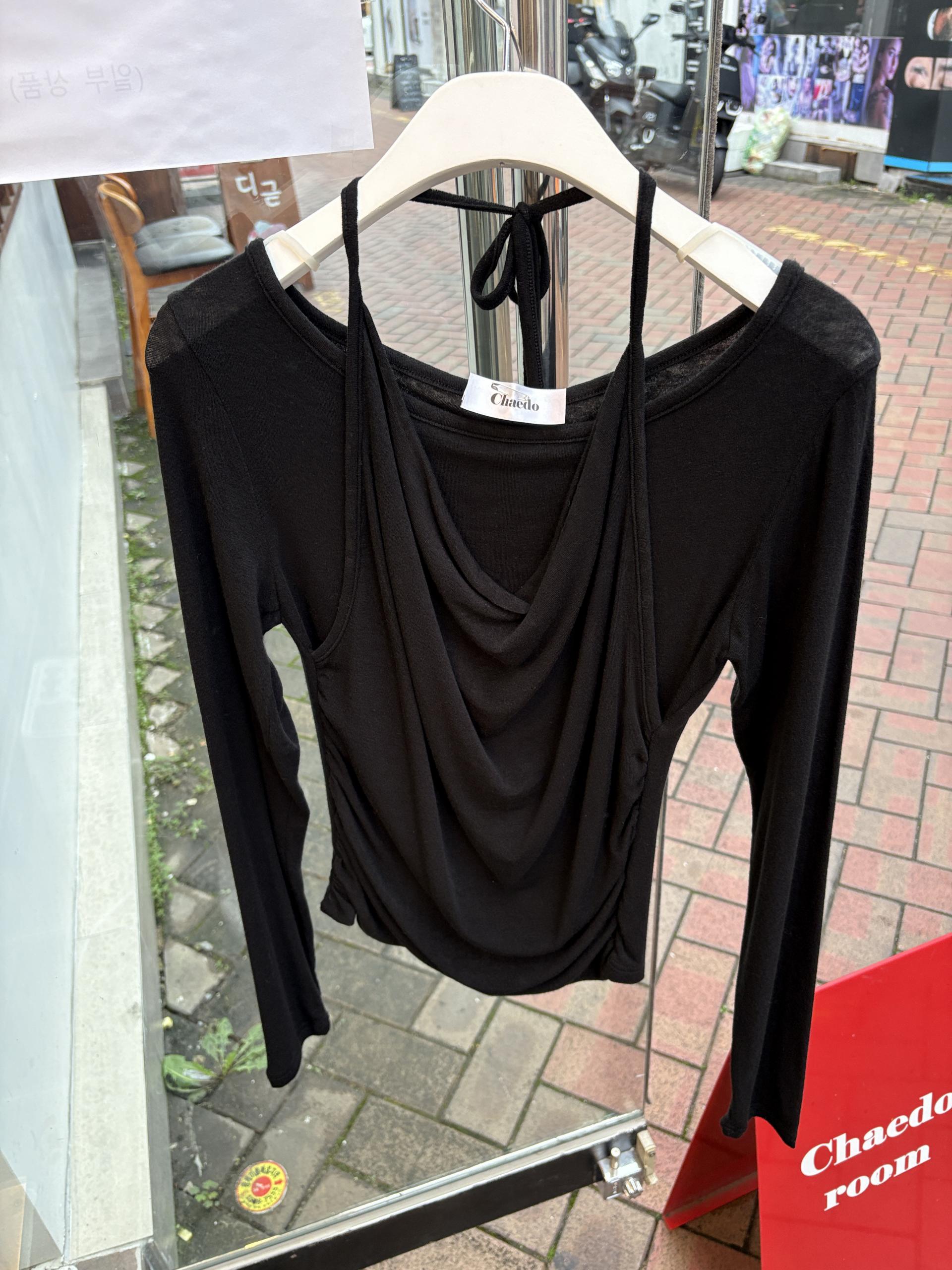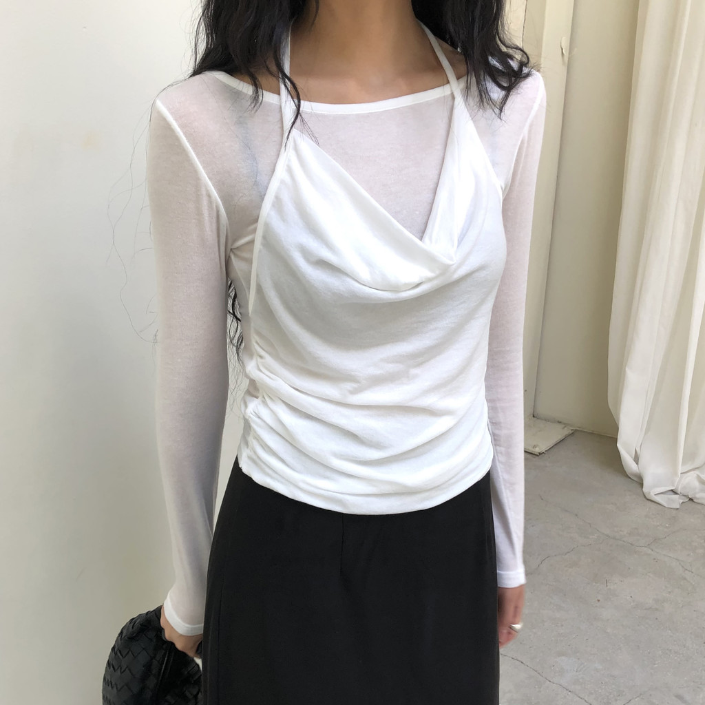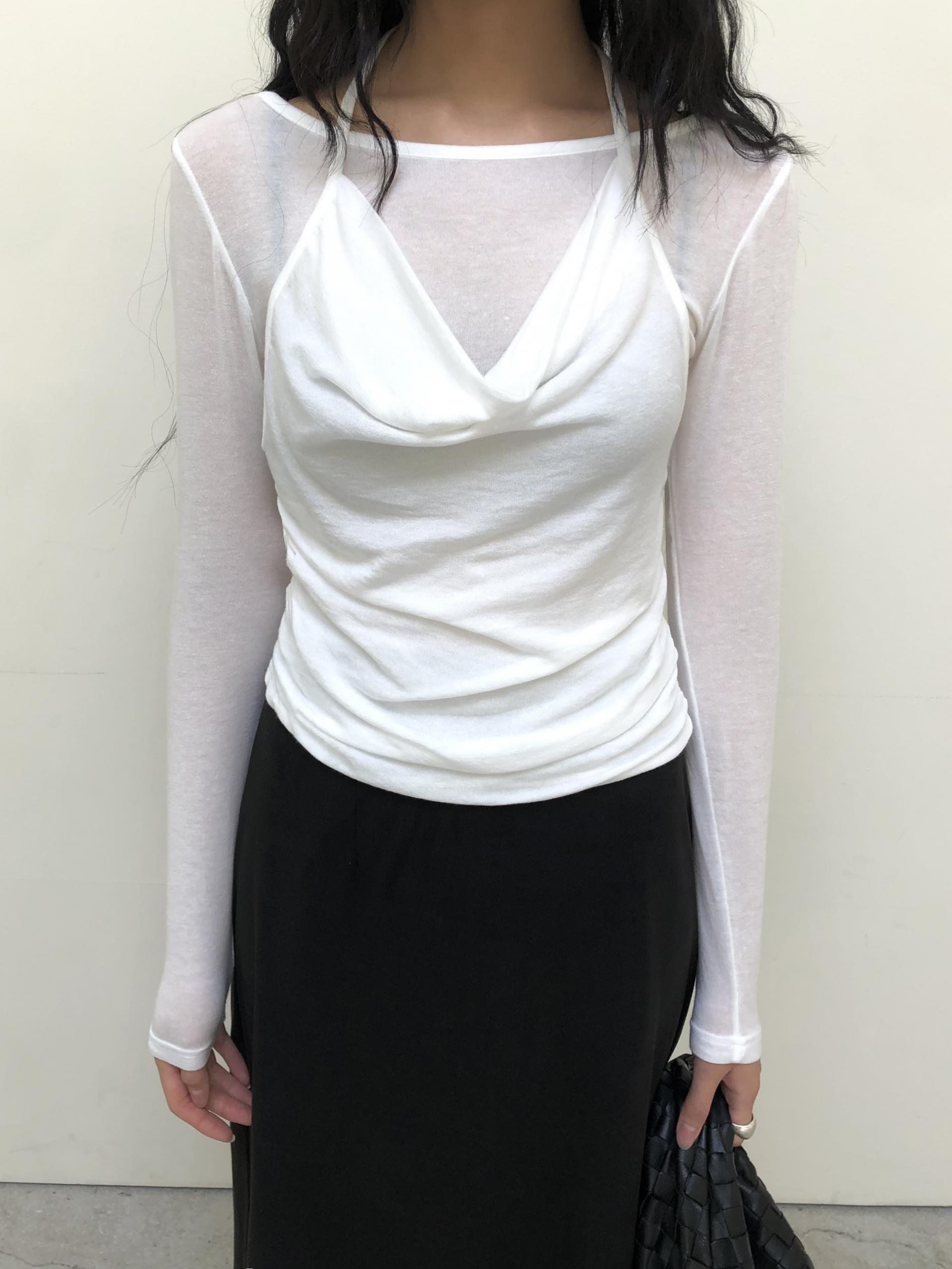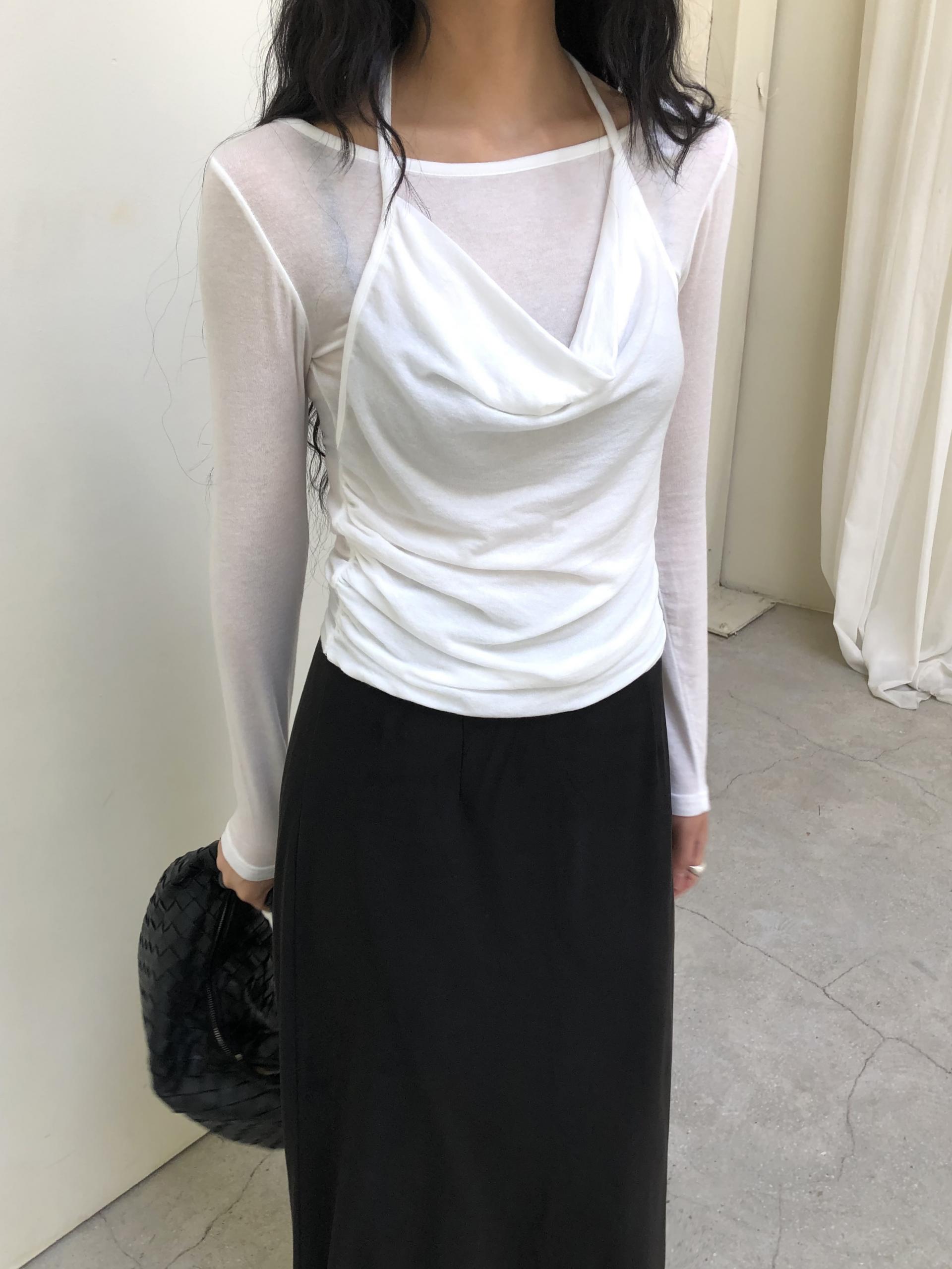 홀터넥 뷔스티에가 부착된 디자인의 레이어드 세트 티셔츠입니다.