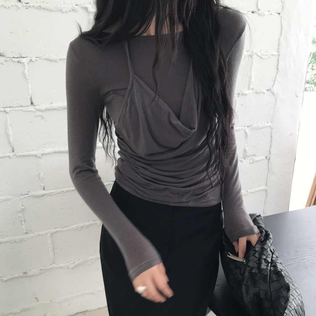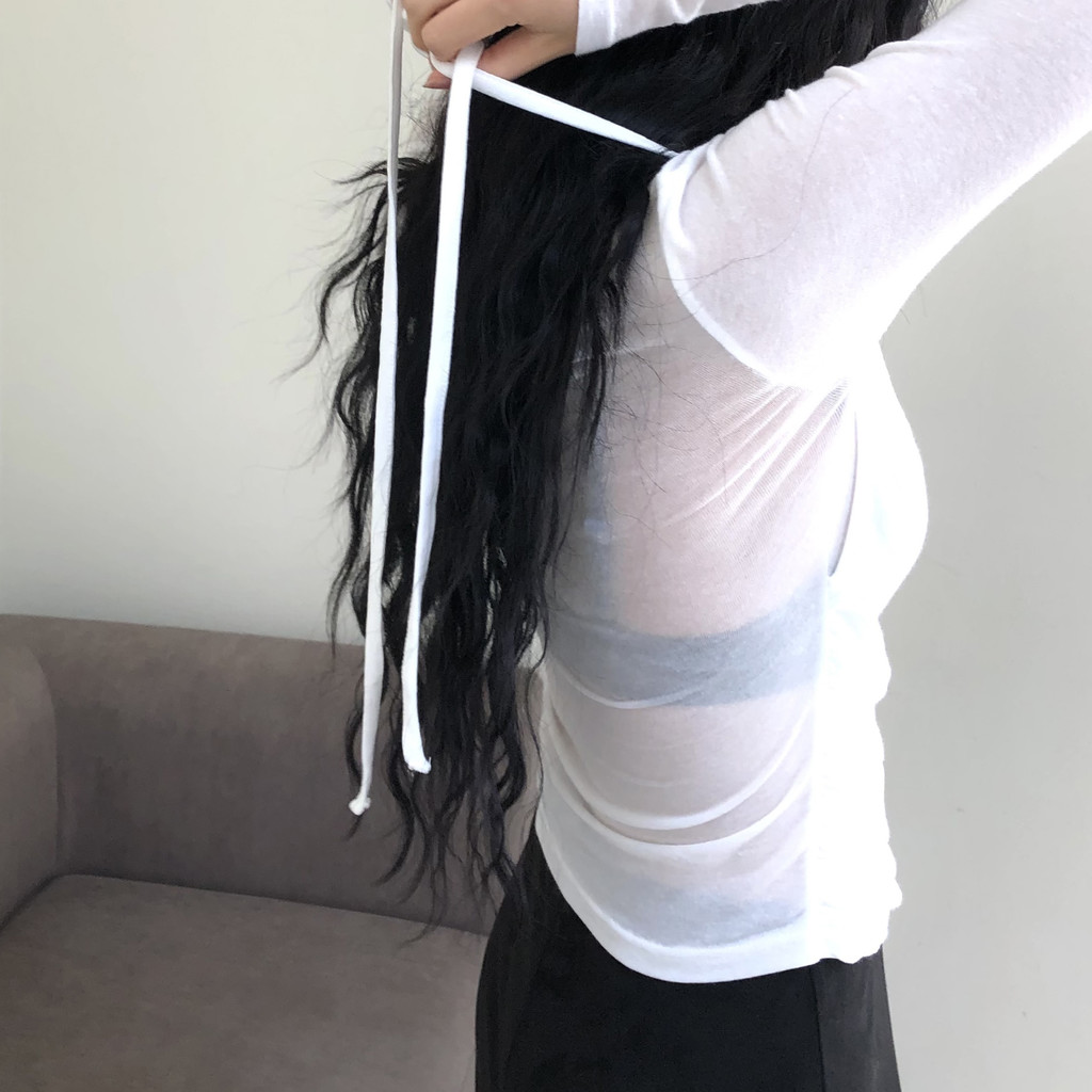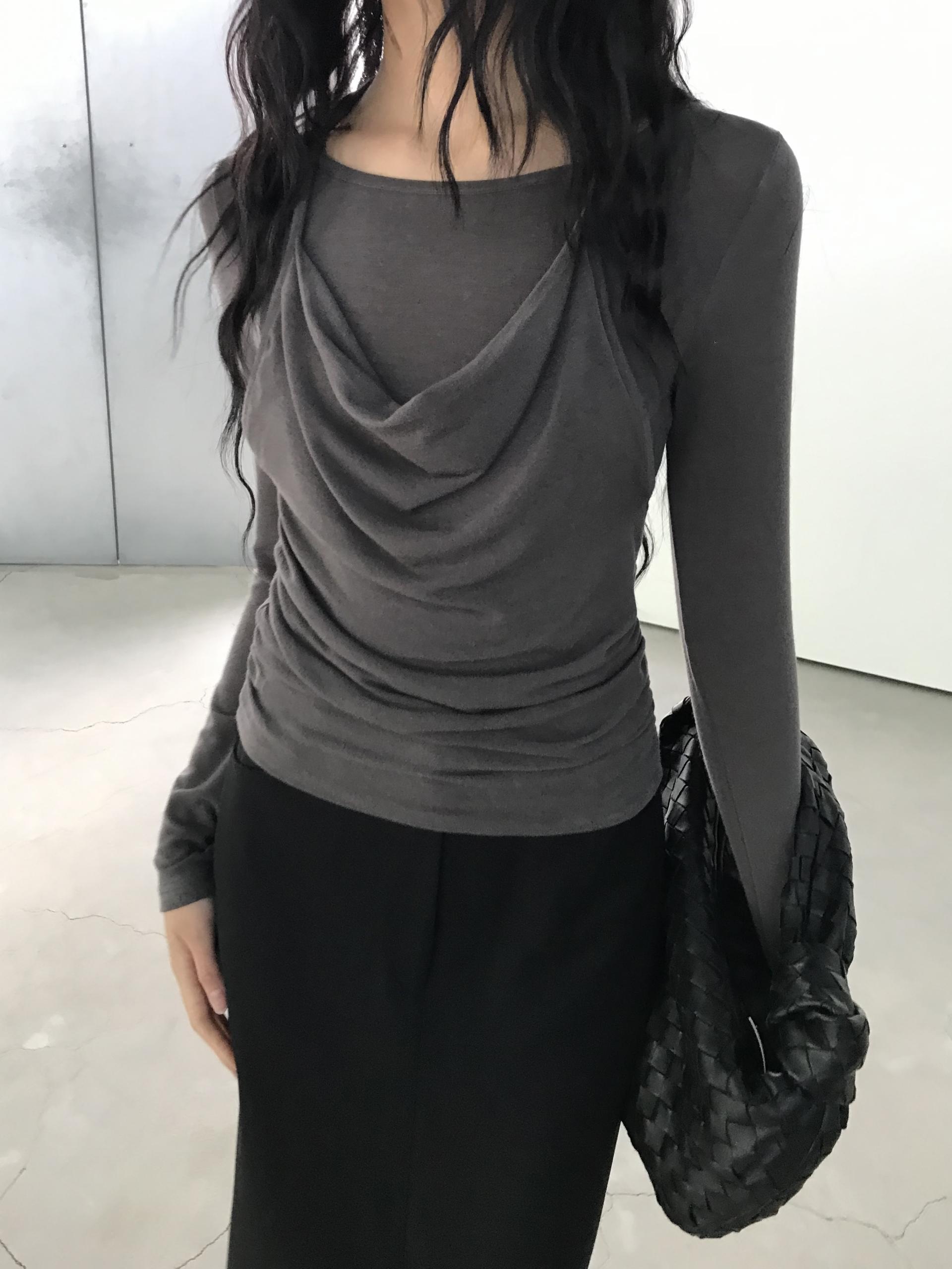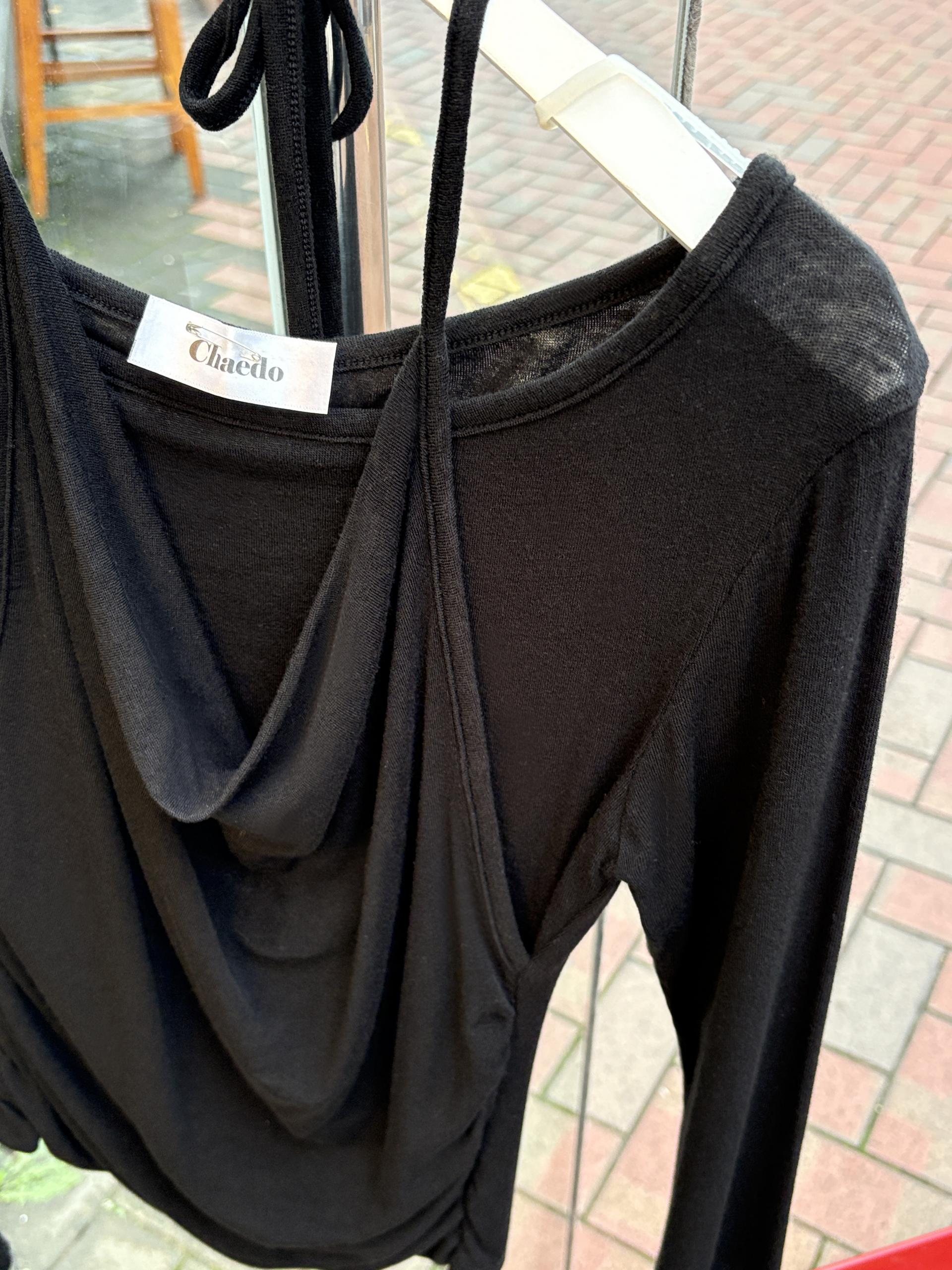 홀터넥 뷔스티에가 부착된 디자인의 레이어드 세트 티셔츠입니다.