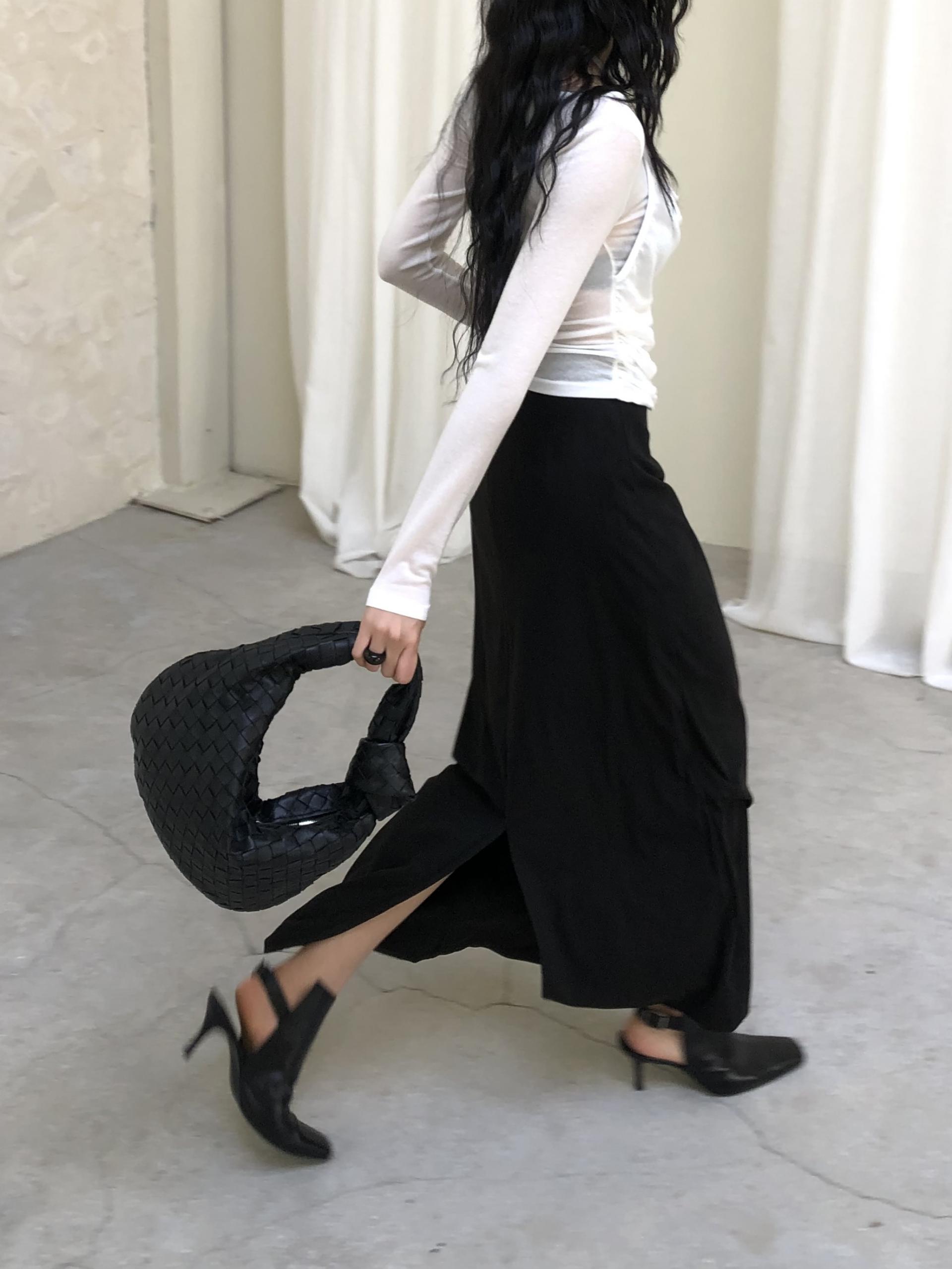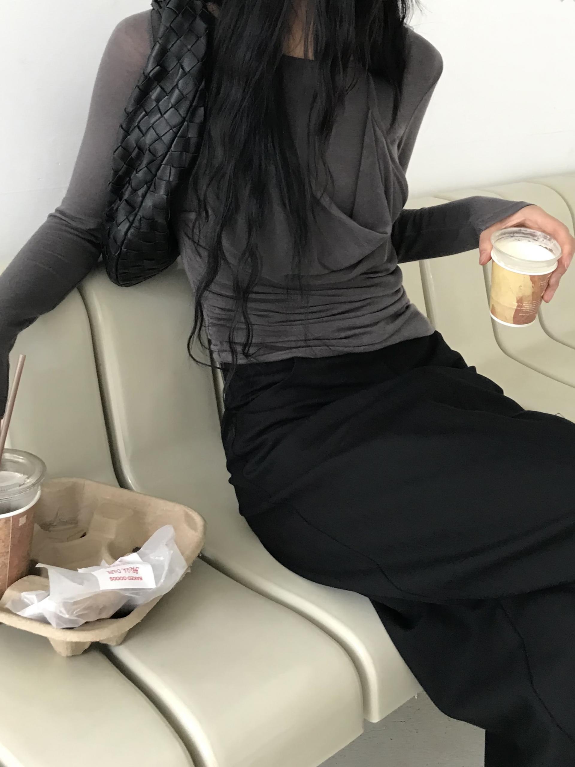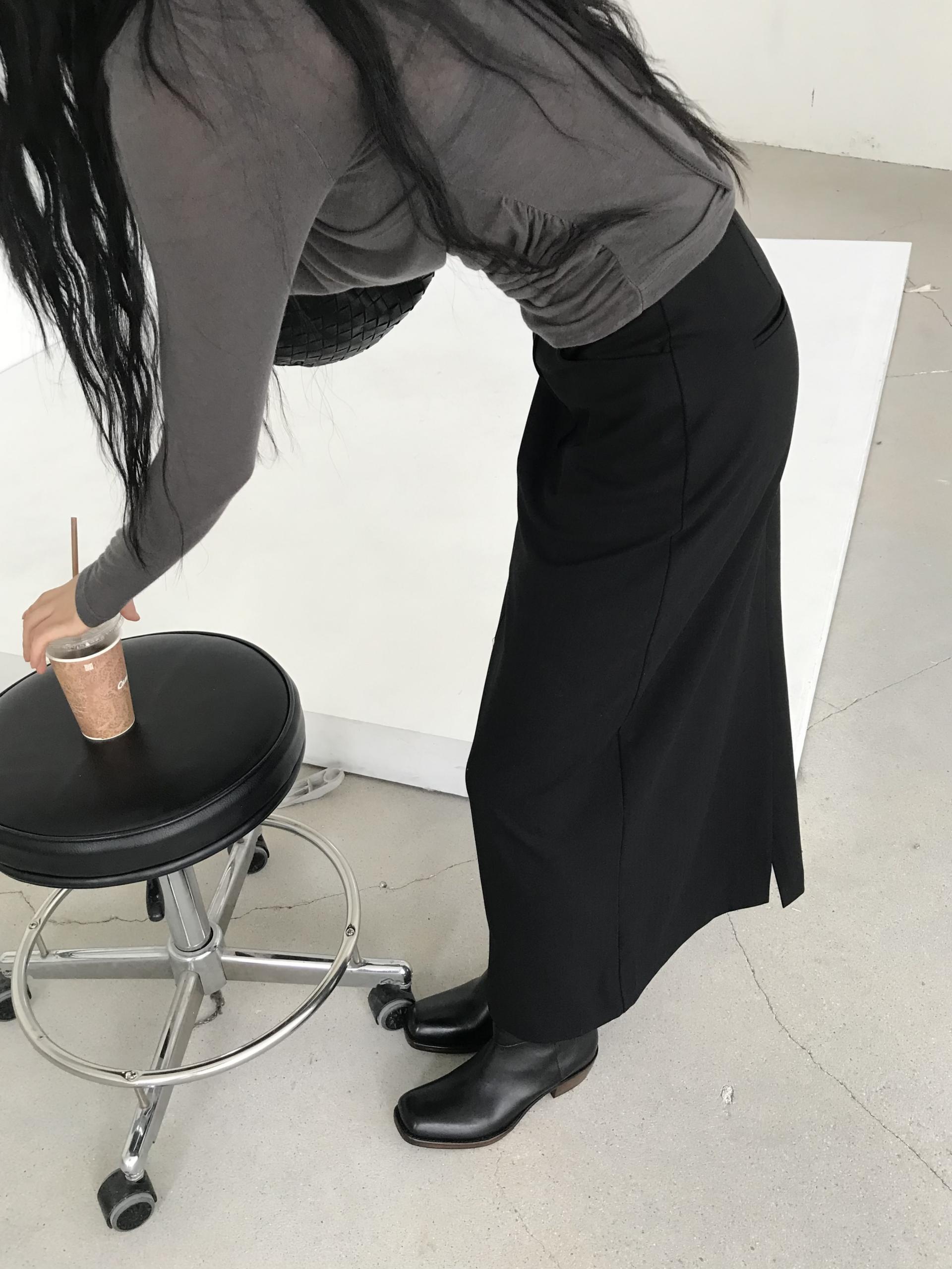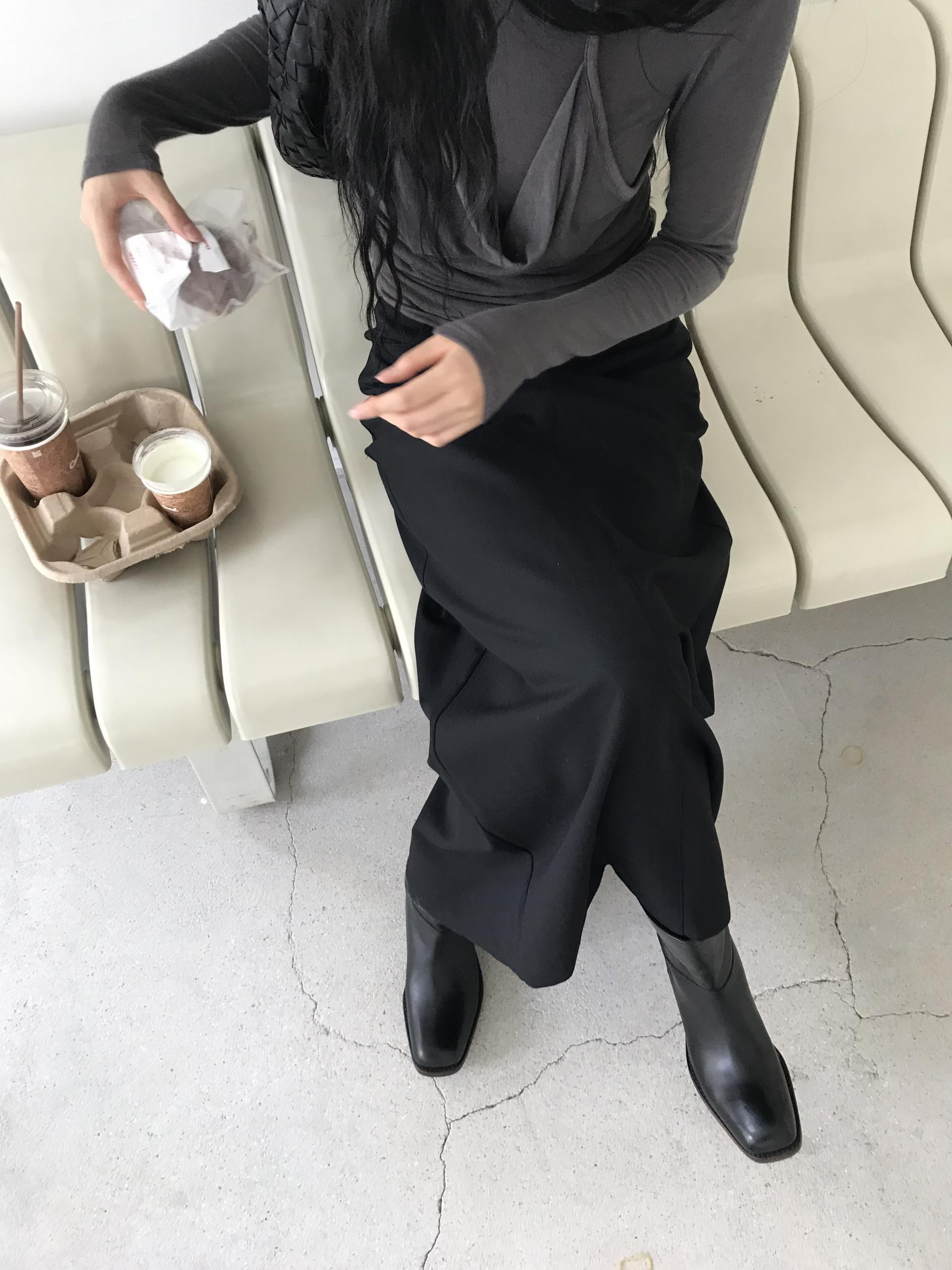 슬림핏이지만 앞 판의 원단이 두 겹이고, 전면에 셔링이 잡혀 부담 없이 착용 가능하다는 점도 너무 만족스러웠던 포인트입니다. 허리에 셔링이 잡히면서 밑단이 약간 둥글게 잡혀서 허리도 더 잘록해 보이는 핏이에요.