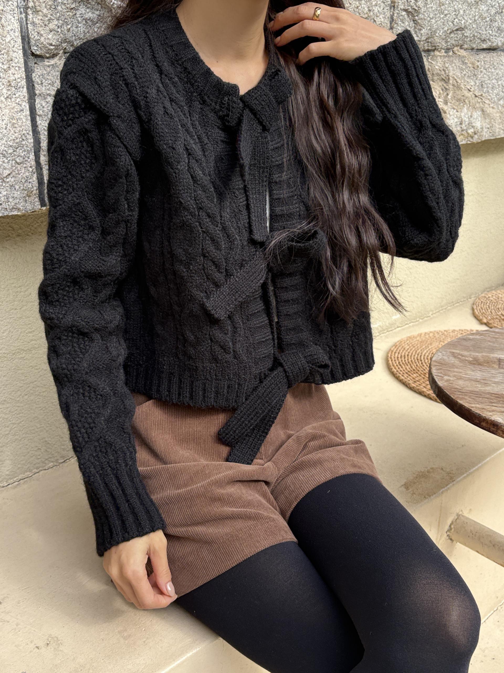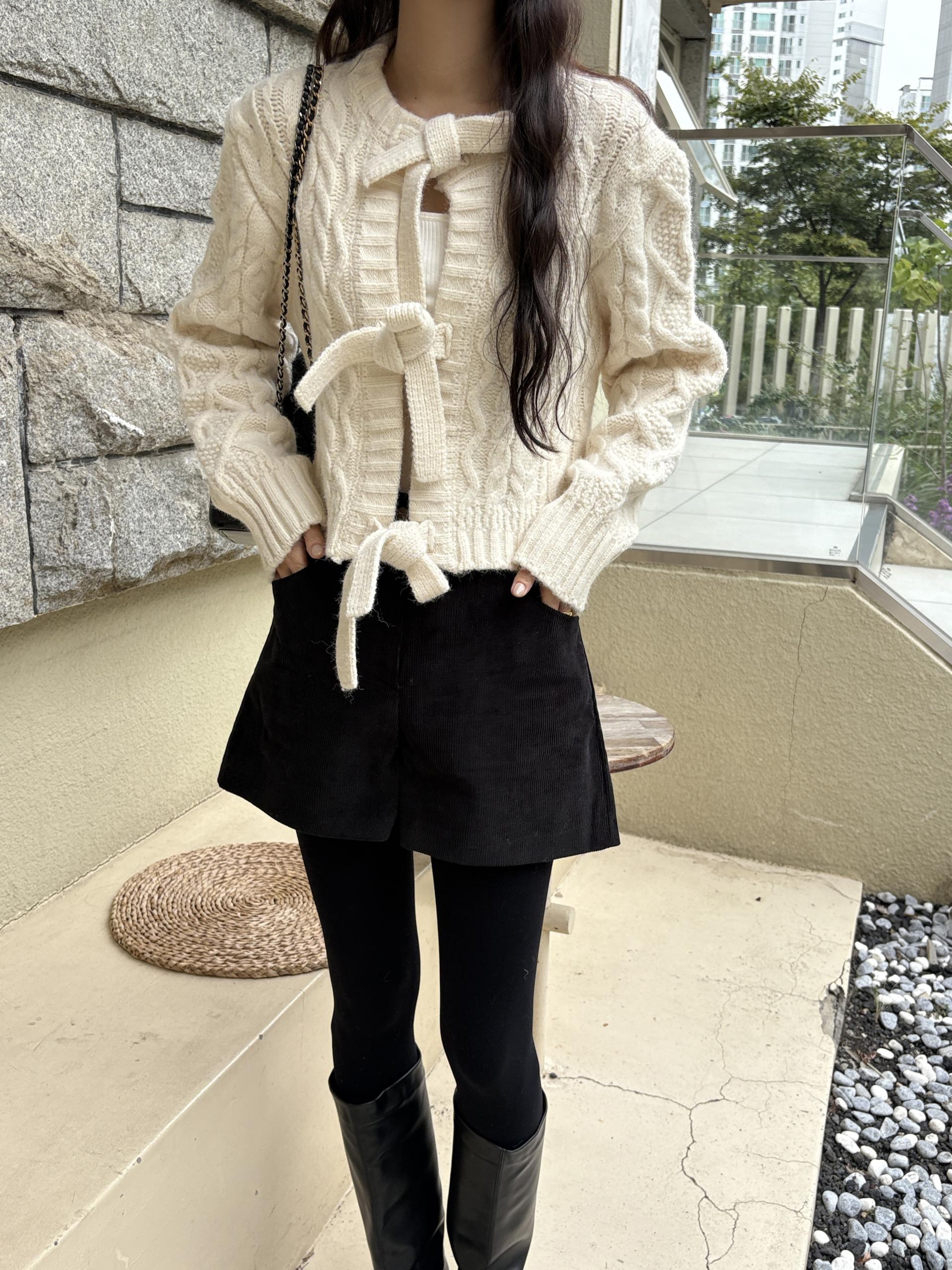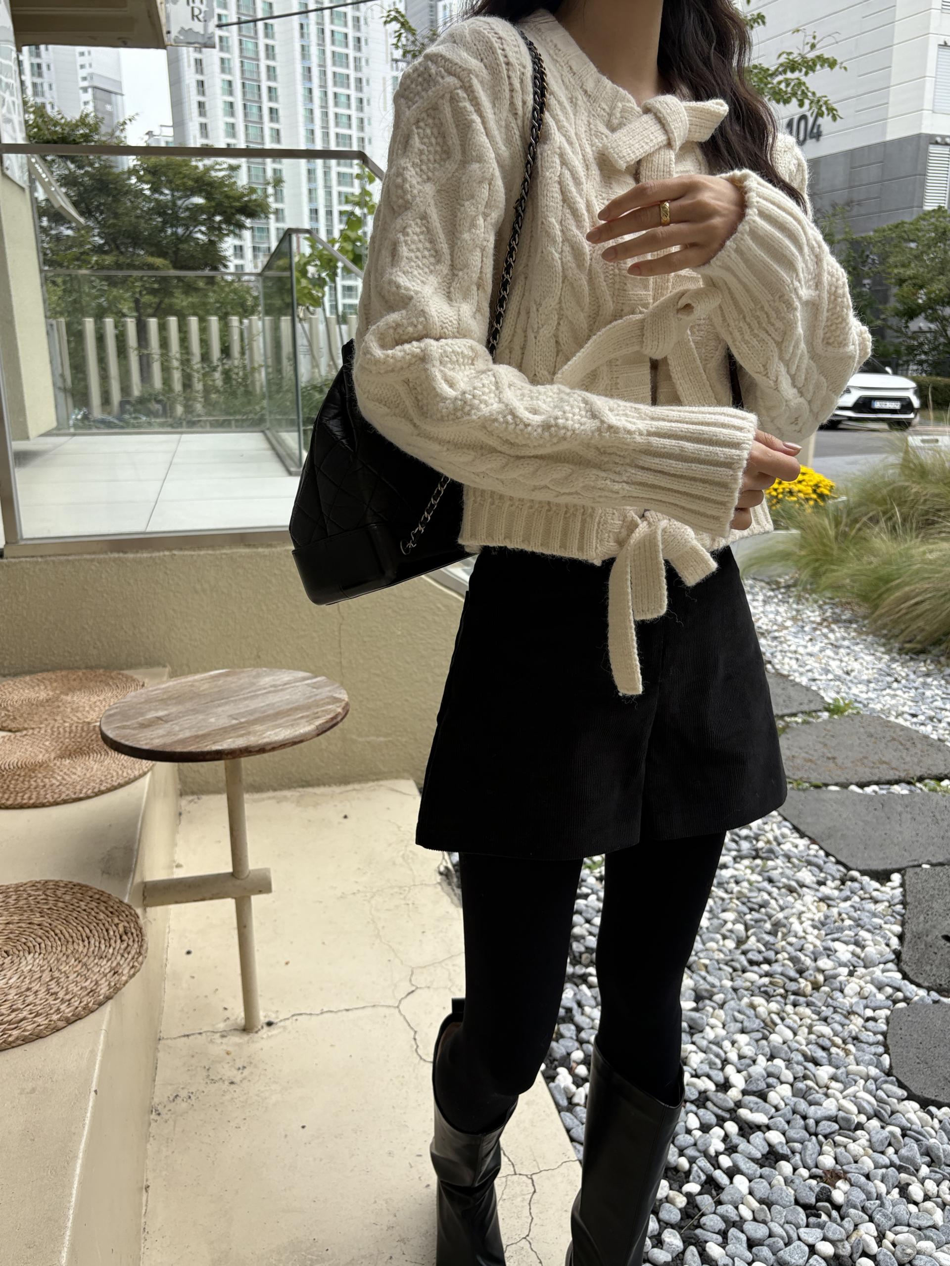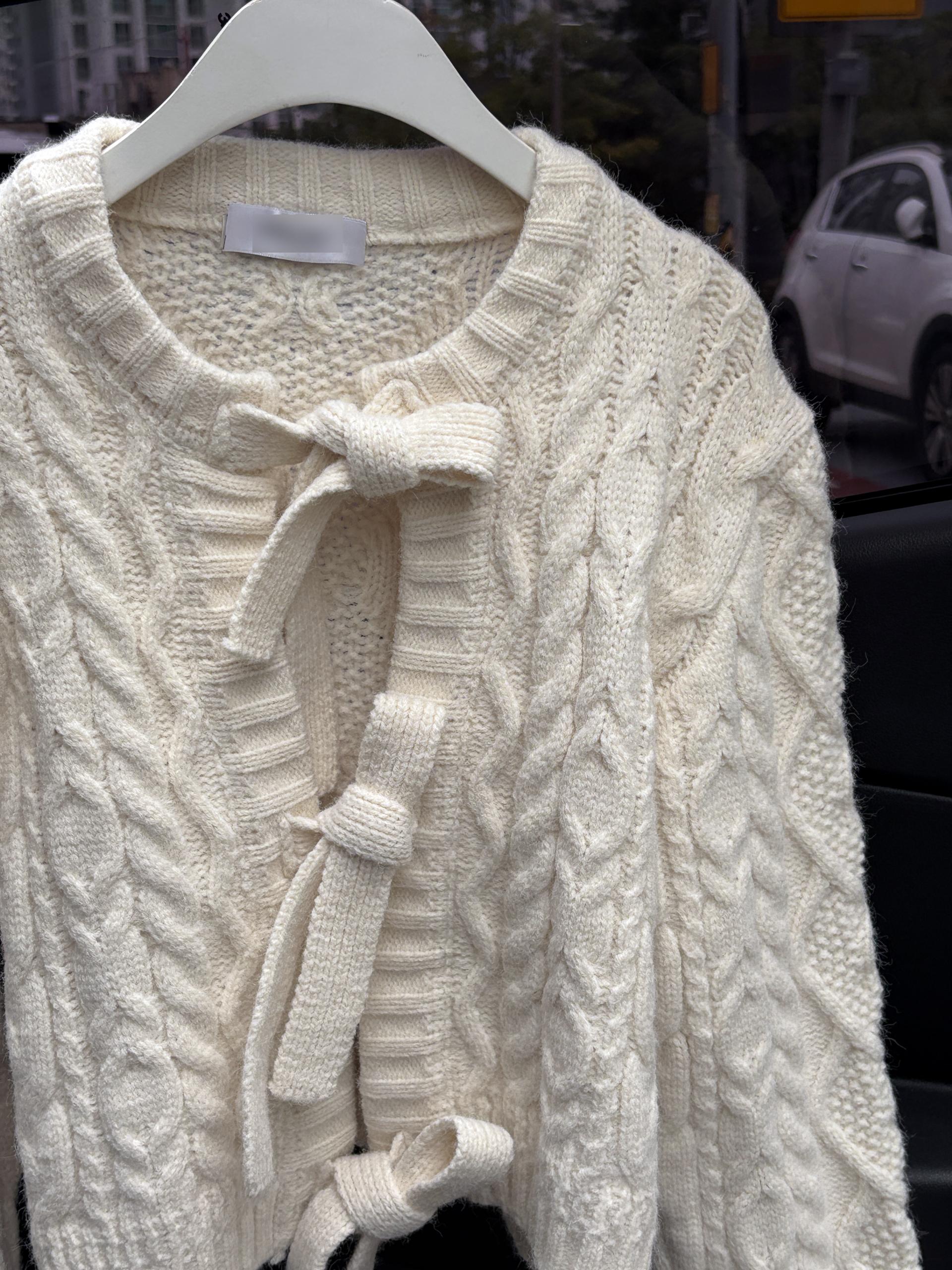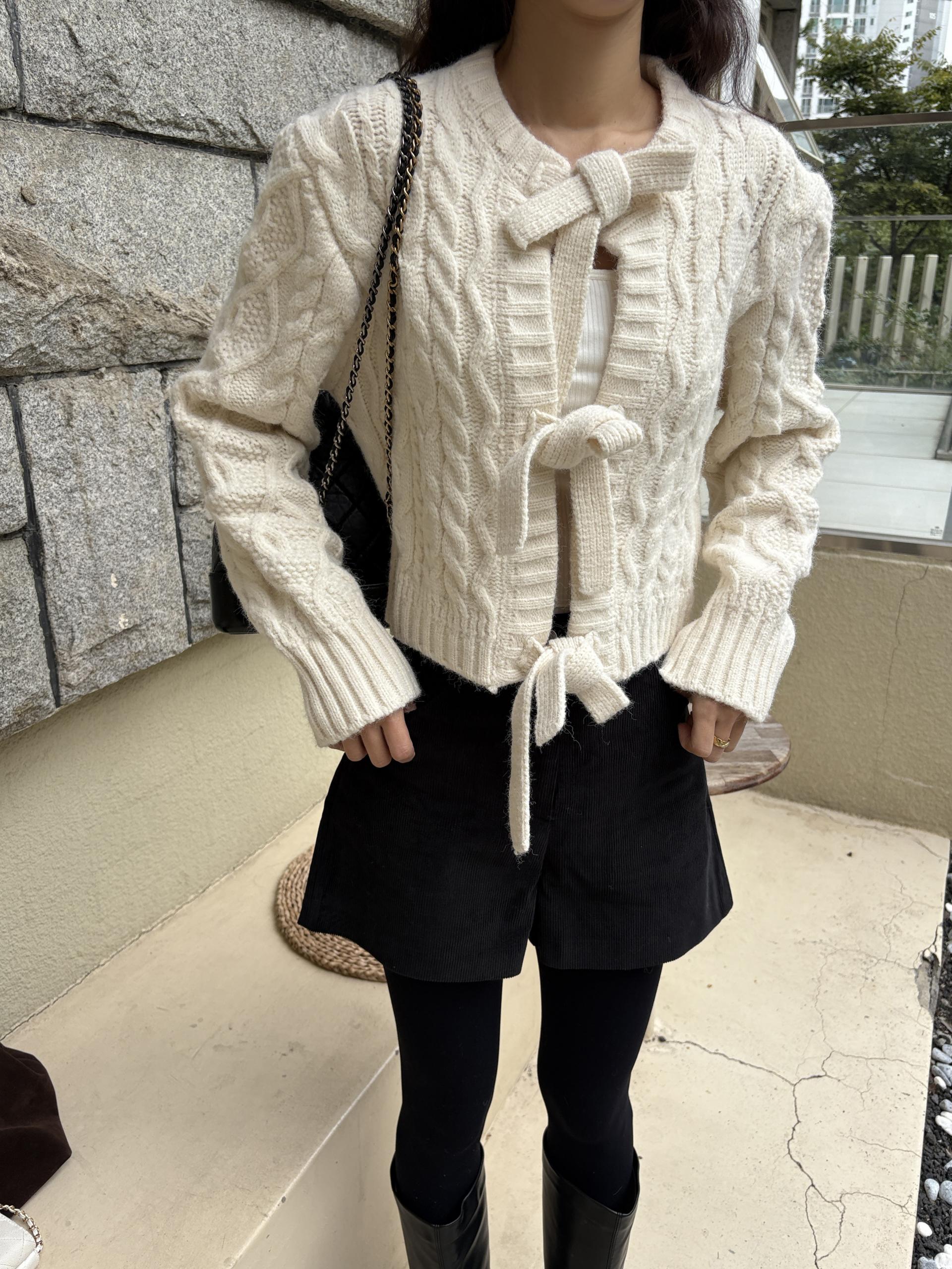 전체적으로 도톰한 꽈배기 짜임으로 포근한 착용감을 주며, 리본 타이 여밈 디테일이 포인트가 되어 사랑스럽고 여성스러운 분위기를 연출합니다.