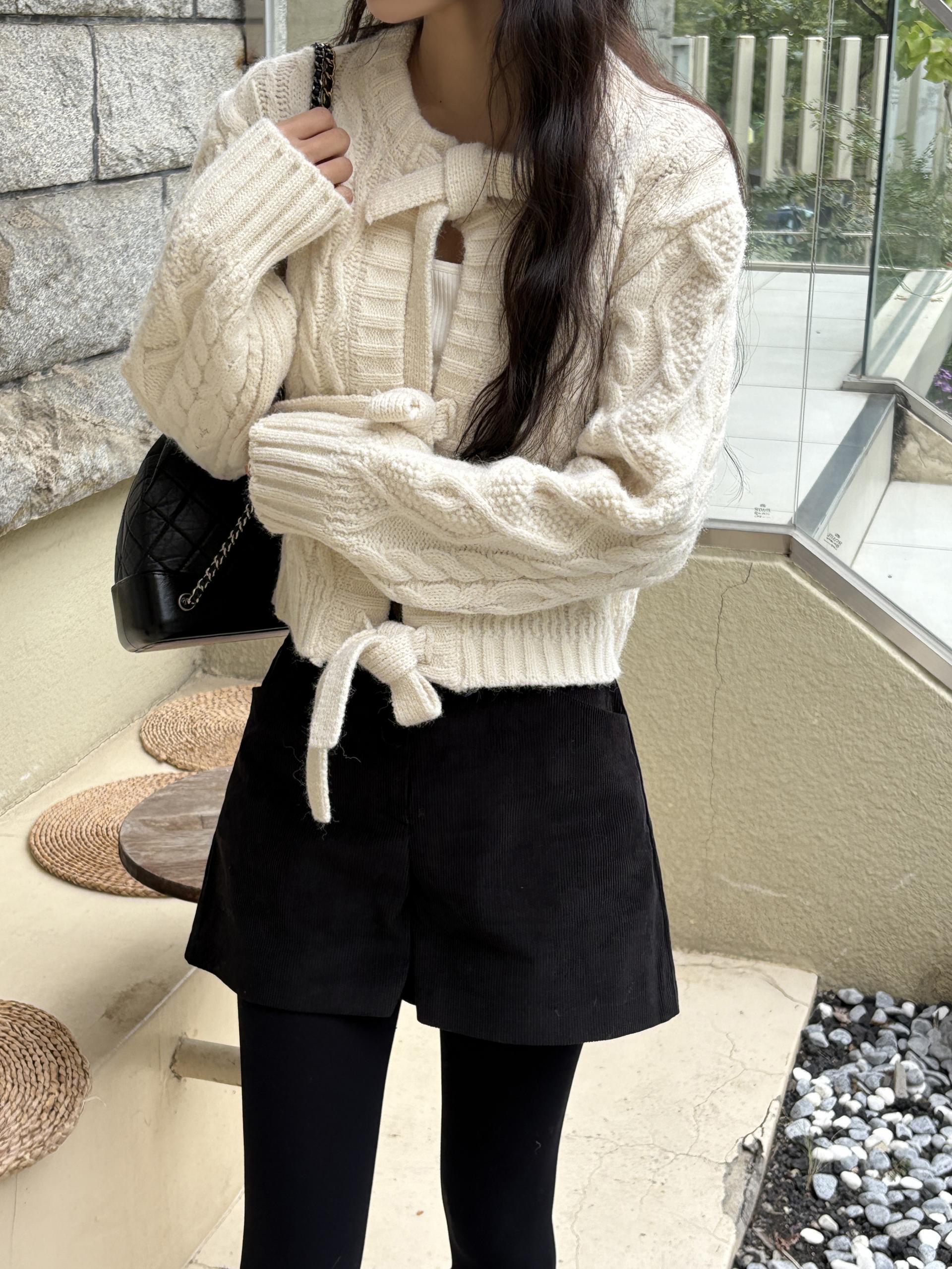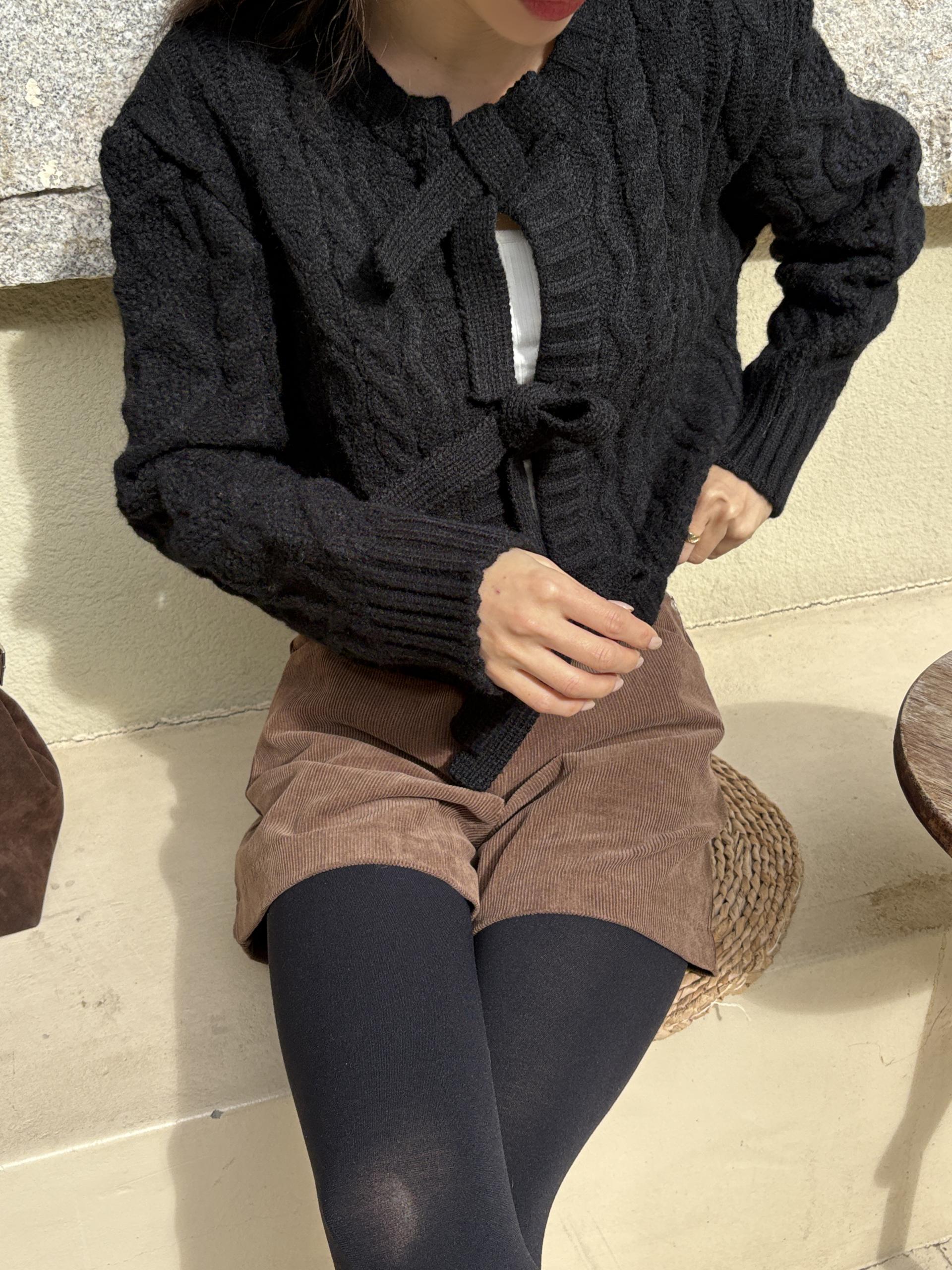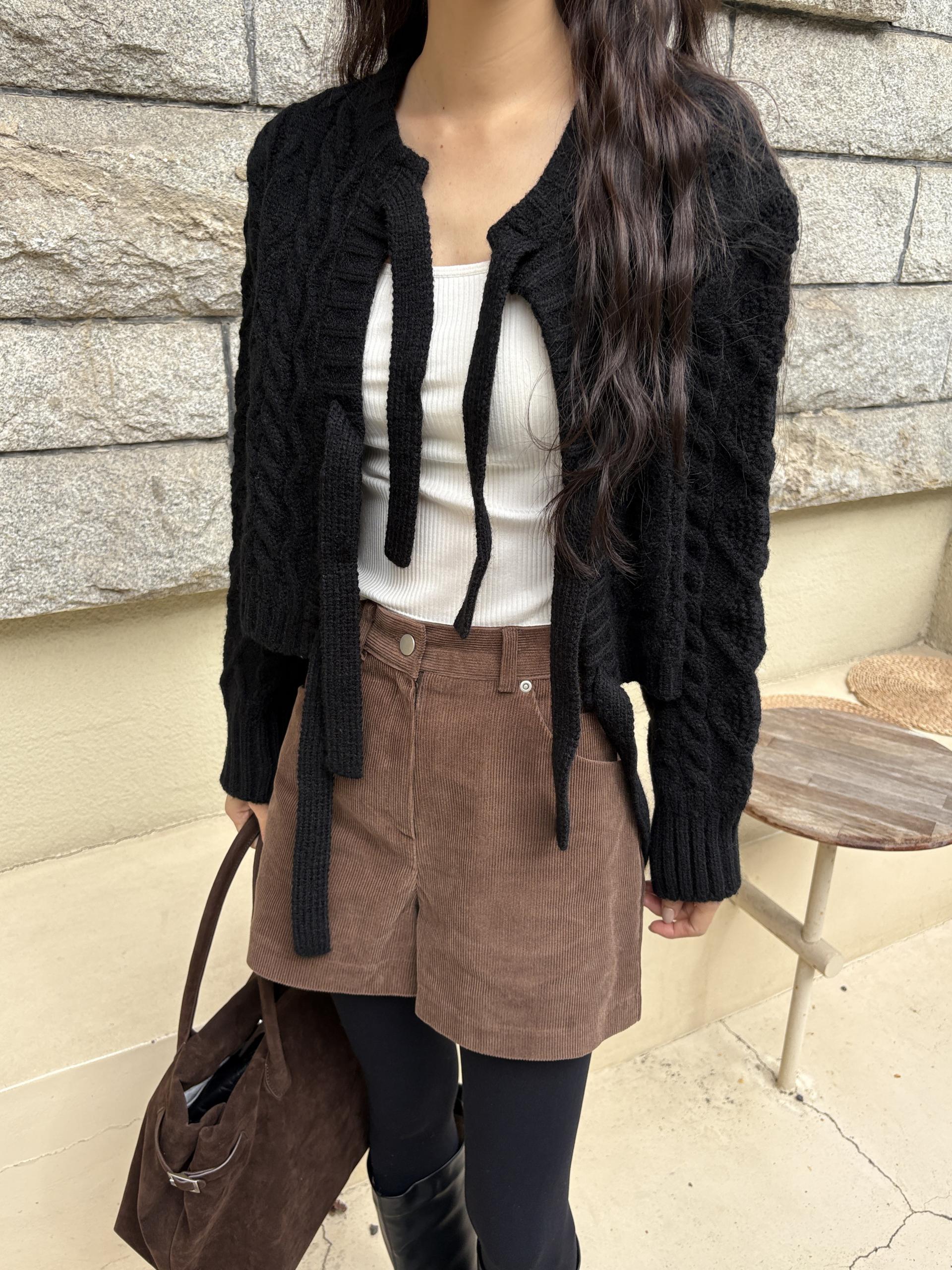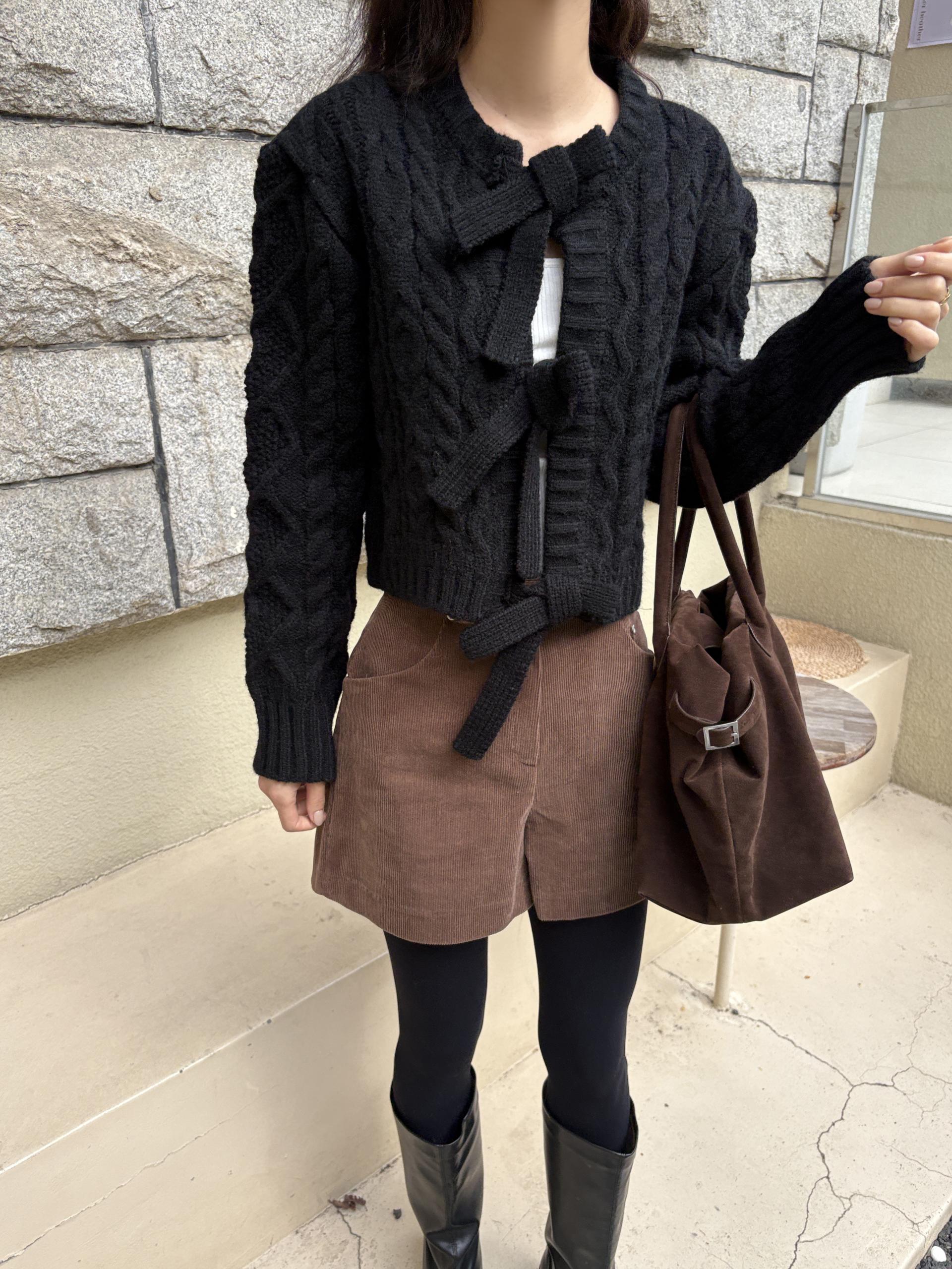 전체적으로 도톰한 꽈배기 짜임으로 포근한 착용감을 주며, 리본 타이 여밈 디테일이 포인트가 되어 사랑스럽고 여성스러운 분위기를 연출합니다.