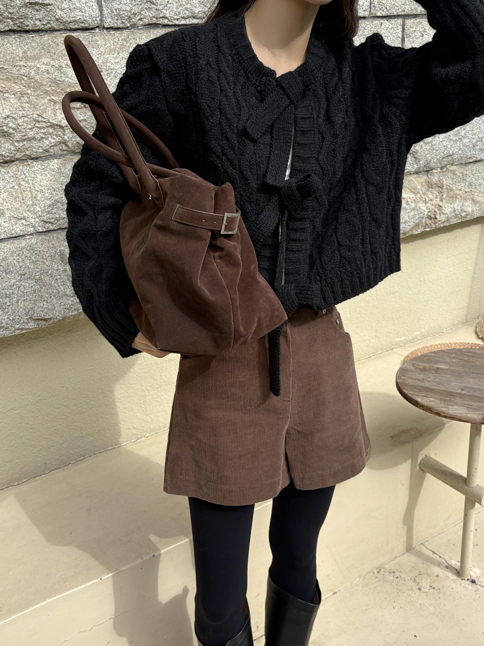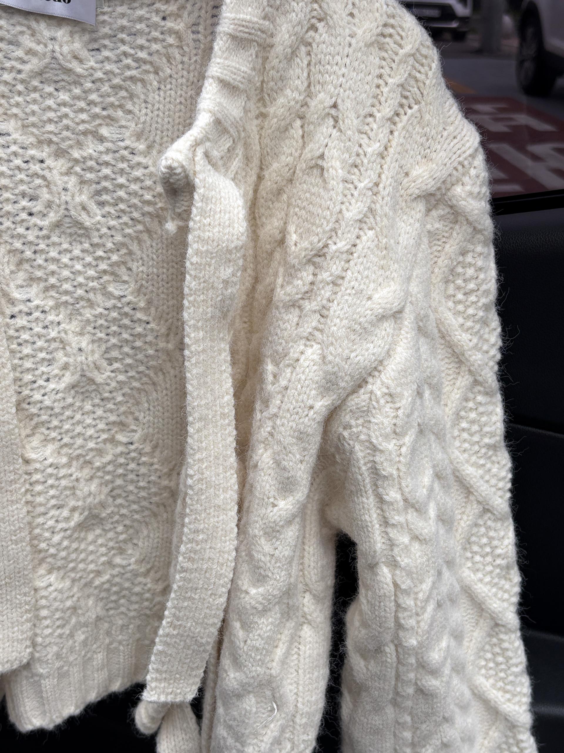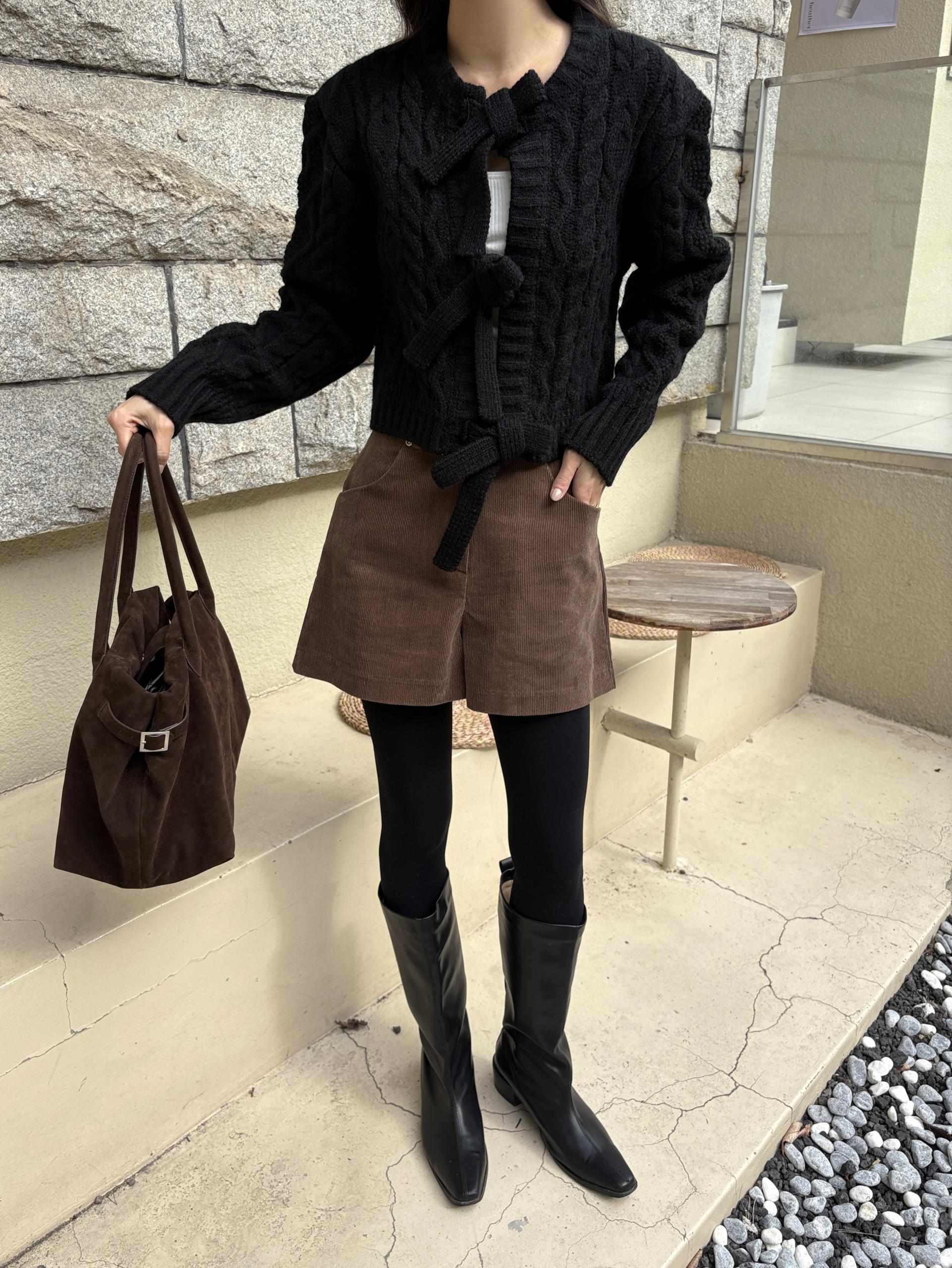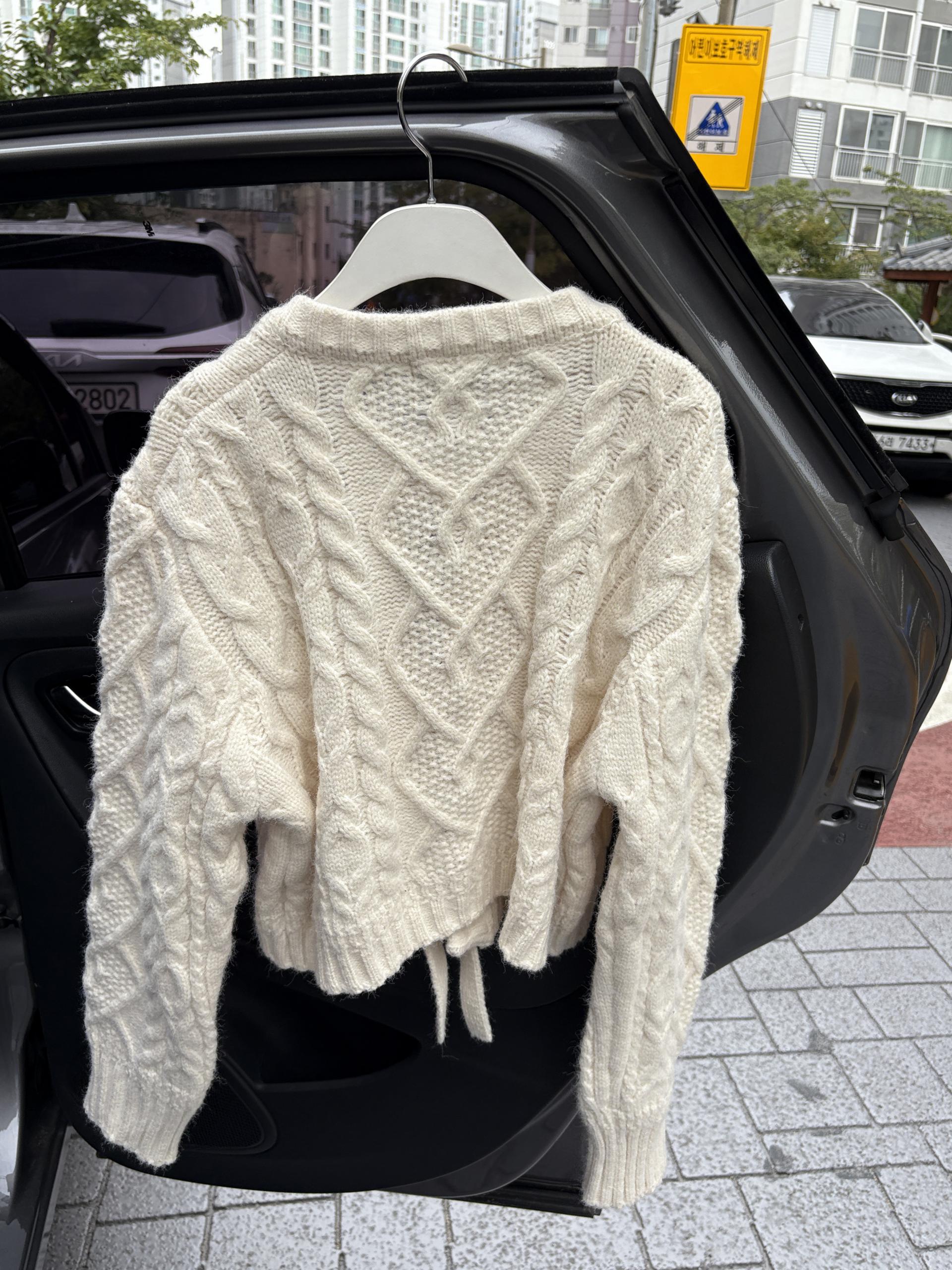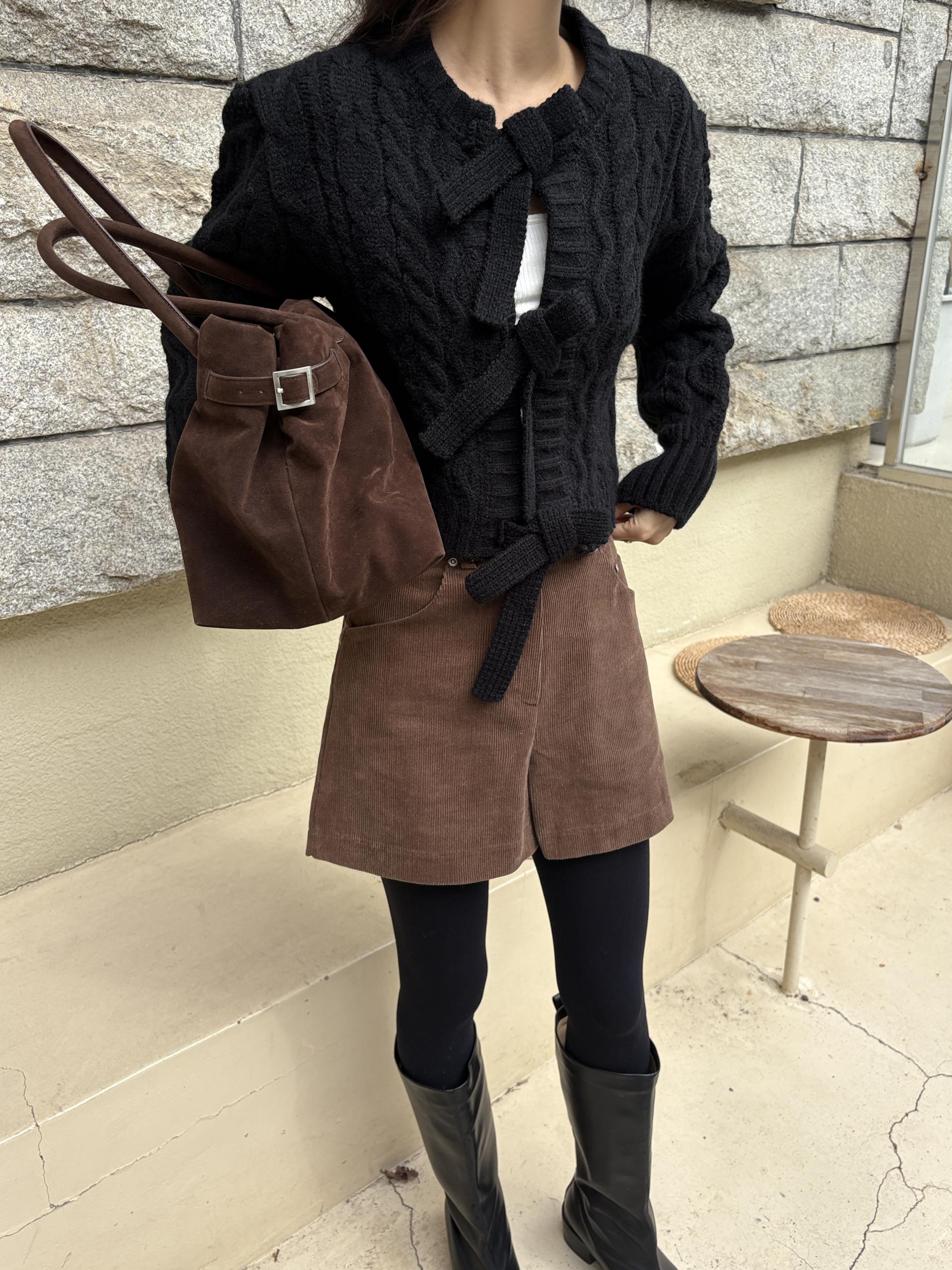 전체적으로 도톰한 꽈배기 짜임으로 포근한 착용감을 주며, 리본 타이 여밈 디테일이 포인트가 되어 사랑스럽고 여성스러운 분위기를 연출합니다.