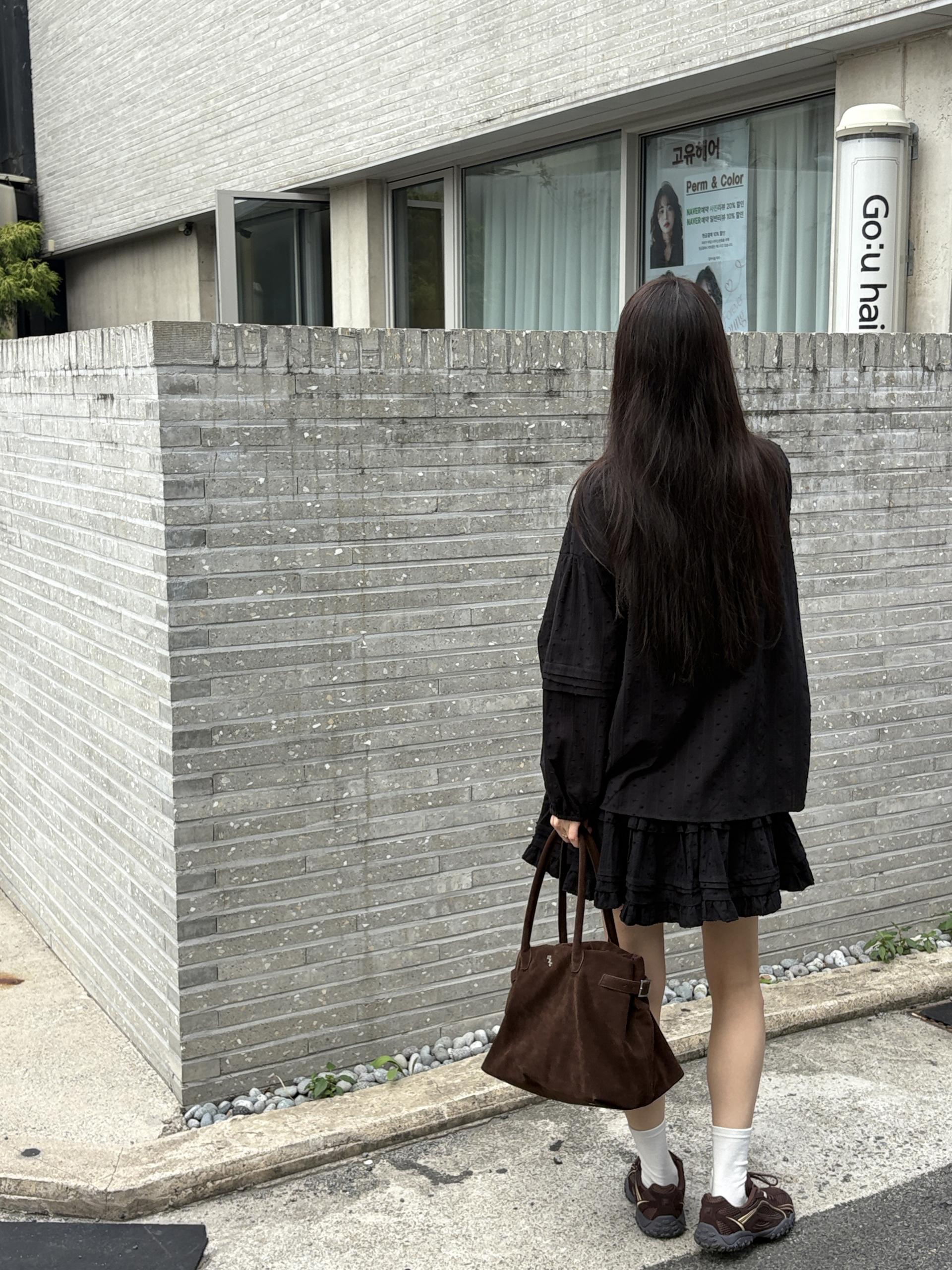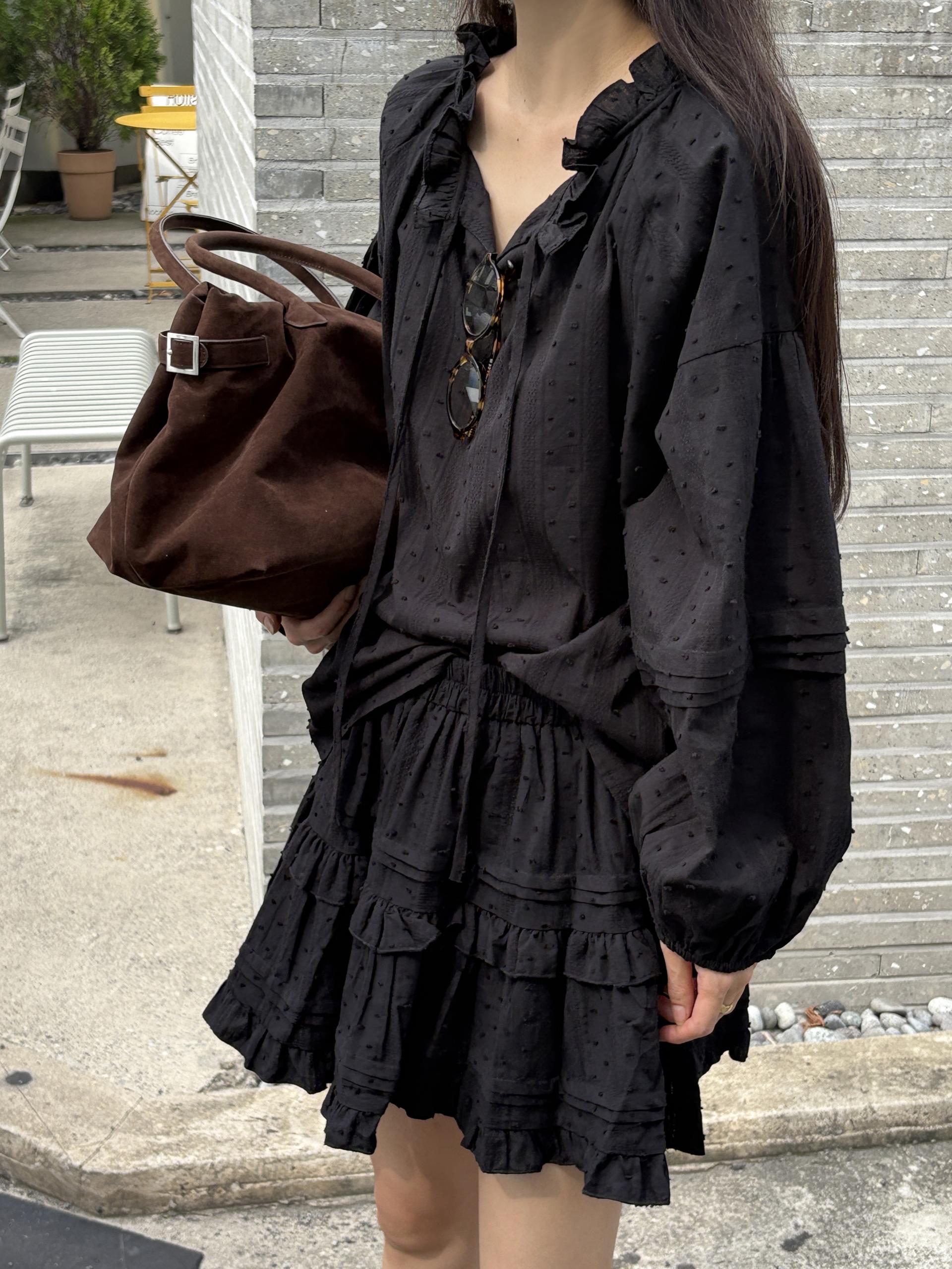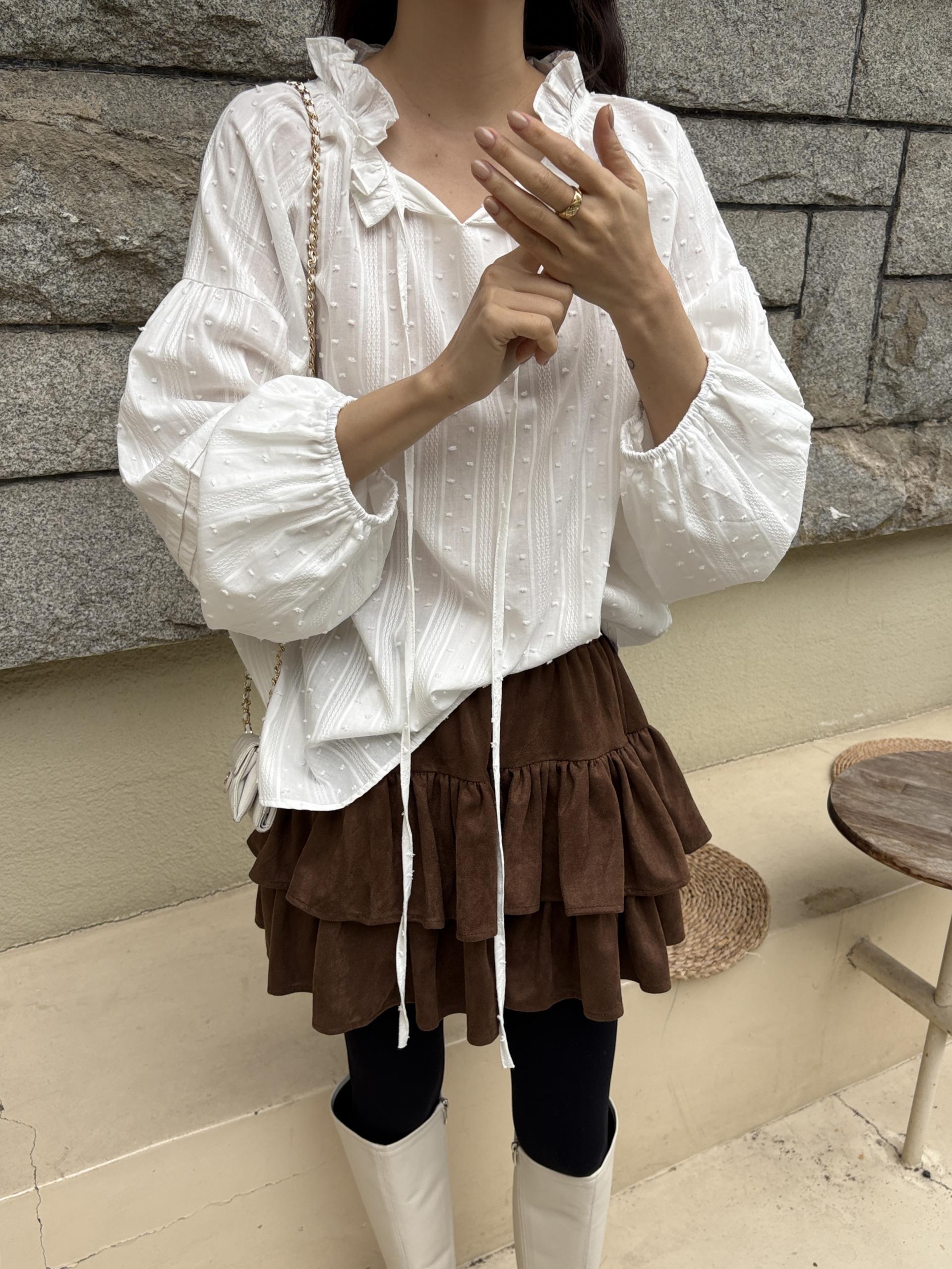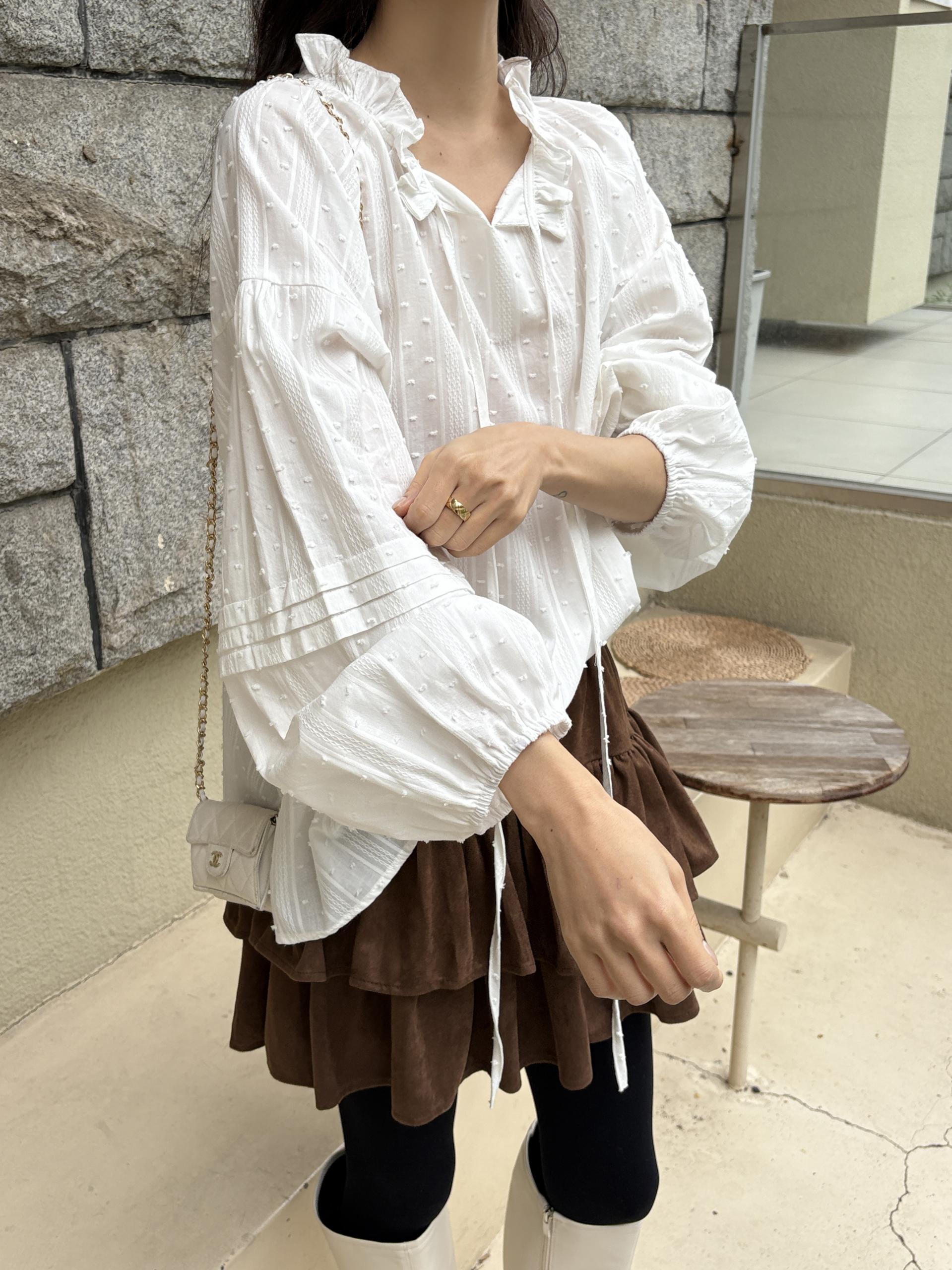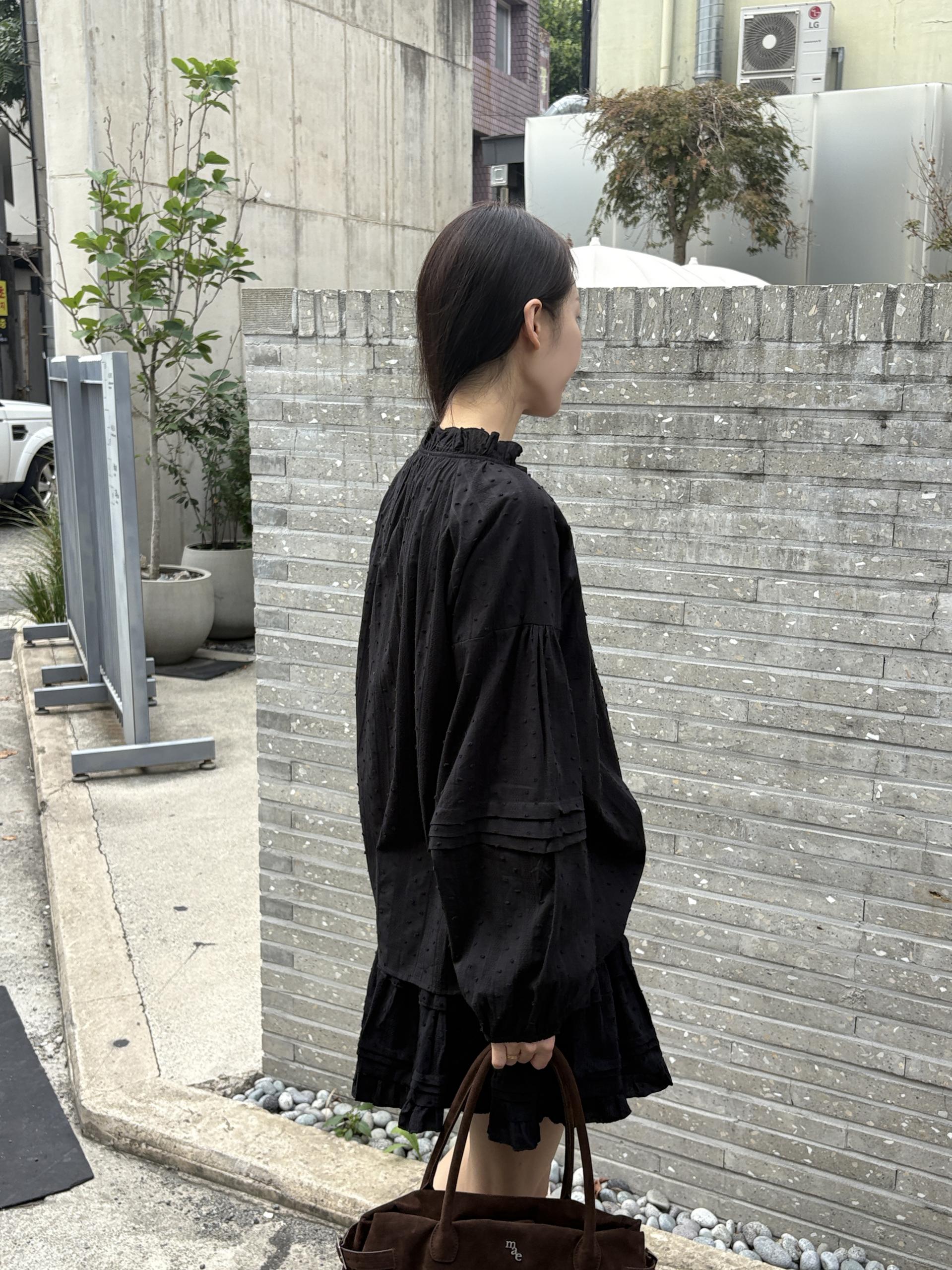 잔잔한 도트 자수 포인트와 자연스러운 핀턱 디테일이 더해져 여성스러우면서도 고급스러운 무드를 더합니다.