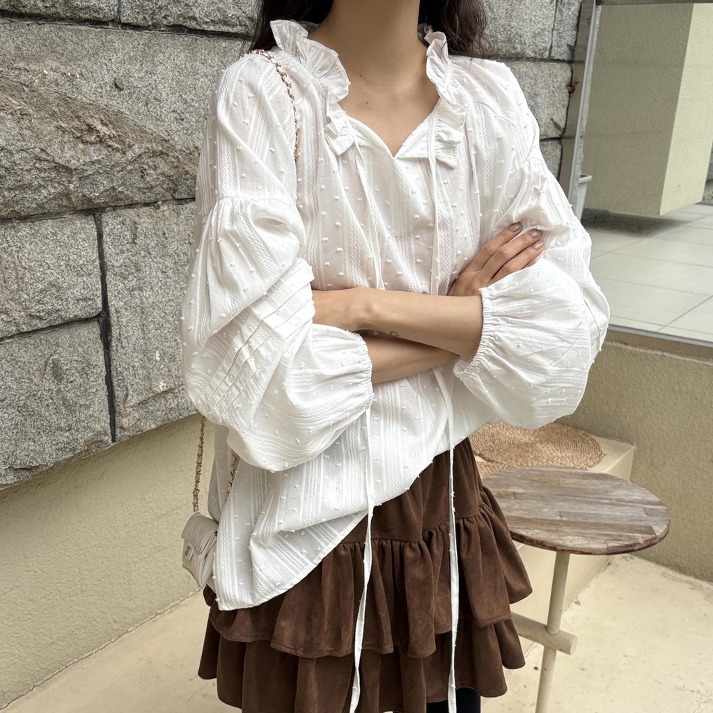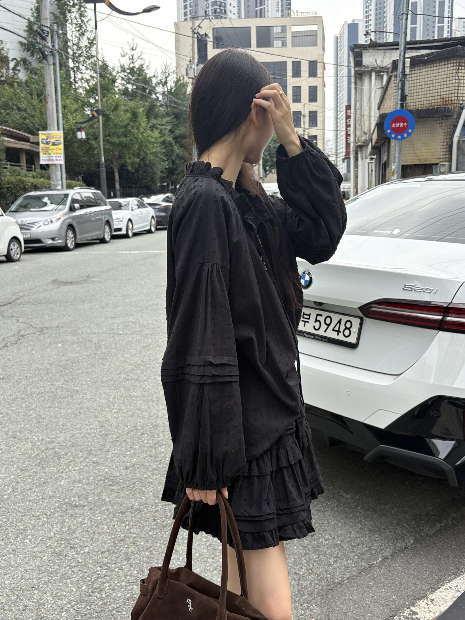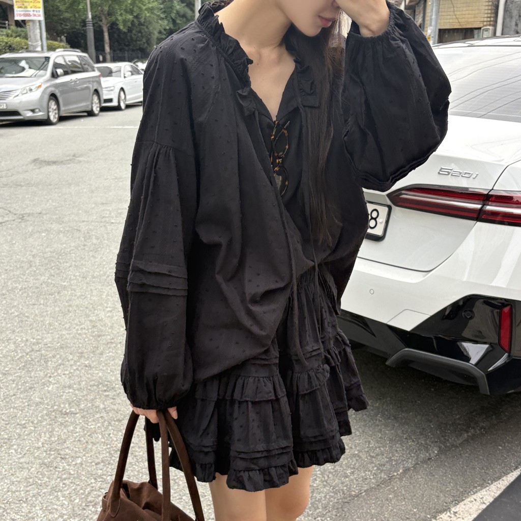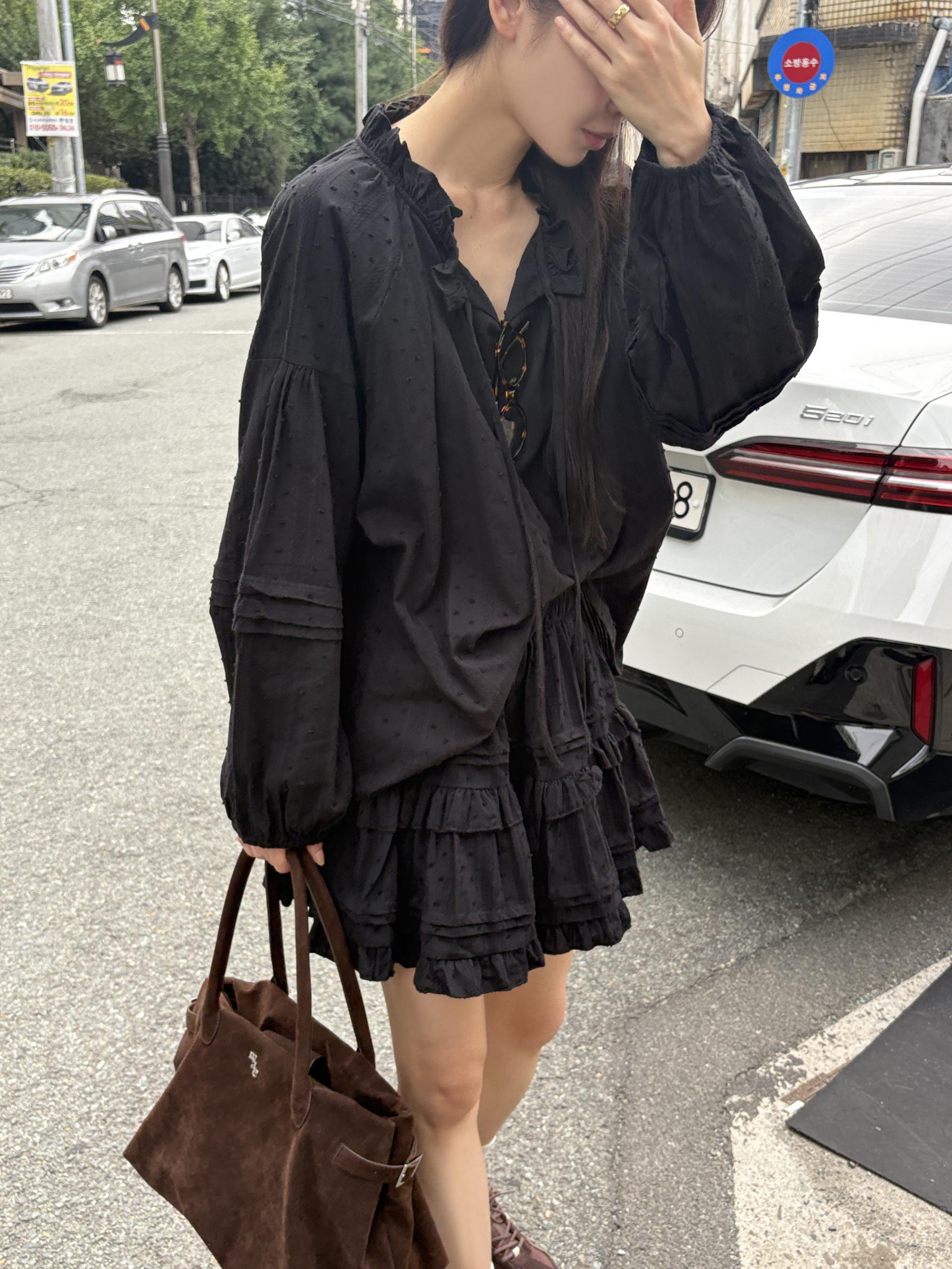잔잔한 도트 자수 포인트와 자연스러운 핀턱 디테일이 더해져 여성스러우면서도 고급스러운 무드를 더합니다.