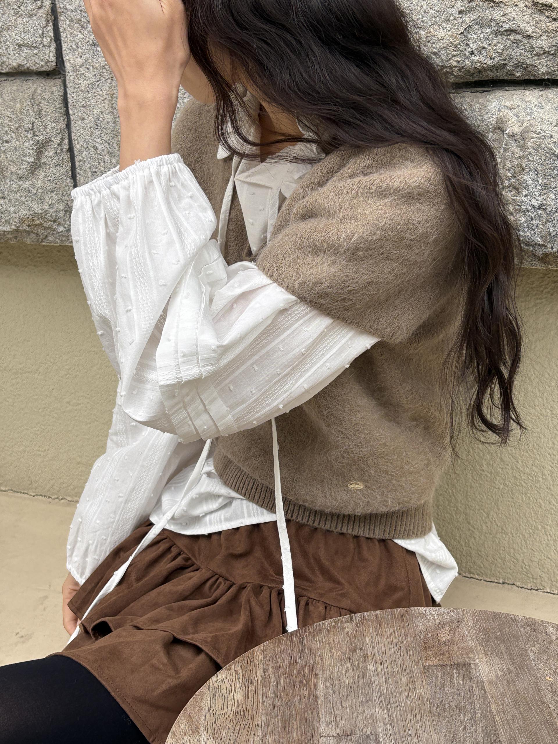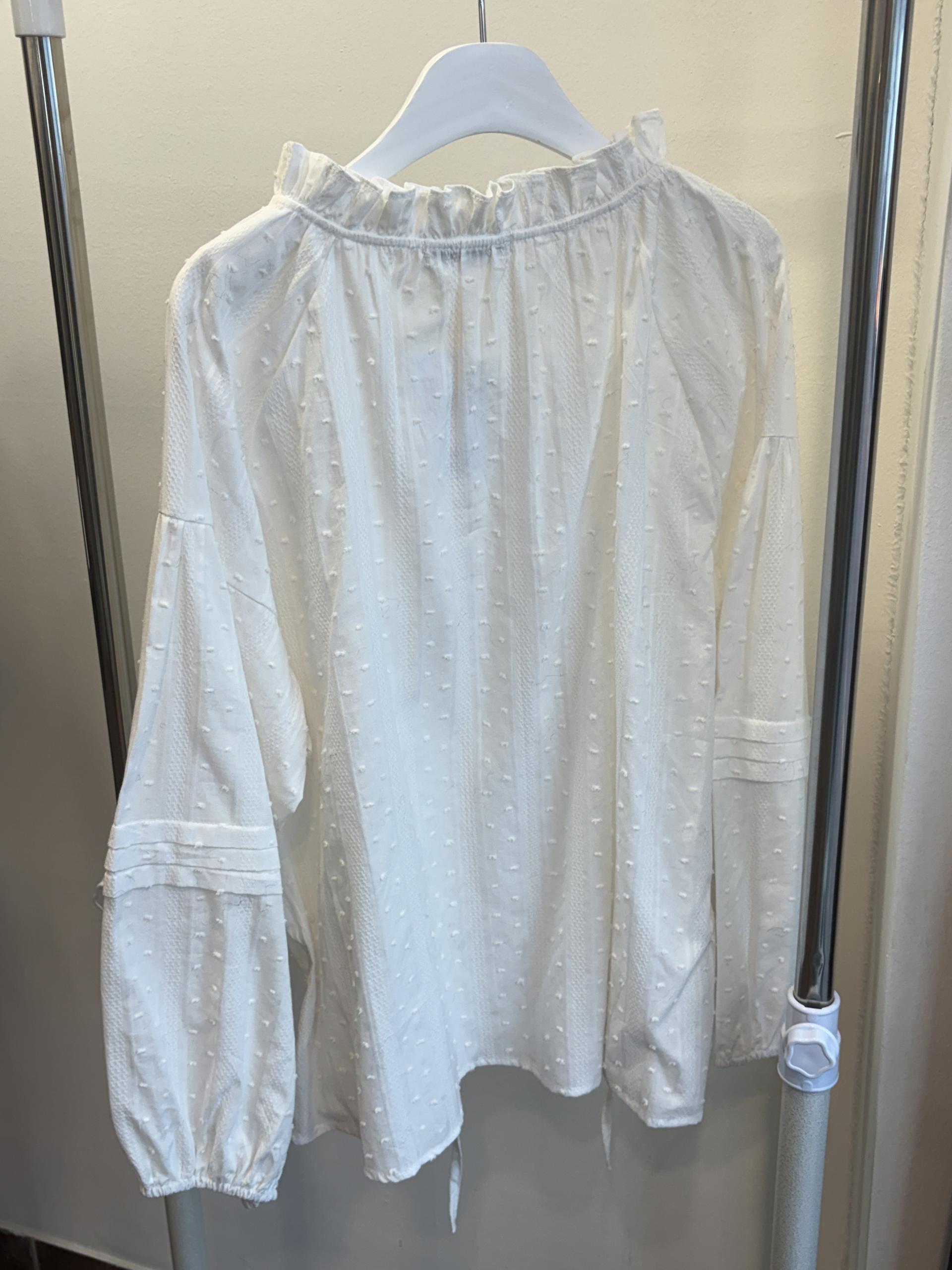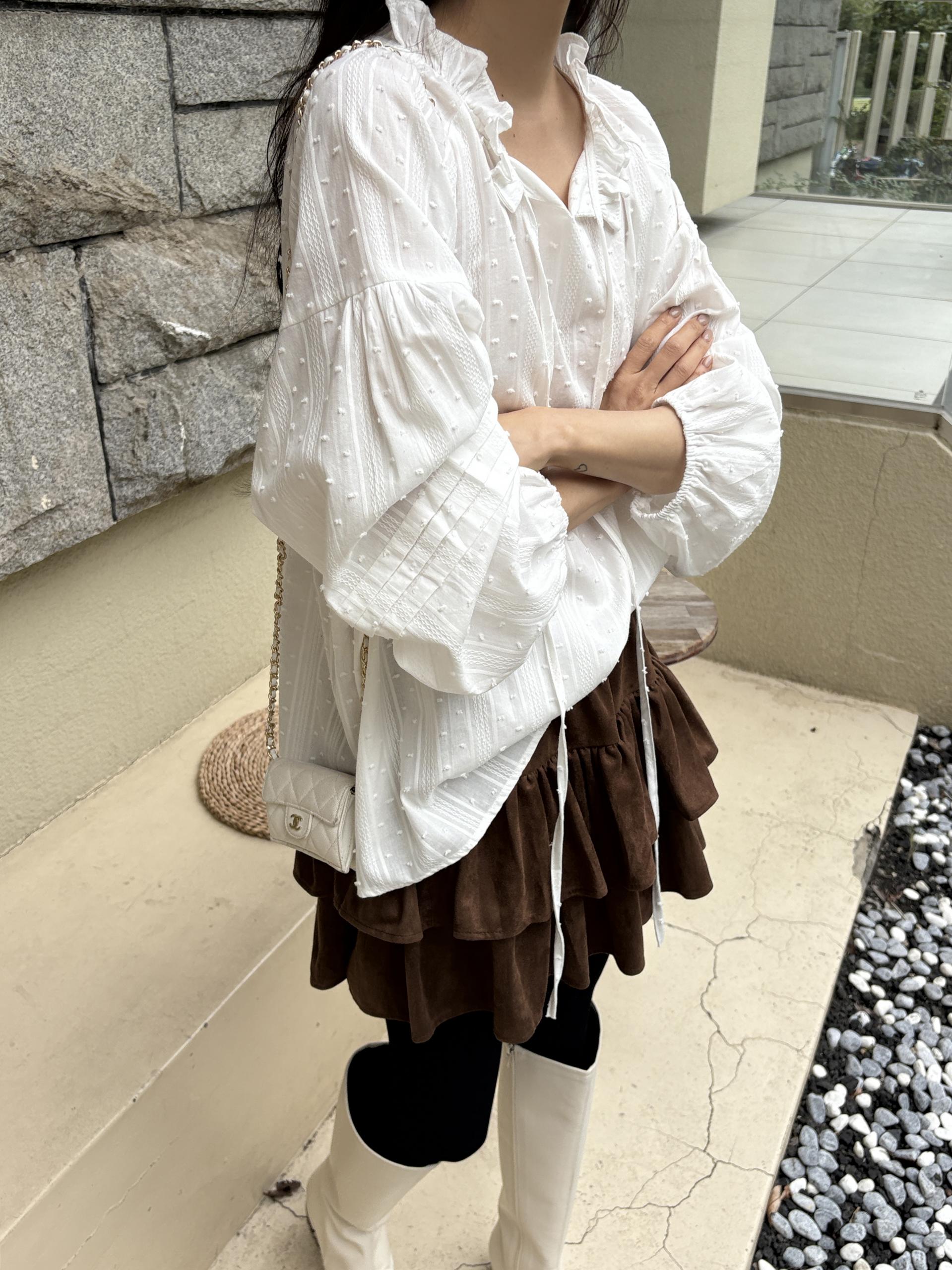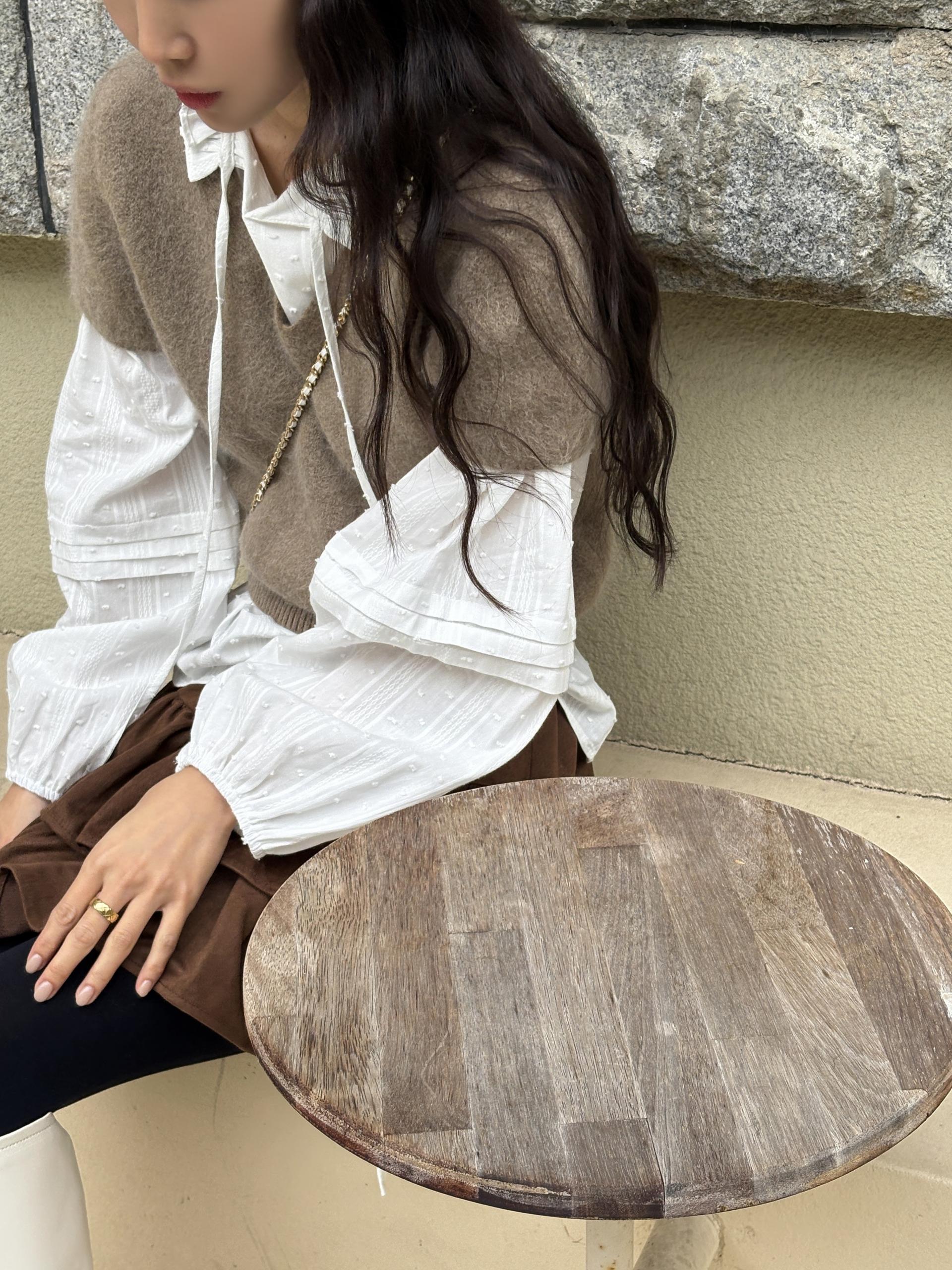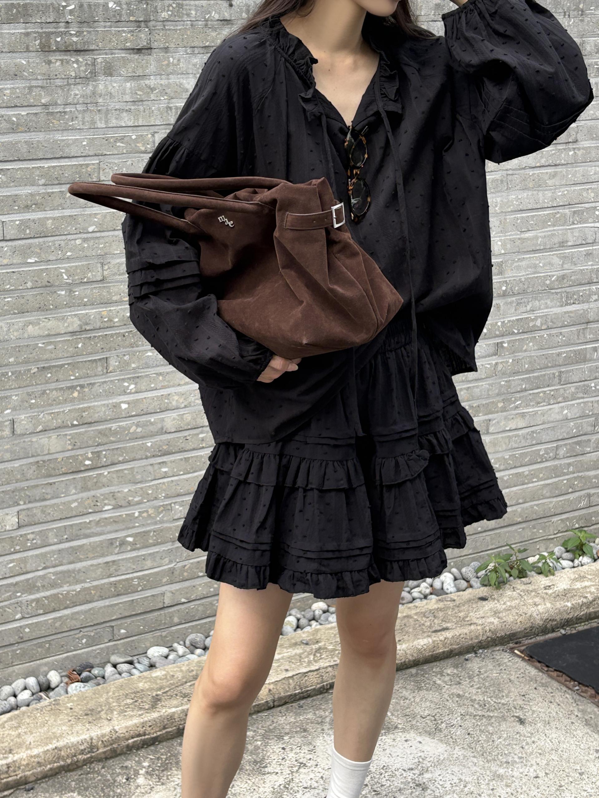 잔잔한 도트 자수 포인트와 자연스러운 핀턱 디테일이 더해져 여성스러우면서도 고급스러운 무드를 더합니다.