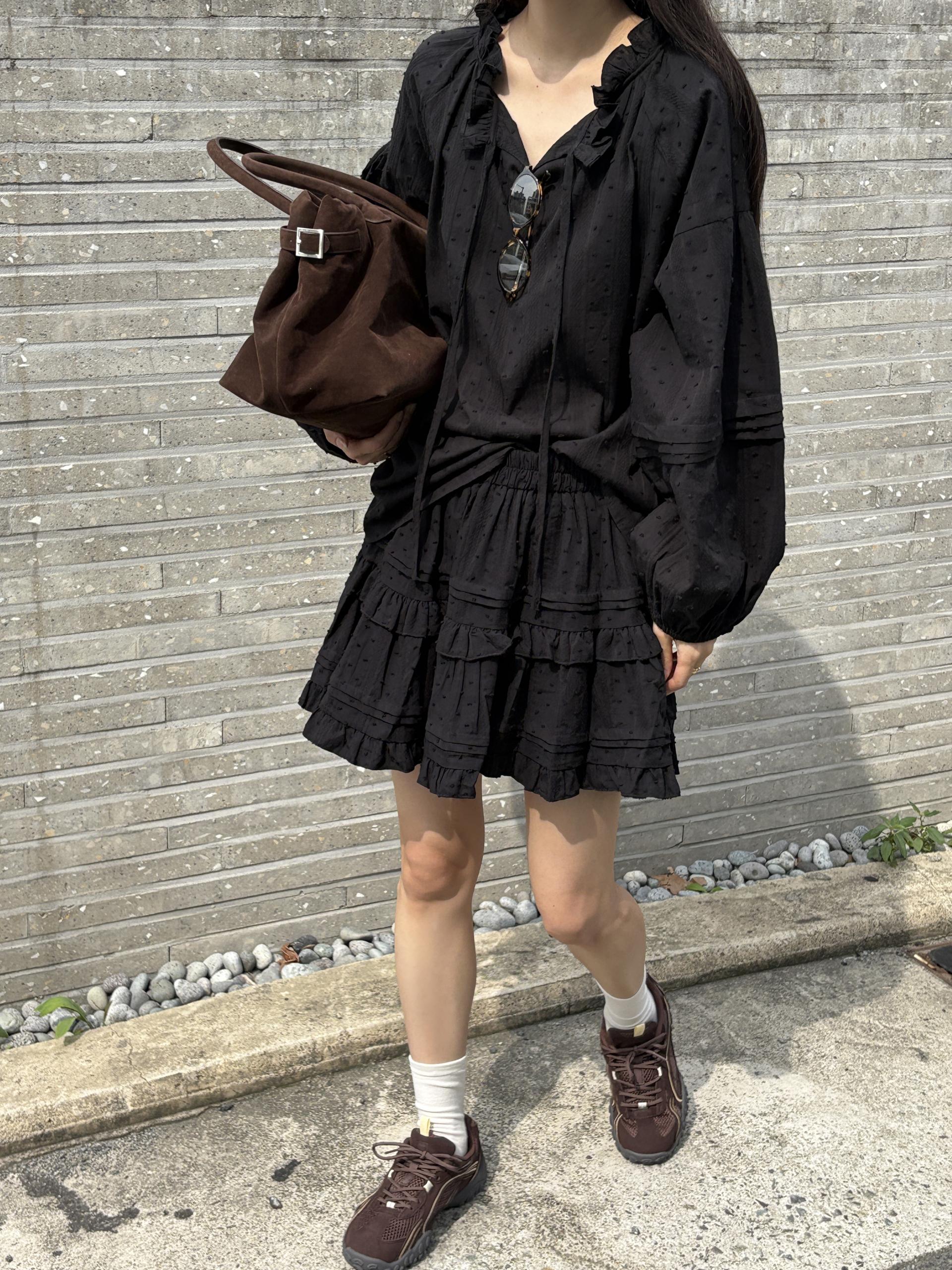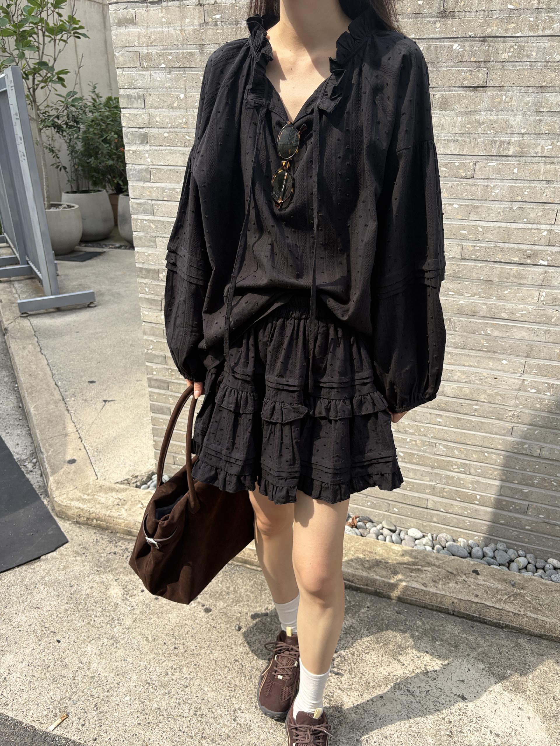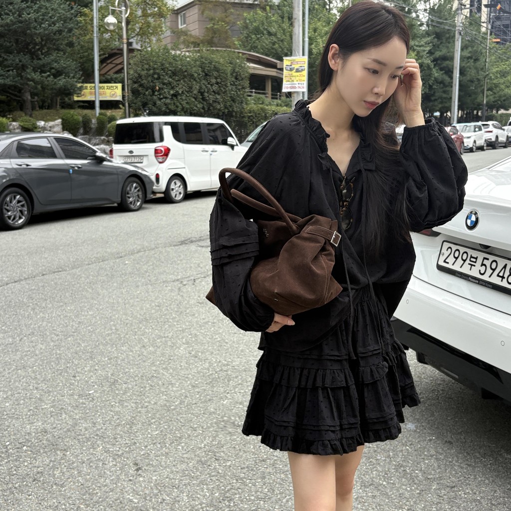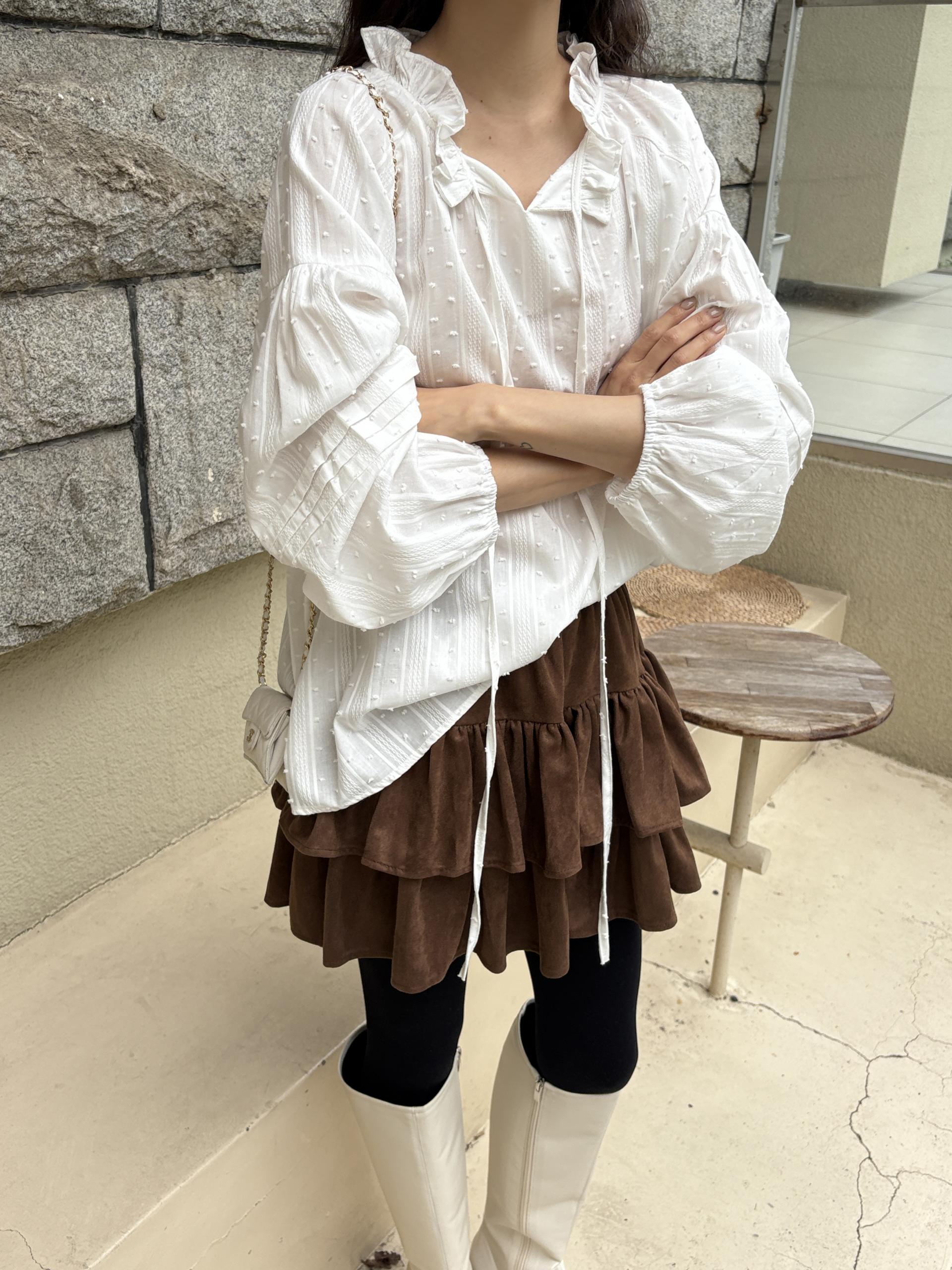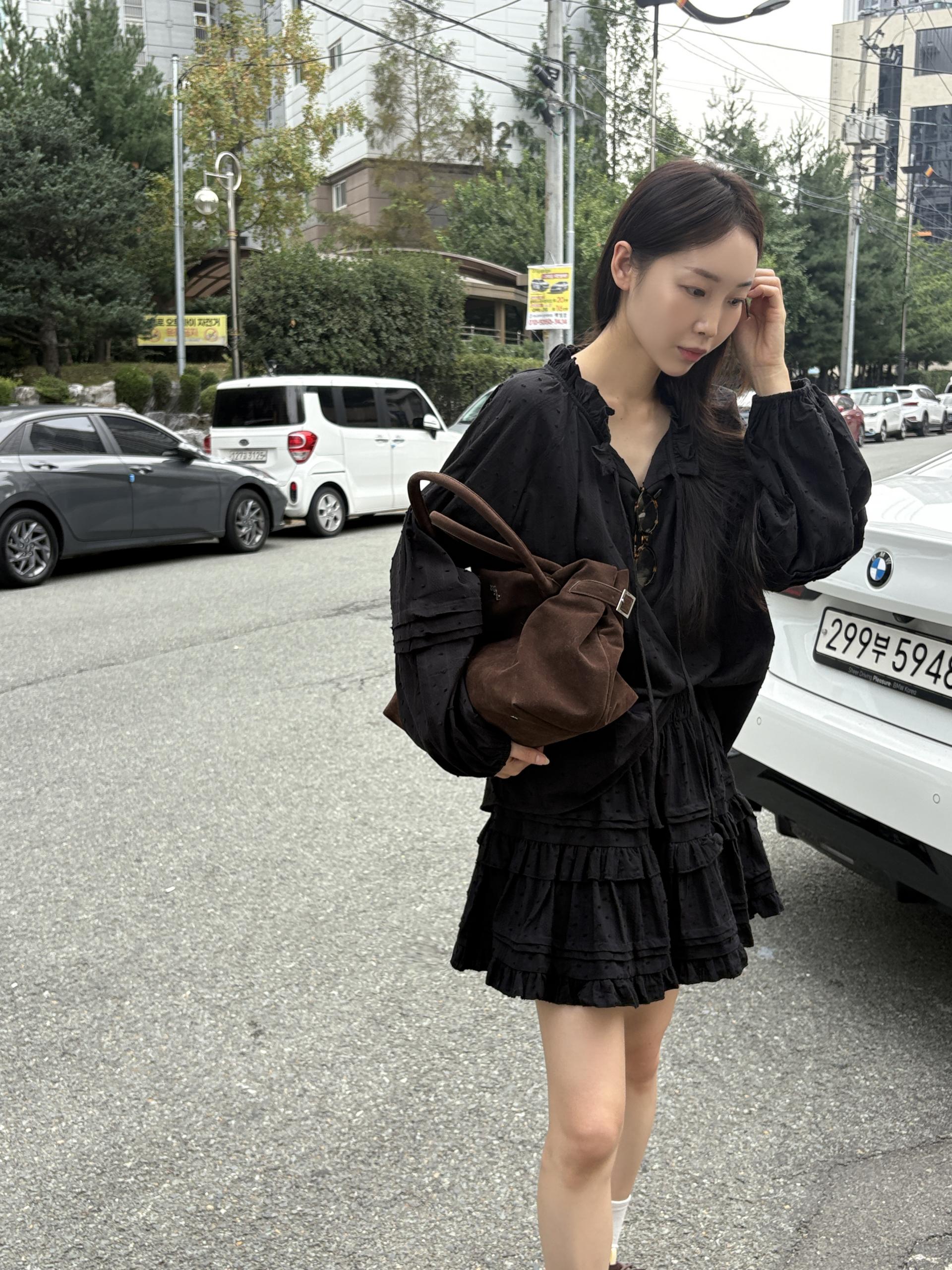 잔잔한 도트 자수 포인트와 자연스러운 핀턱 디테일이 더해져 여성스러우면서도 고급스러운 무드를 더합니다.
