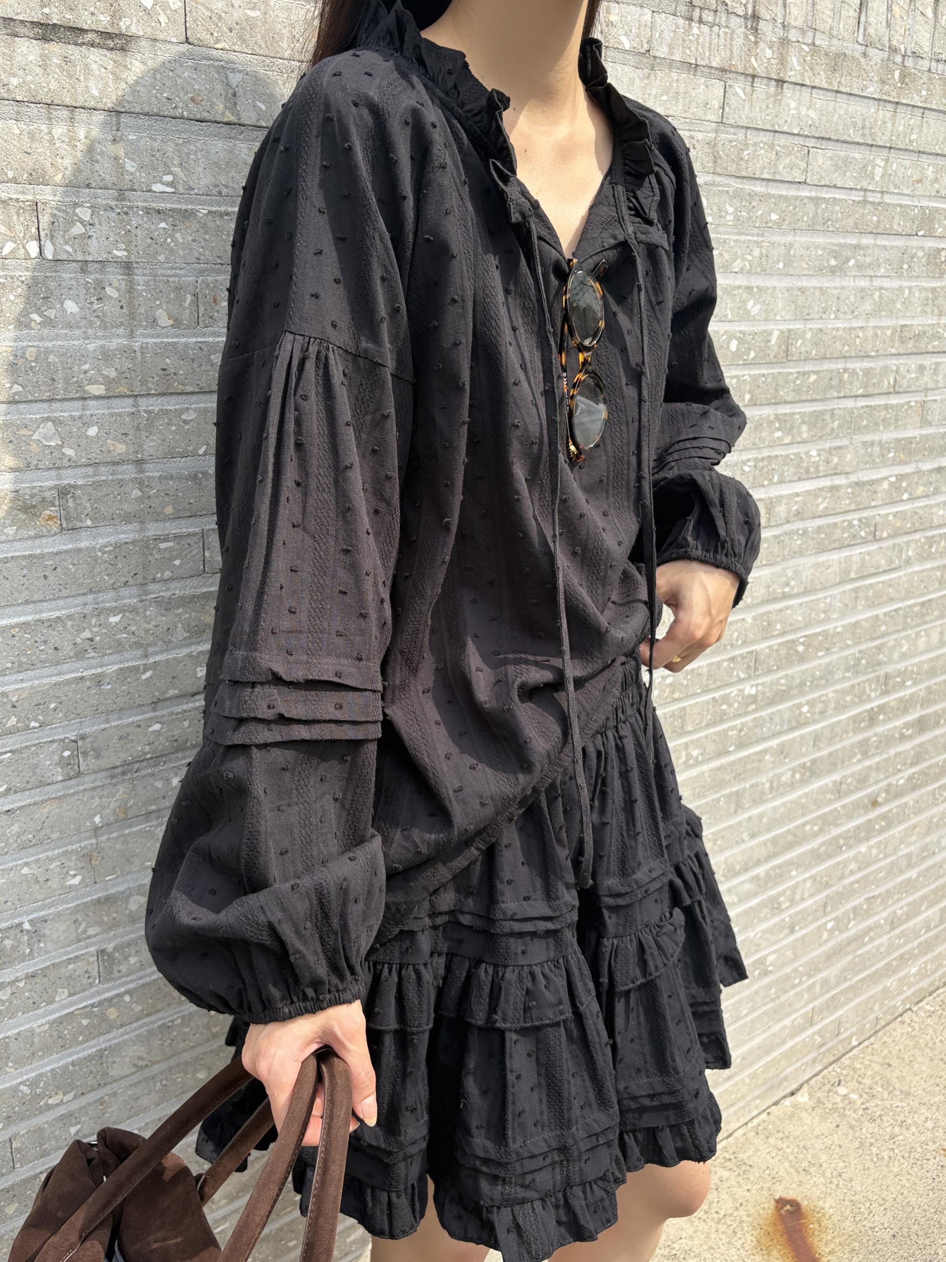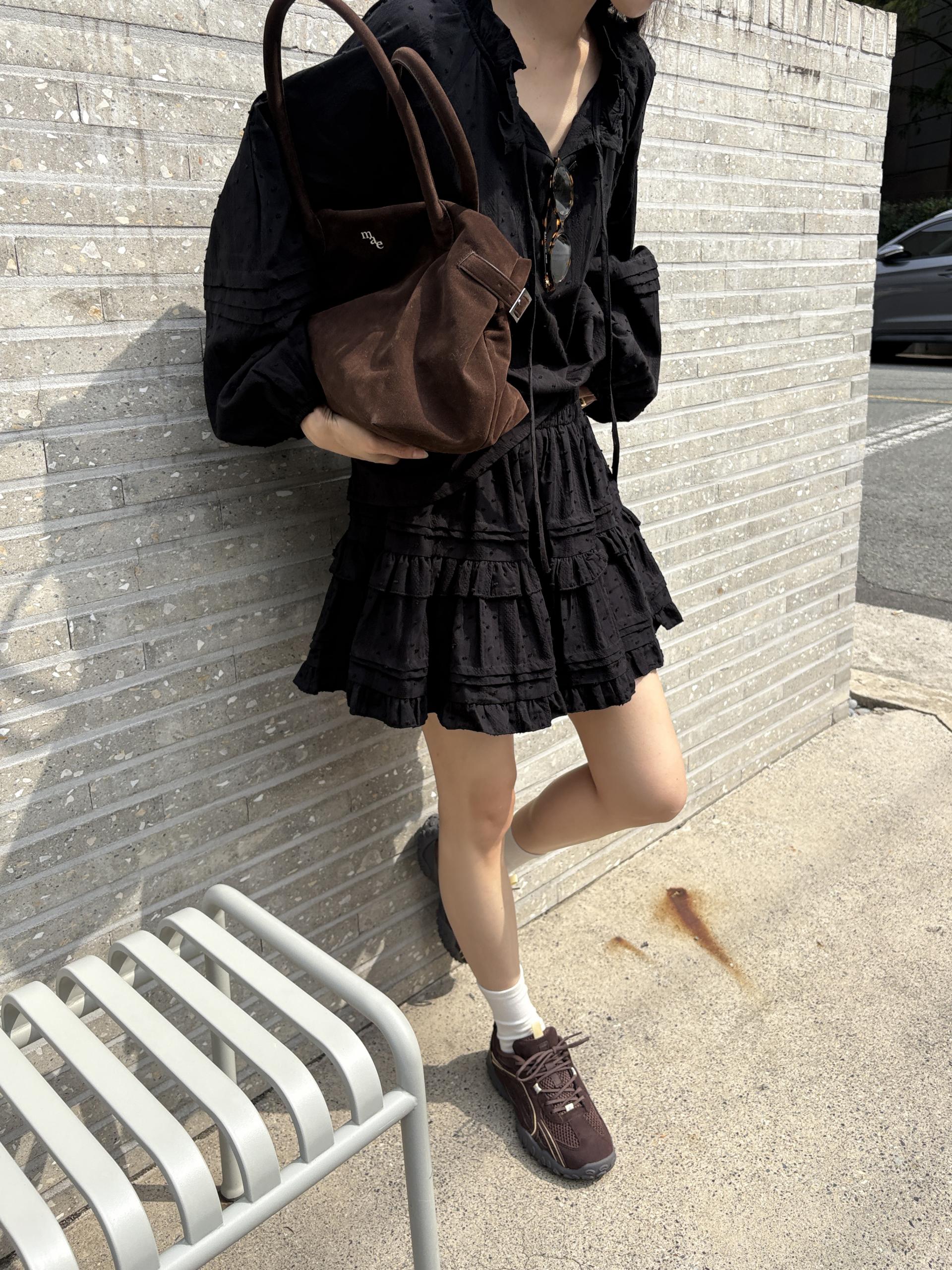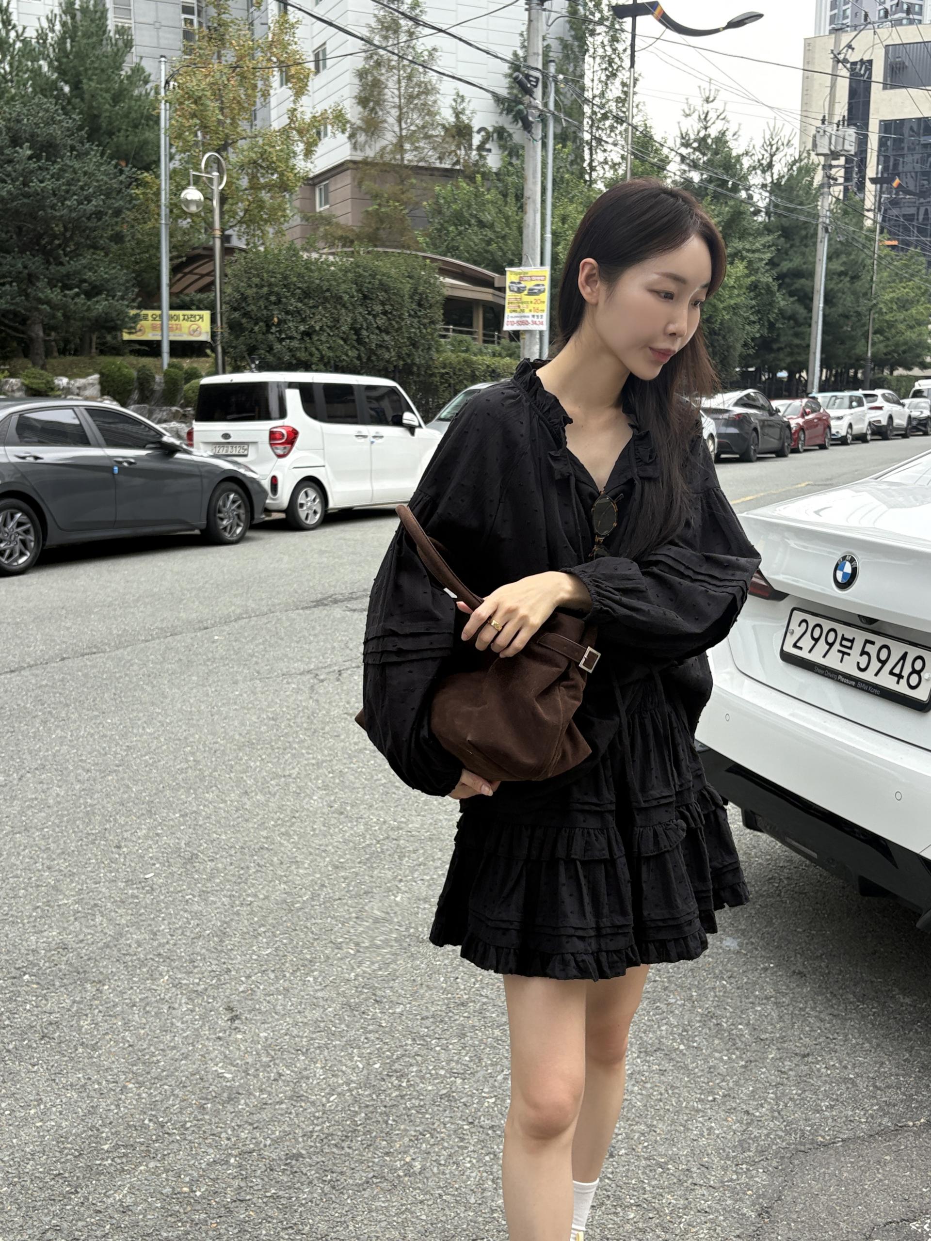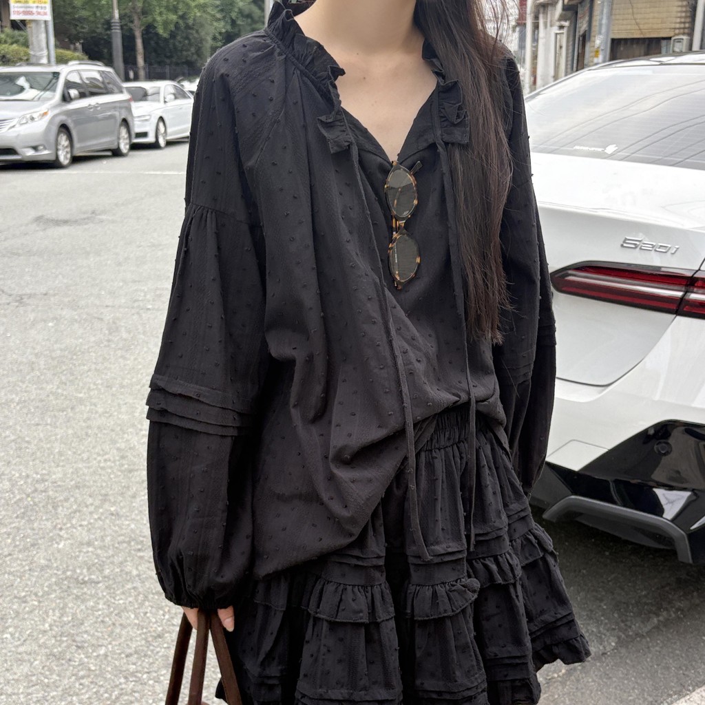 잔잔한 도트 자수 포인트와 자연스러운 핀턱 디테일이 더해져 여성스러우면서도 고급스러운 무드를 더합니다.
