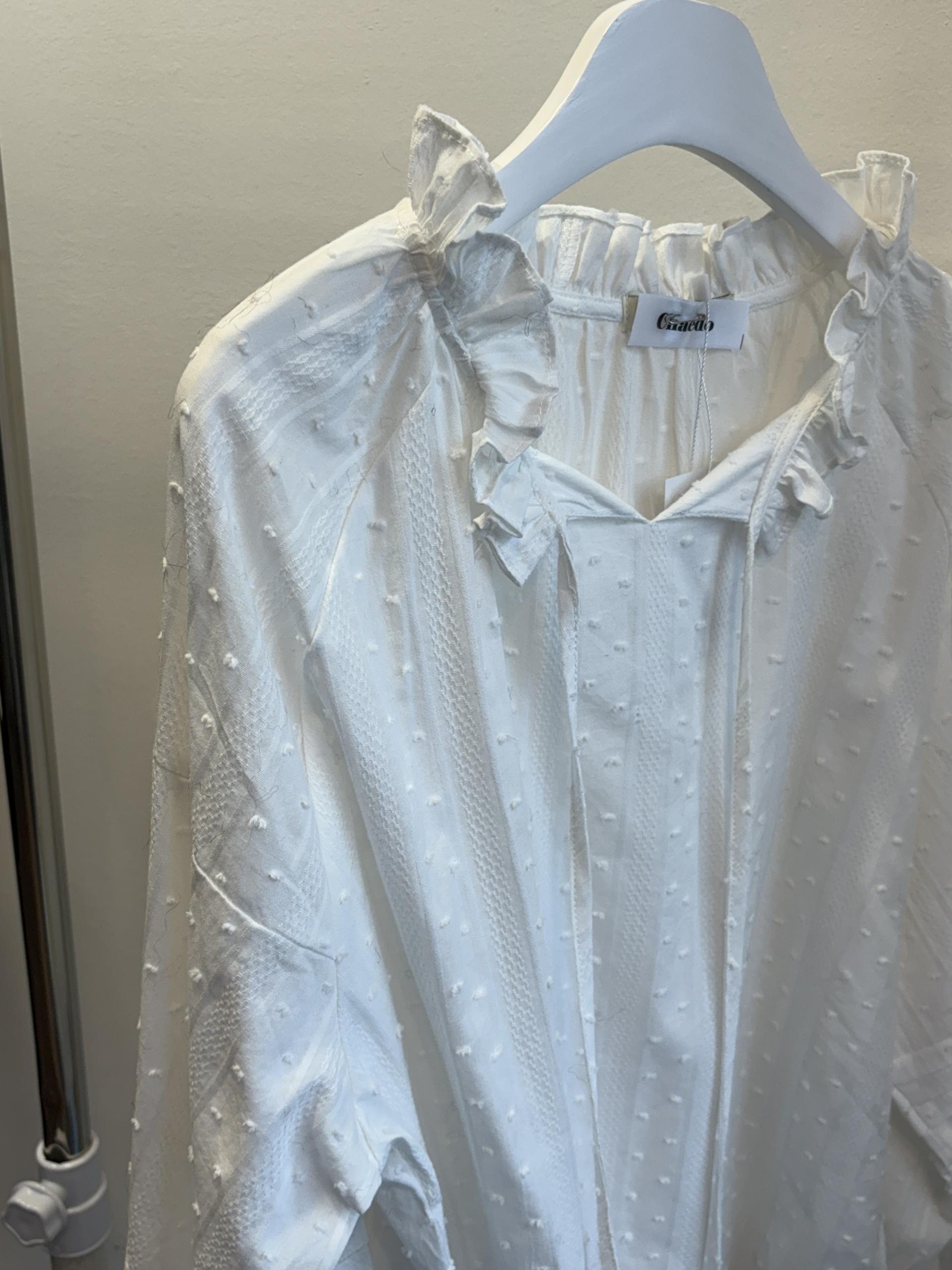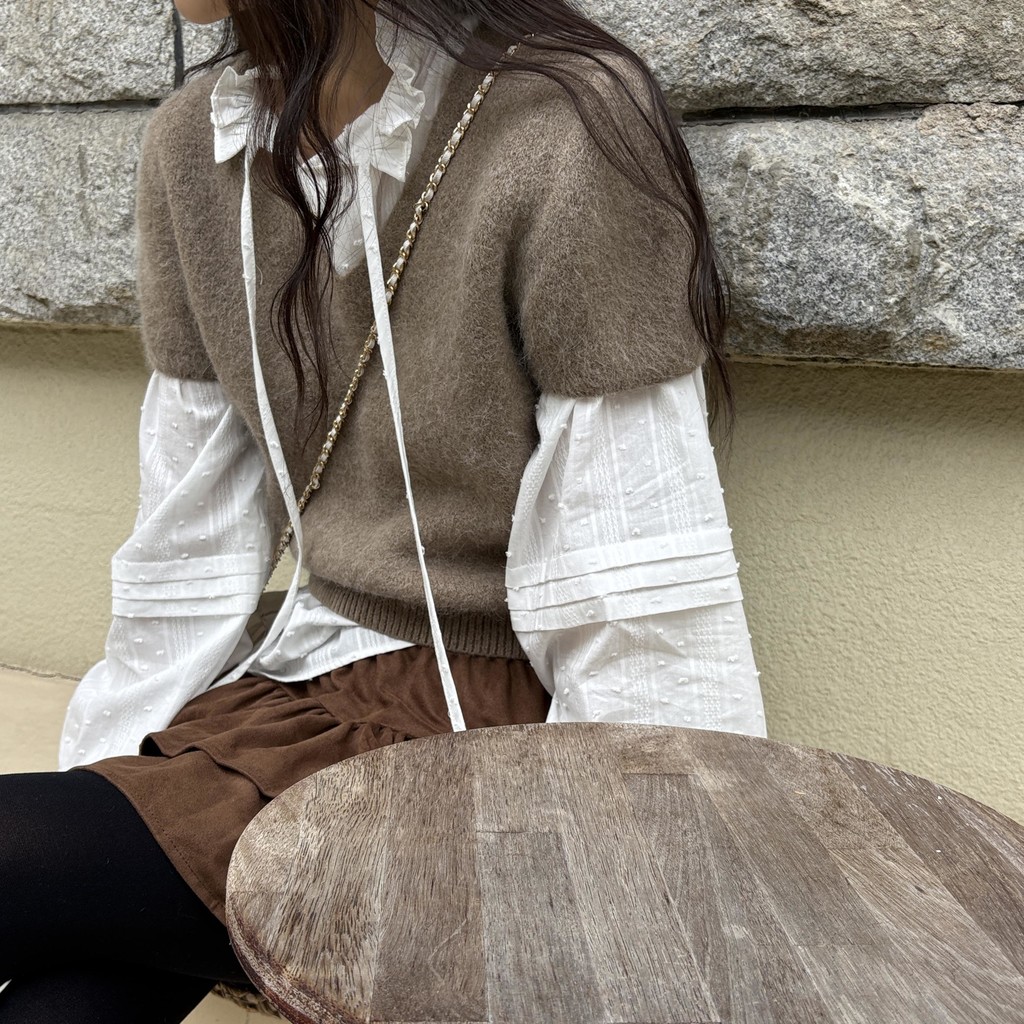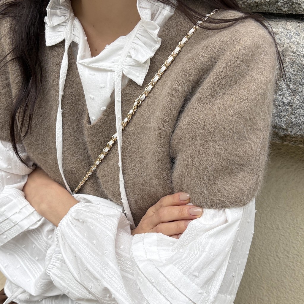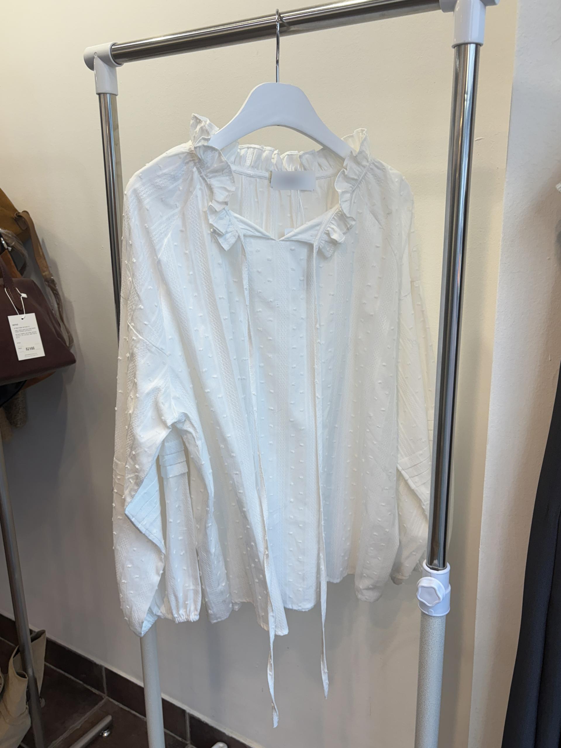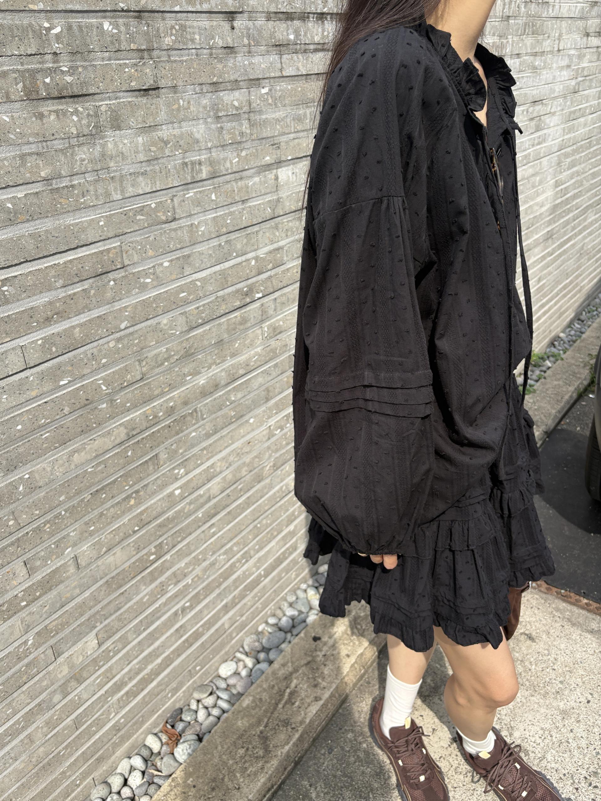 잔잔한 도트 자수 포인트와 자연스러운 핀턱 디테일이 더해져 여성스러우면서도 고급스러운 무드를 더합니다.