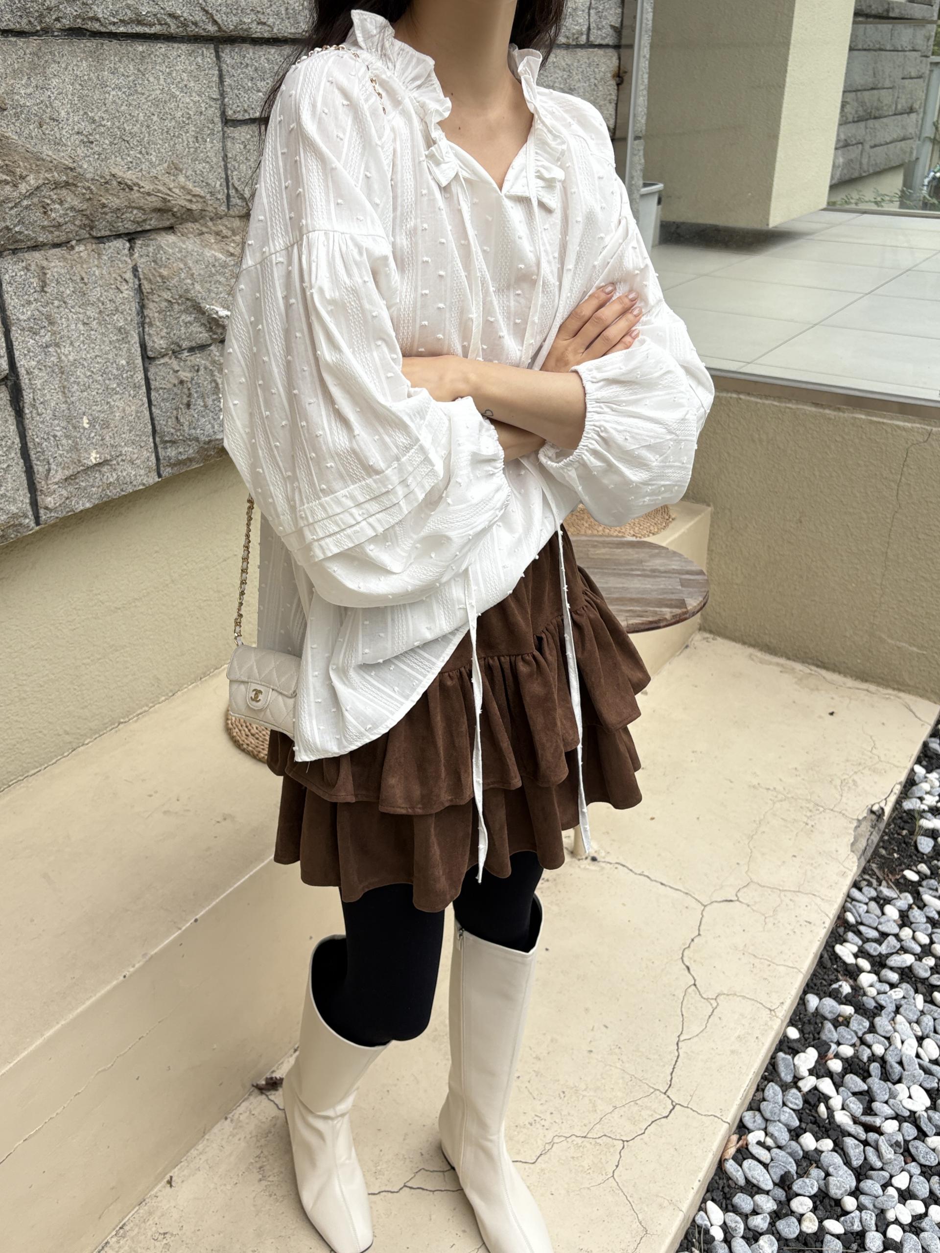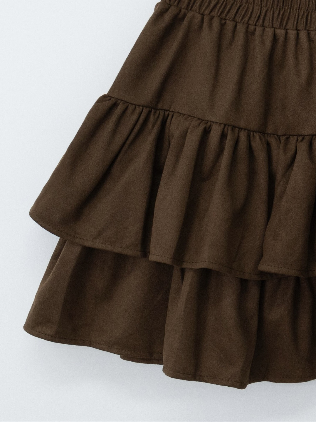 부드러운 스웨이드 텍스처와 풍성한 2단 캉캉 디자인으로 러블리하면서도 고급스러운 무드를 연출해 줍니다.