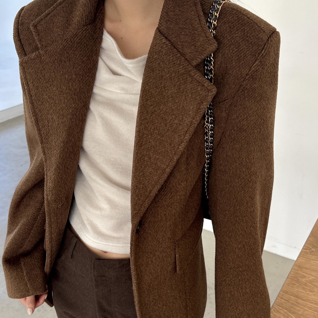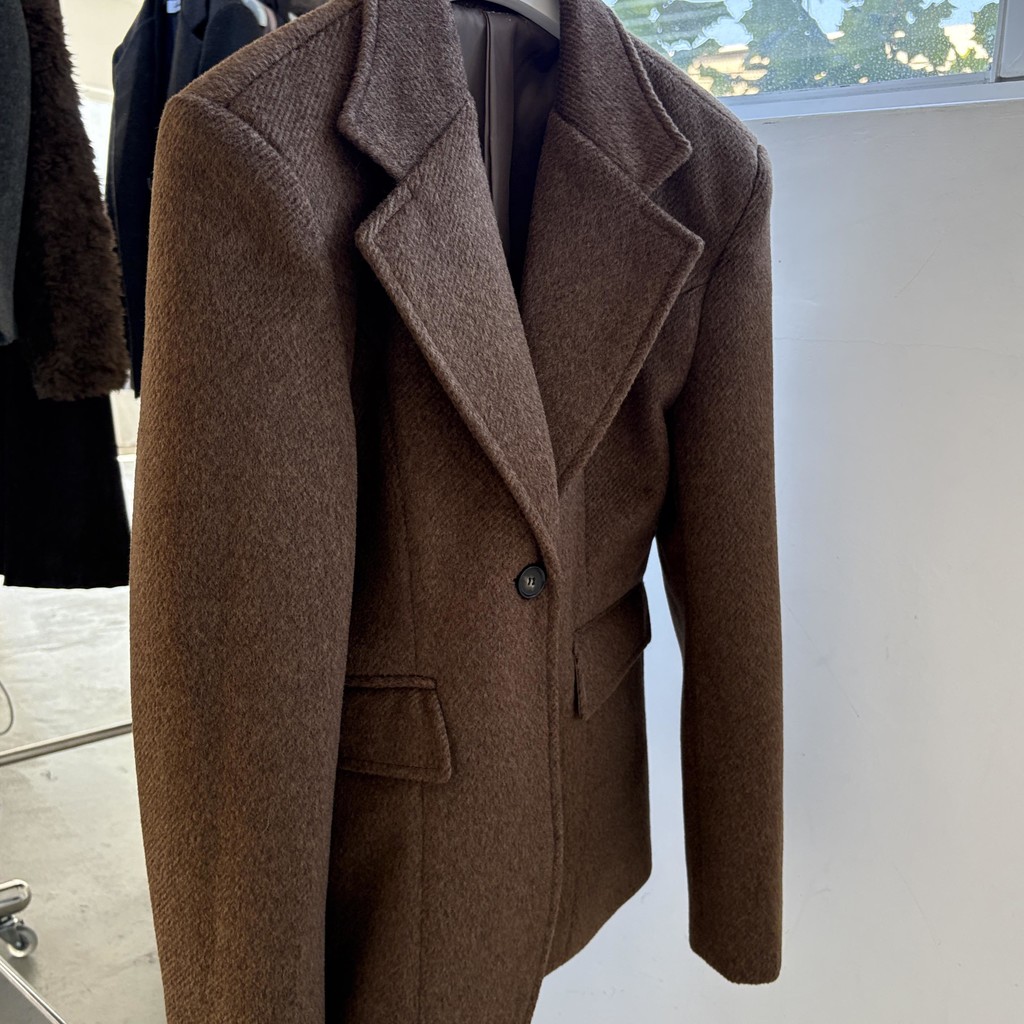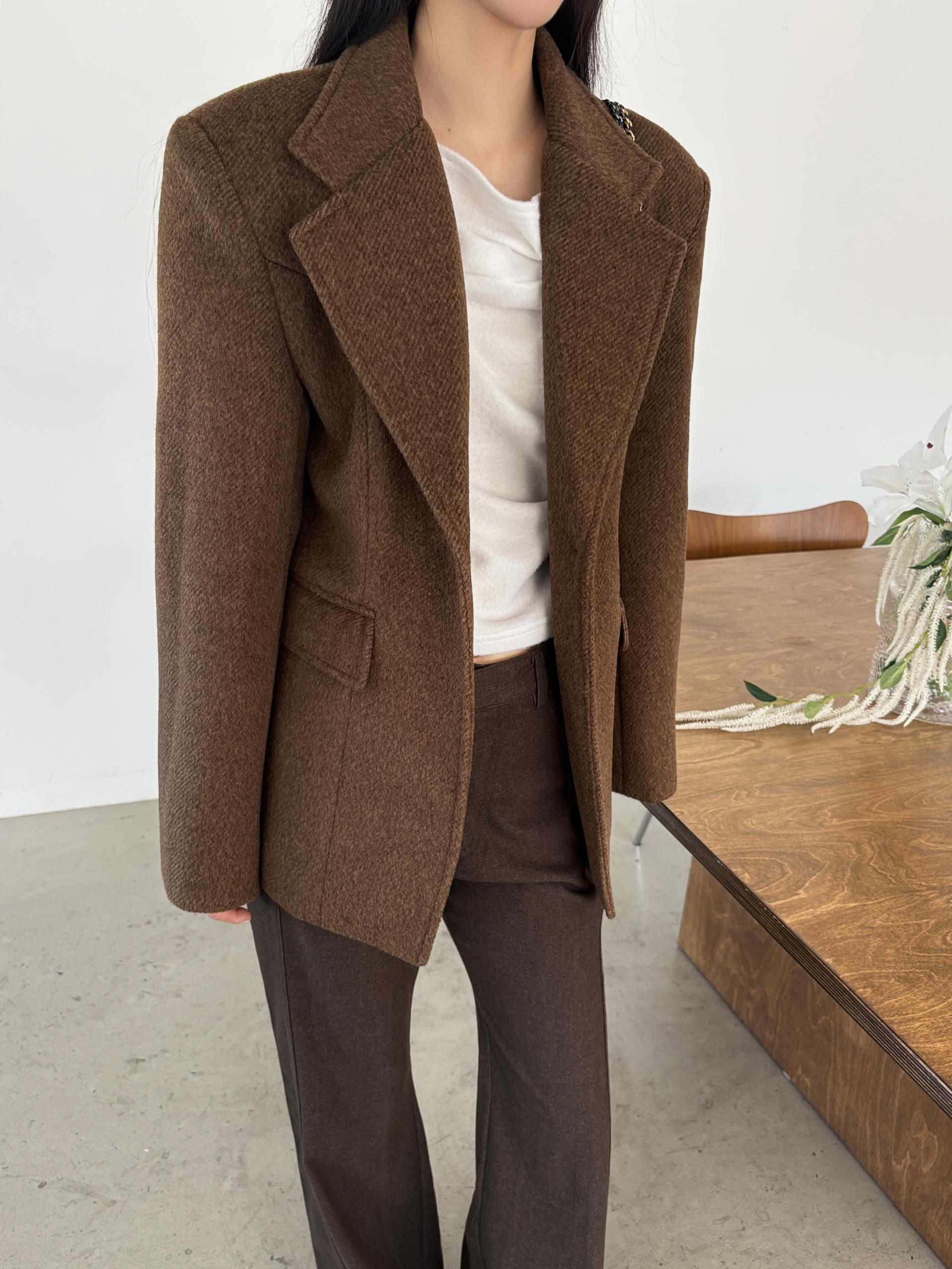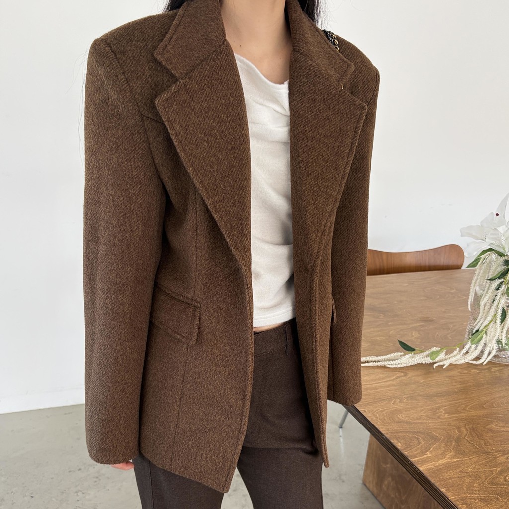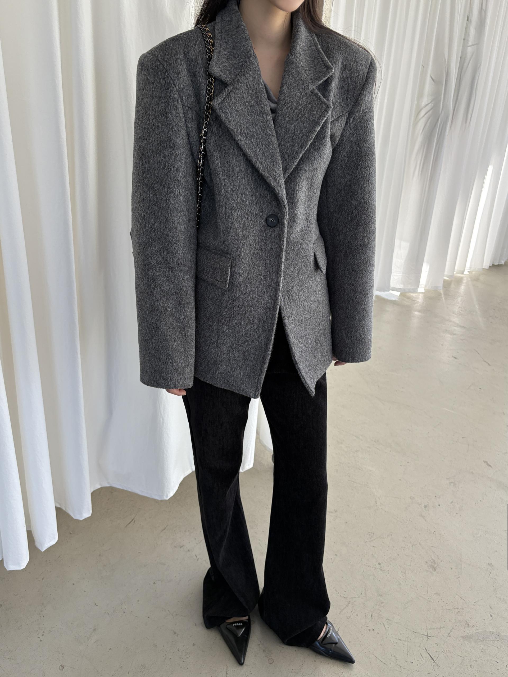 정돈된 어깨 라인과 잘록한 허리 라인이 체형을 살려주고, 깔끔한 라펠 디테일로 고급스러움을 더합니다.
