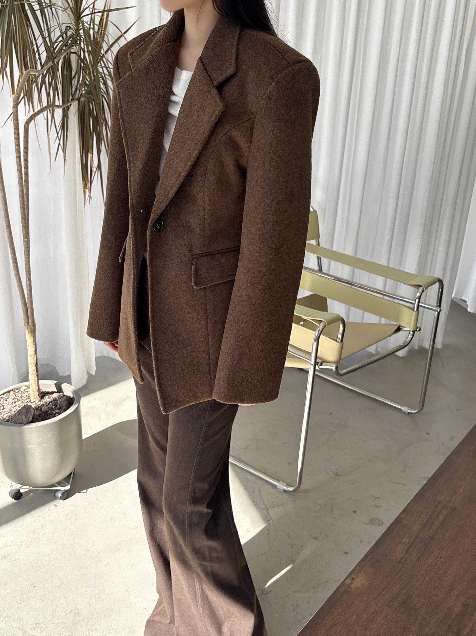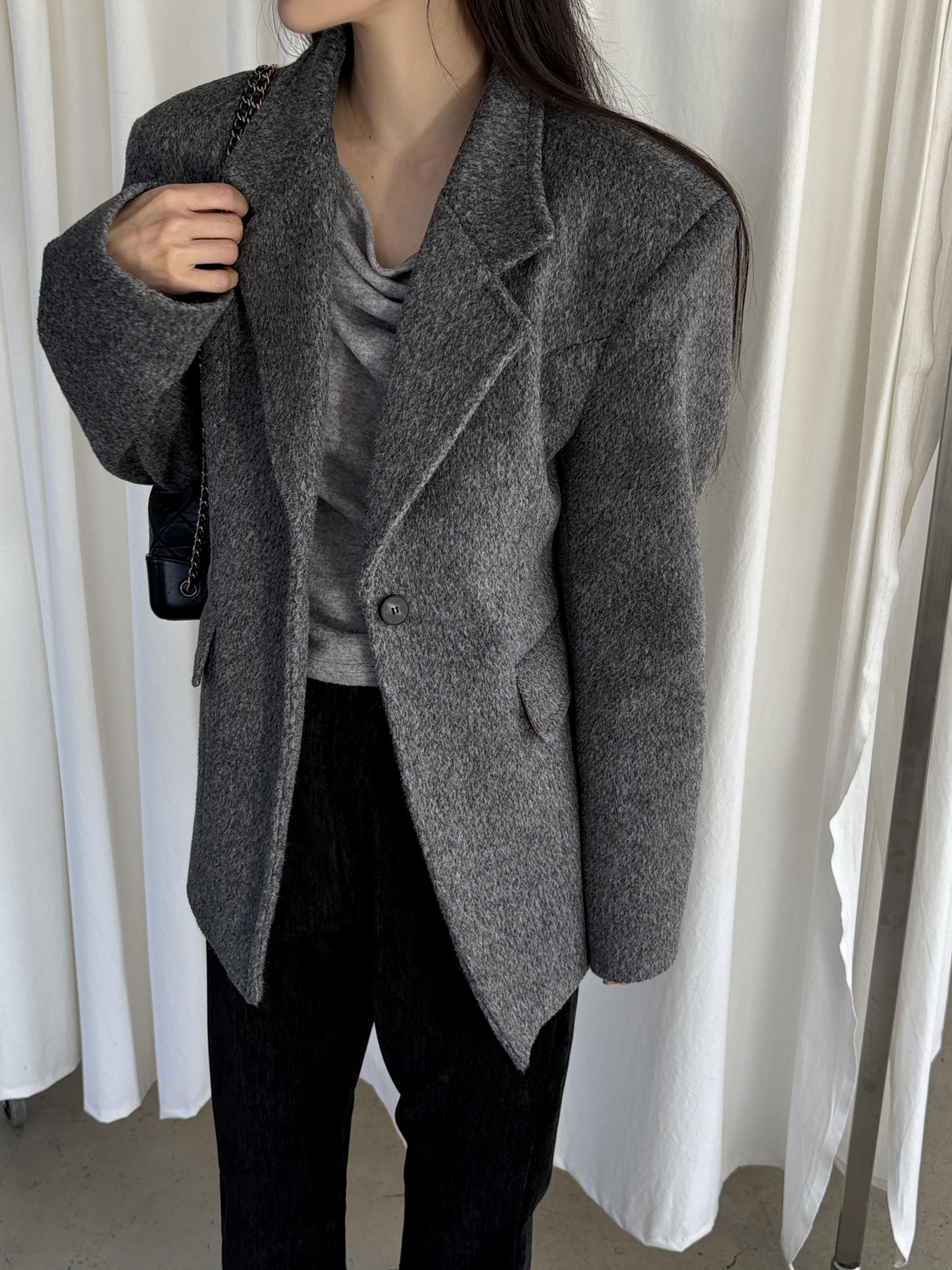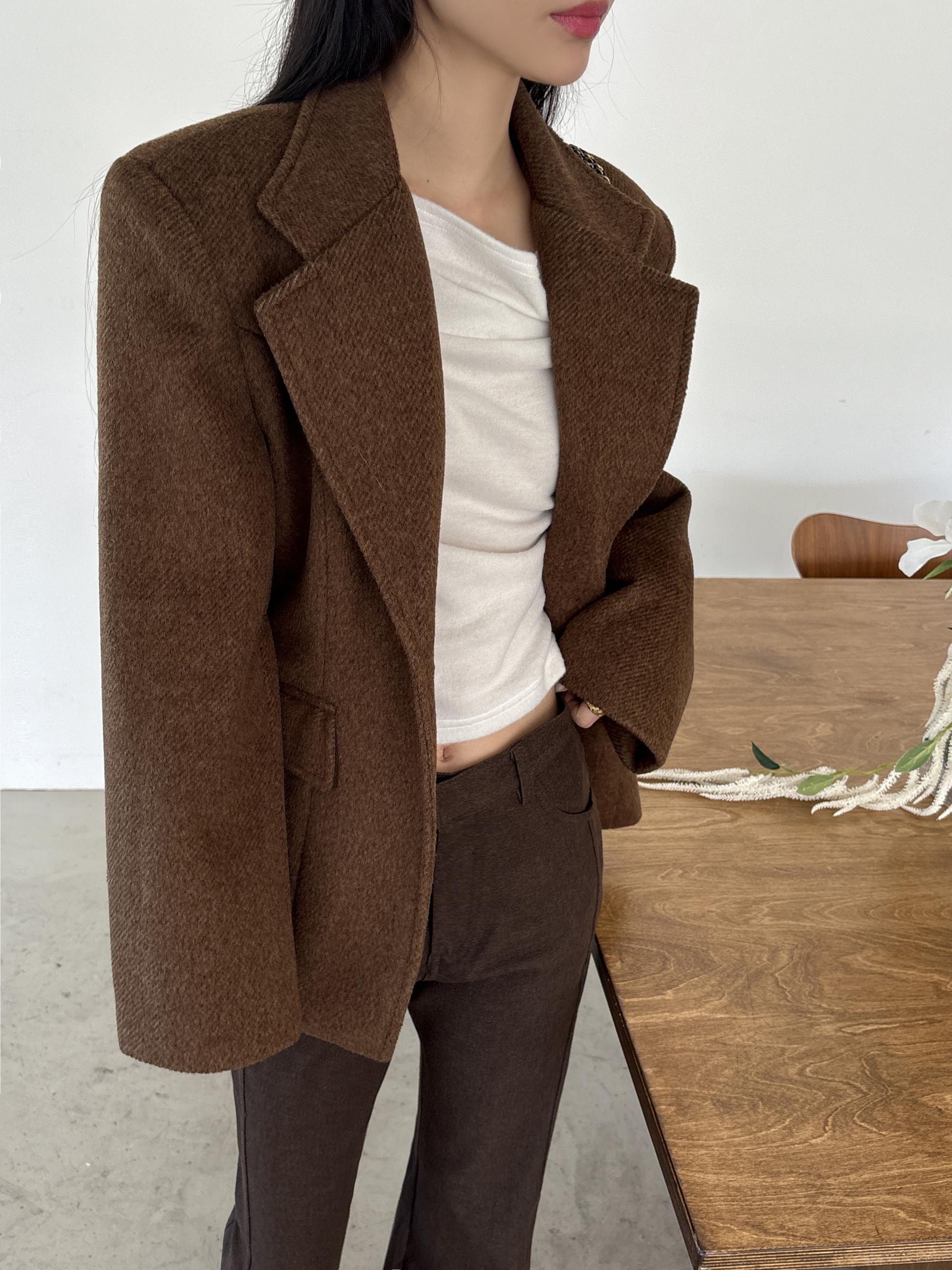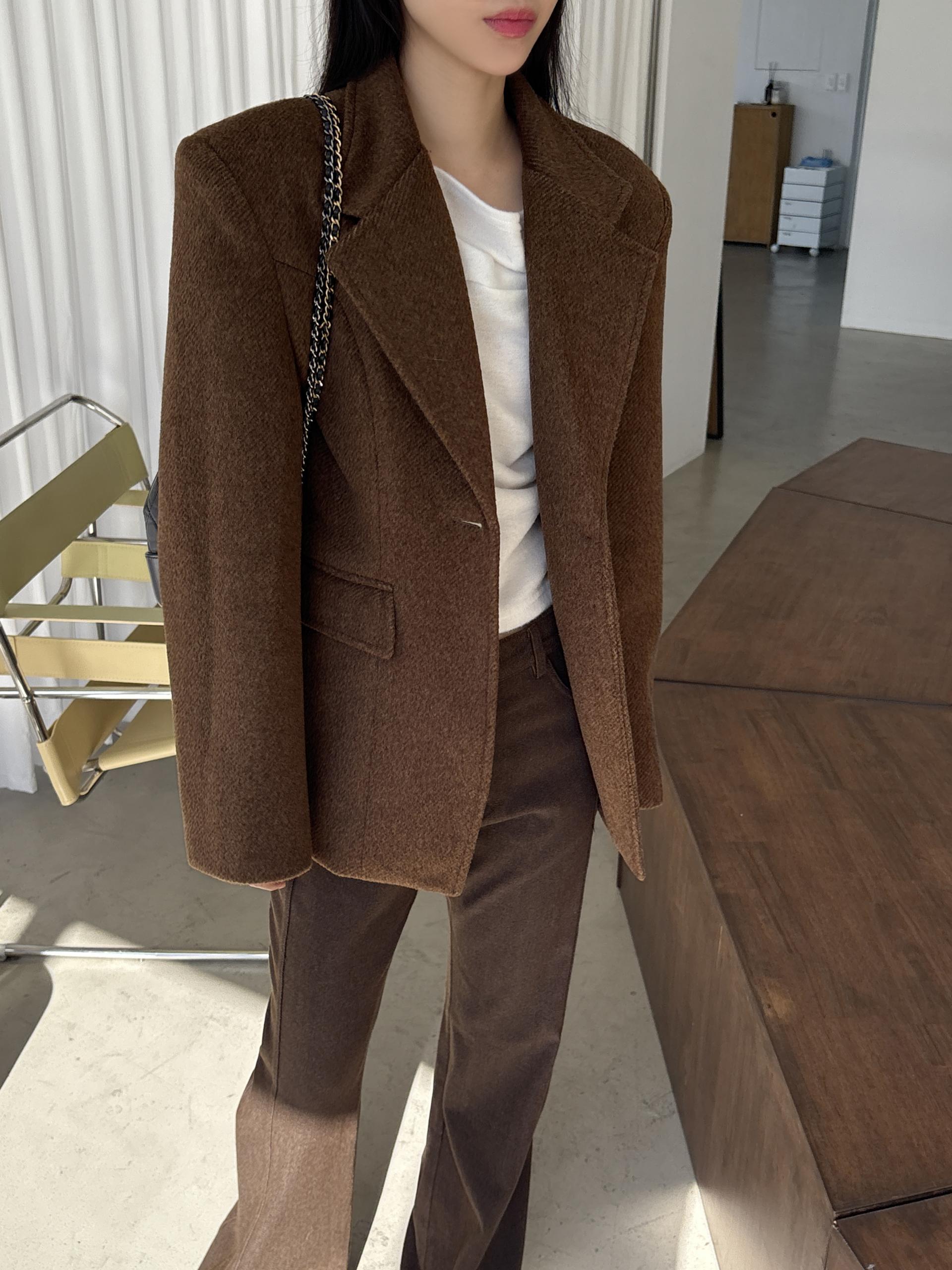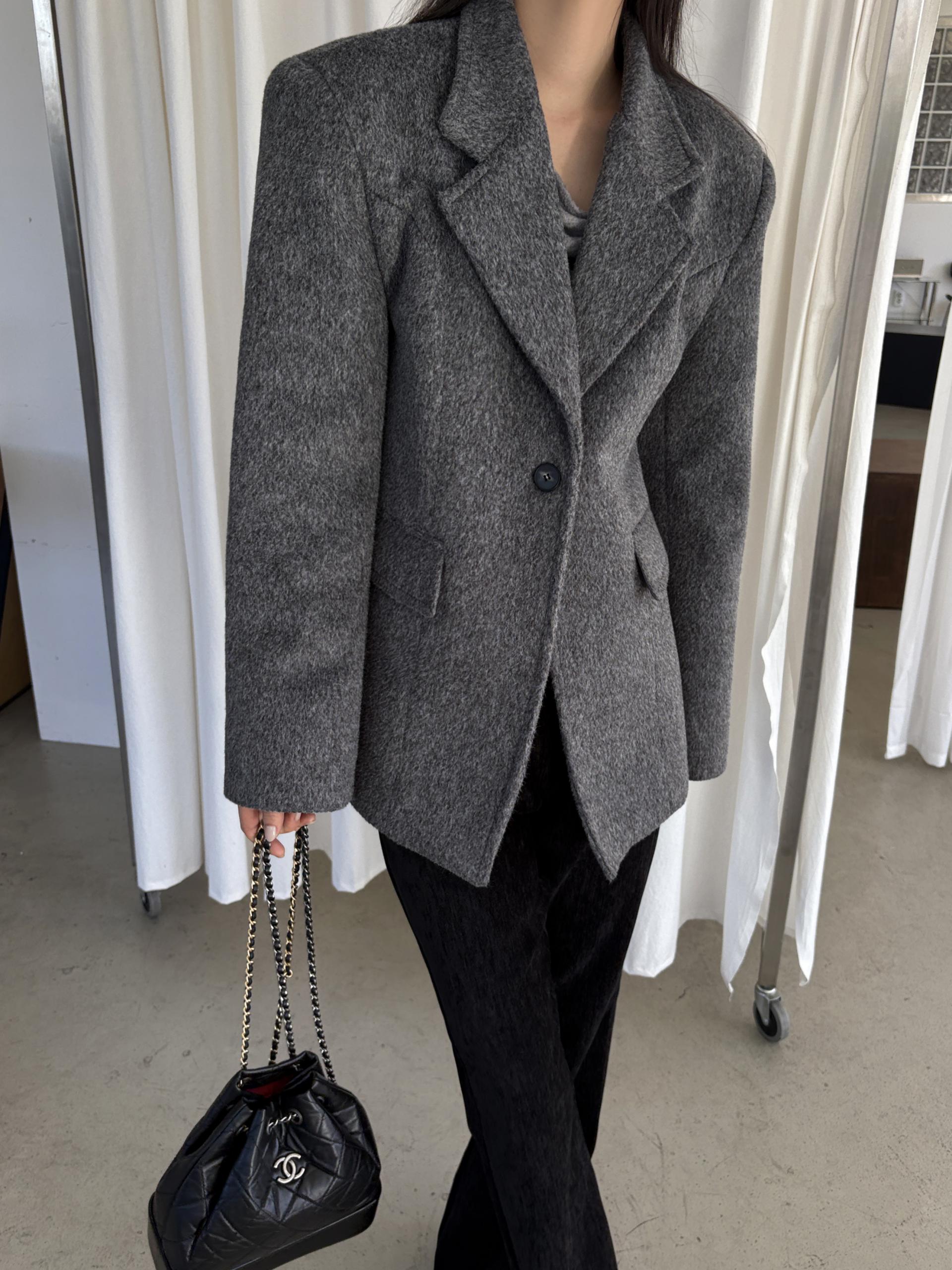 정돈된 어깨 라인과 잘록한 허리 라인이 체형을 살려주고, 깔끔한 라펠 디테일로 고급스러움을 더합니다.