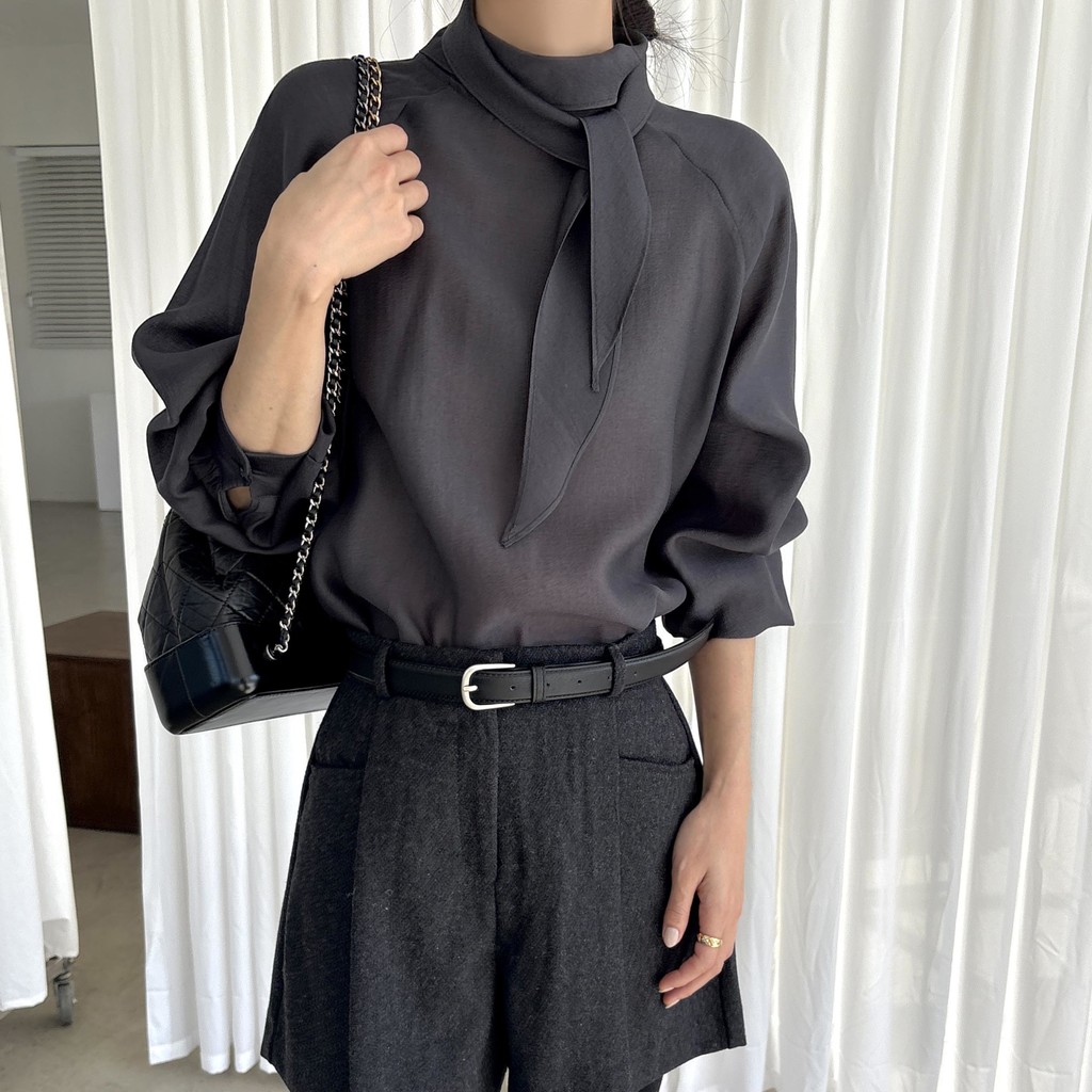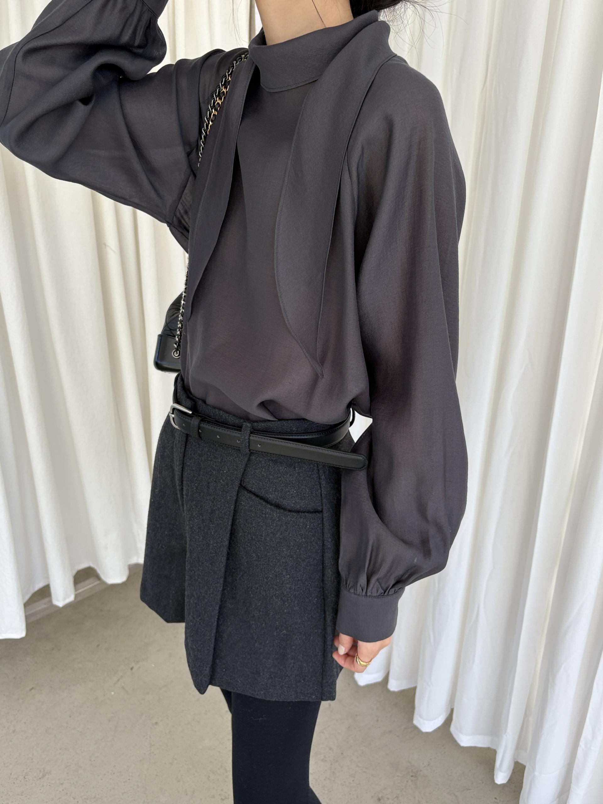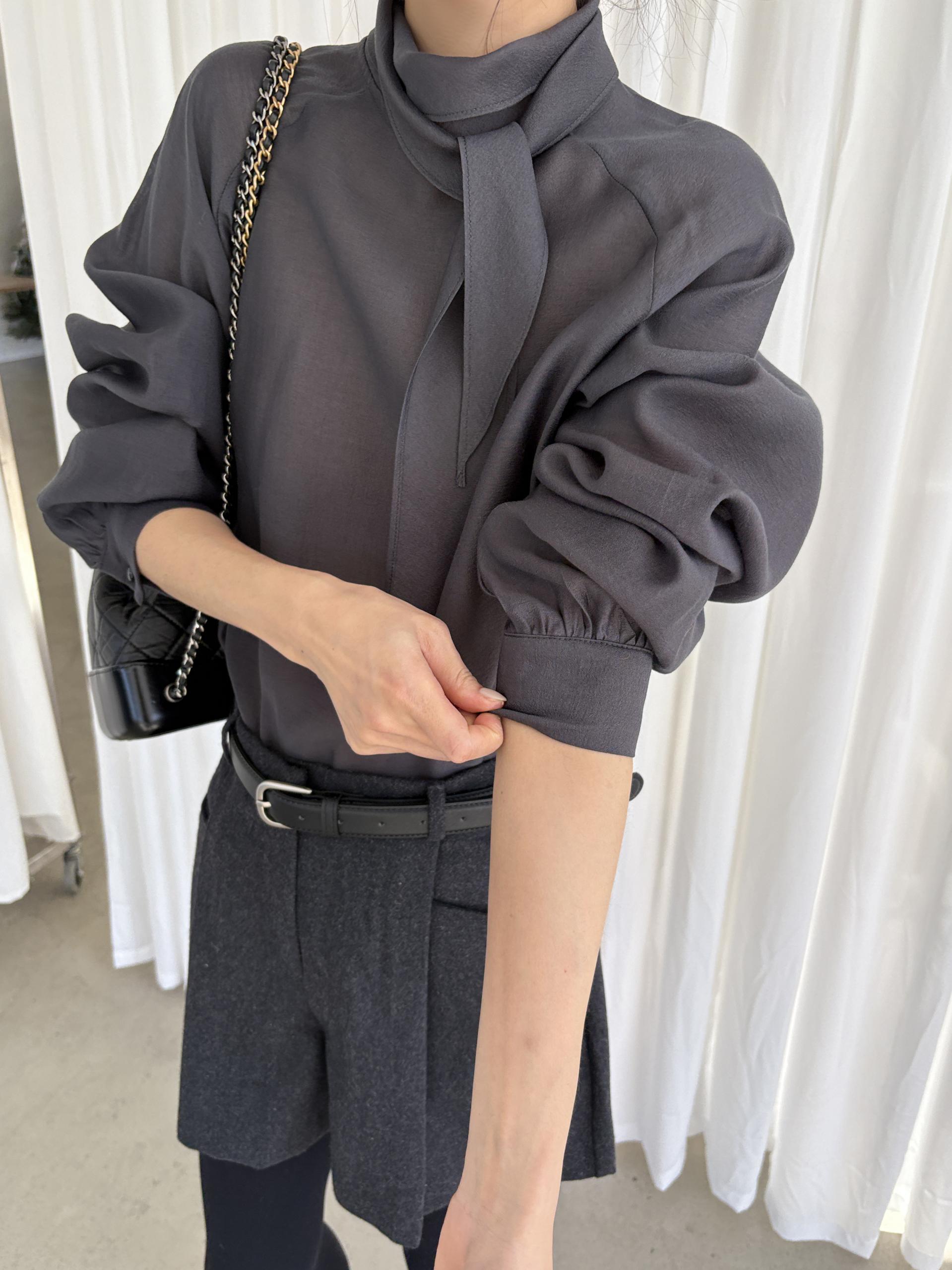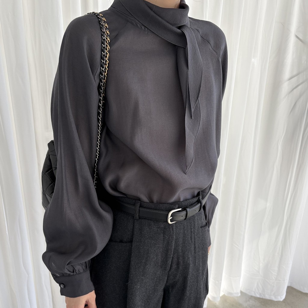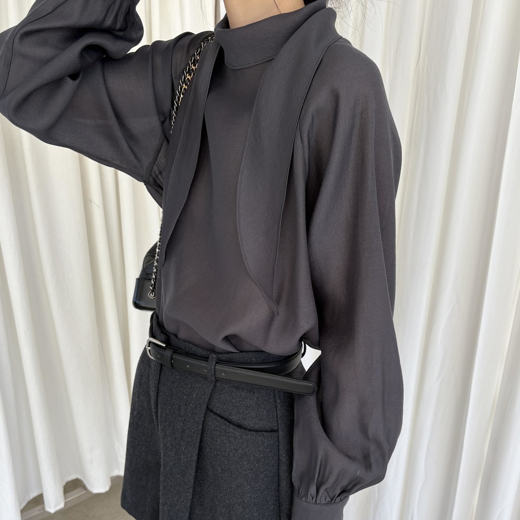 자연스레 떨어지는 넥 스카프 디테일이 고급스러운 분위기를 완성하며, 볼륨감 있는 소매 라인이 우아한 실루엣을 연출합니다. 탄탄한 소매 커프스가 팔 라인 또 한 슬림하게 보정해 줘요.
