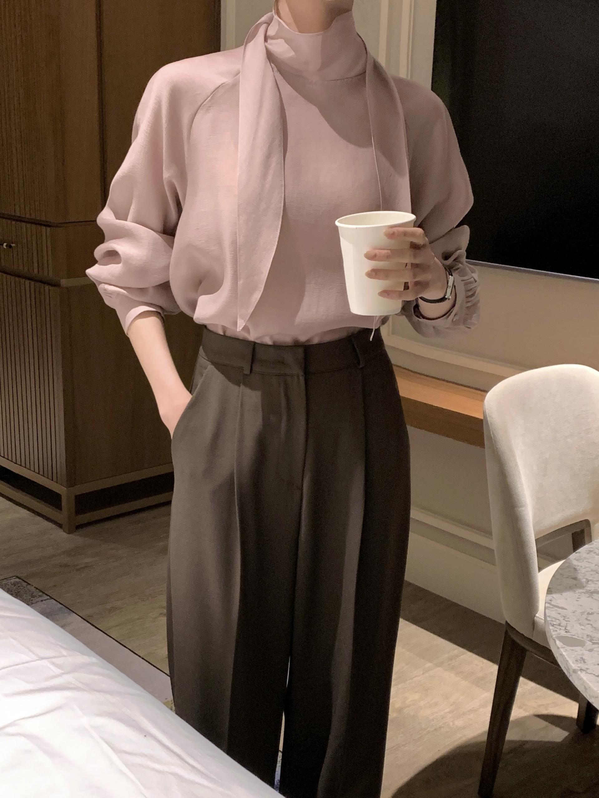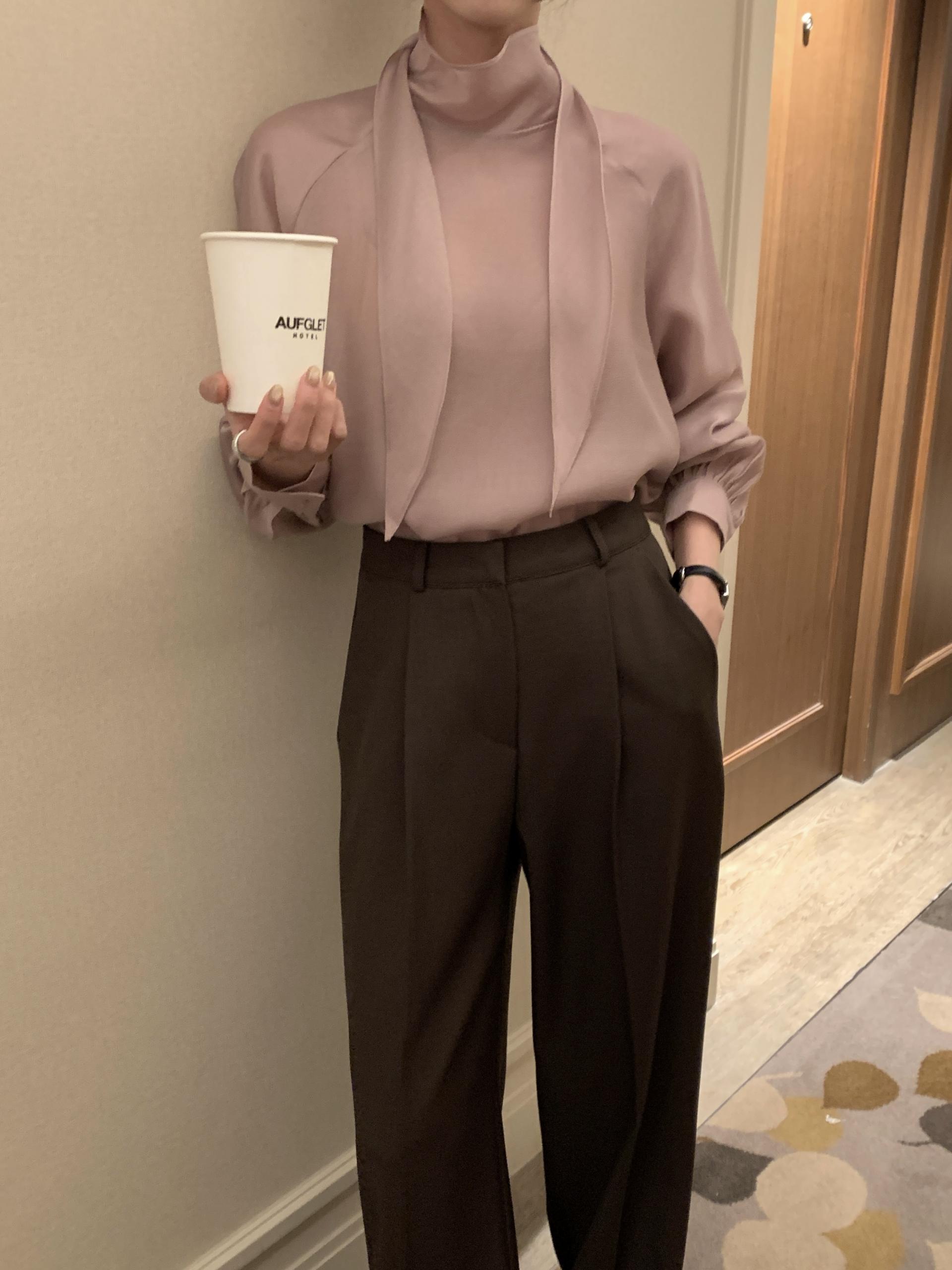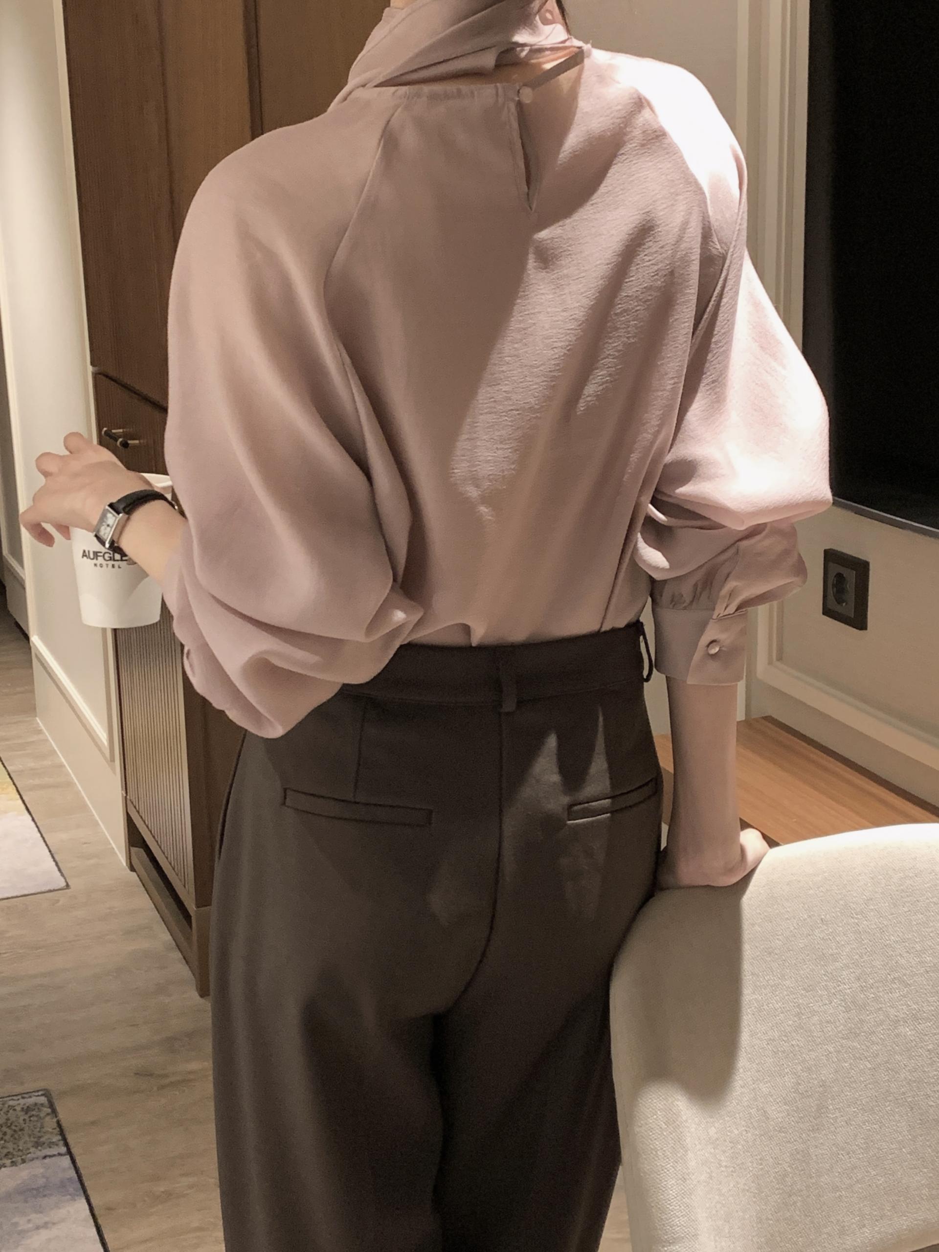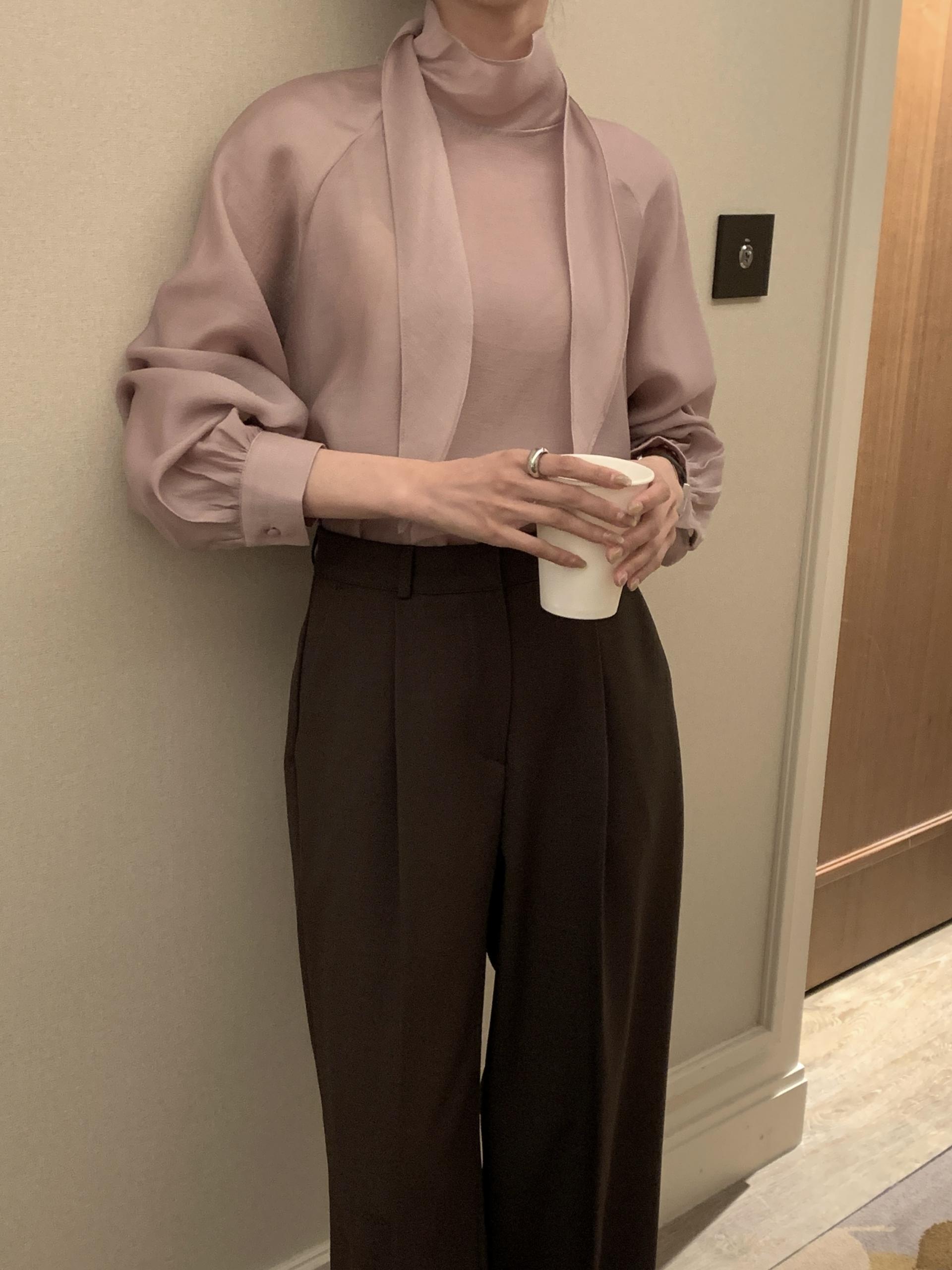 타이를 아예 뒤로 넘겨 하이넥 블라우스로 착용하셔도 좋고, 모델과 같이 앞으로 한 바퀴 감아 타이 블라우스로 착용해도 돼요.