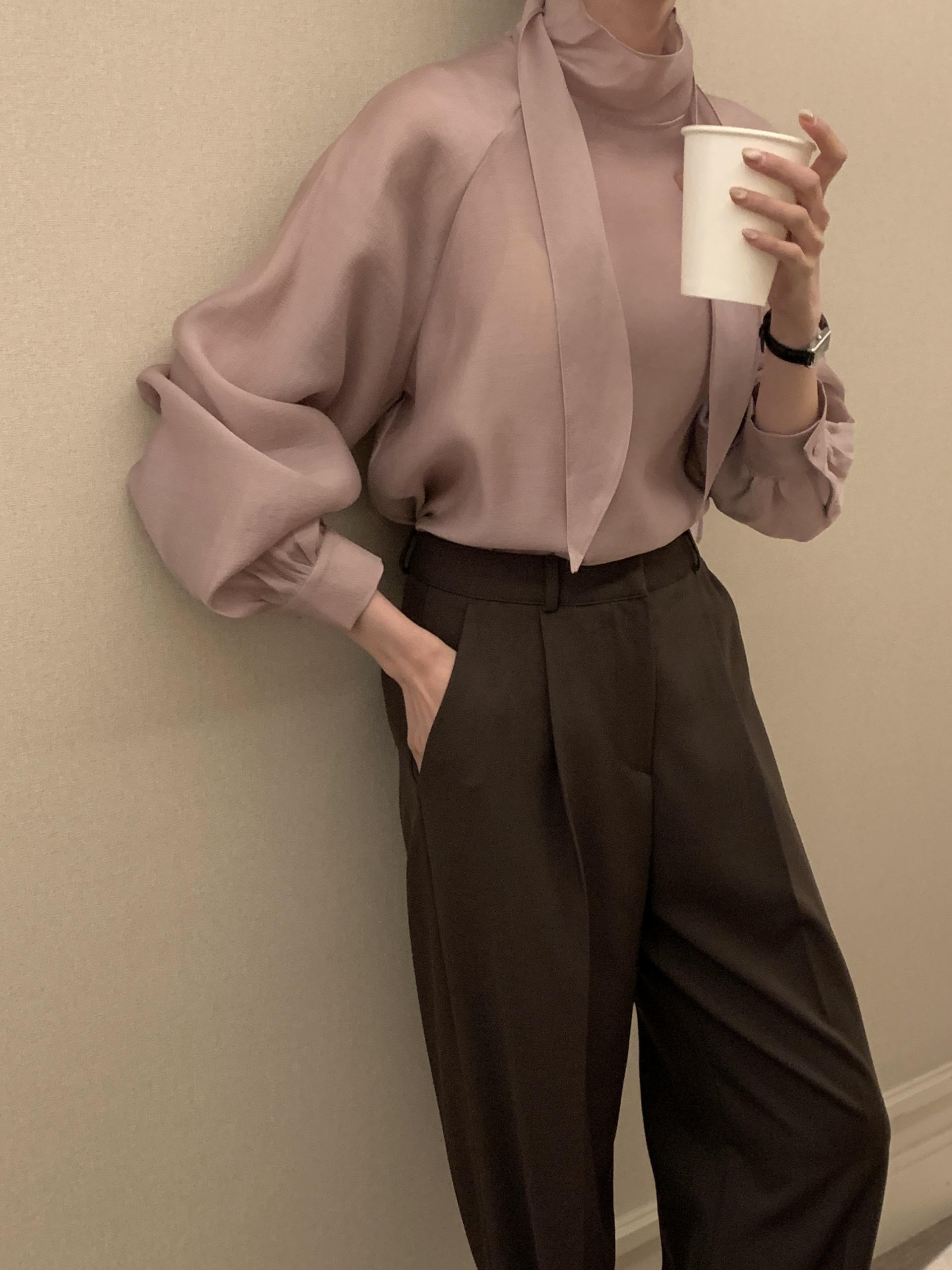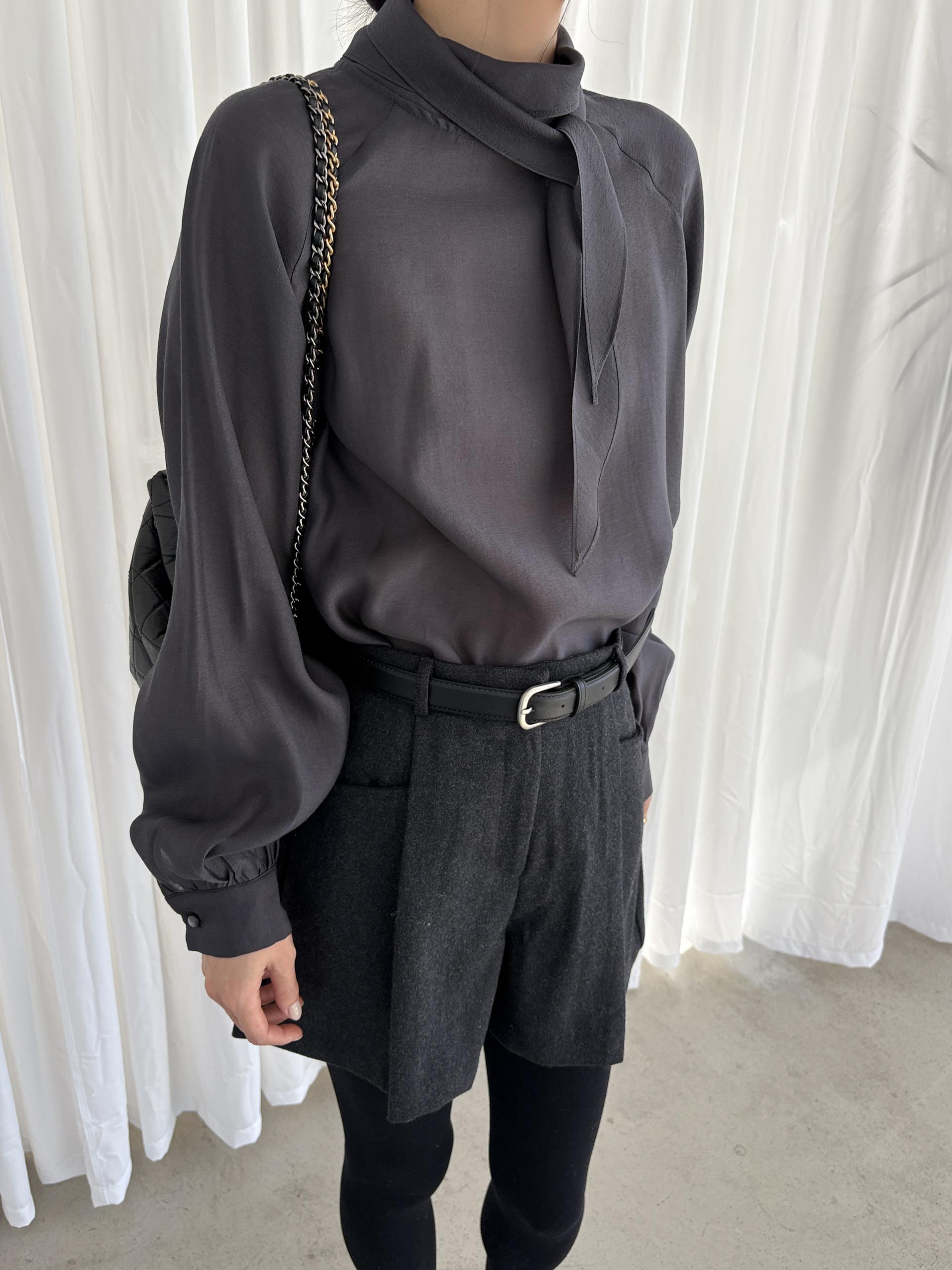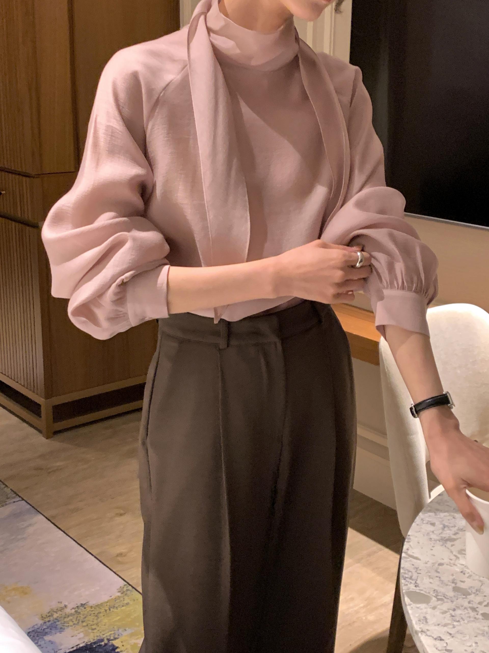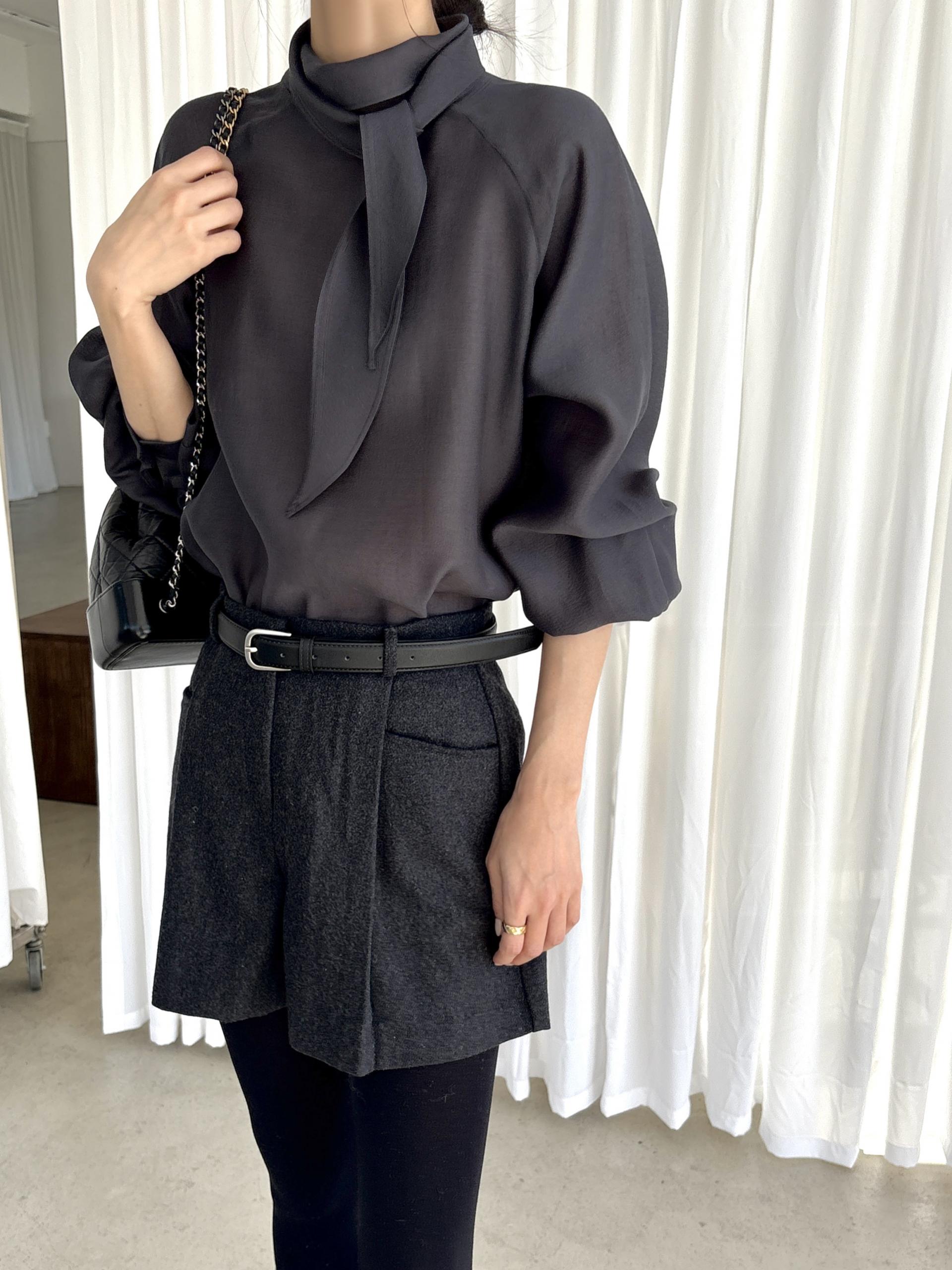 타이를 아예 뒤로 넘겨 하이넥 블라우스로 착용하셔도 좋고, 모델과 같이 앞으로 한 바퀴 감아 타이 블라우스로 착용해도 돼요.