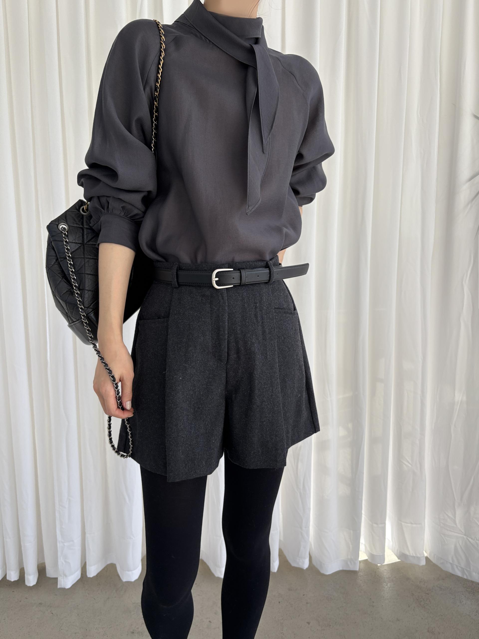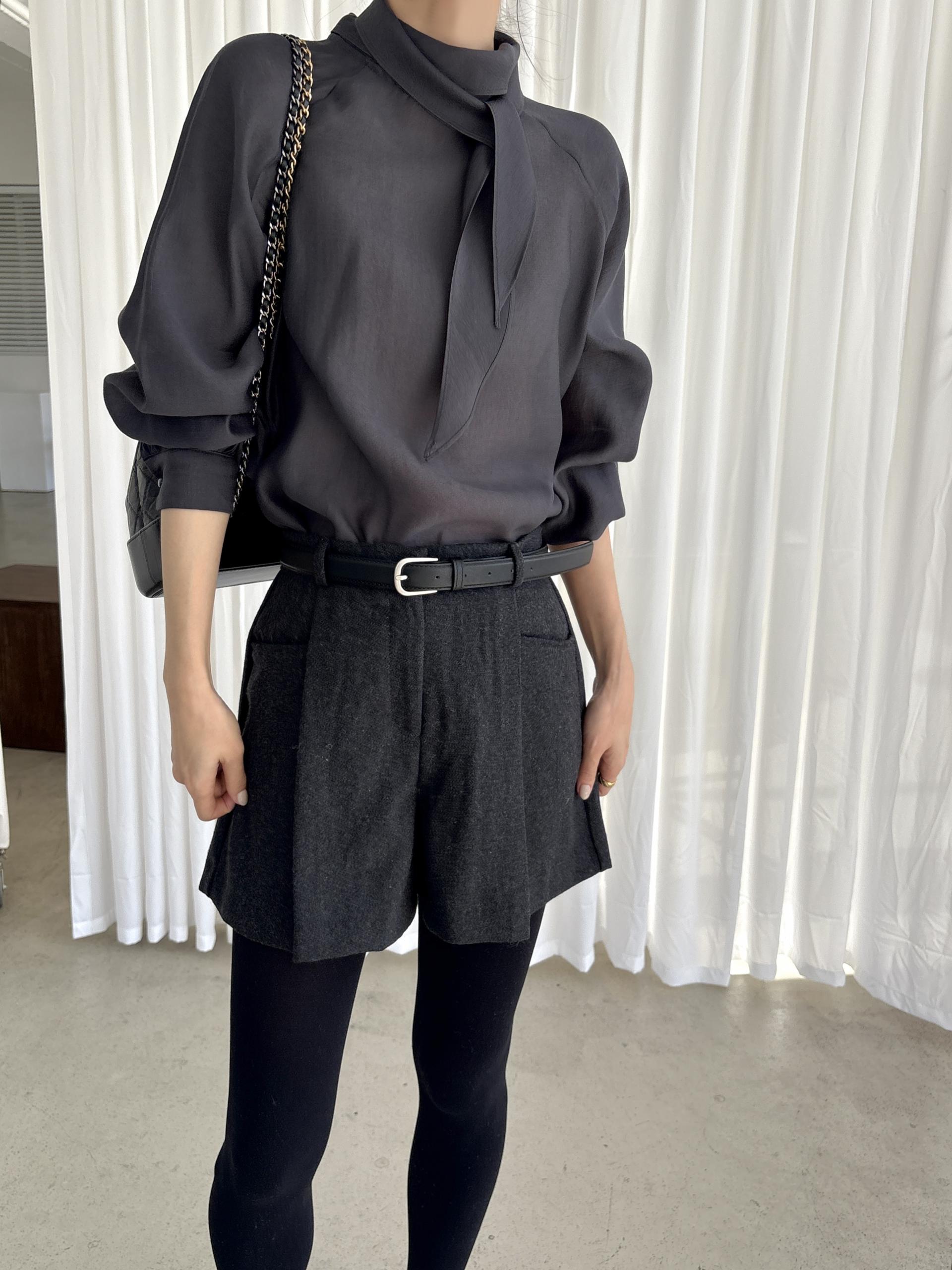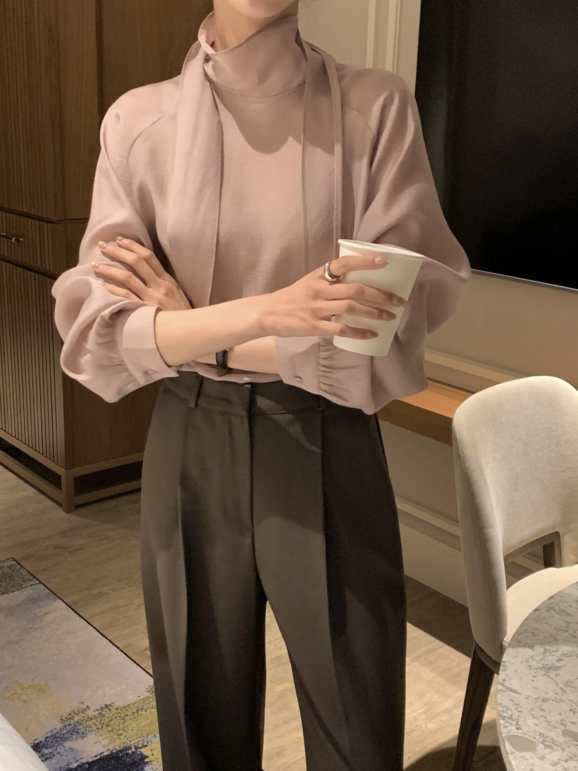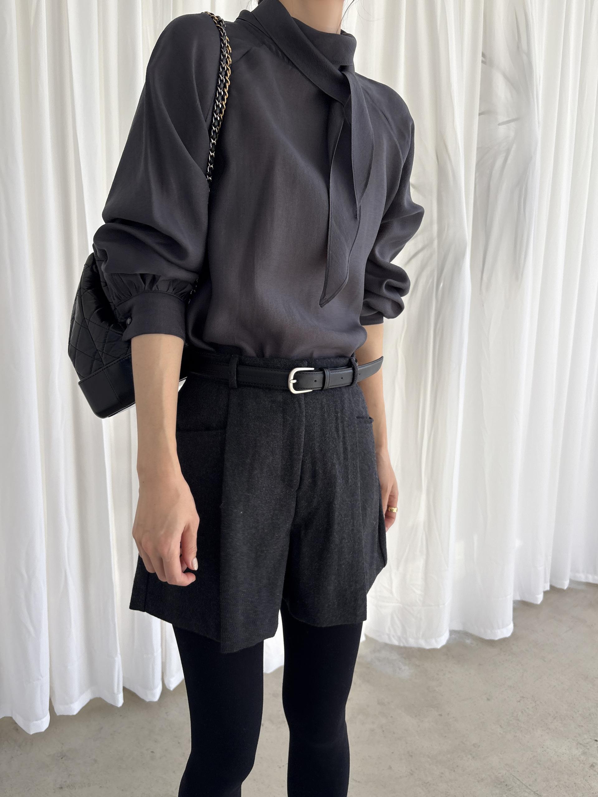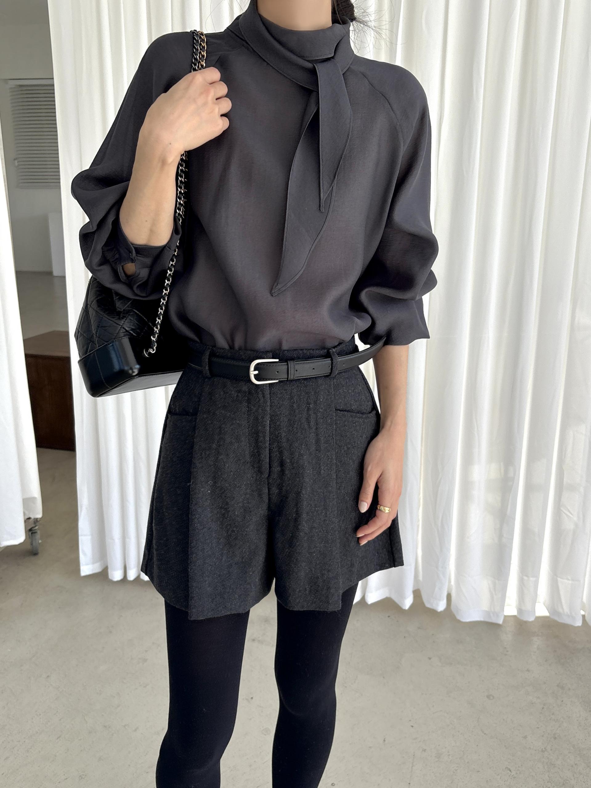 타이를 아예 뒤로 넘겨 하이넥 블라우스로 착용하셔도 좋고, 모델과 같이 앞으로 한 바퀴 감아 타이 블라우스로 착용해도 돼요.