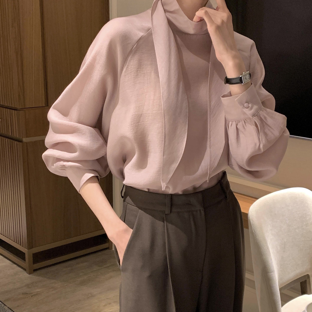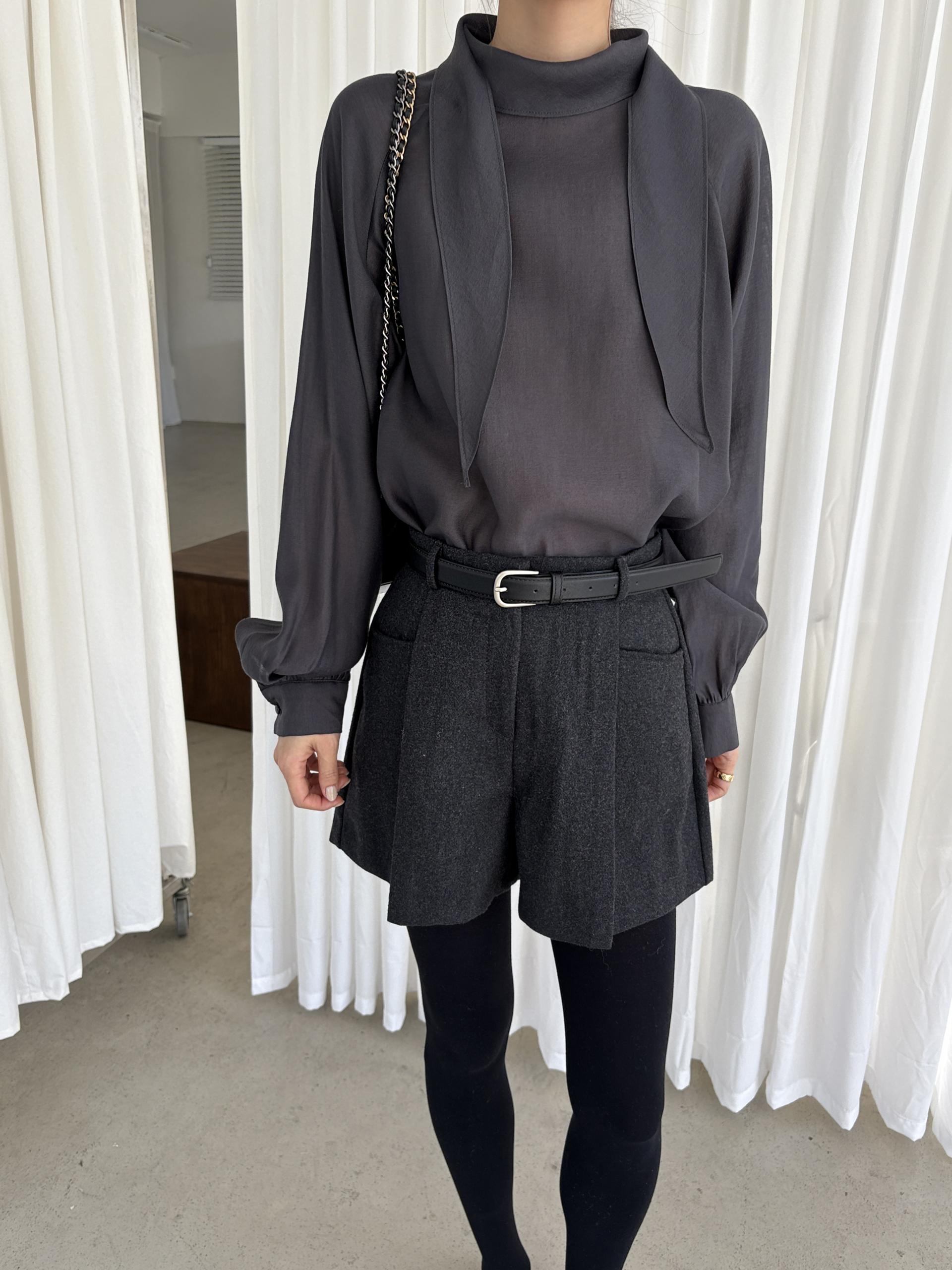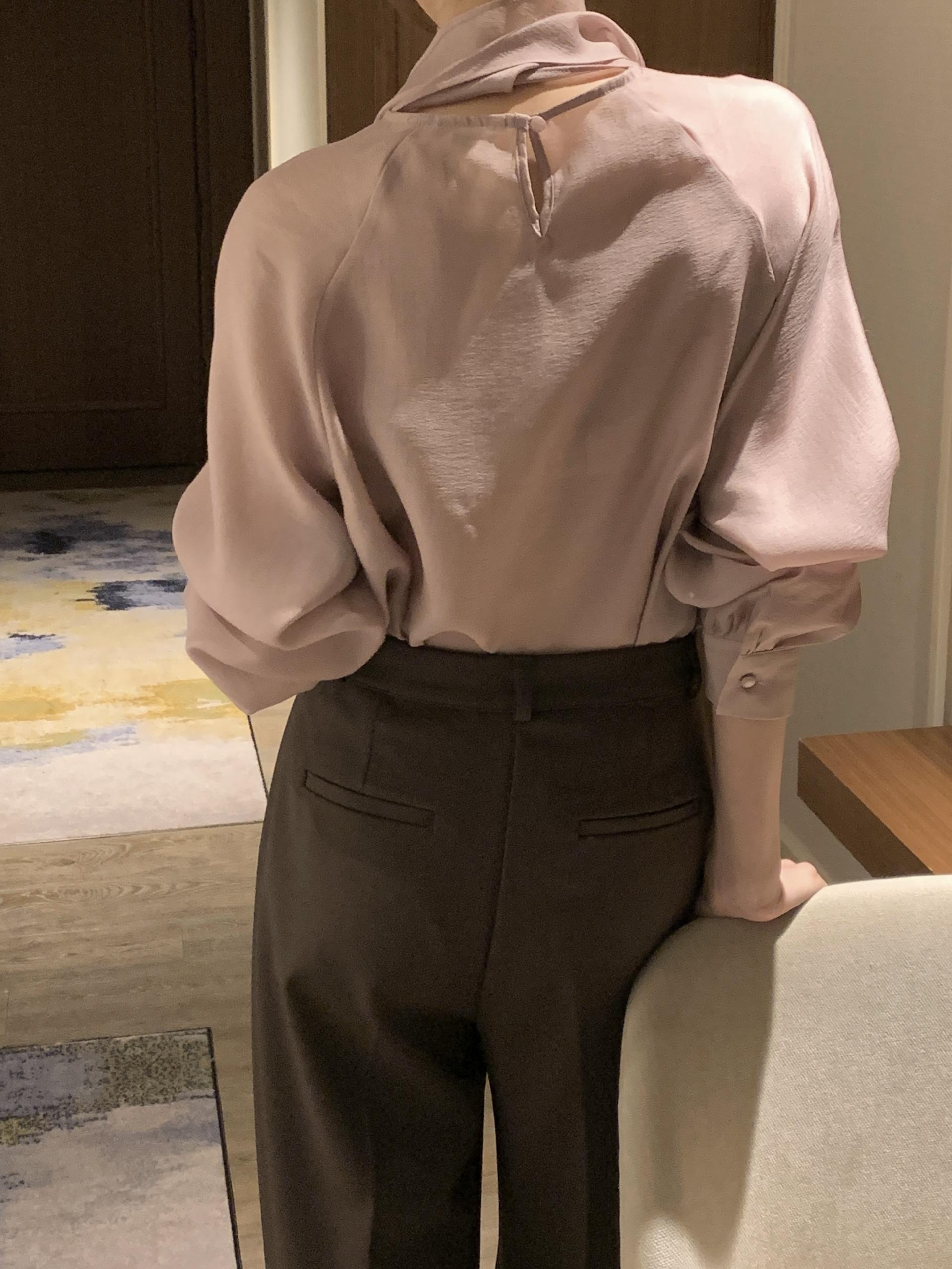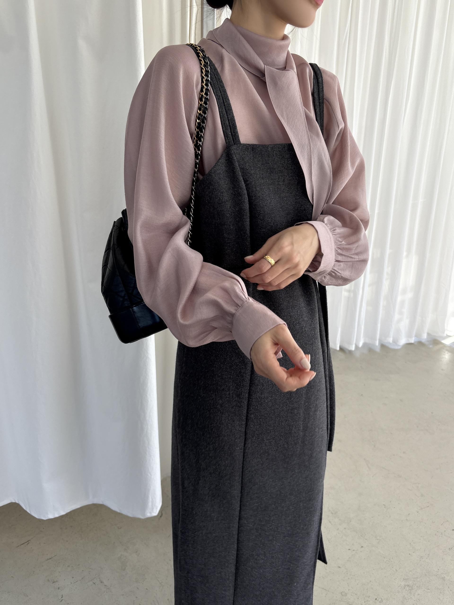 타이를 아예 뒤로 넘겨 하이넥 블라우스로 착용하셔도 좋고, 모델과 같이 앞으로 한 바퀴 감아 타이 블라우스로 착용해도 돼요.