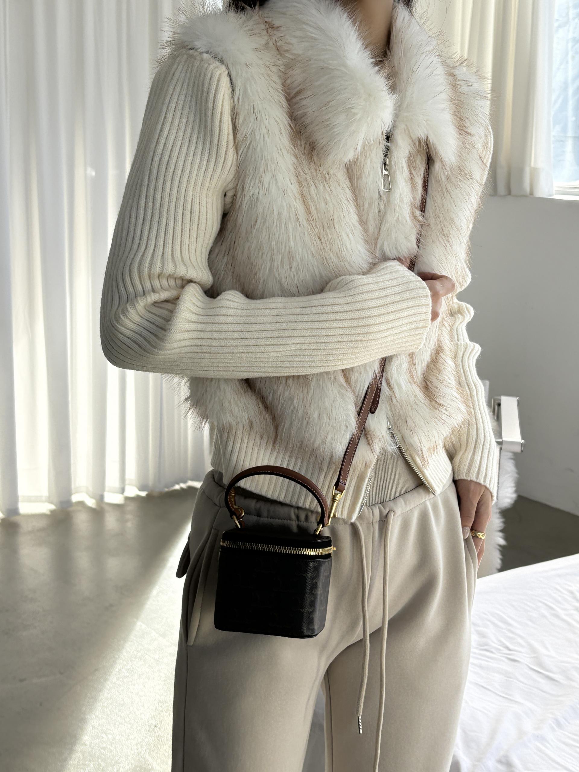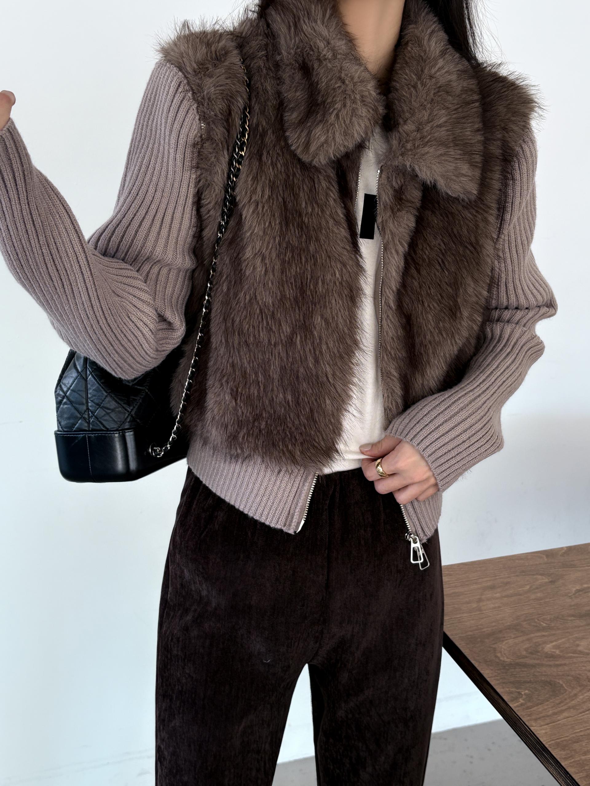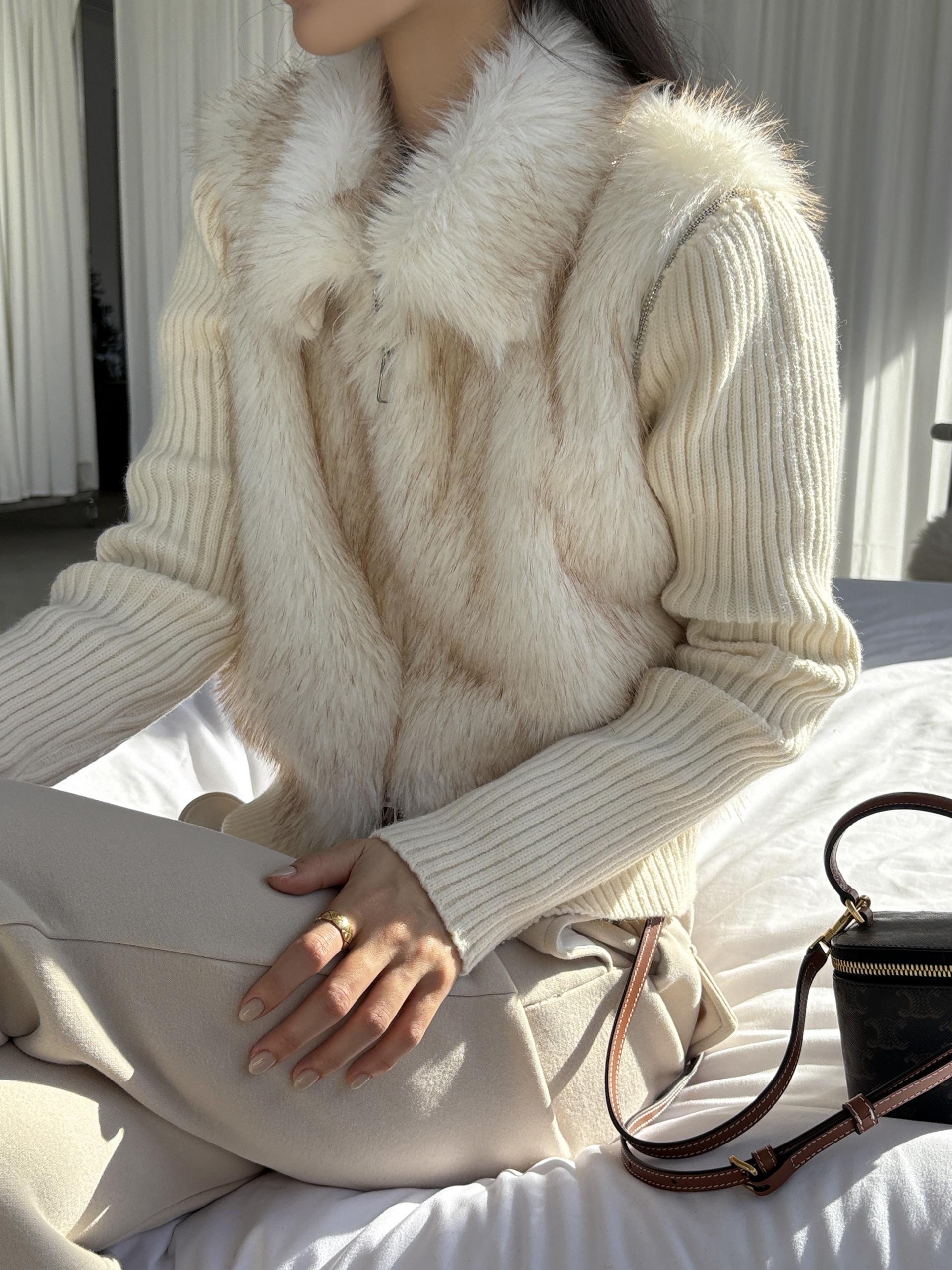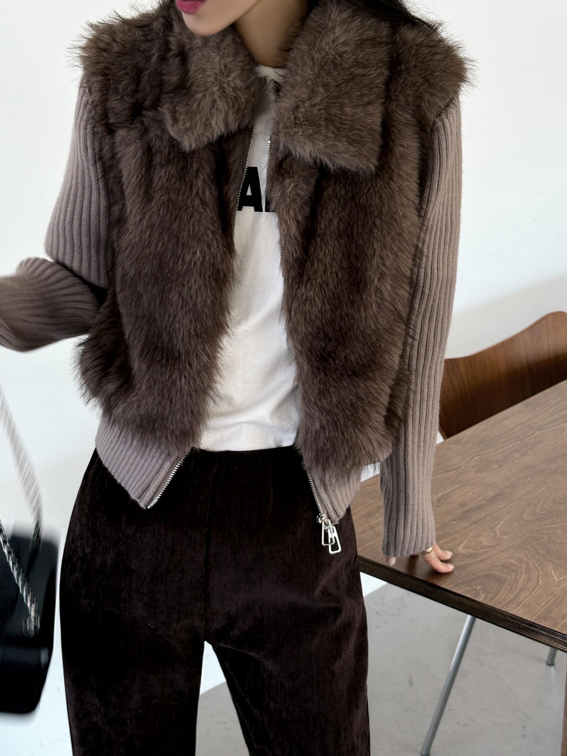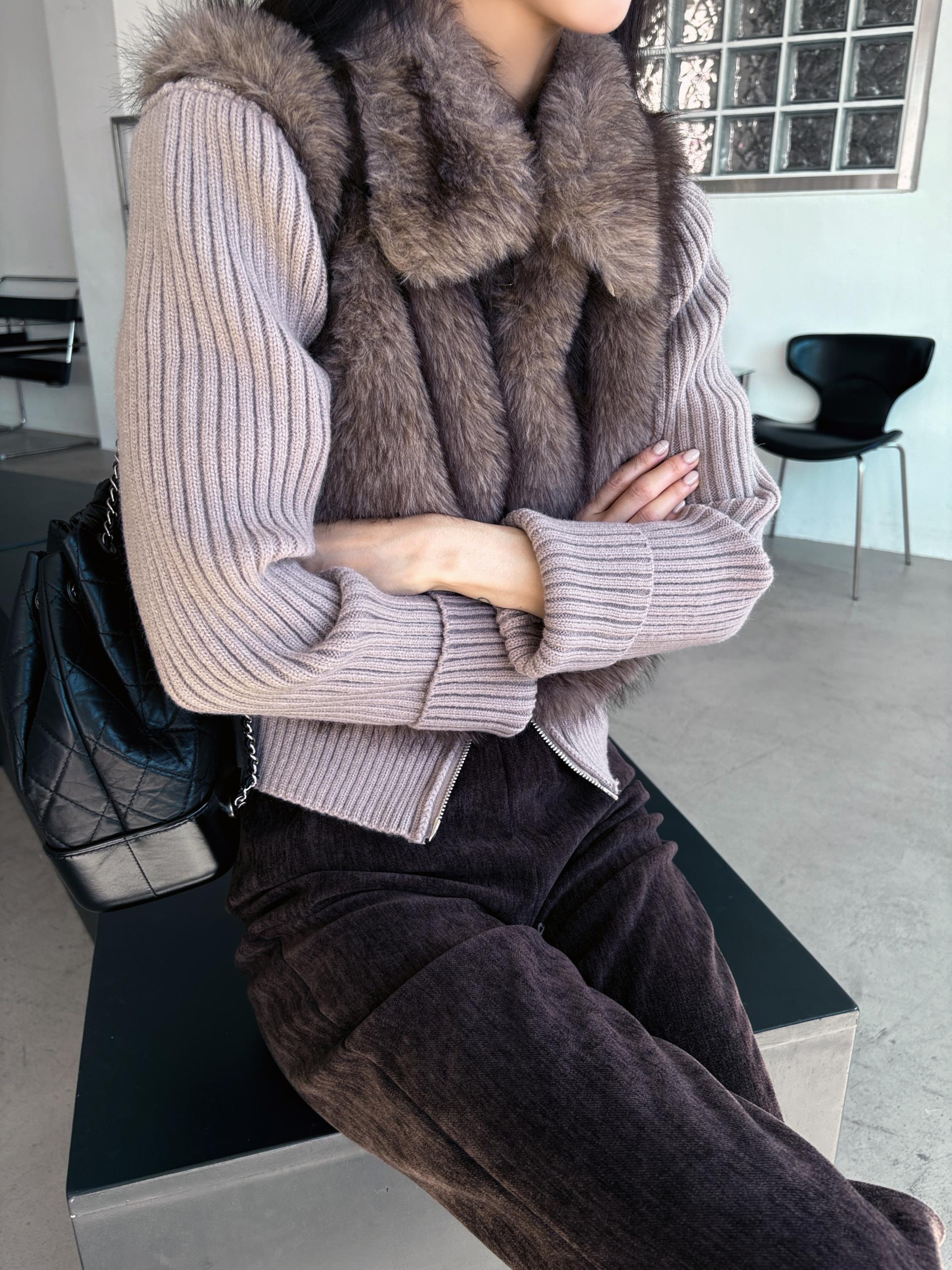 부드러운 페이크 퍼와 도톰한 골지 니트가 고급스럽게 믹스된 투웨이 니트 퍼 자켓입니다.