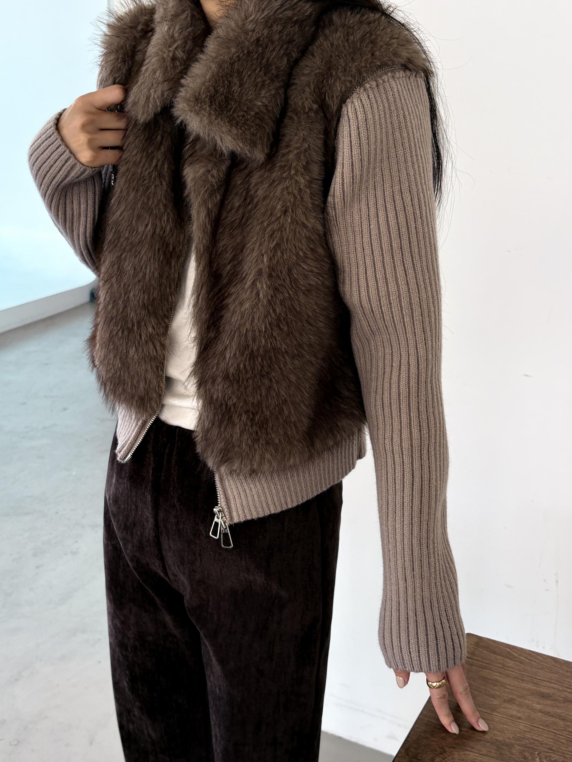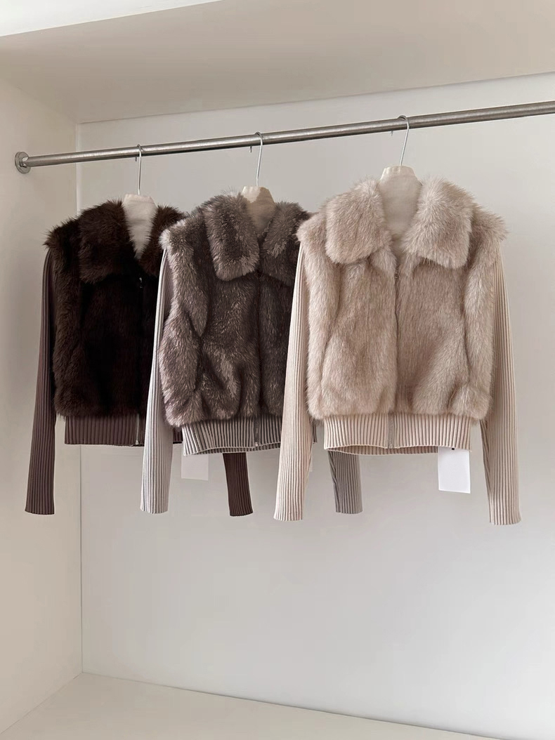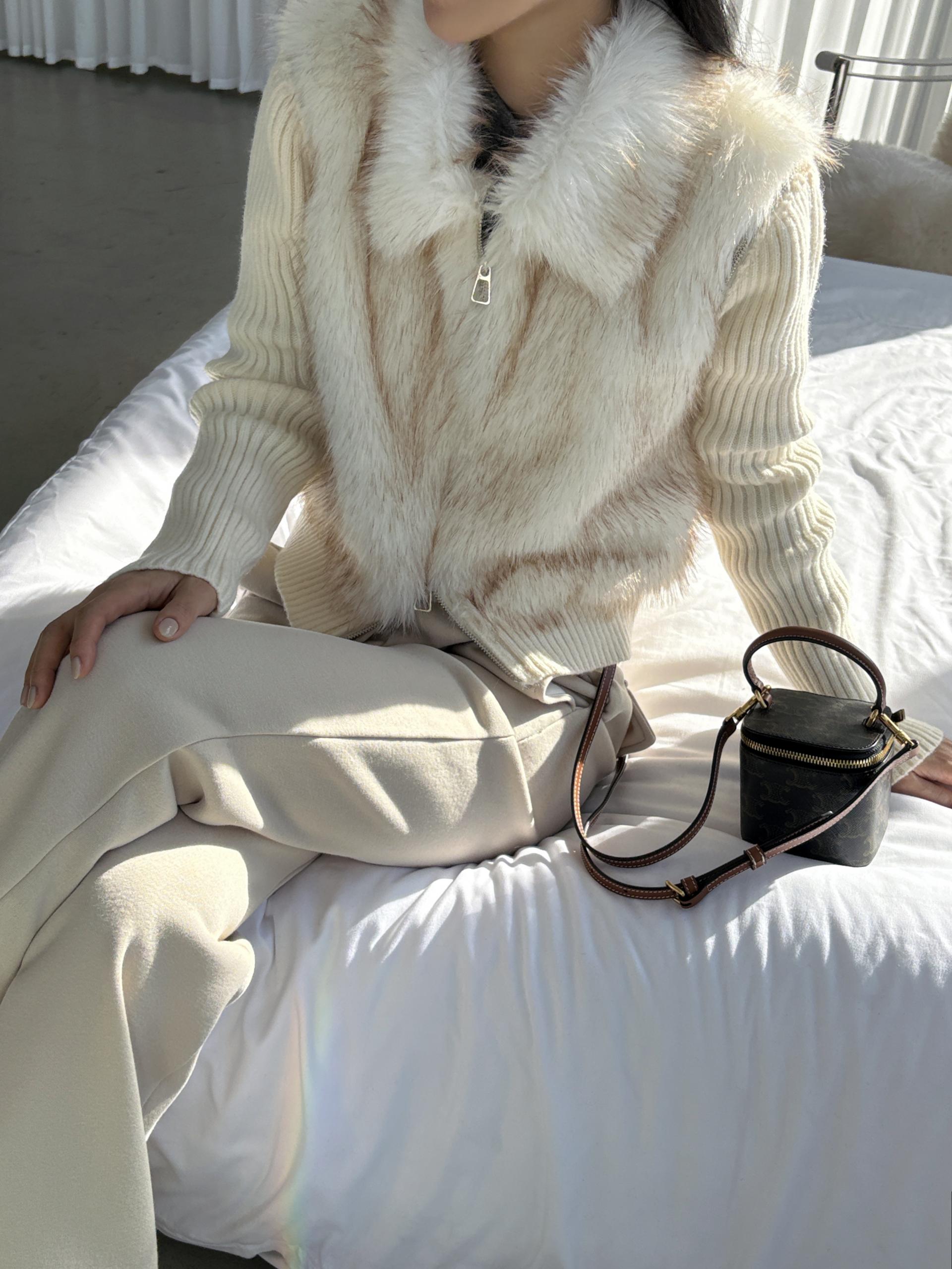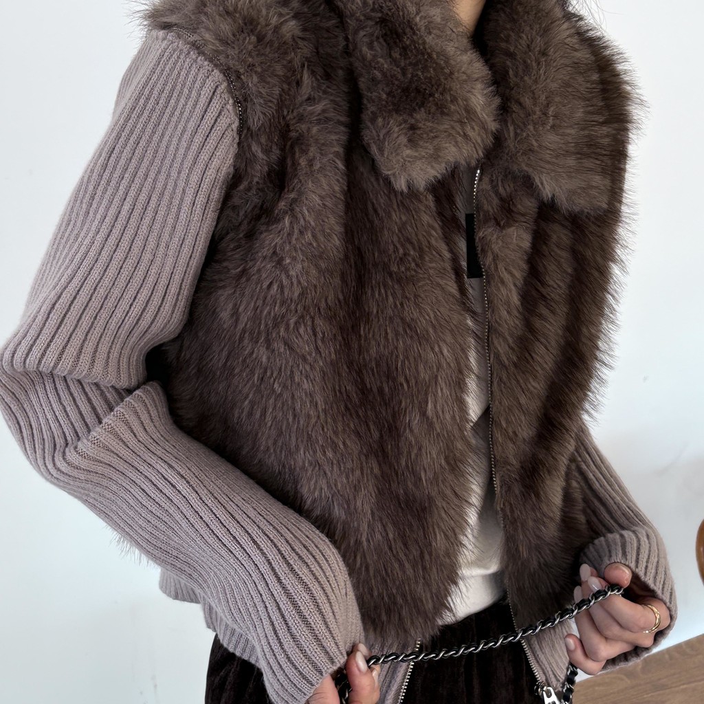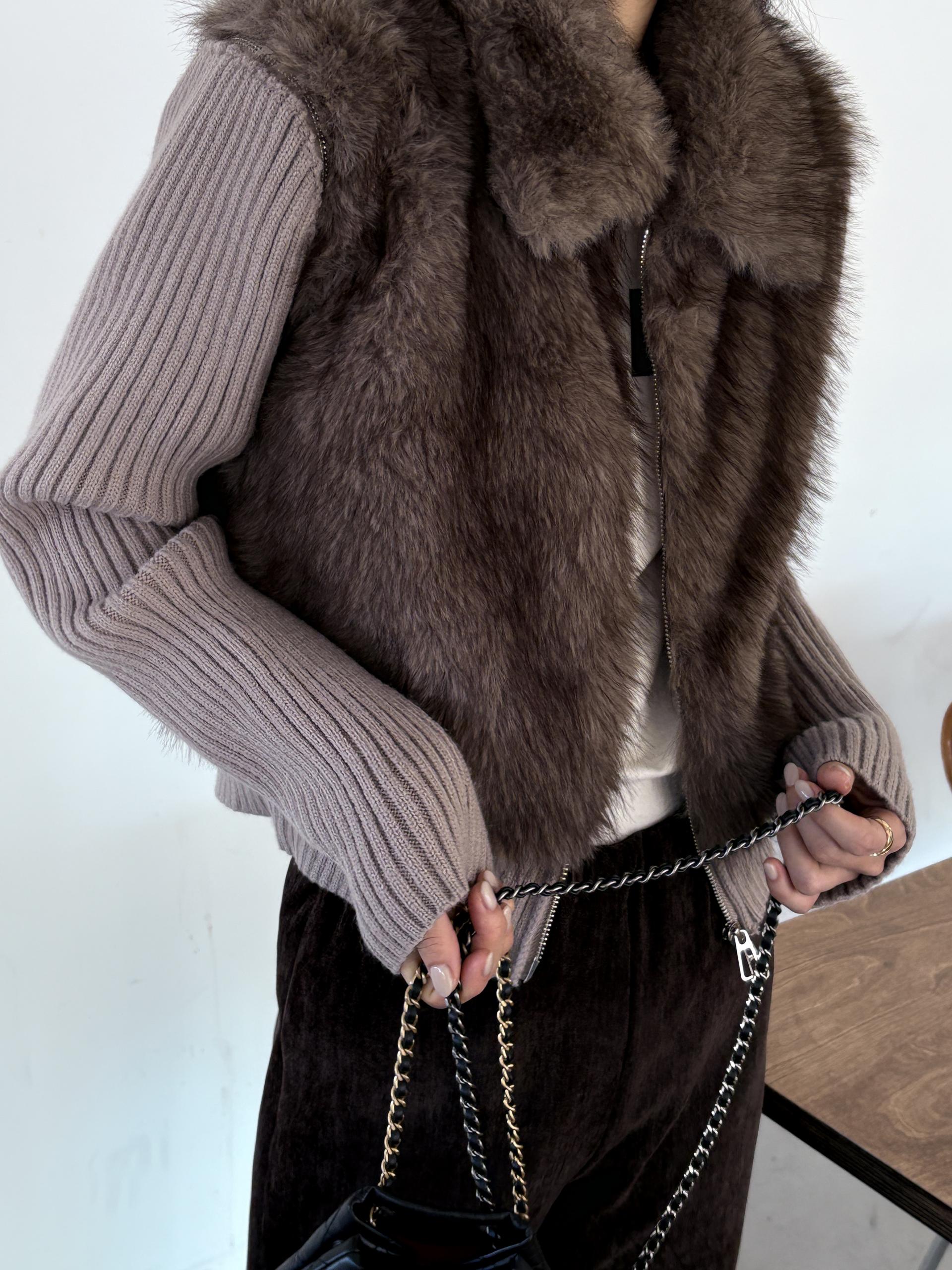 부드러운 페이크 퍼와 도톰한 골지 니트가 고급스럽게 믹스된 투웨이 니트 퍼 자켓입니다.