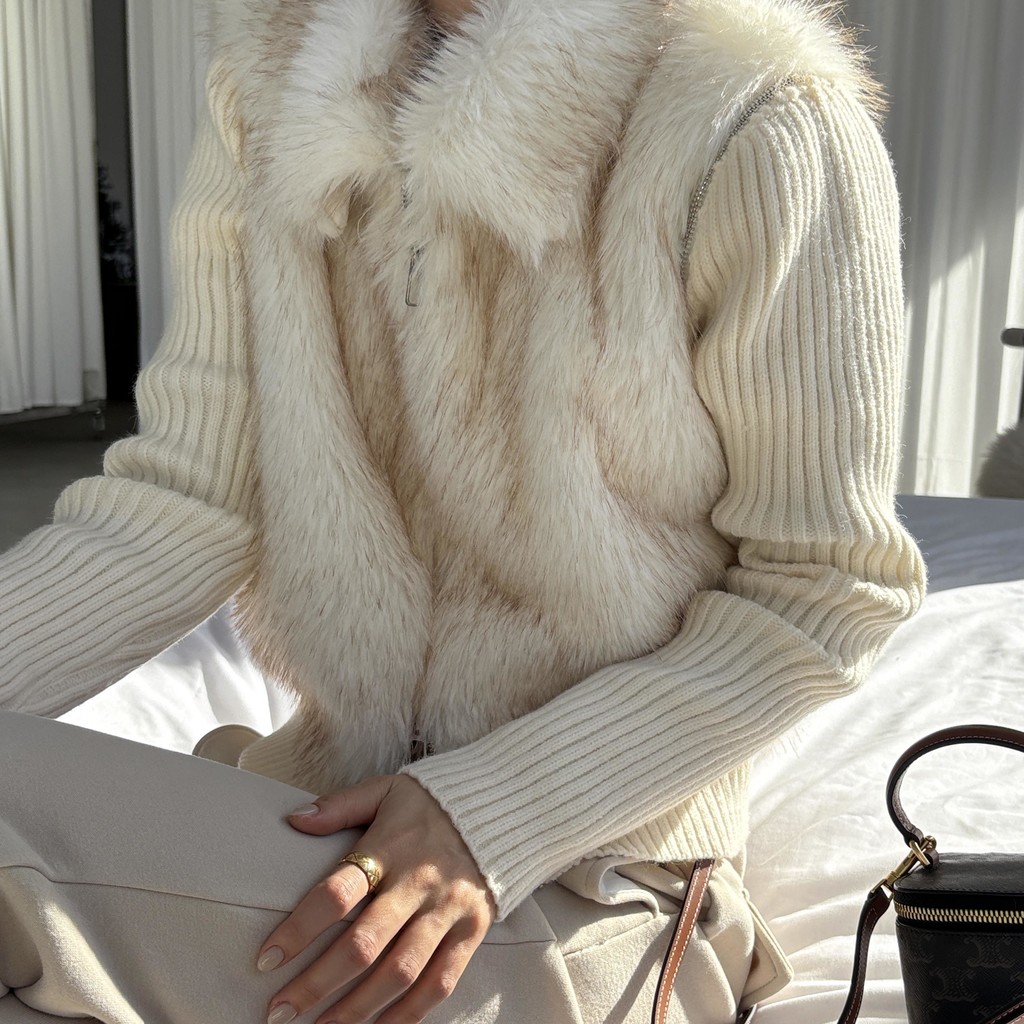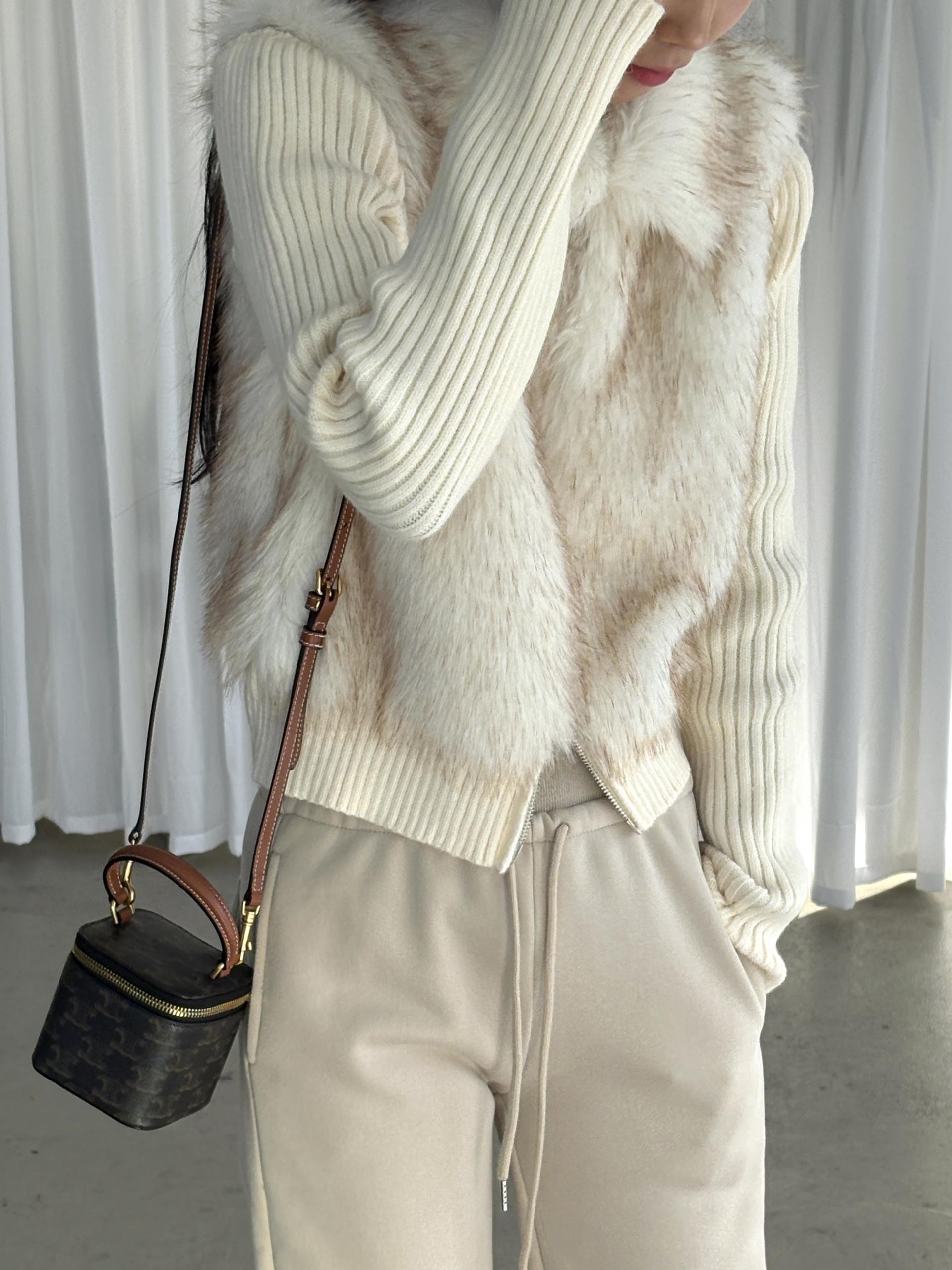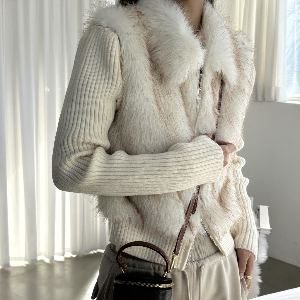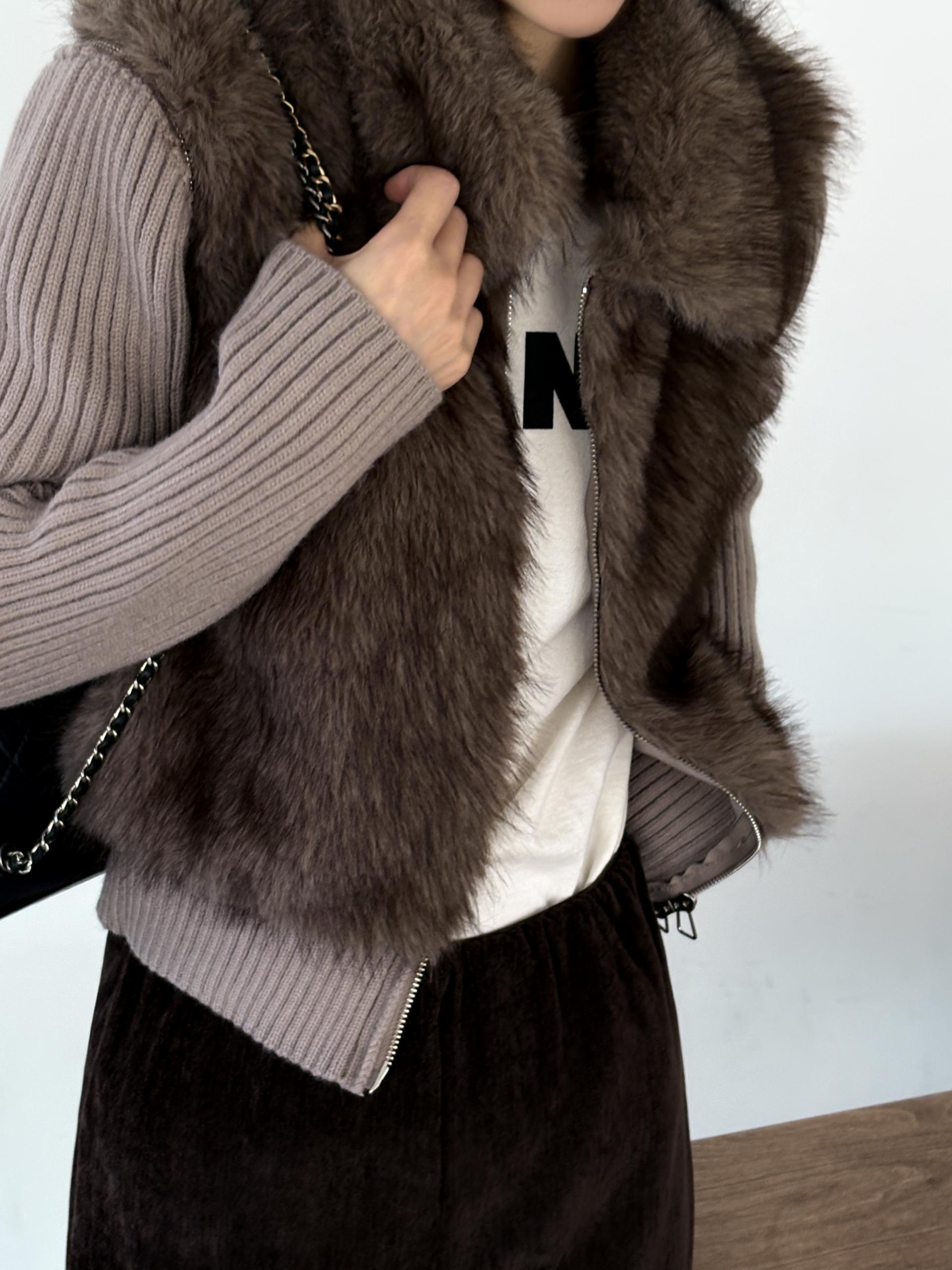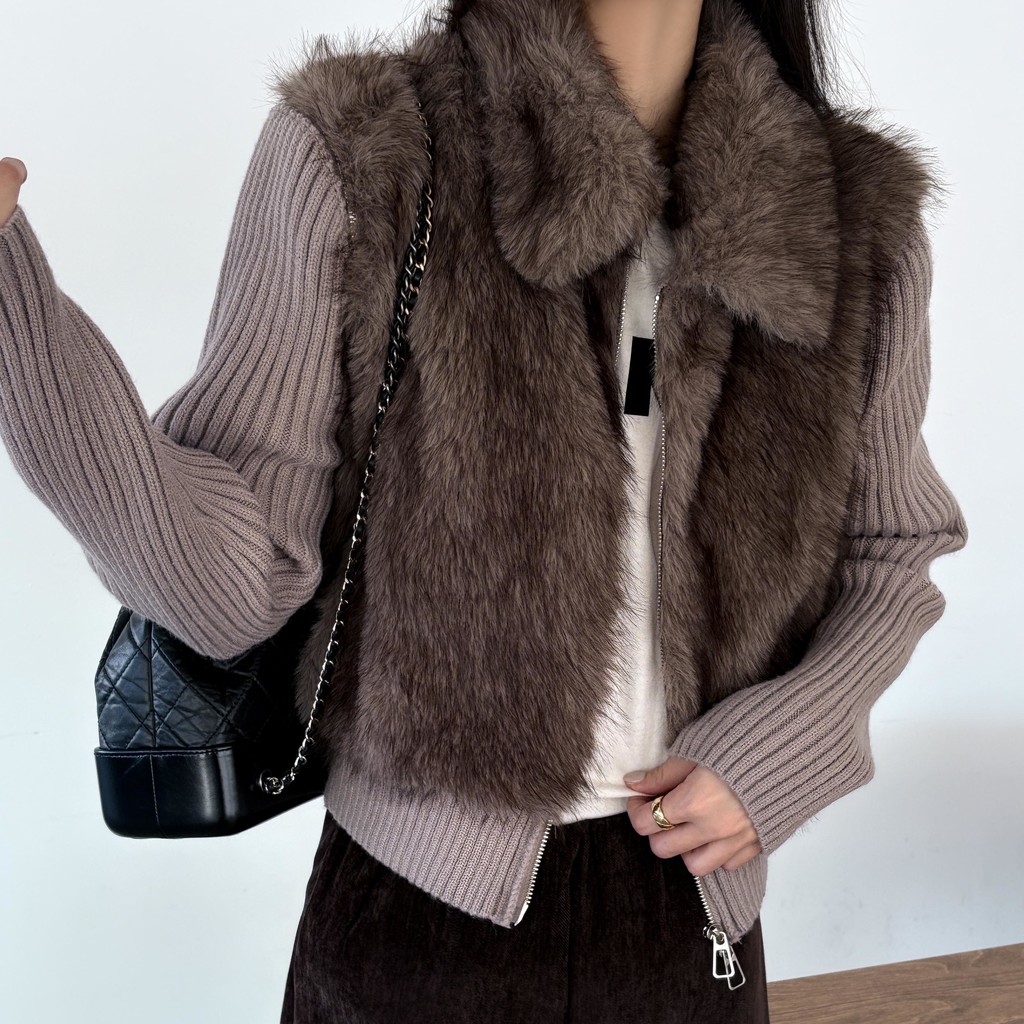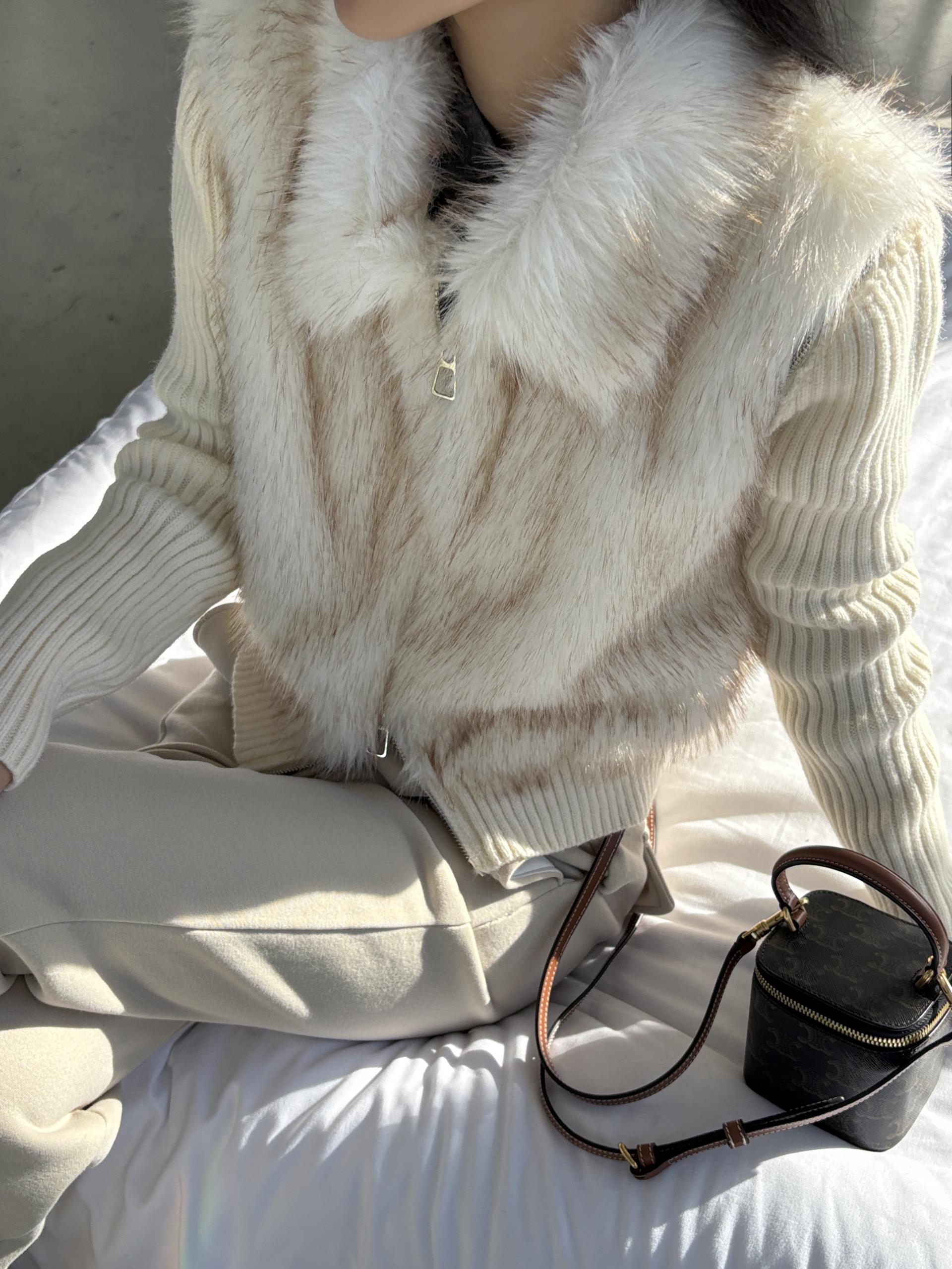부드러운 페이크 퍼와 도톰한 골지 니트가 고급스럽게 믹스된 투웨이 니트 퍼 자켓입니다.