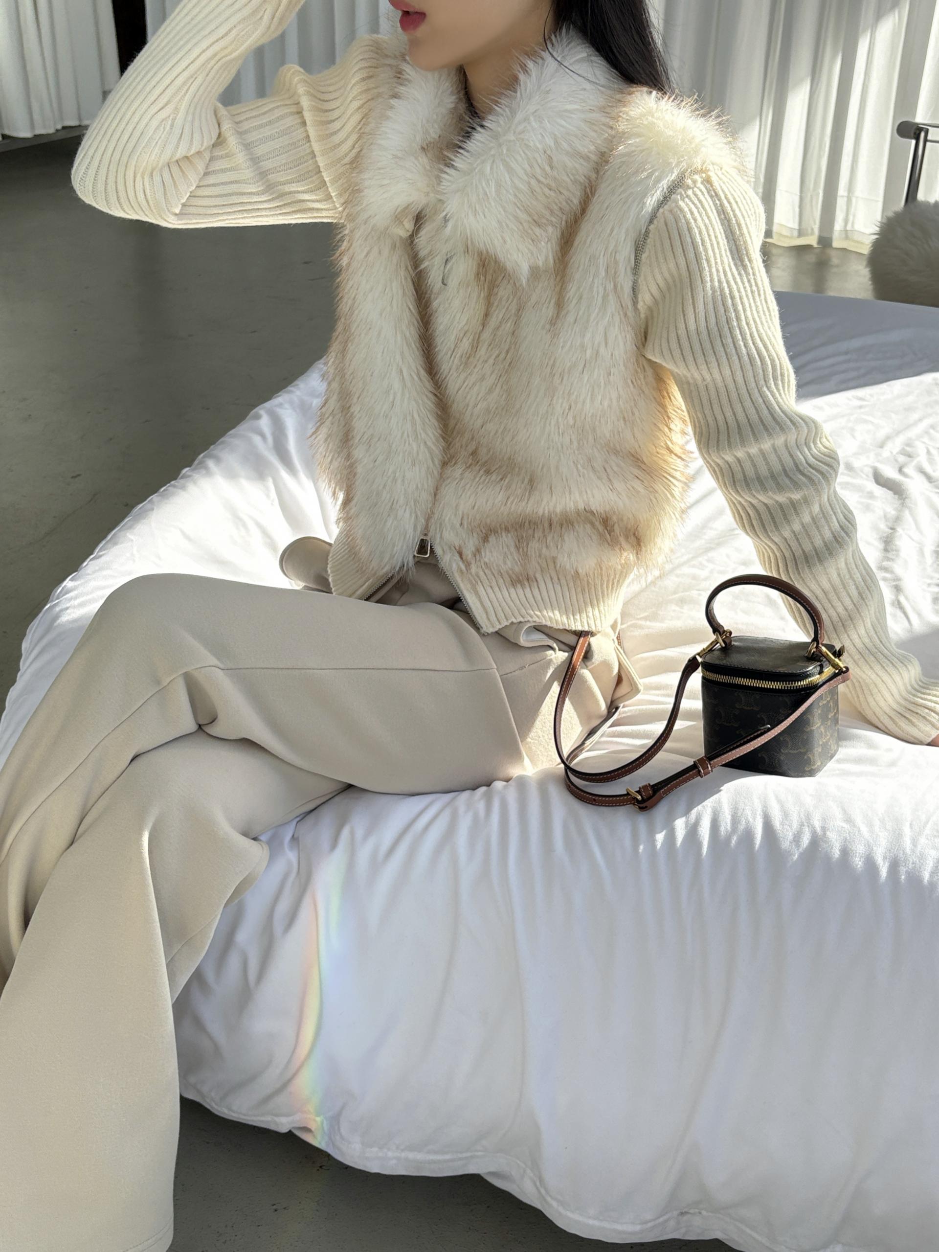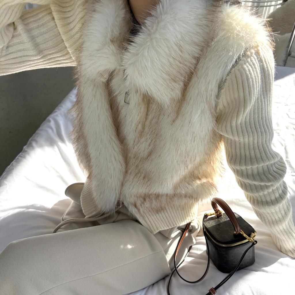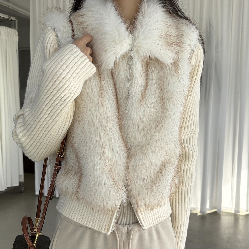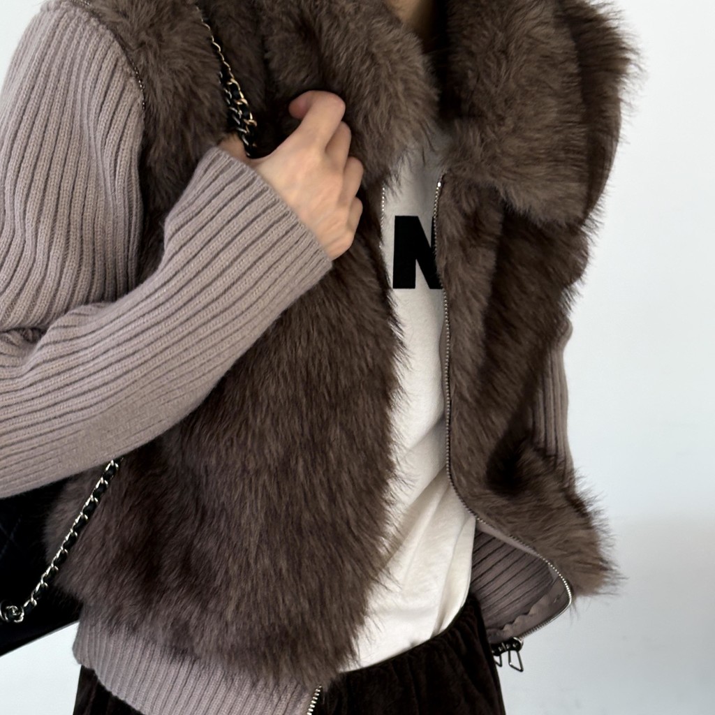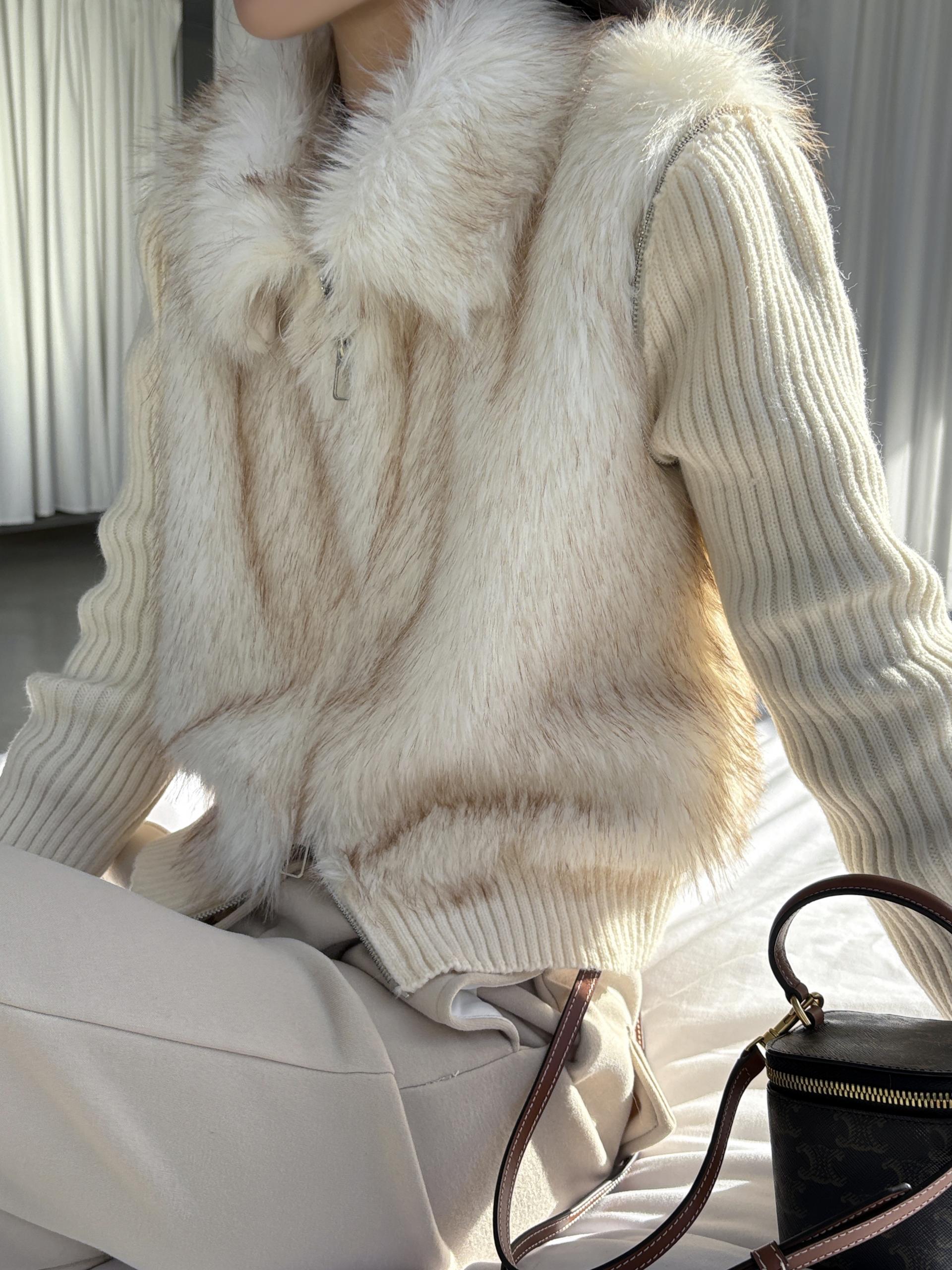 부드러운 페이크 퍼와 도톰한 골지 니트가 고급스럽게 믹스된 투웨이 니트 퍼 자켓입니다.