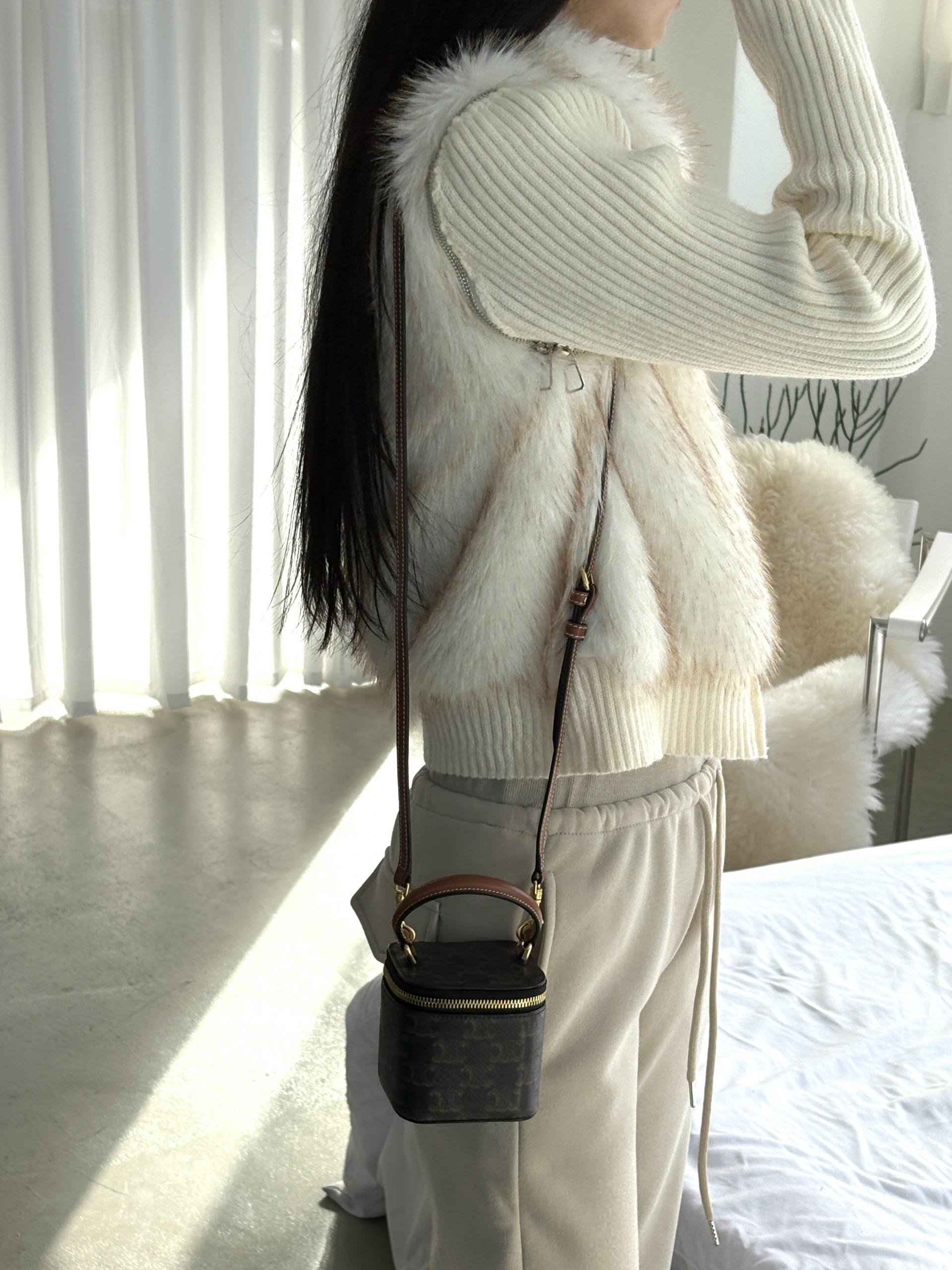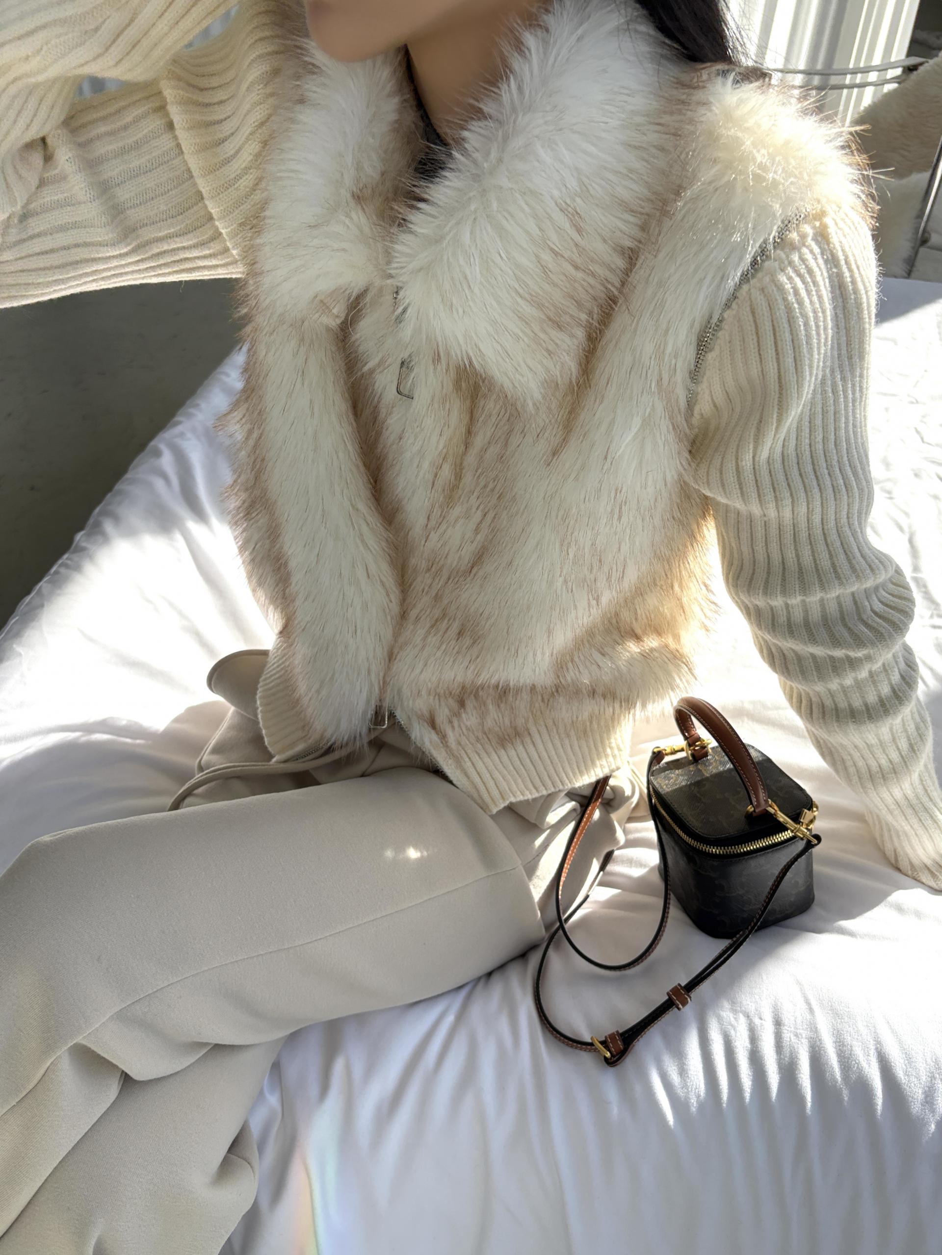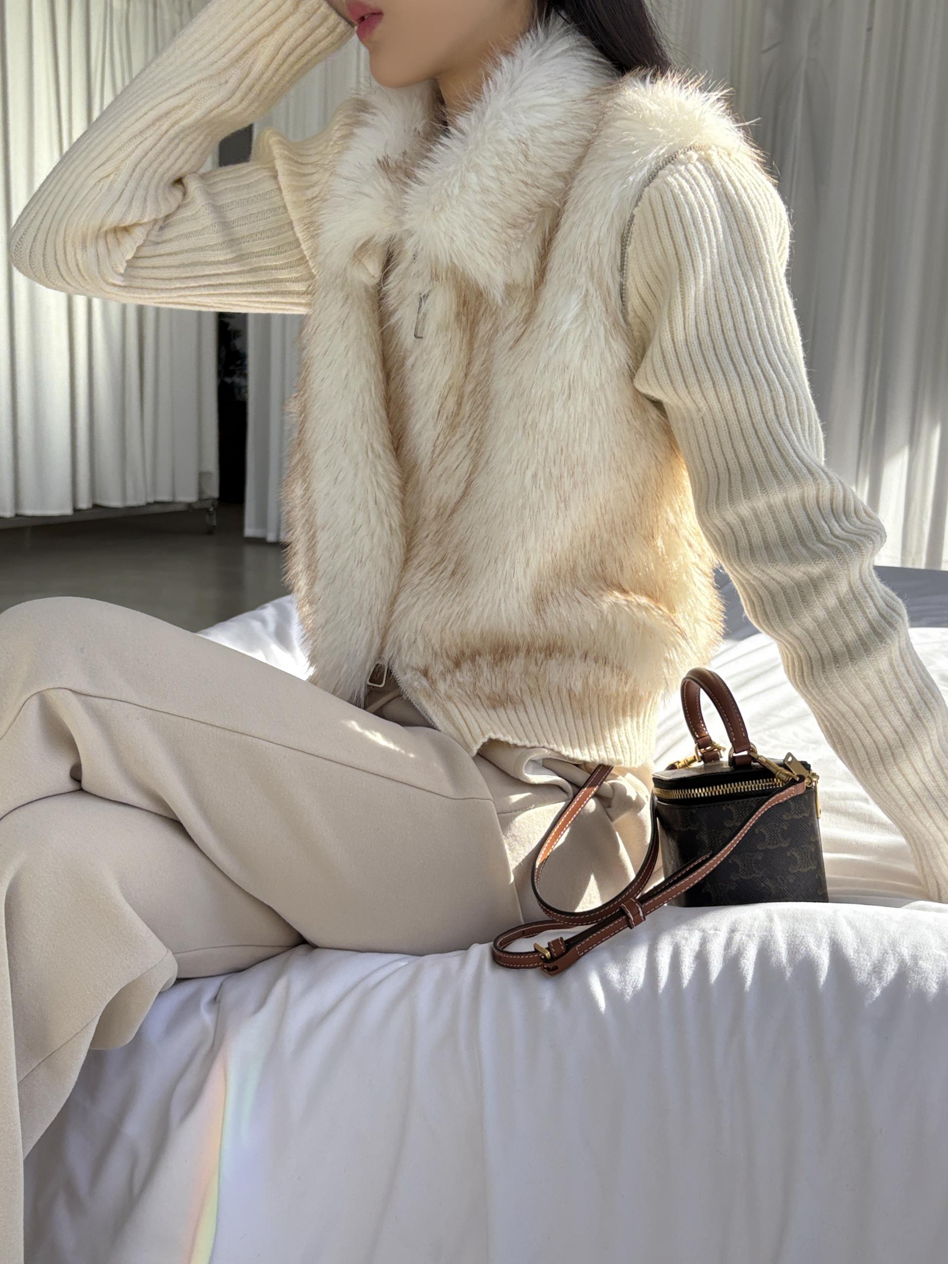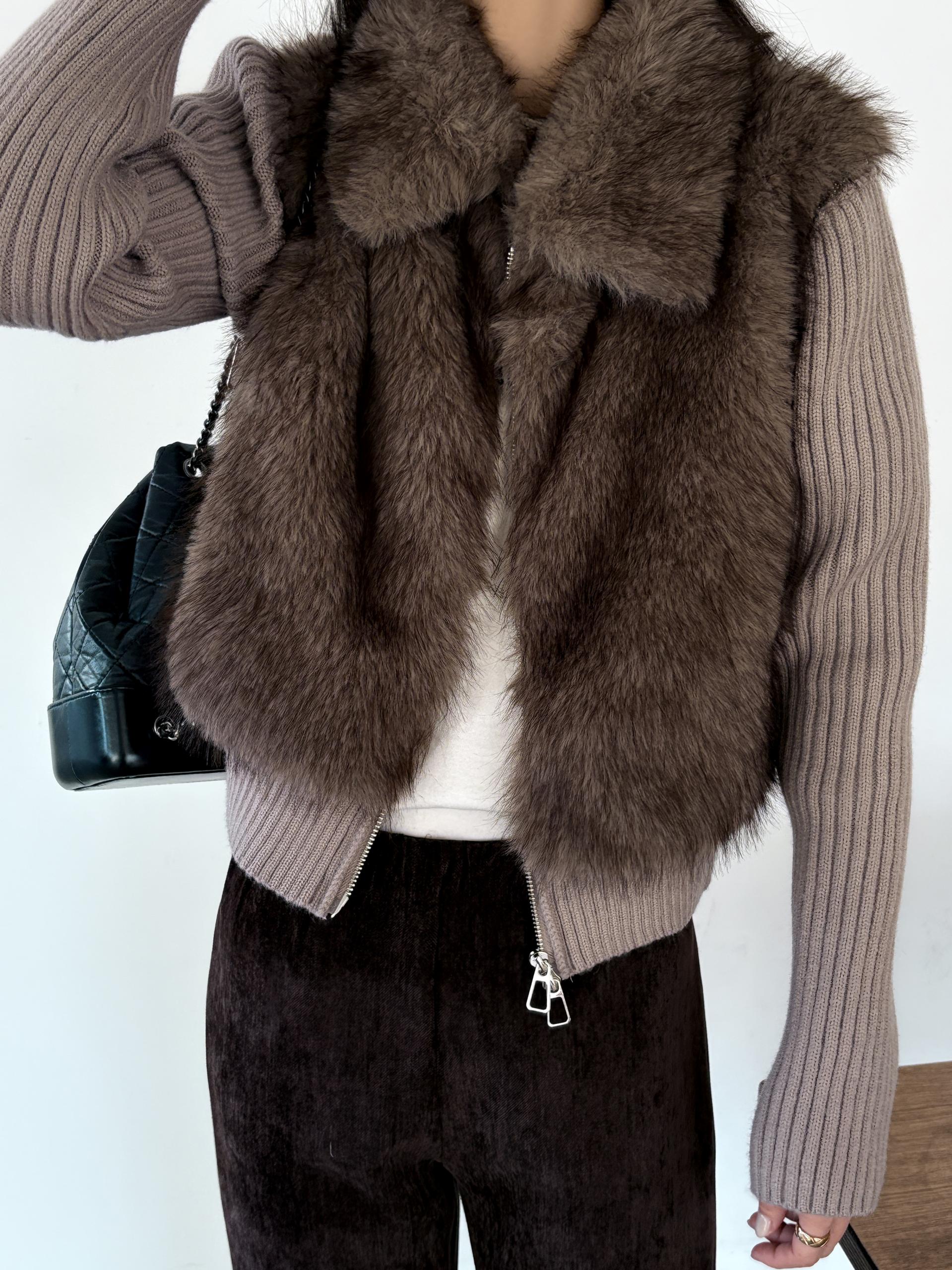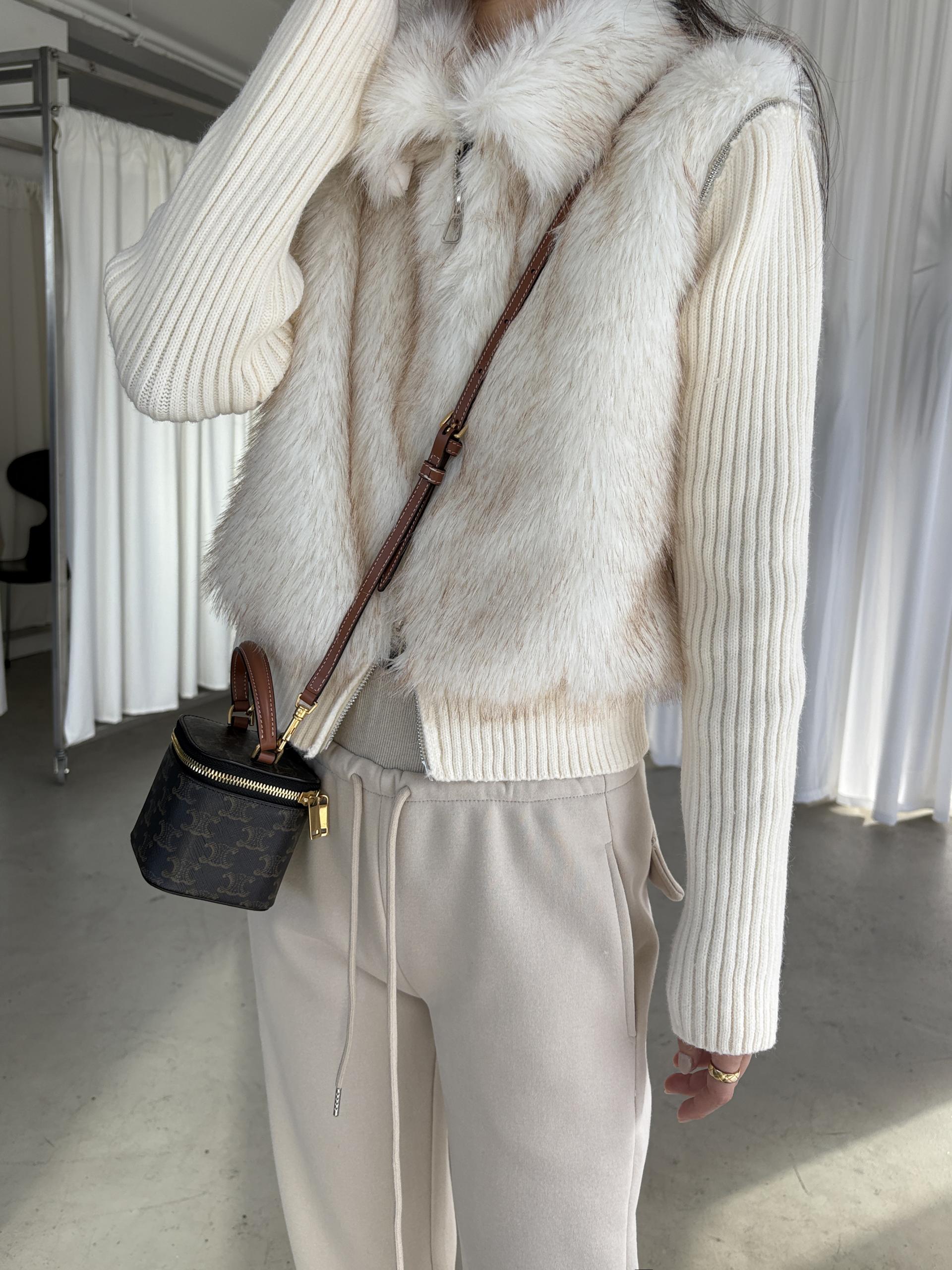몸판은 풍성한 퍼 디자인으로 포근하고 세련된 분위기를 연출하고, 소매는 탈부착 가능한 니트 슬리브로 소매를 떼서 조끼로도 착용할 수 있어 활용도가 높습니다.