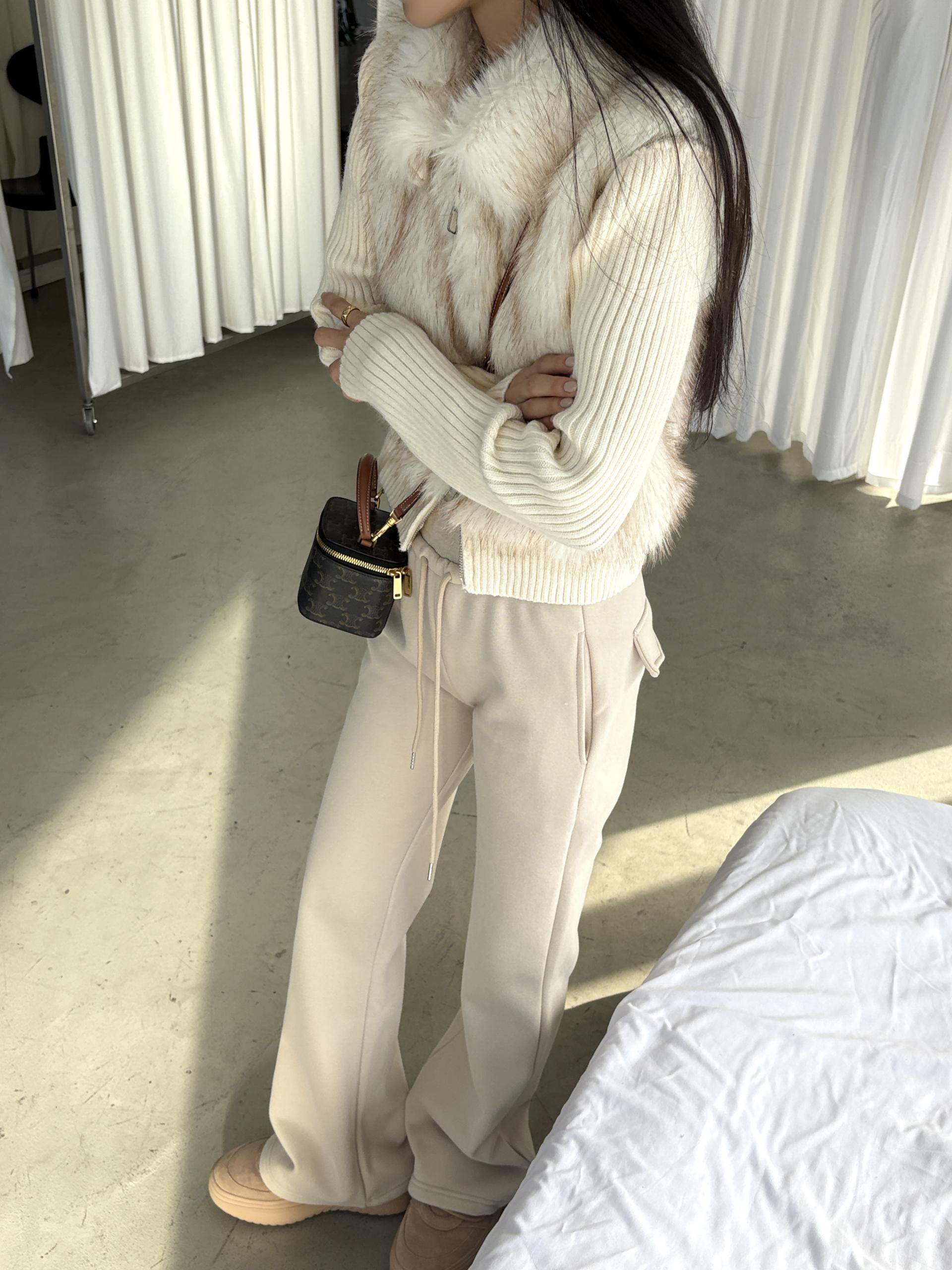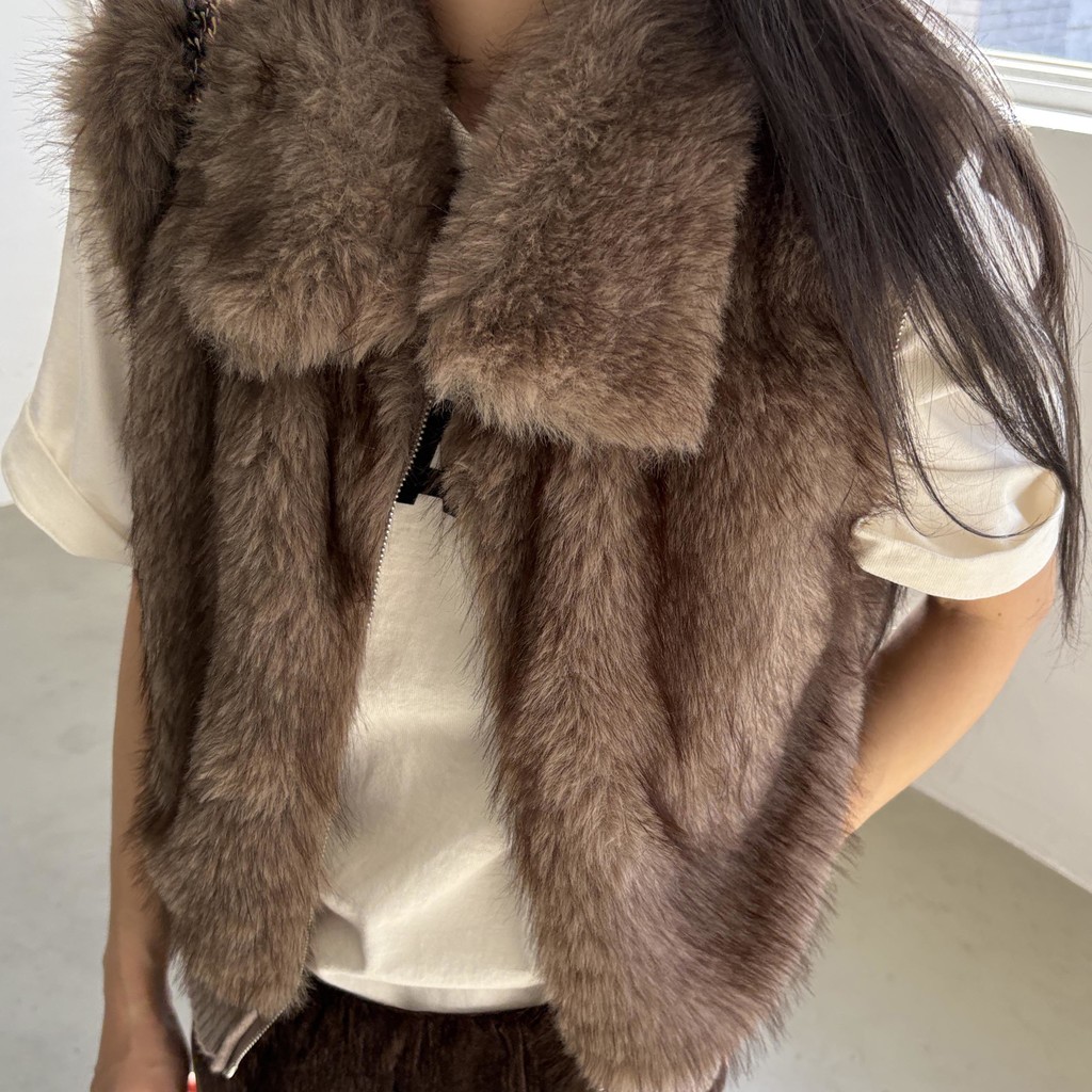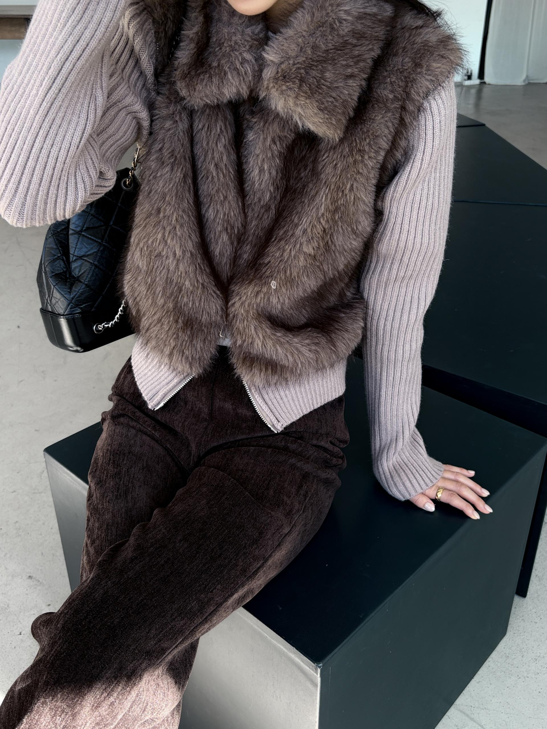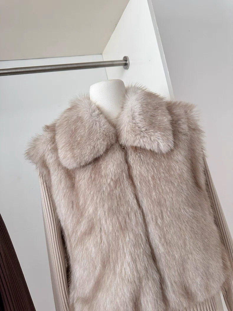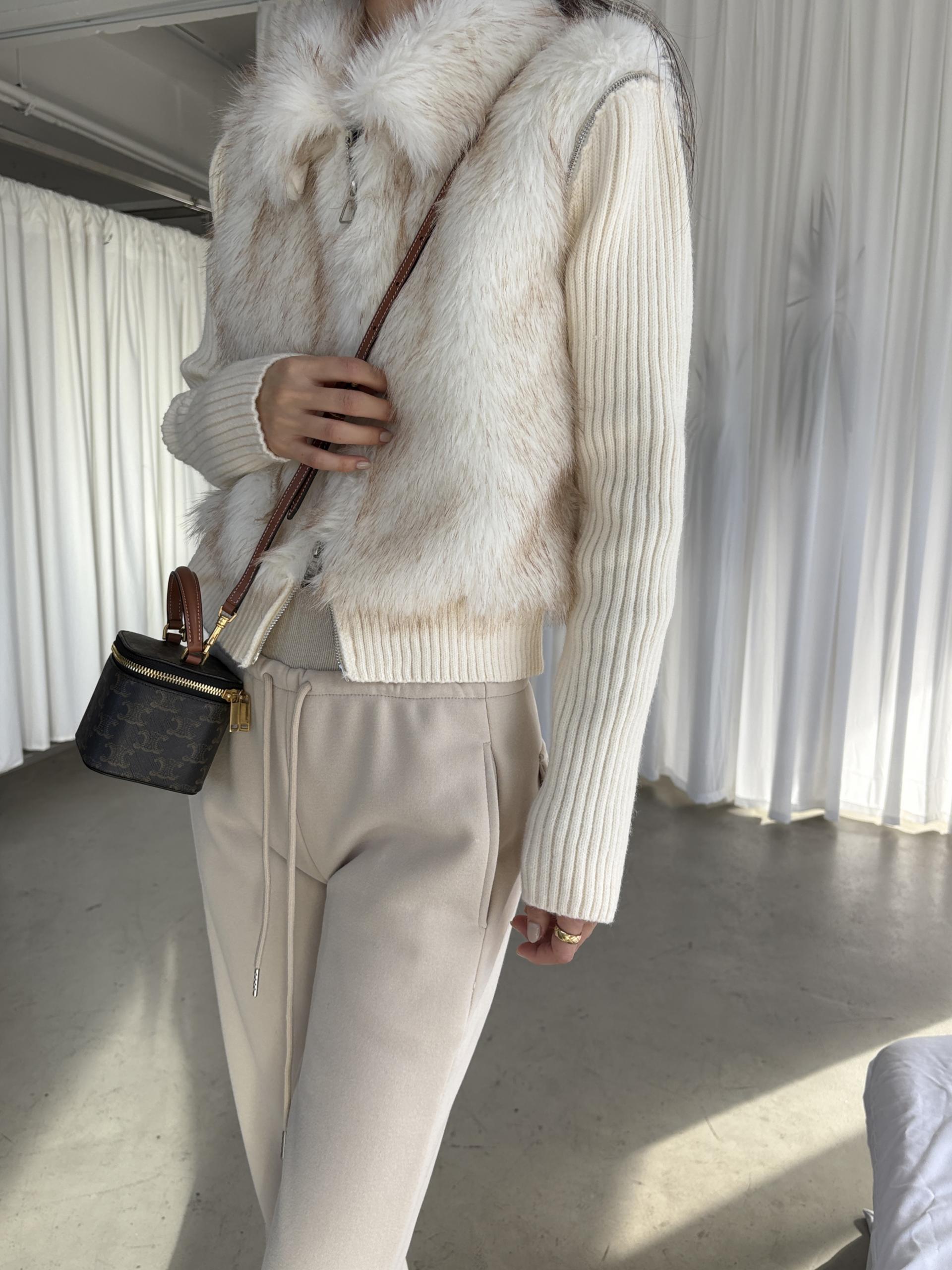 몸판은 풍성한 퍼 디자인으로 포근하고 세련된 분위기를 연출하고, 소매는 탈부착 가능한 니트 슬리브로 소매를 떼서 조끼로도 착용할 수 있어 활용도가 높습니다.