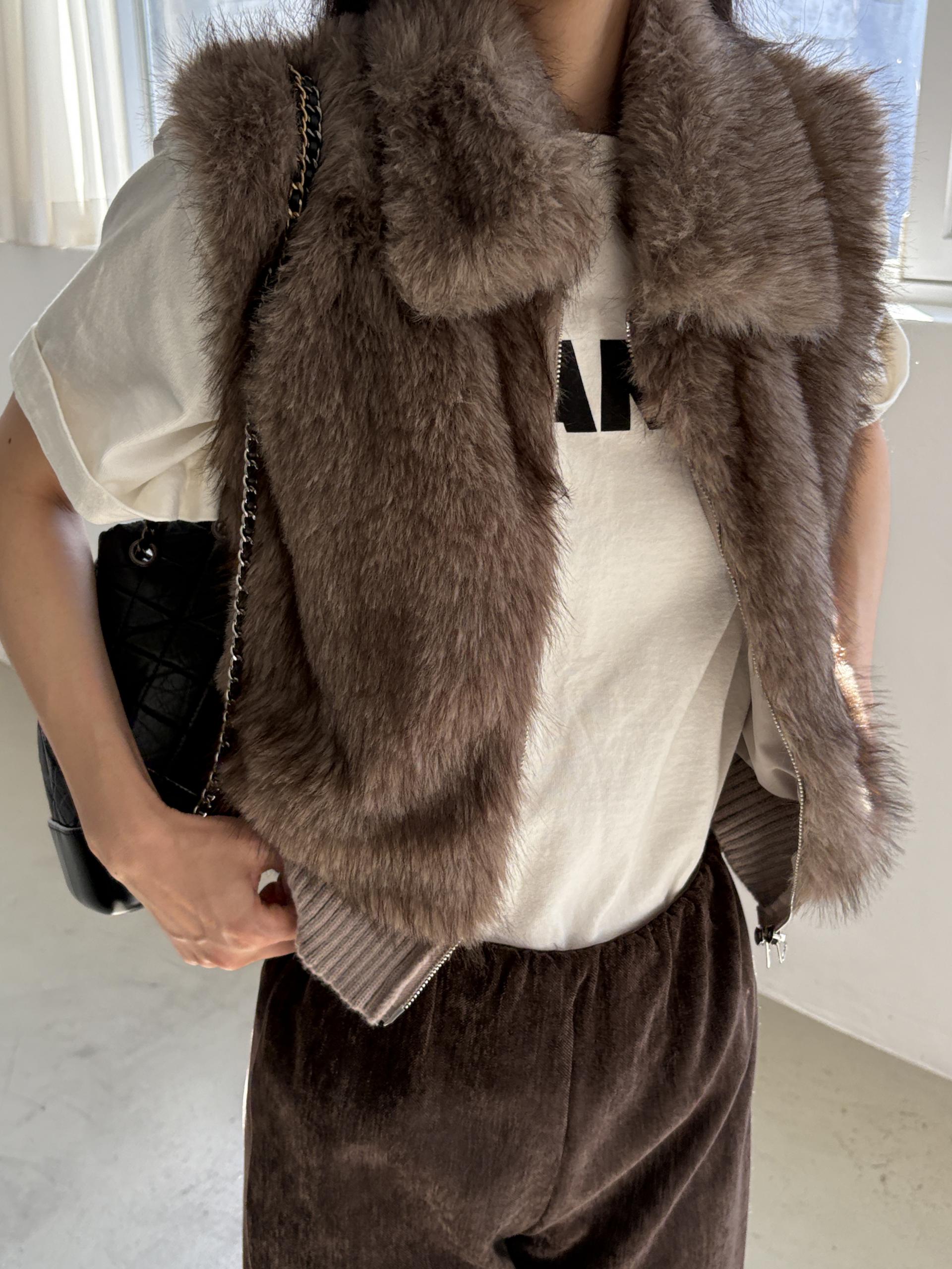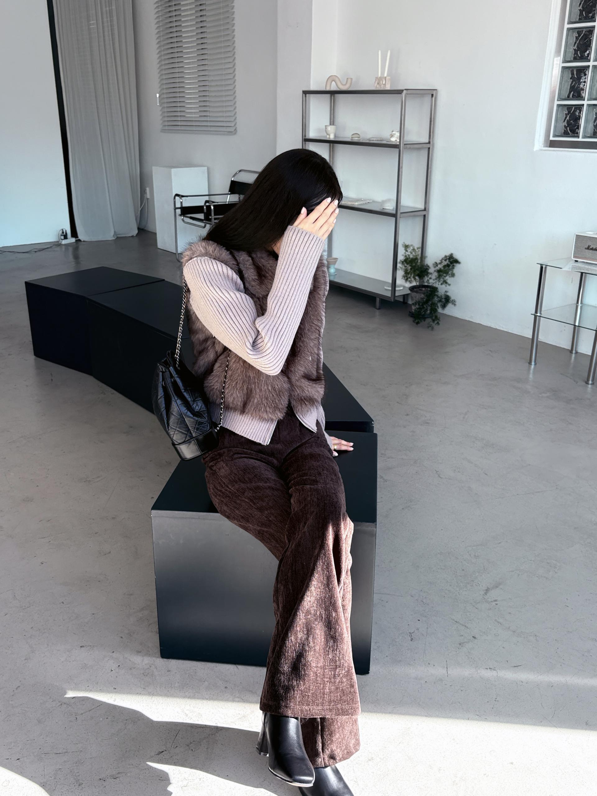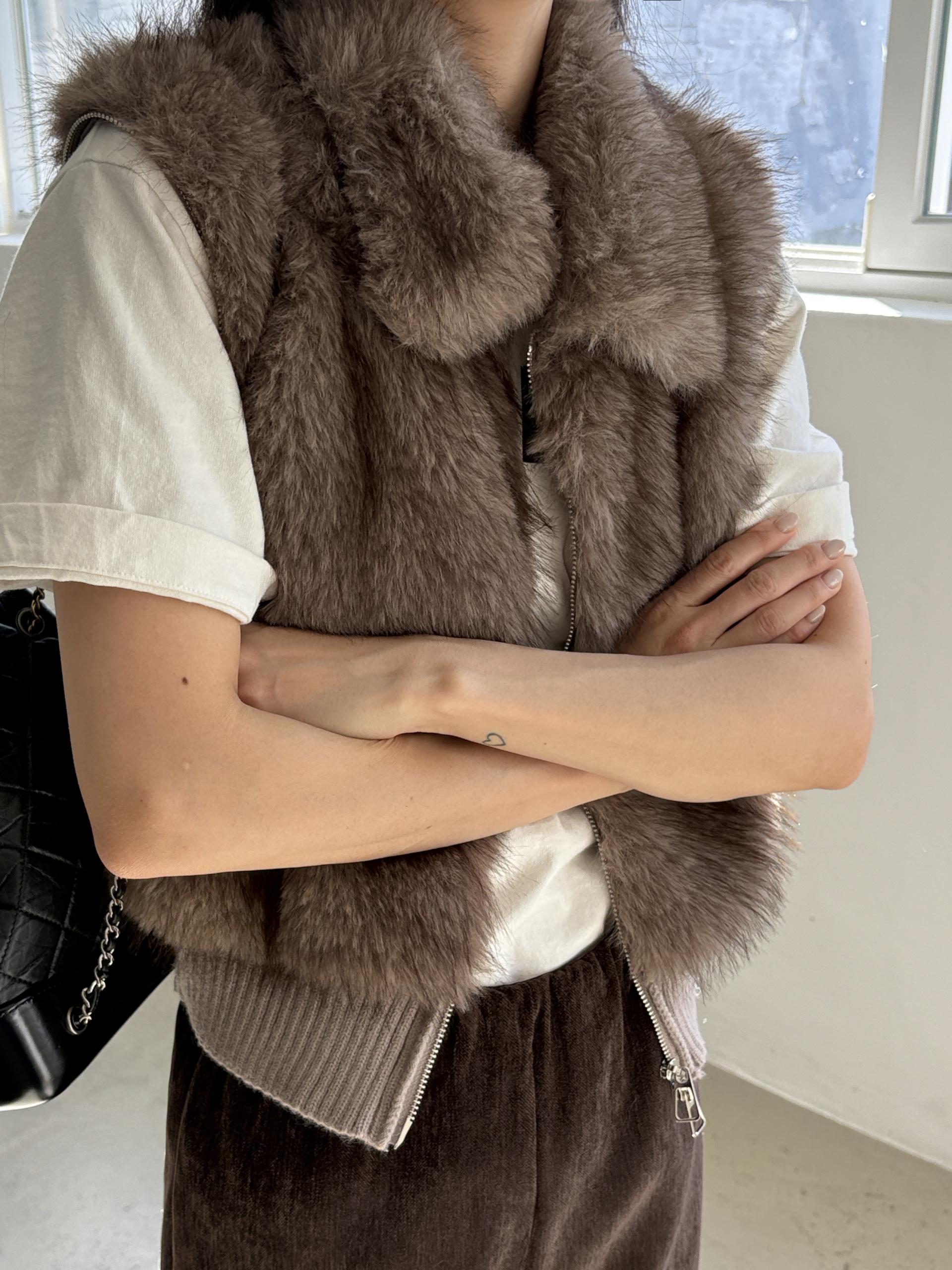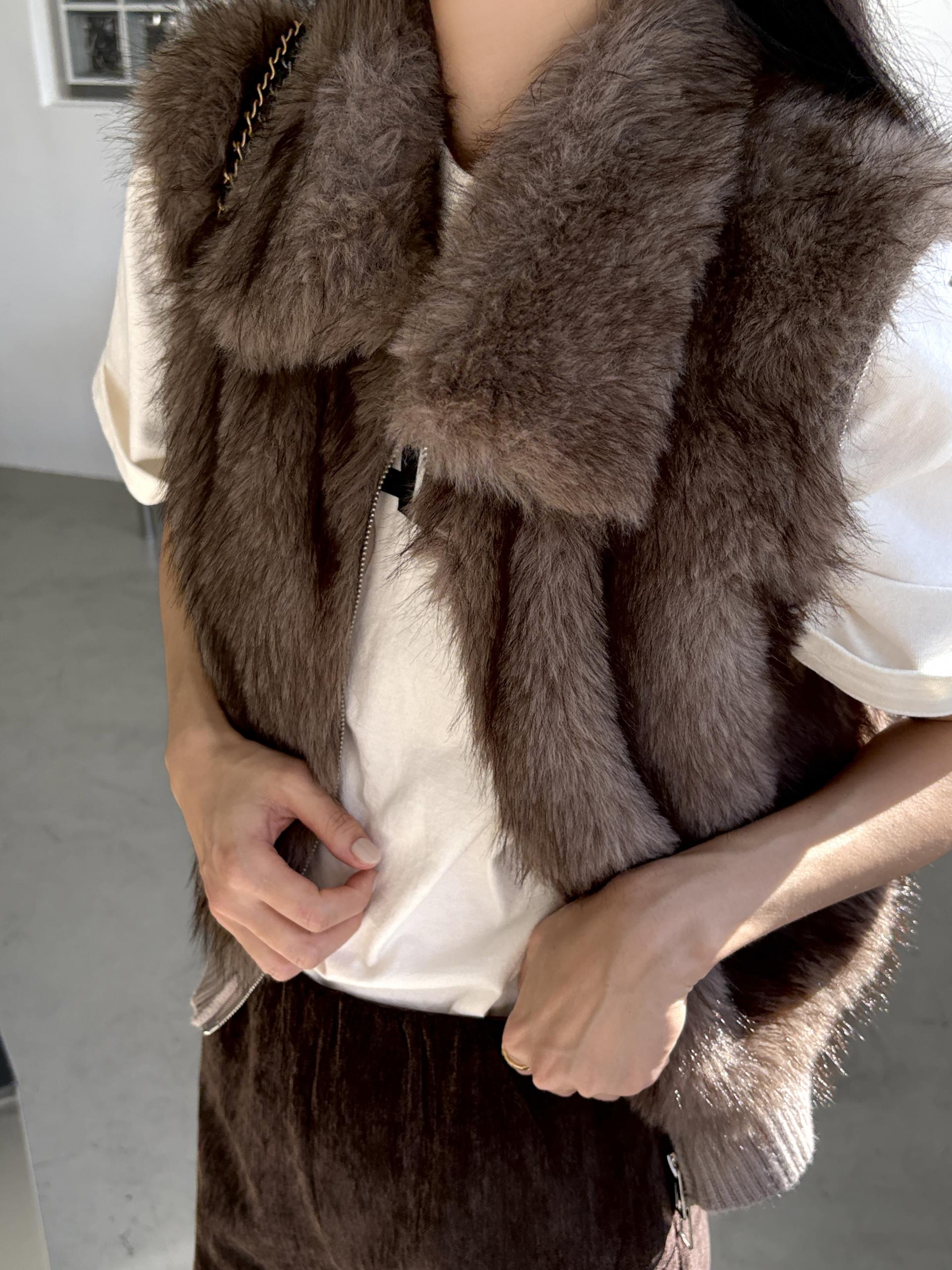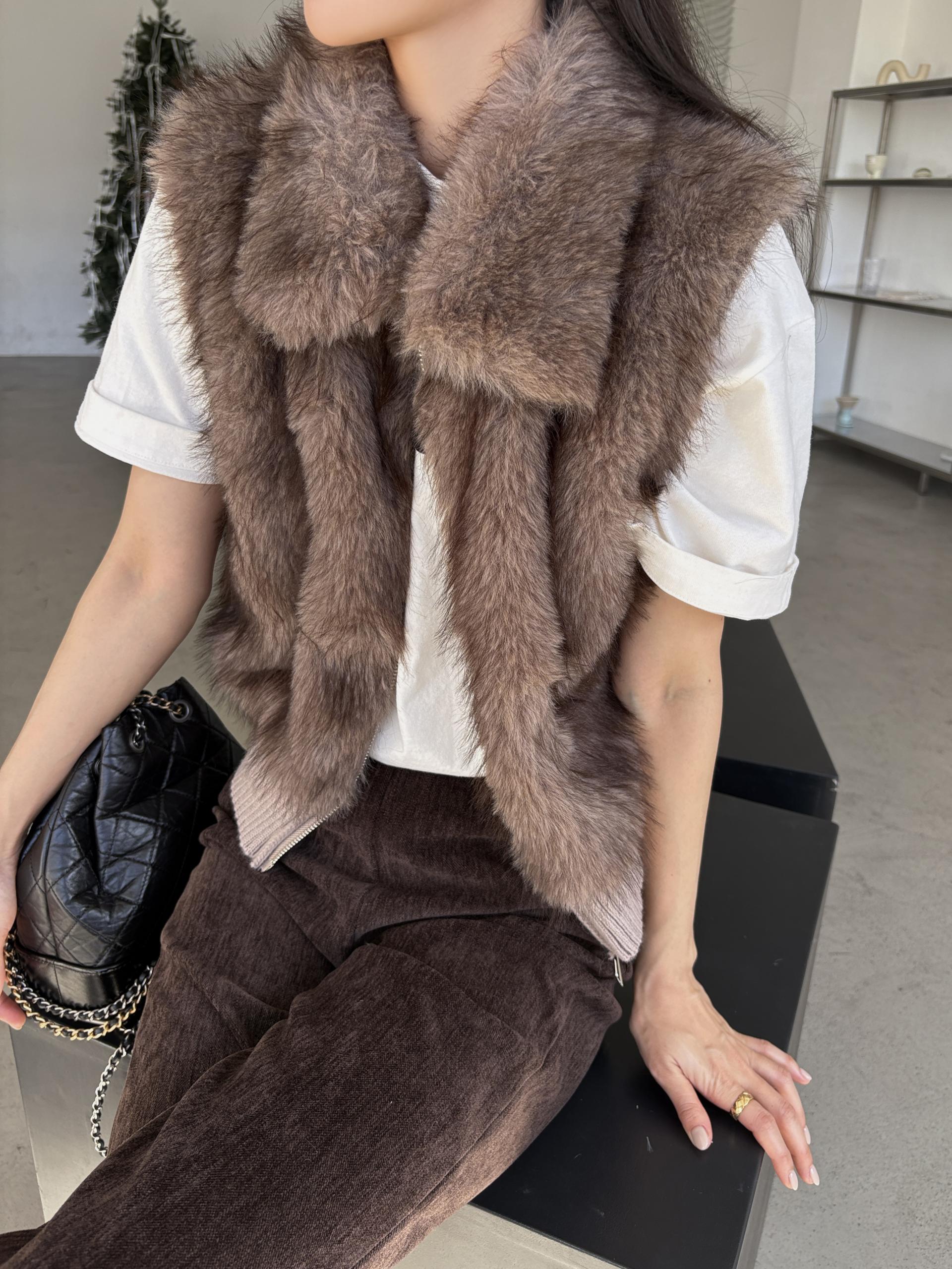 몸판은 풍성한 퍼 디자인으로 포근하고 세련된 분위기를 연출하고, 소매는 탈부착 가능한 니트 슬리브로 소매를 떼서 조끼로도 착용할 수 있어 활용도가 높습니다.