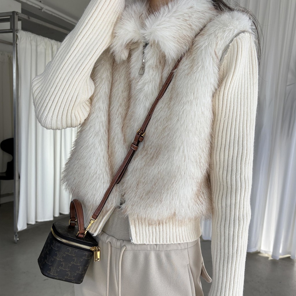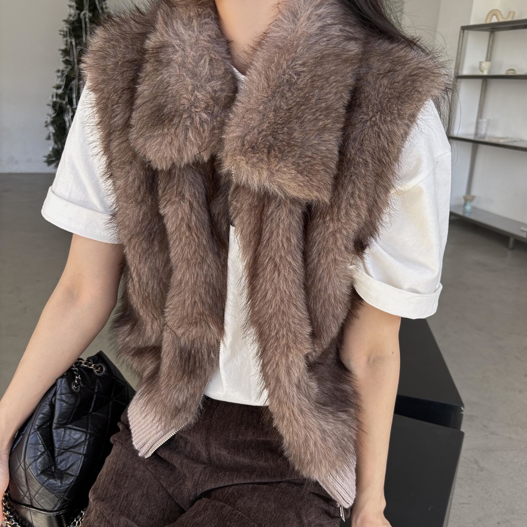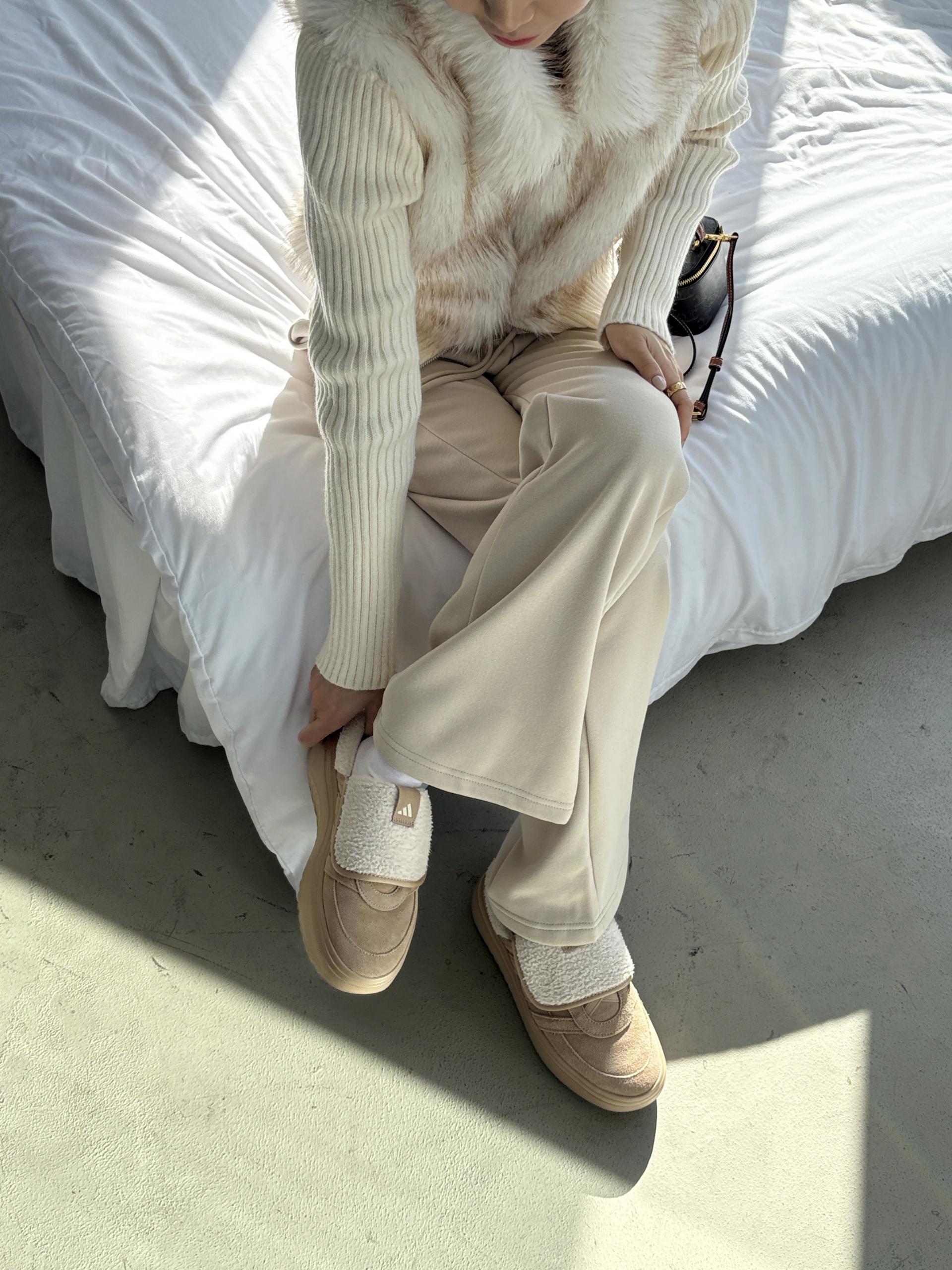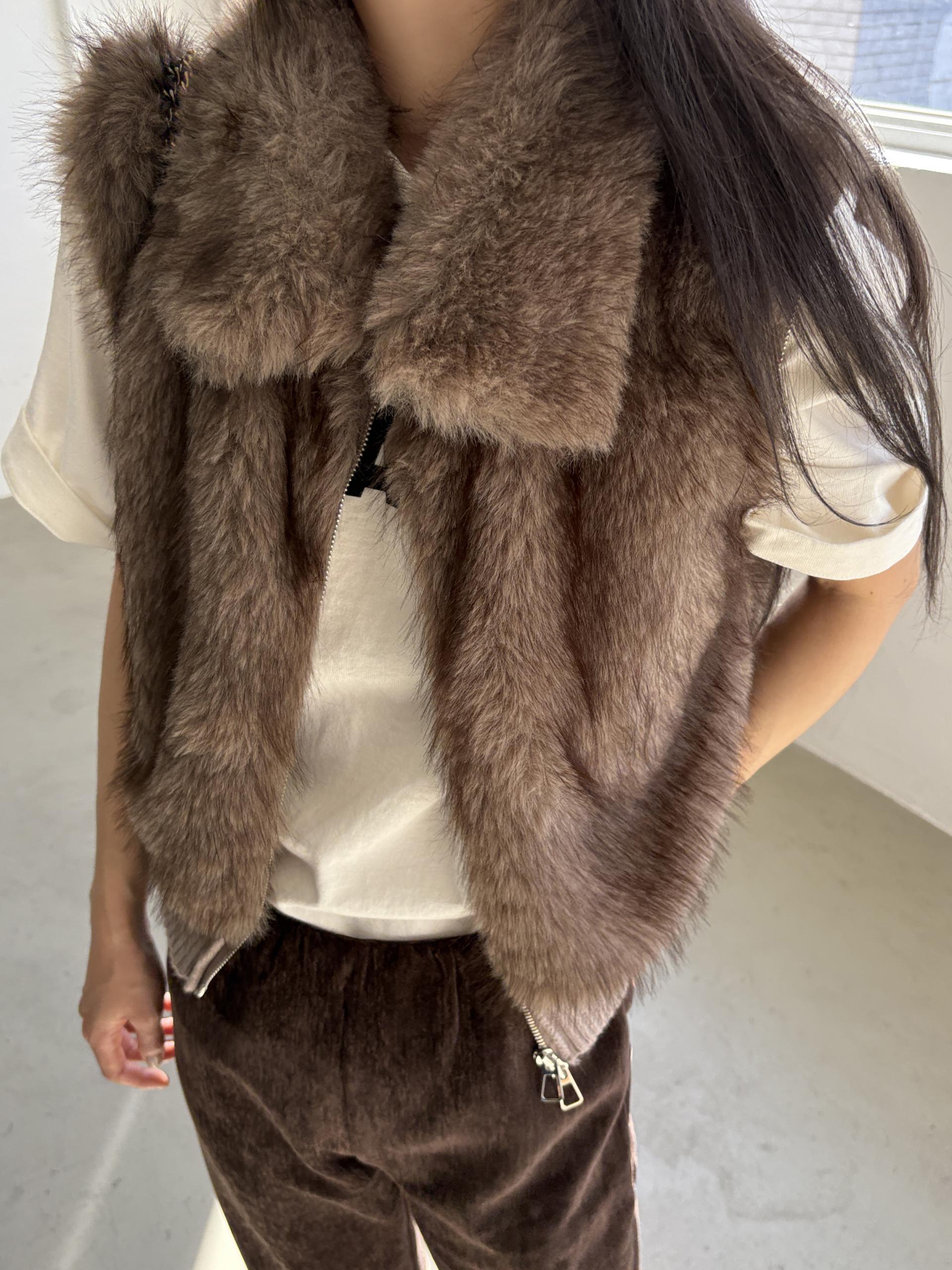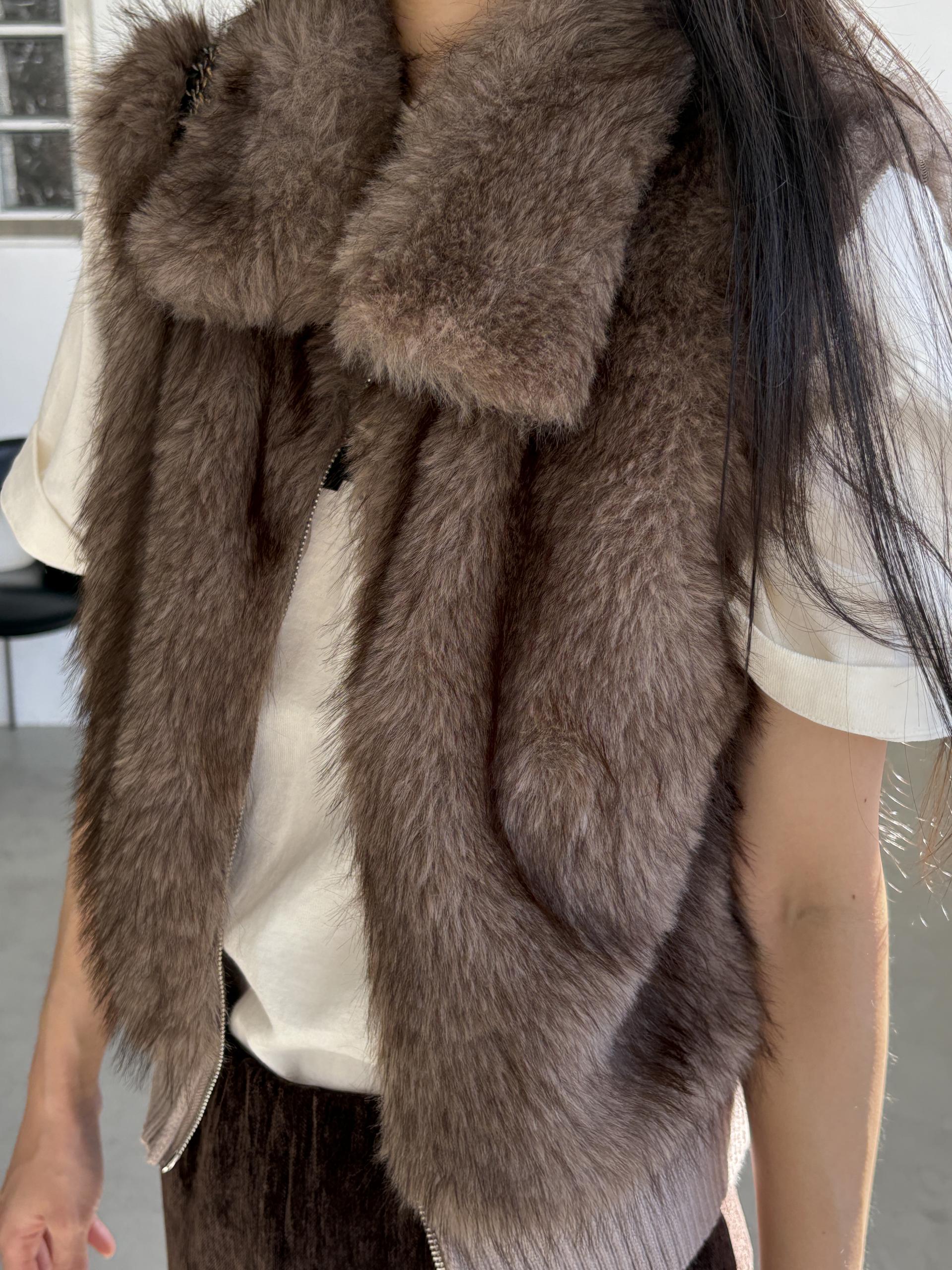 몸판은 풍성한 퍼 디자인으로 포근하고 세련된 분위기를 연출하고, 소매는 탈부착 가능한 니트 슬리브로 소매를 떼서 조끼로도 착용할 수 있어 활용도가 높습니다.