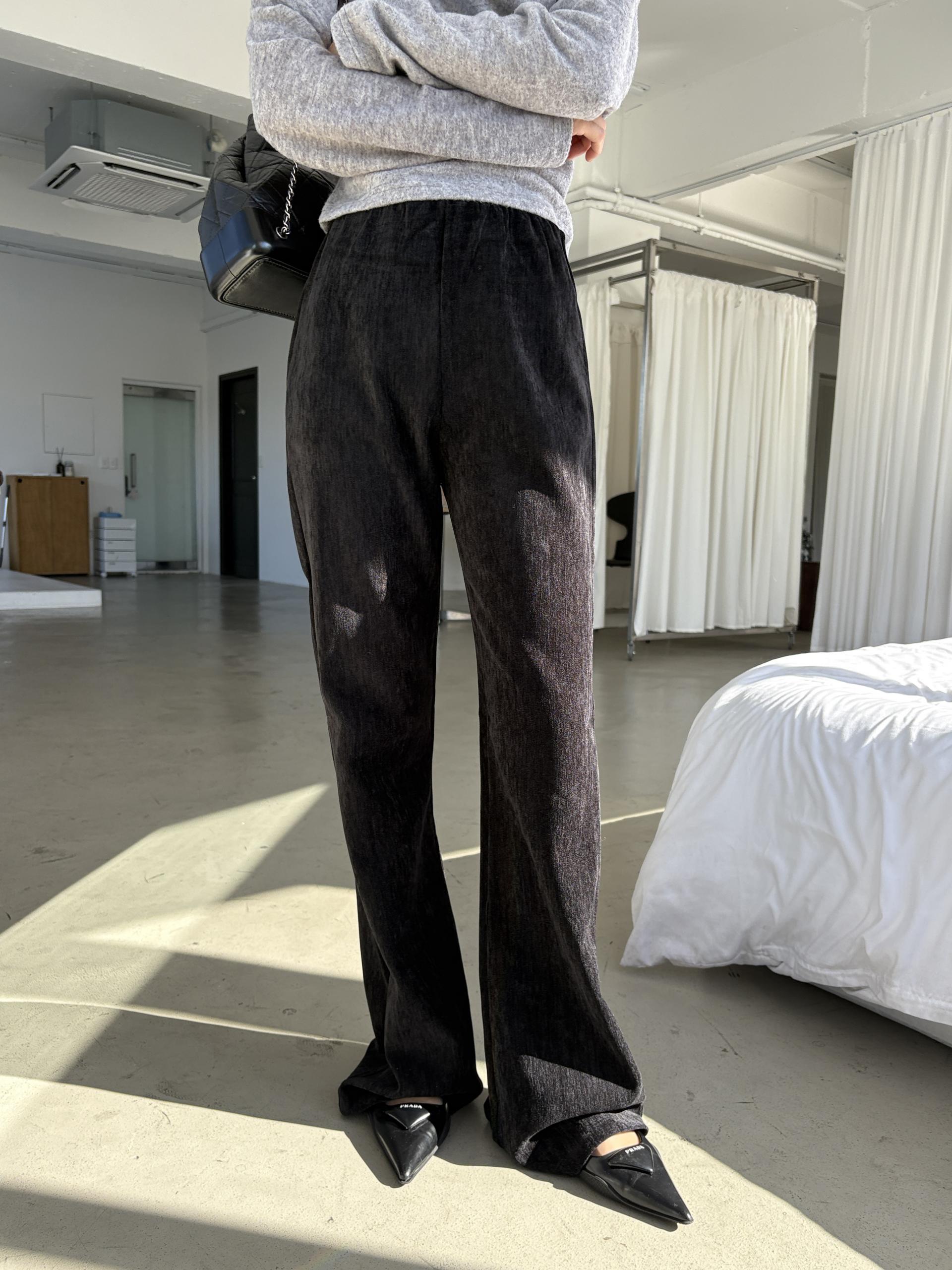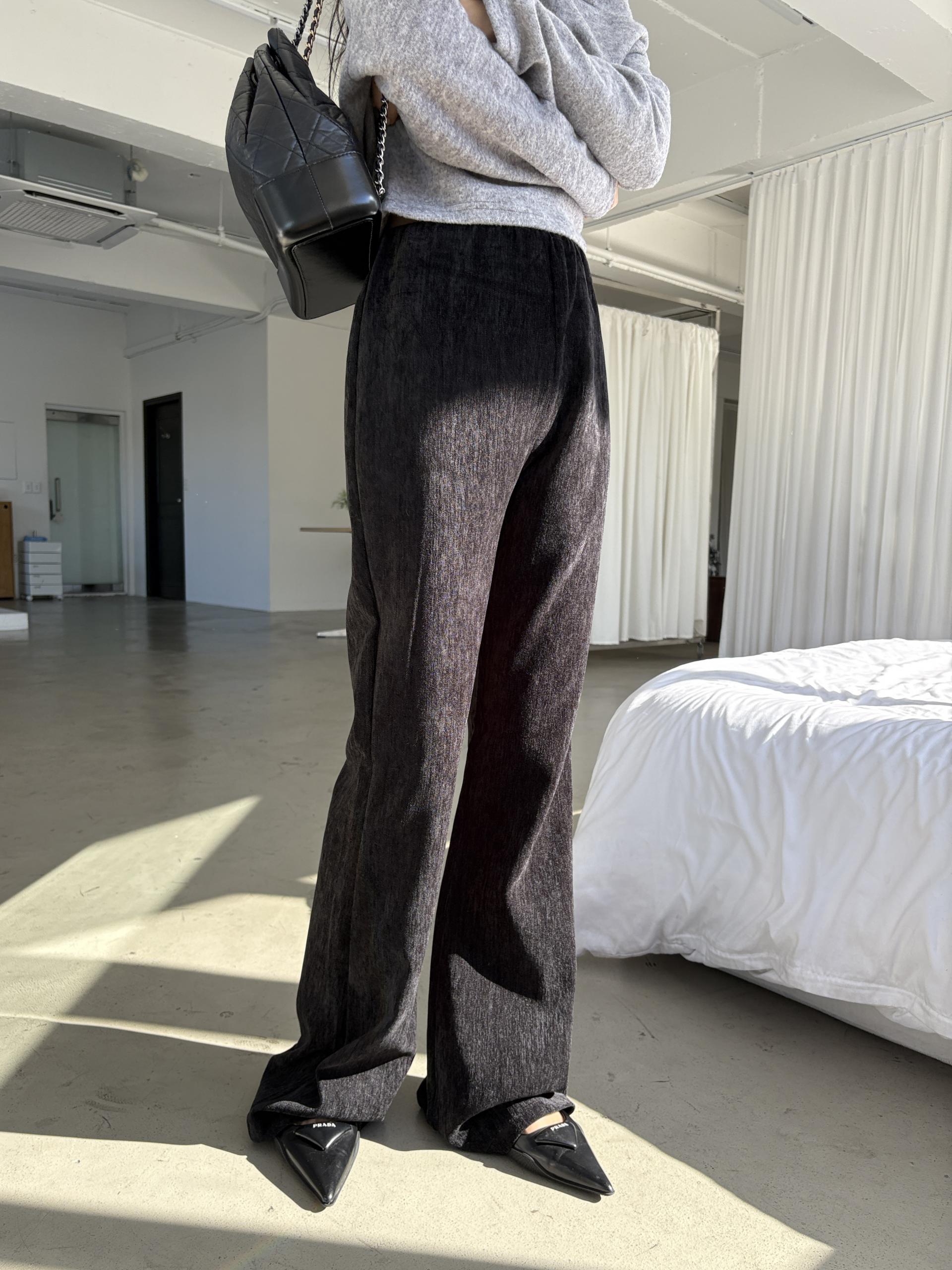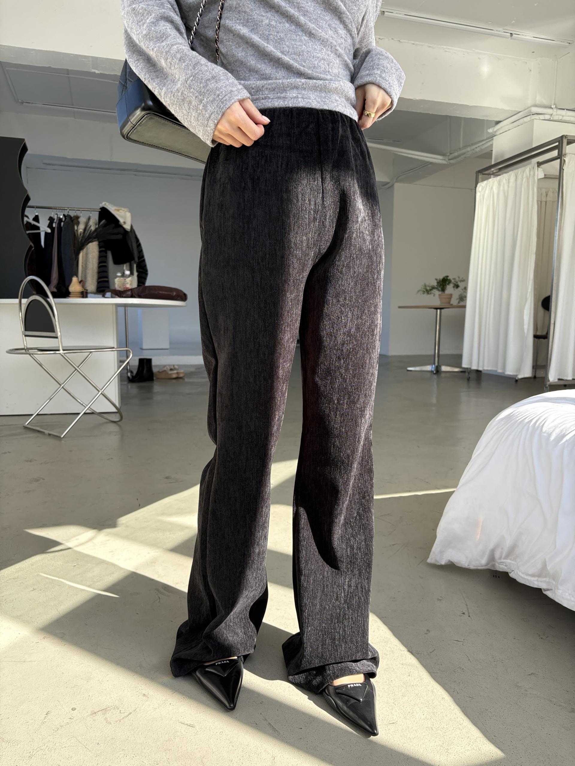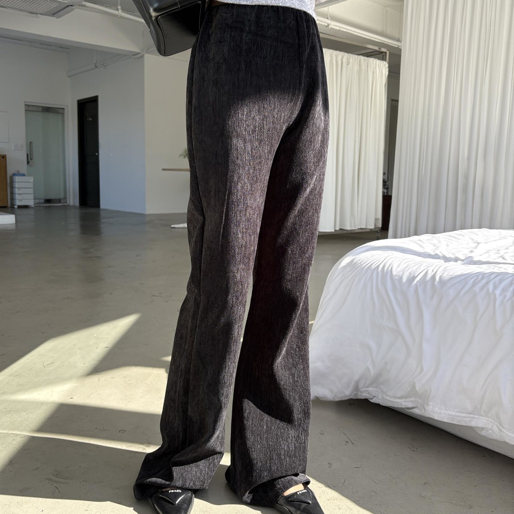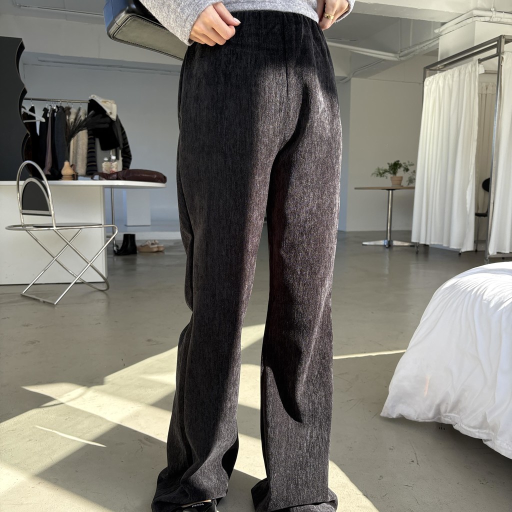 은은한 광택과 부드러운 텍스처가 돋보이는 부츠컷 실루엣의 롱 팬츠입니다.