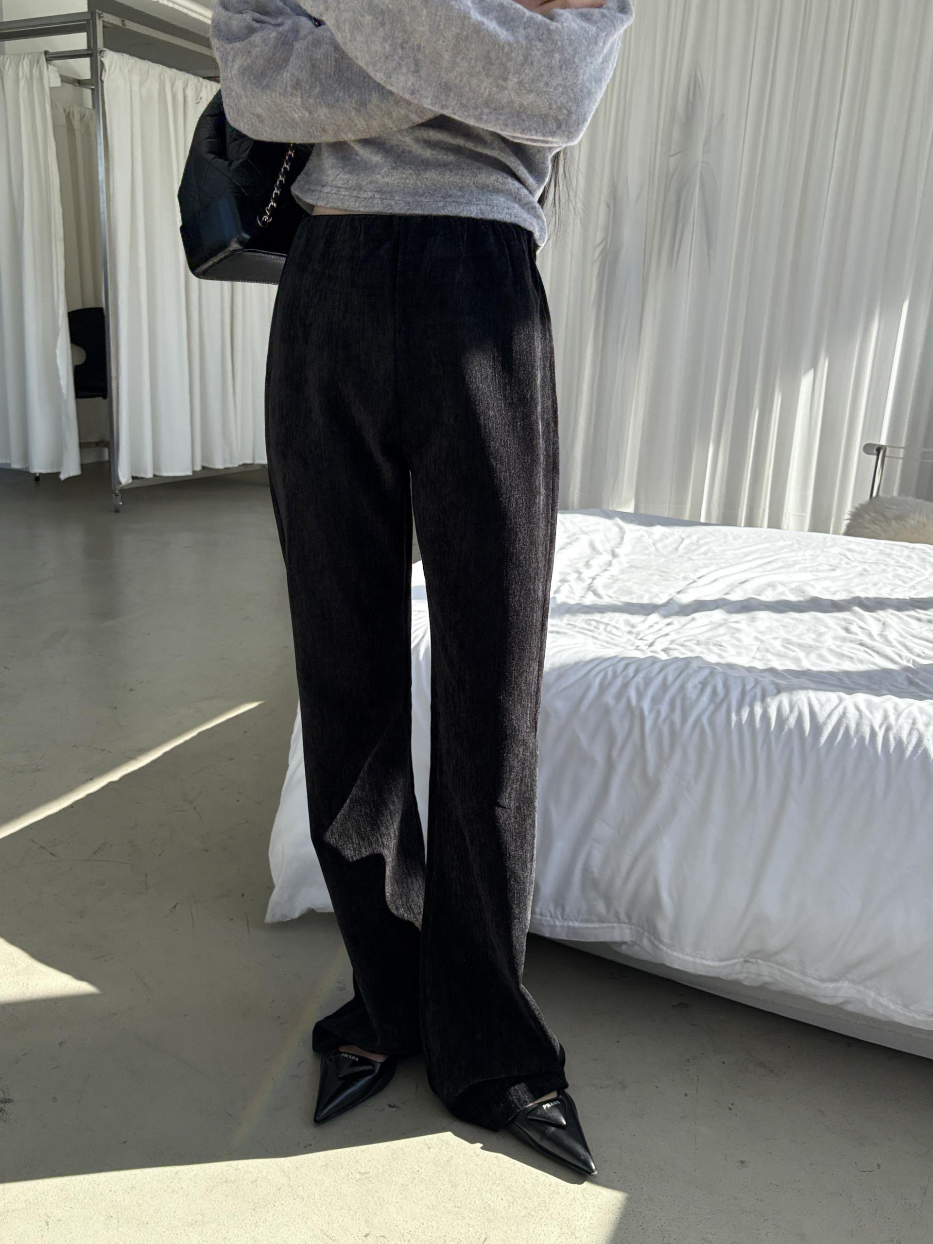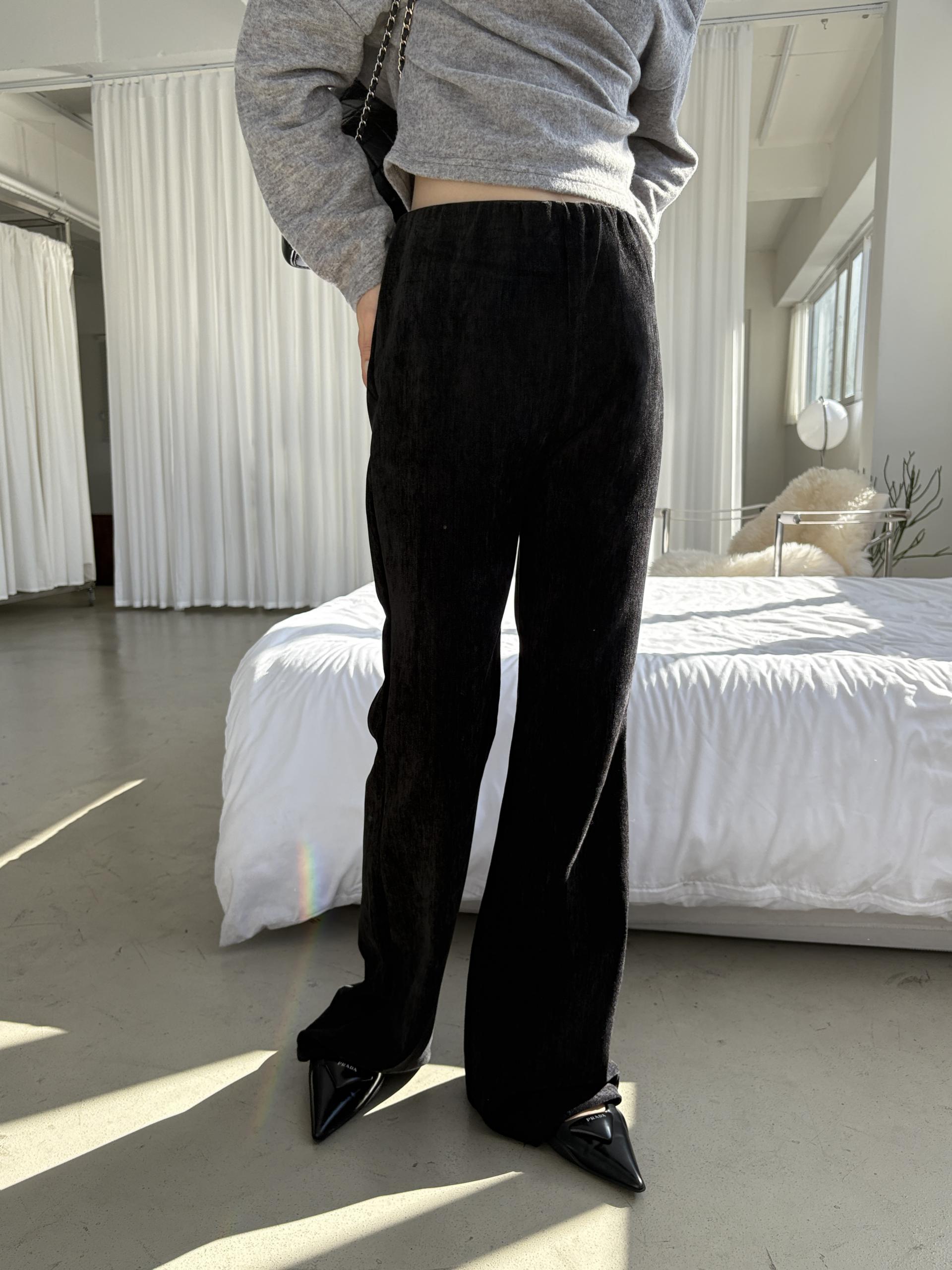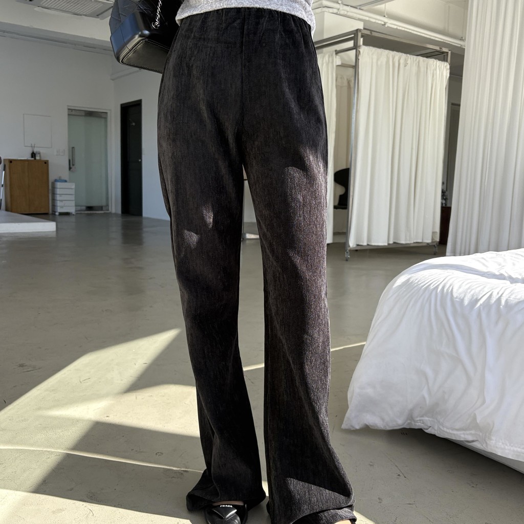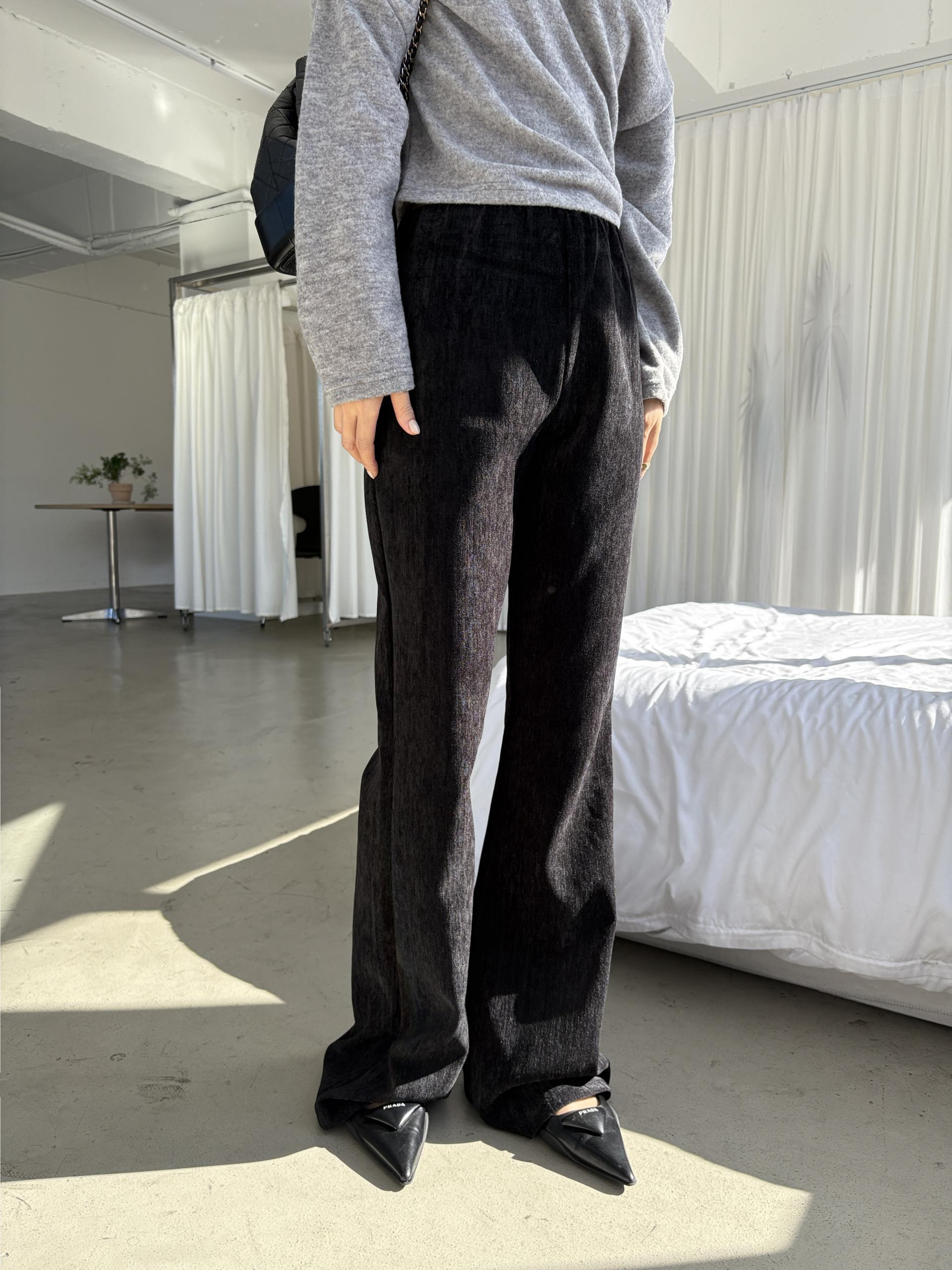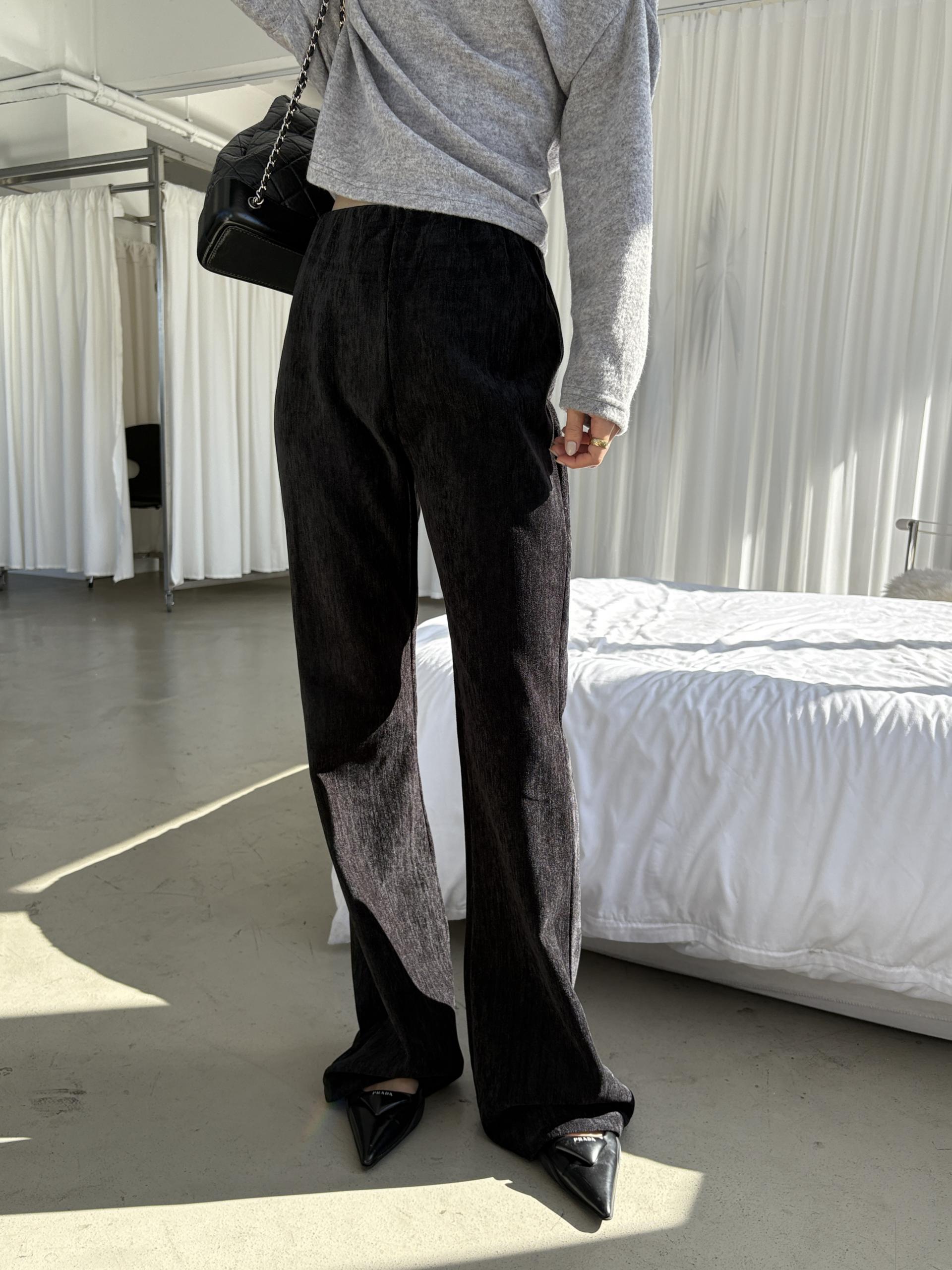 은은한 광택과 부드러운 텍스처가 돋보이는 부츠컷 실루엣의 롱 팬츠입니다.