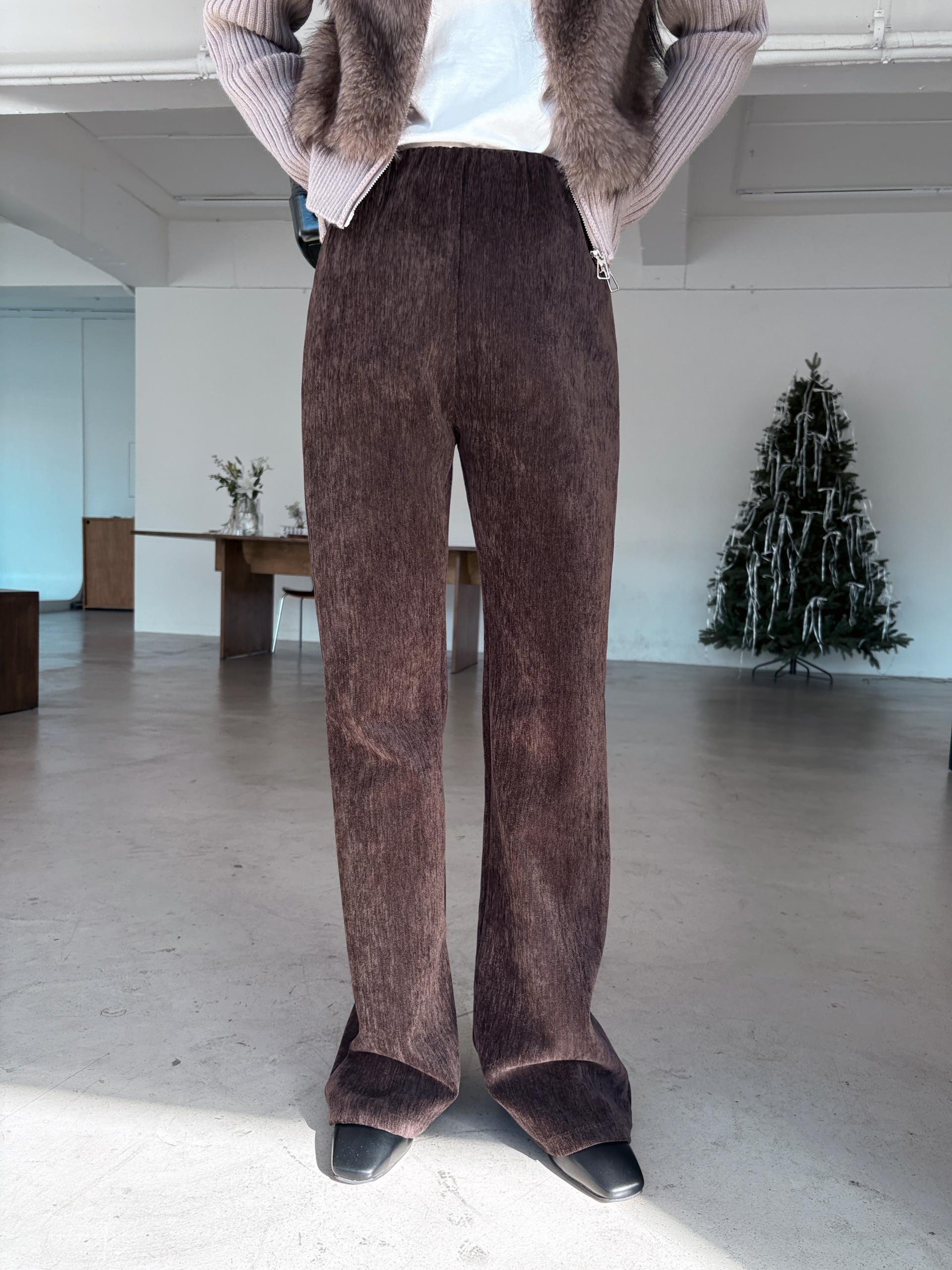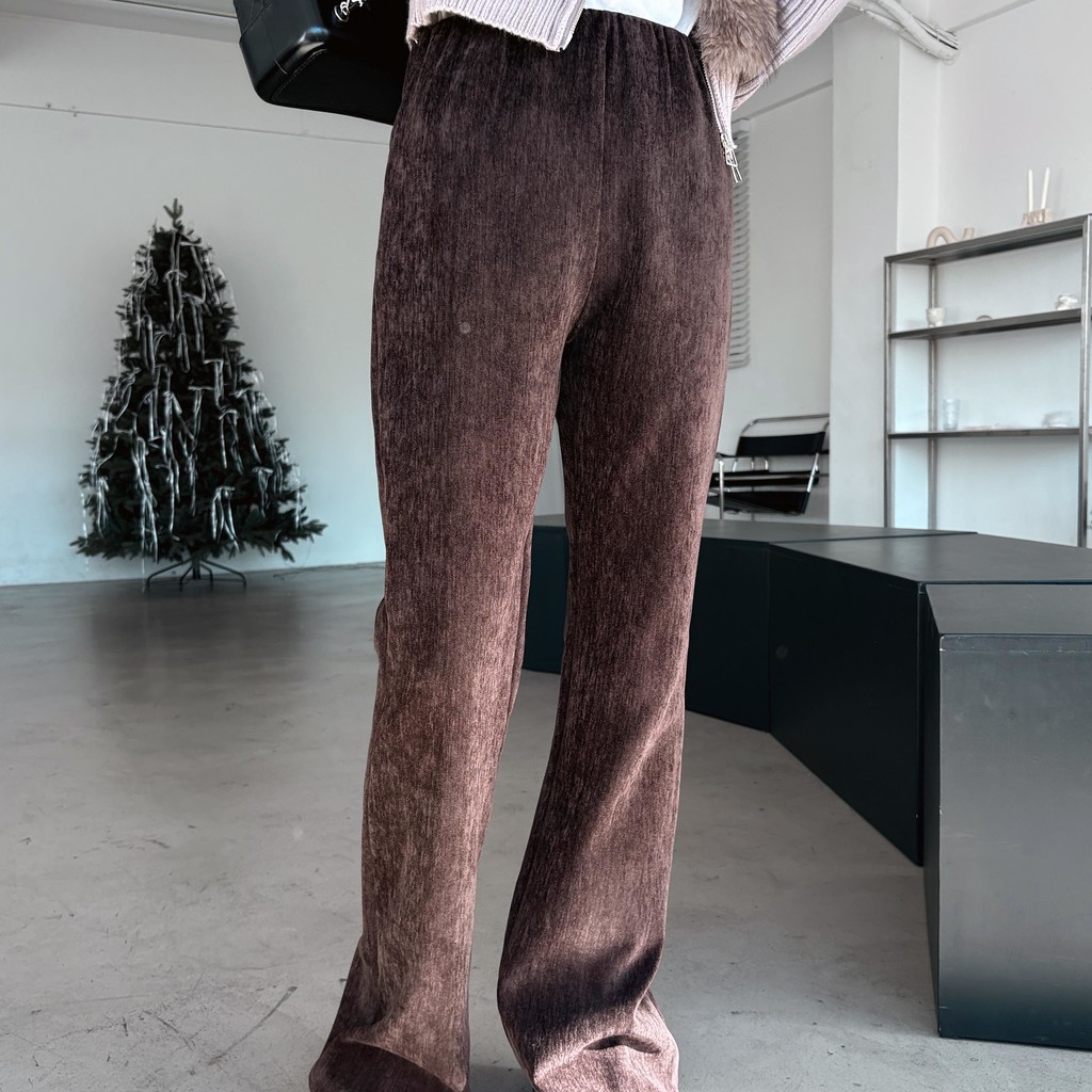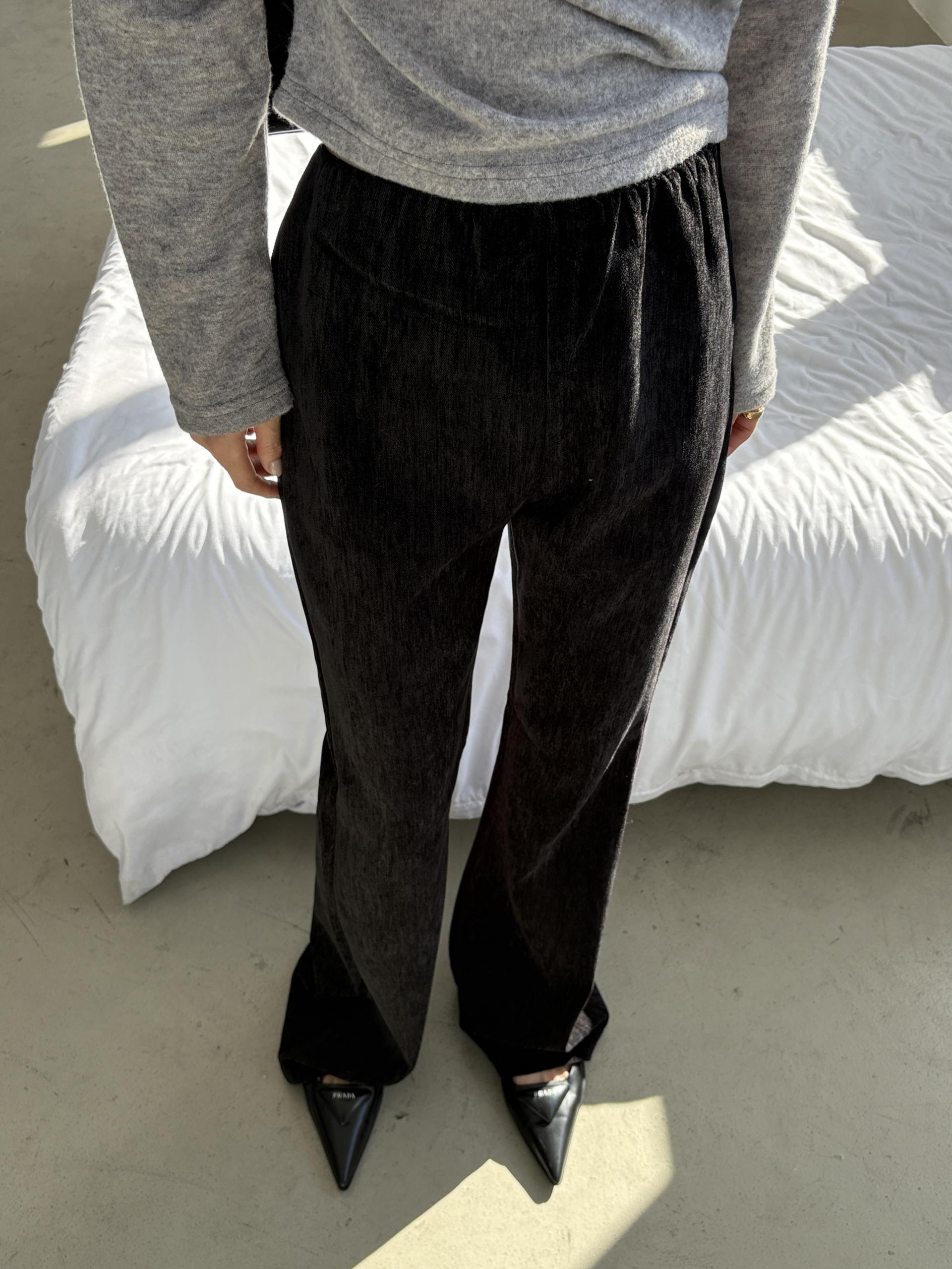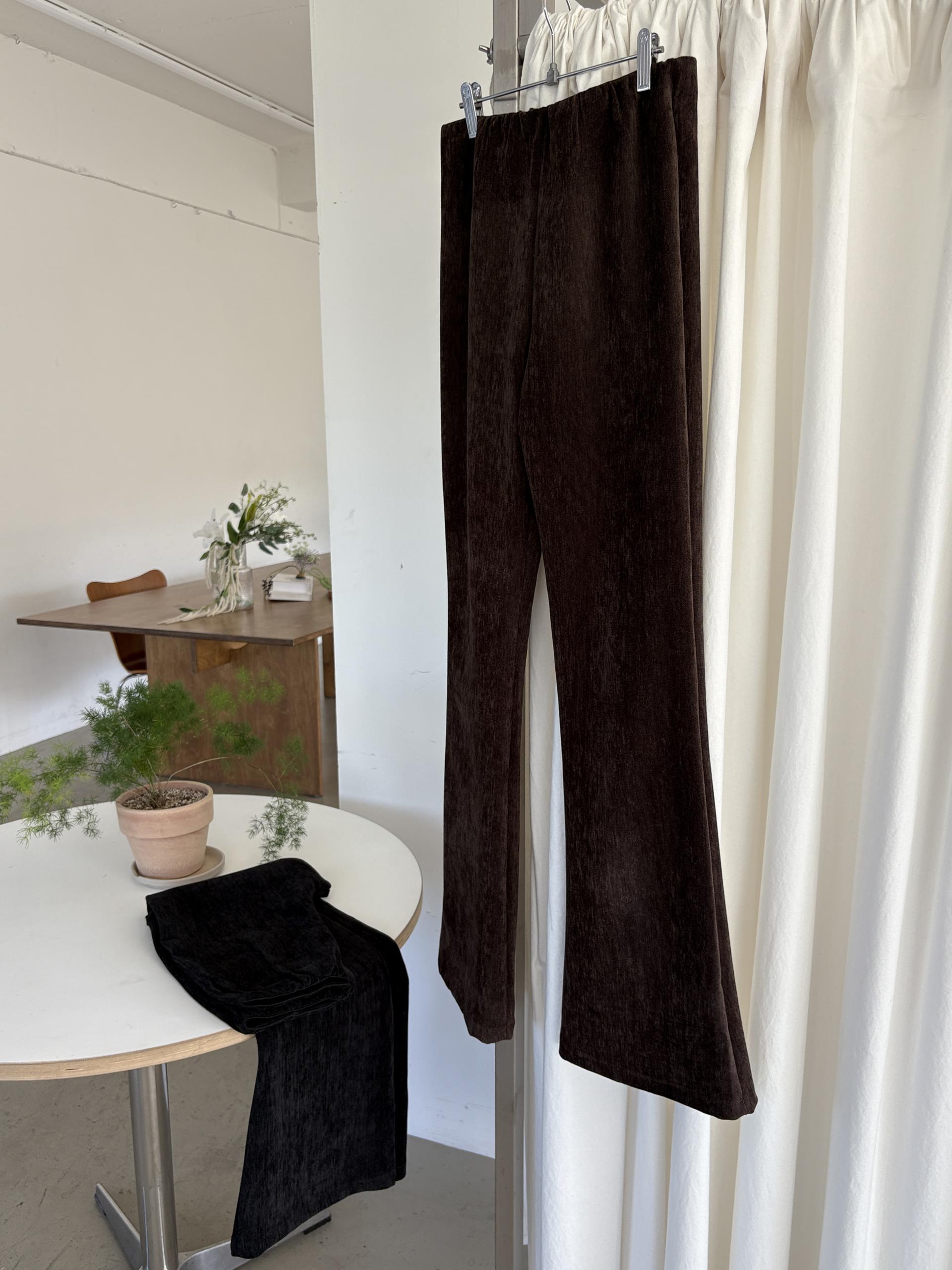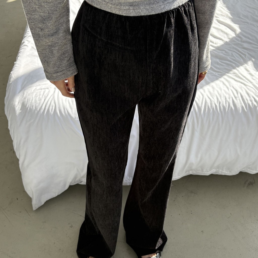 은은한 광택과 부드러운 텍스처가 돋보이는 부츠컷 실루엣의 롱 팬츠입니다.