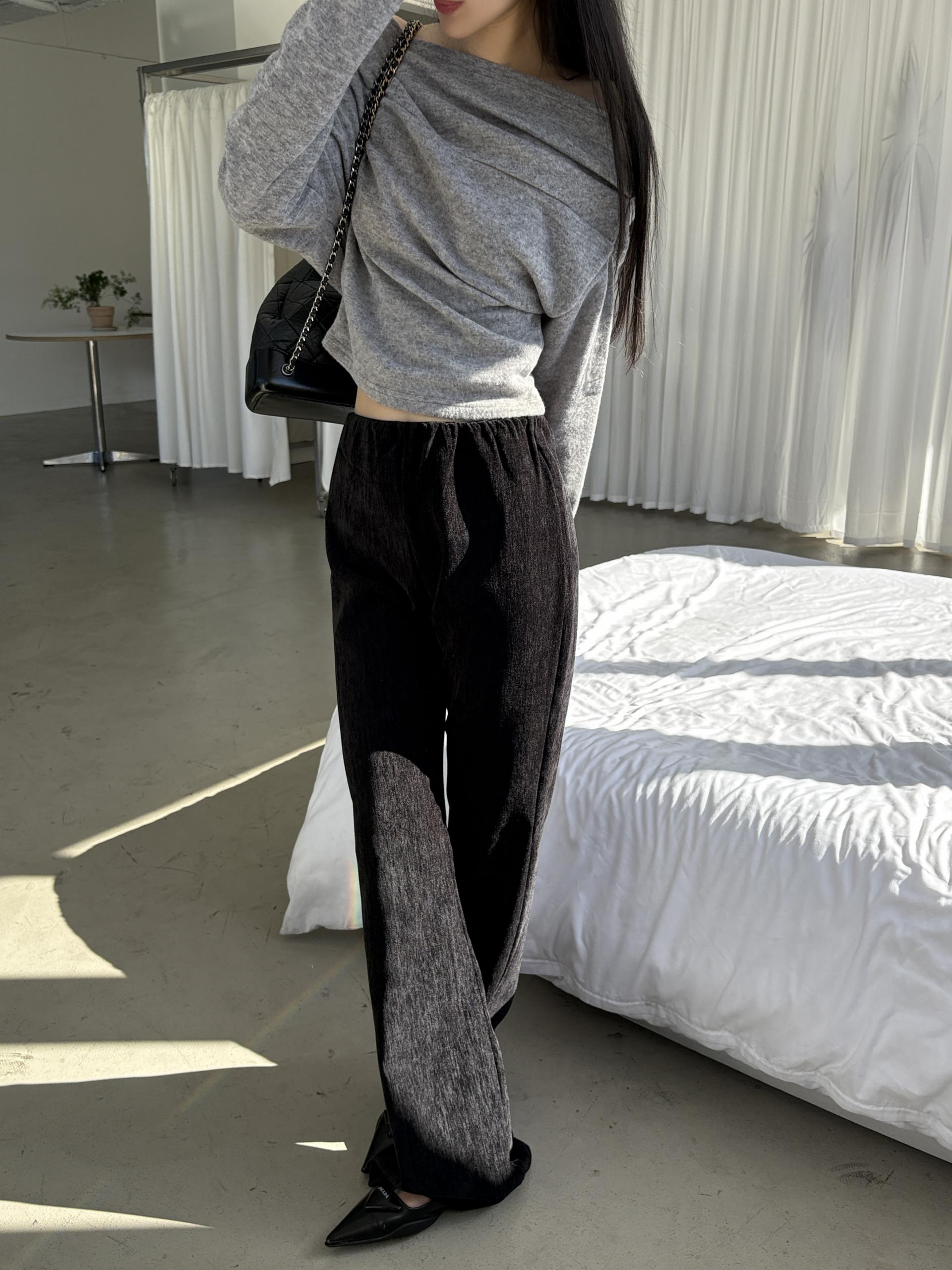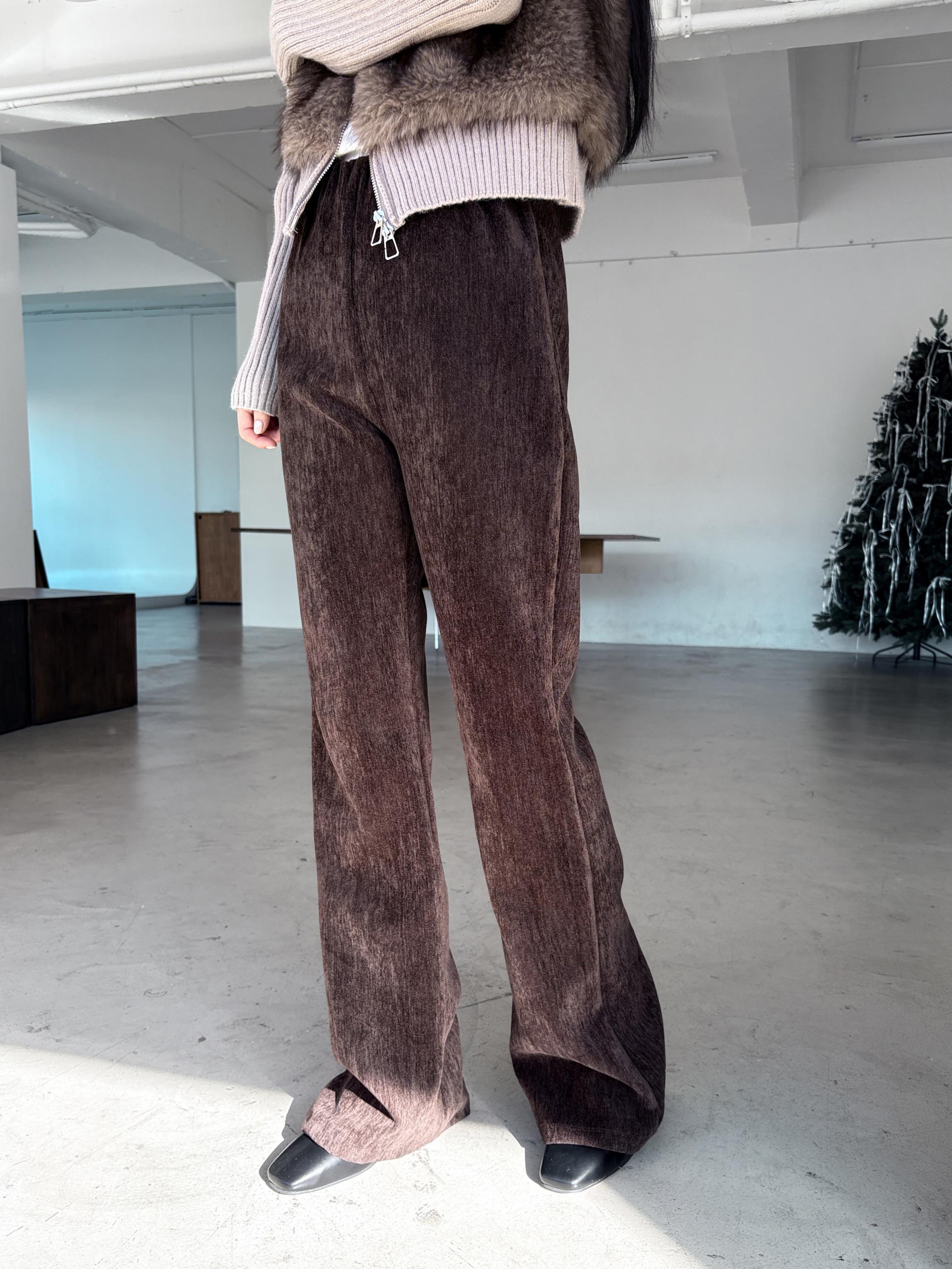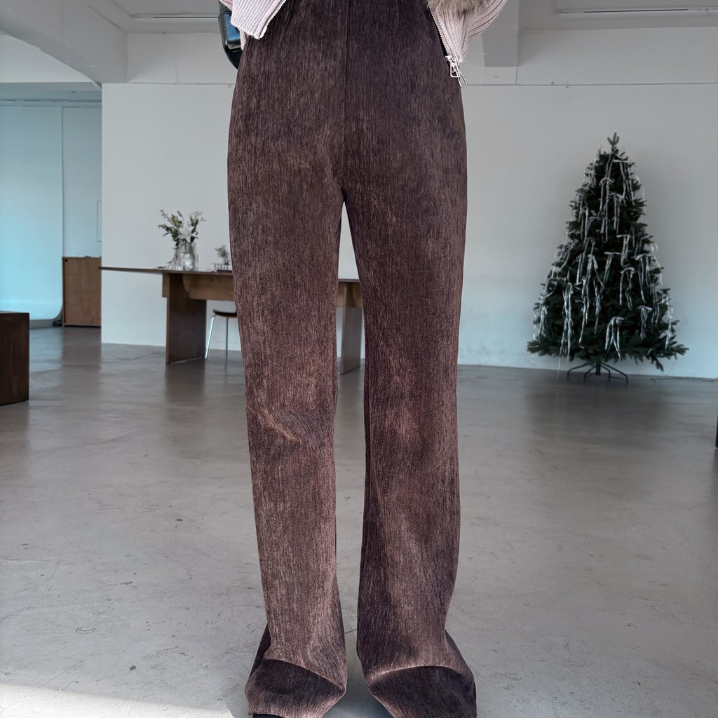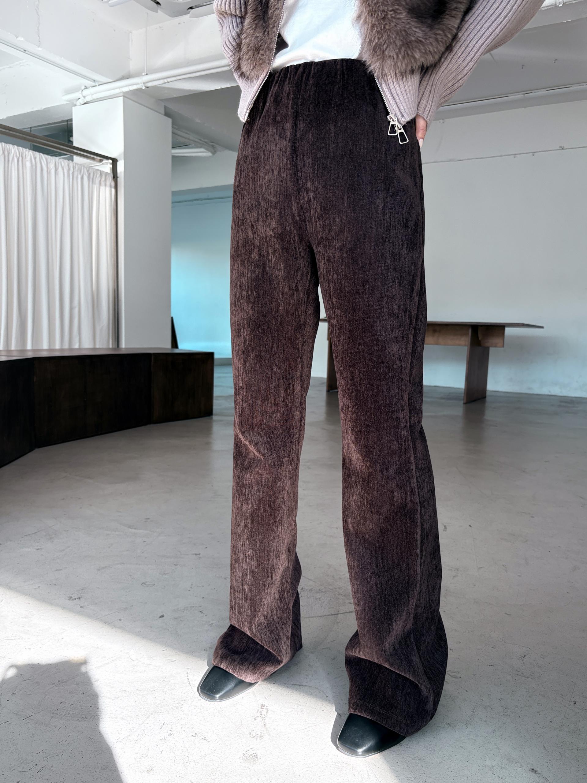 은은한 광택과 부드러운 텍스처가 돋보이는 부츠컷 실루엣의 롱 팬츠입니다.