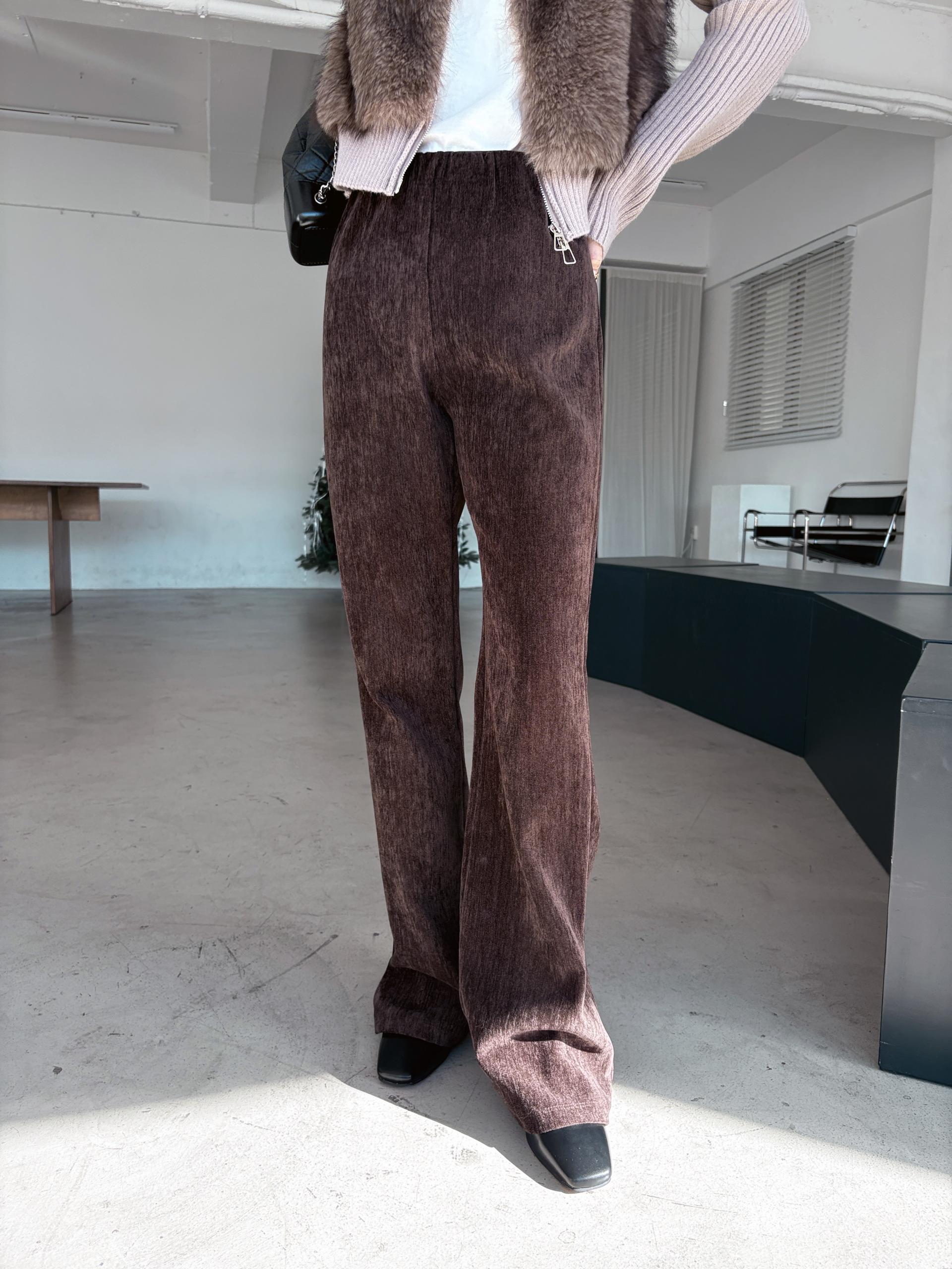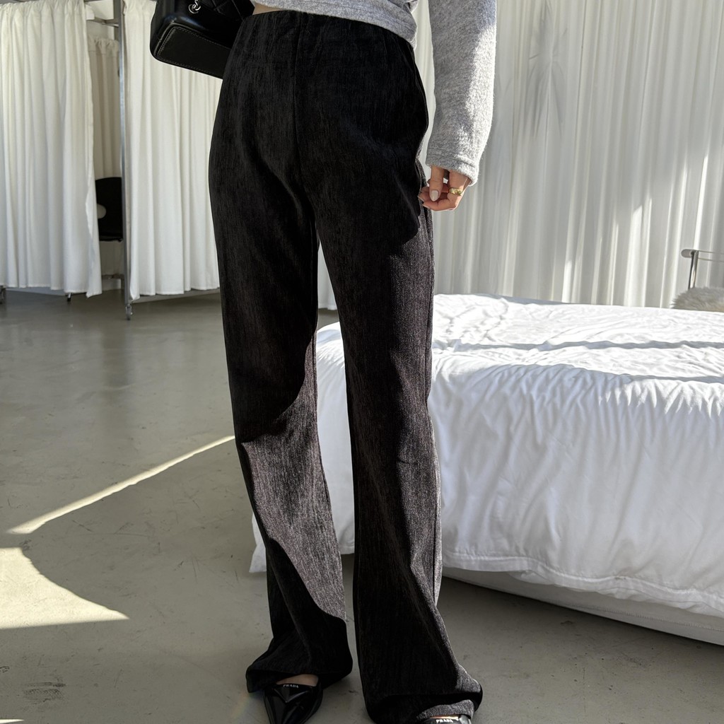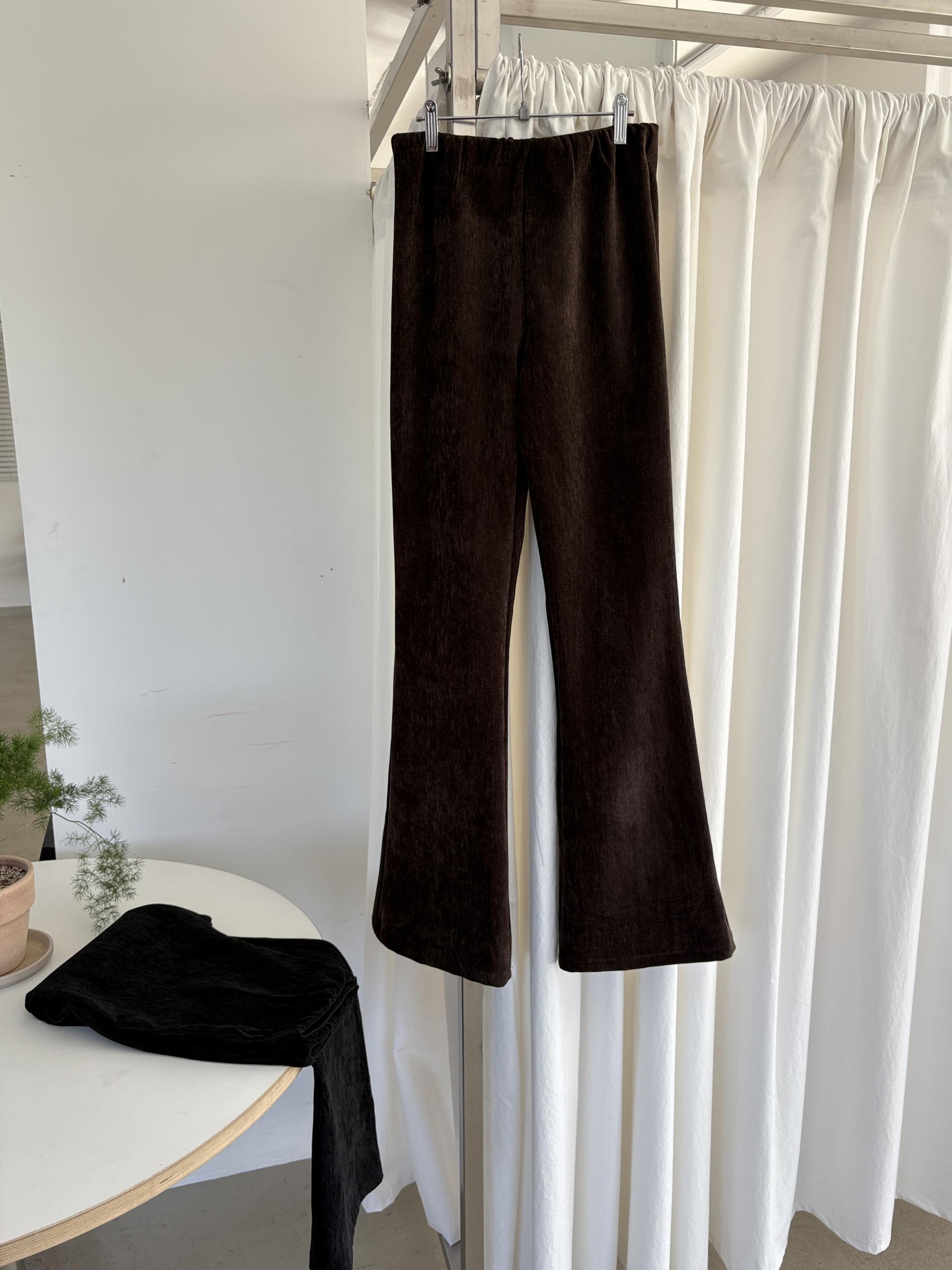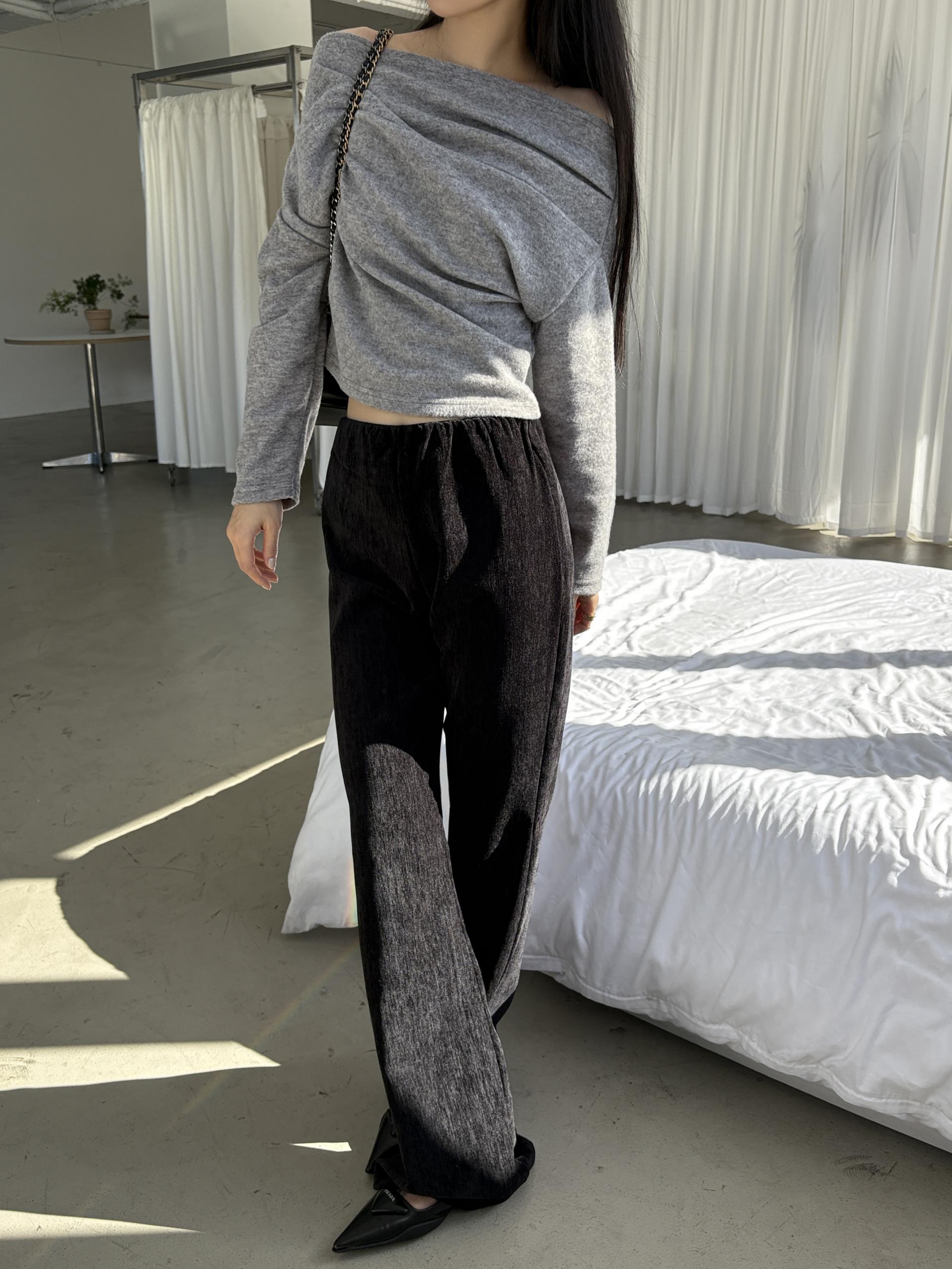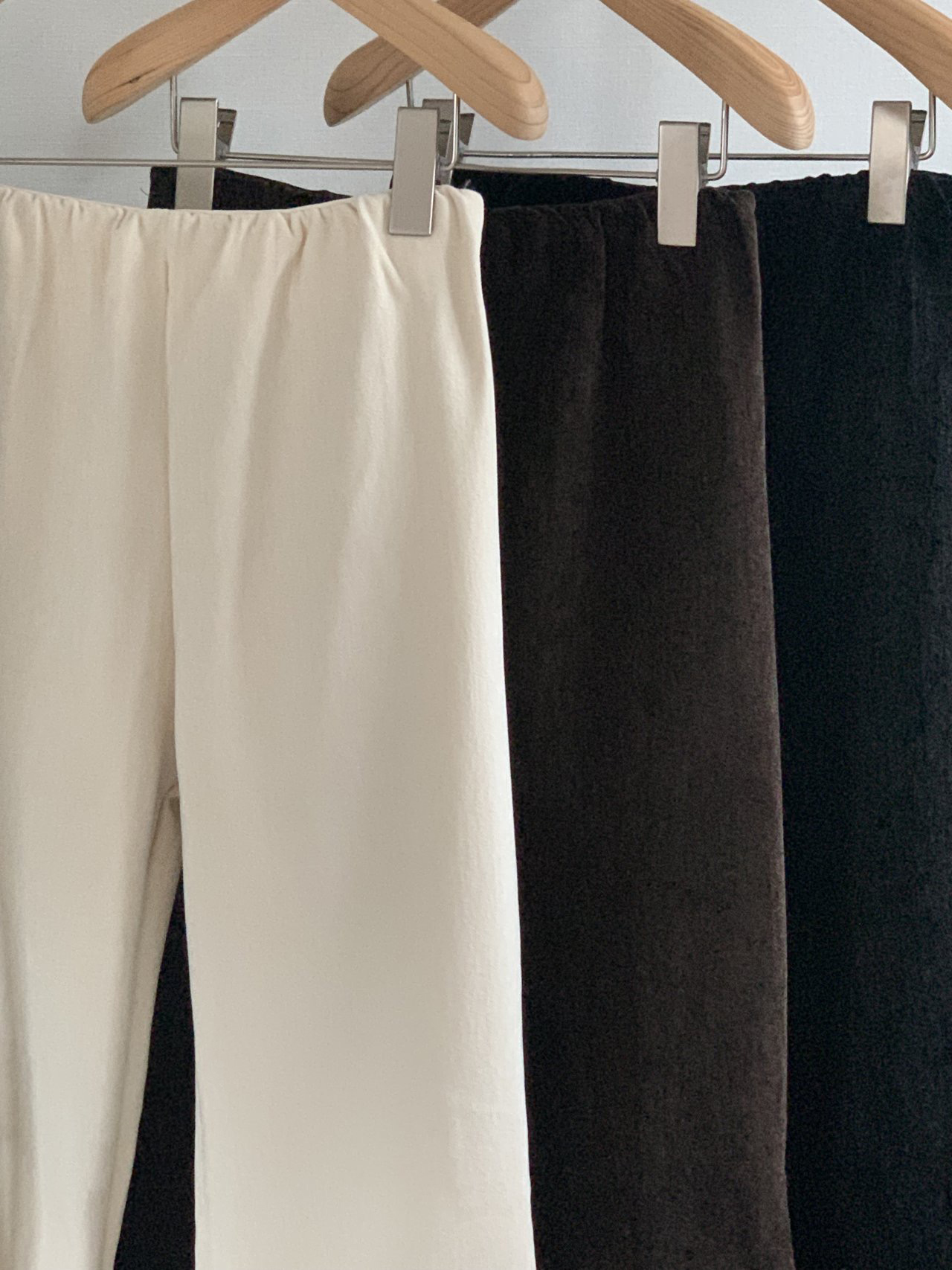 은은한 광택과 부드러운 텍스처가 돋보이는 부츠컷 실루엣의 롱 팬츠입니다.