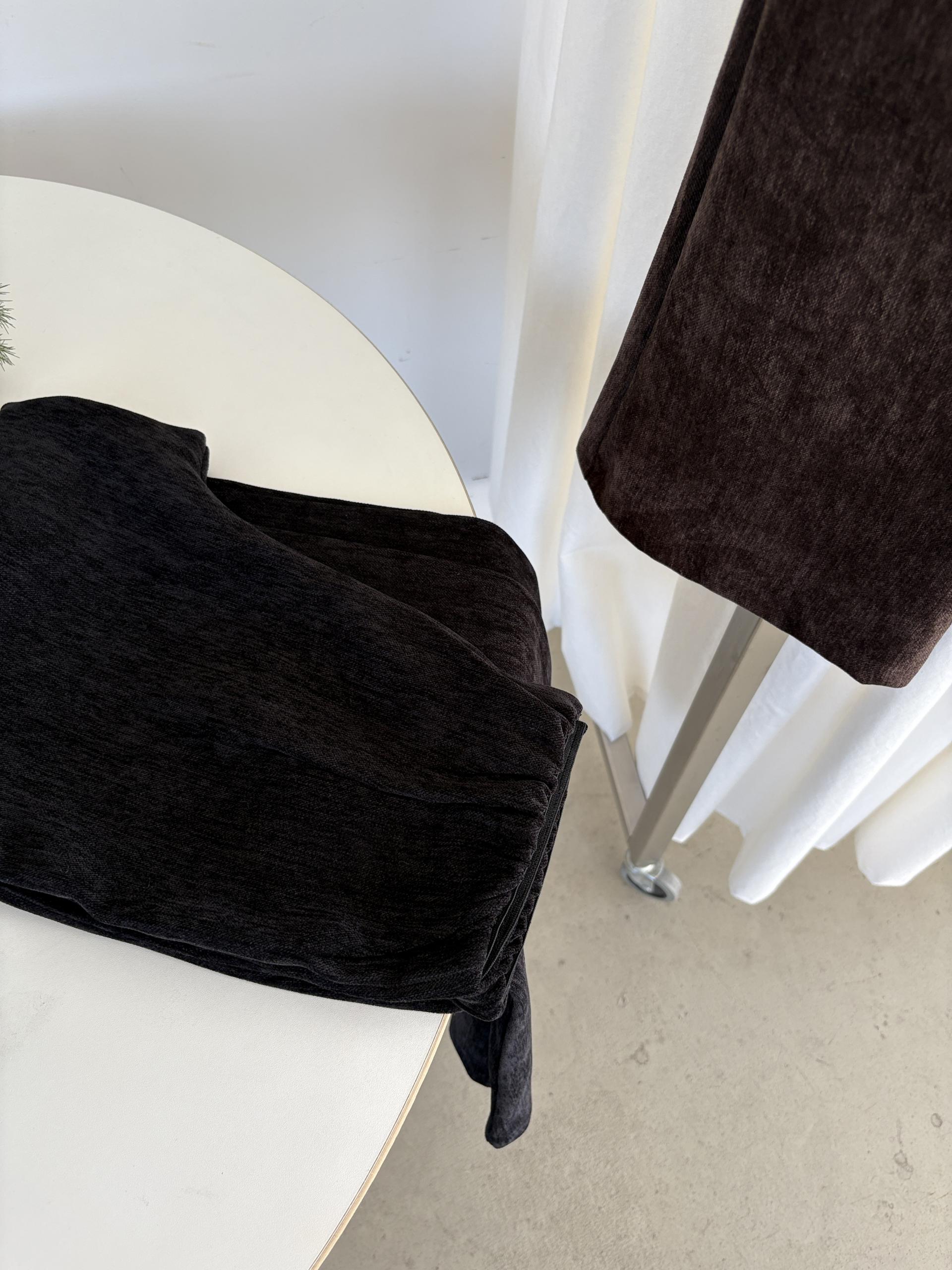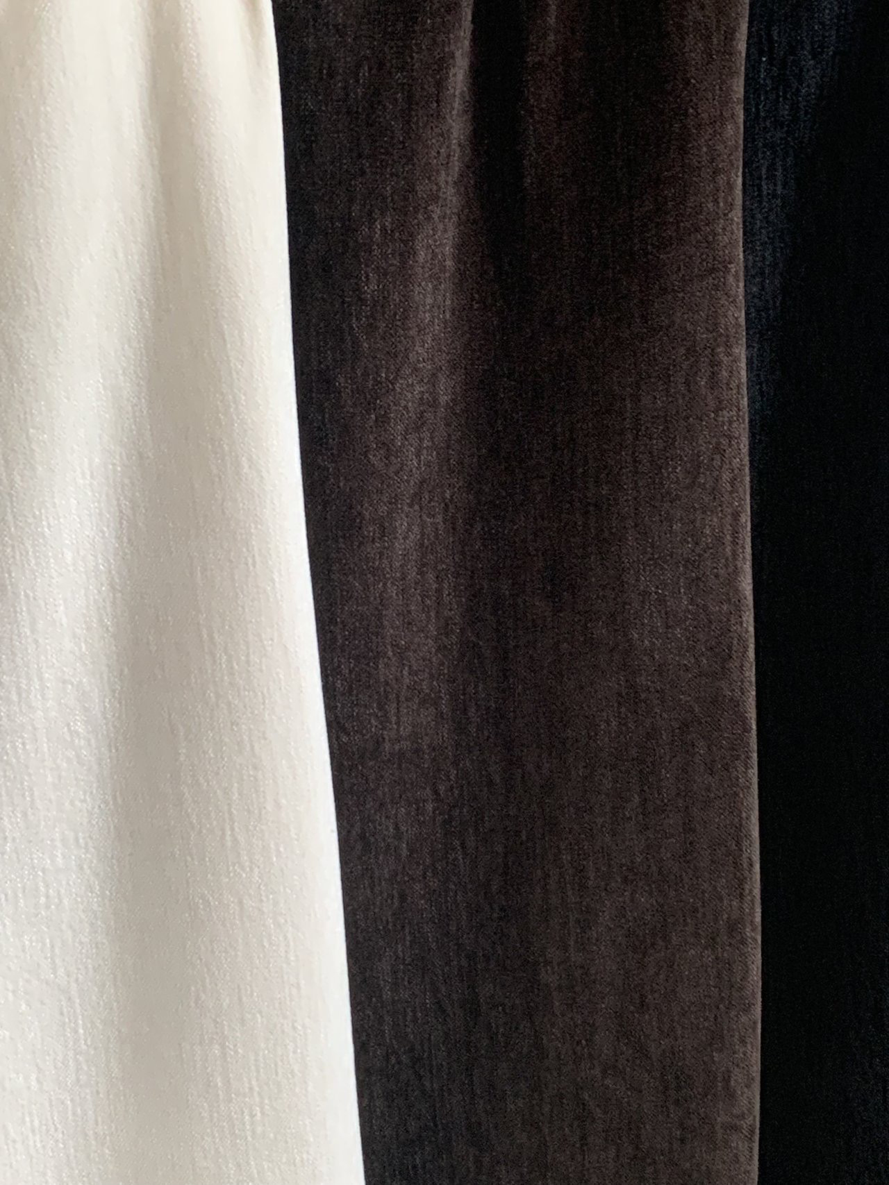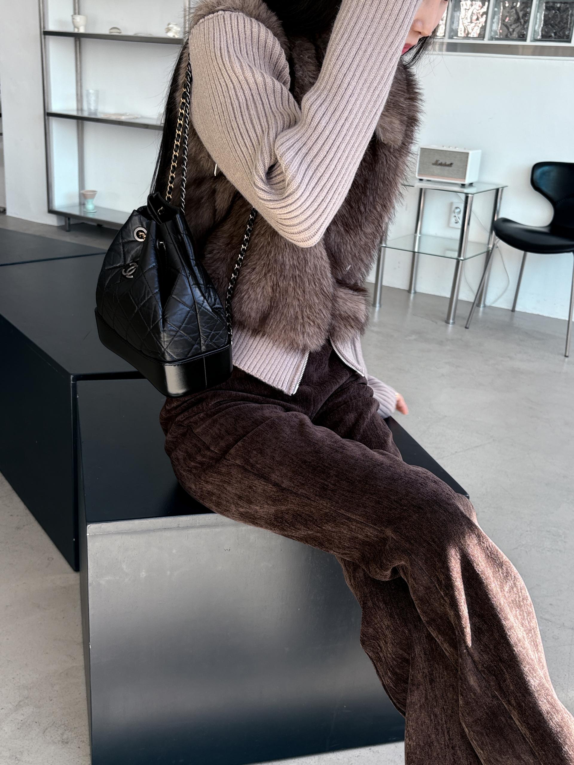 겉면은 코듀로이 원단의 빳빳한 결감과 벨벳의 광택감이 동시에 느껴지는 매력적인 소재입니다. 흔하지 않고 멋스러워 매장 반응도 아주 좋은 상품이에요.