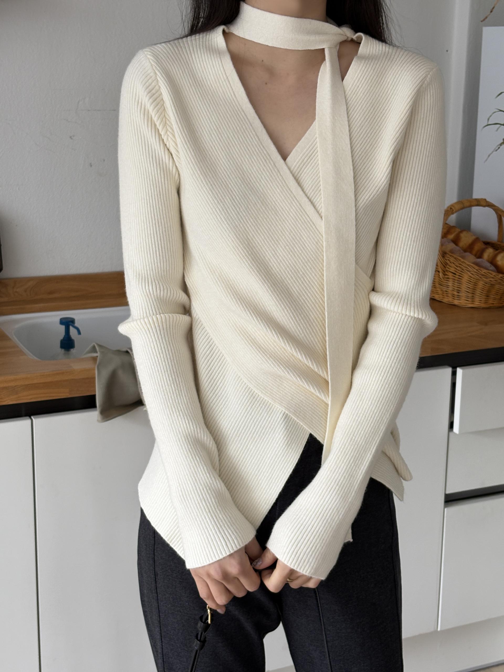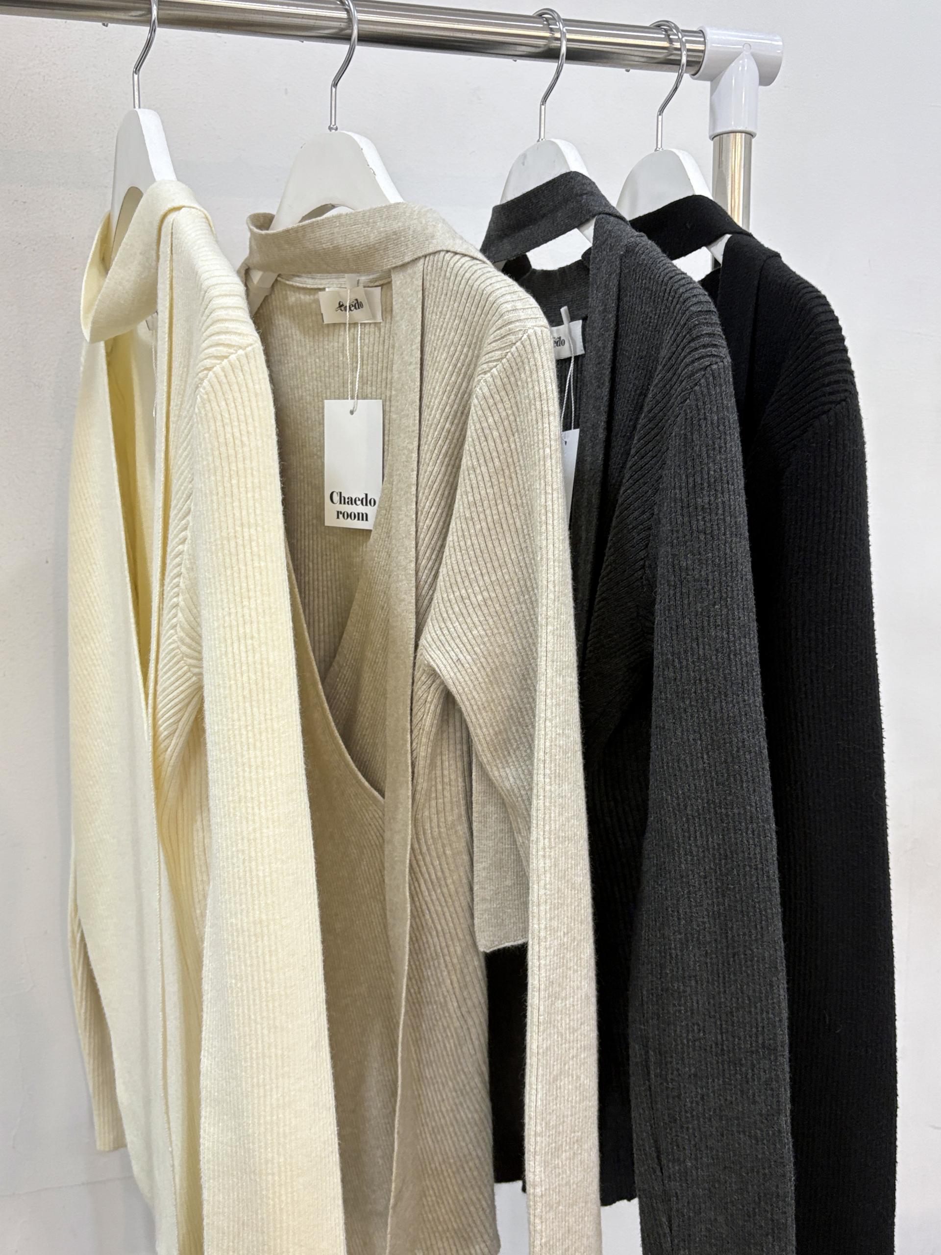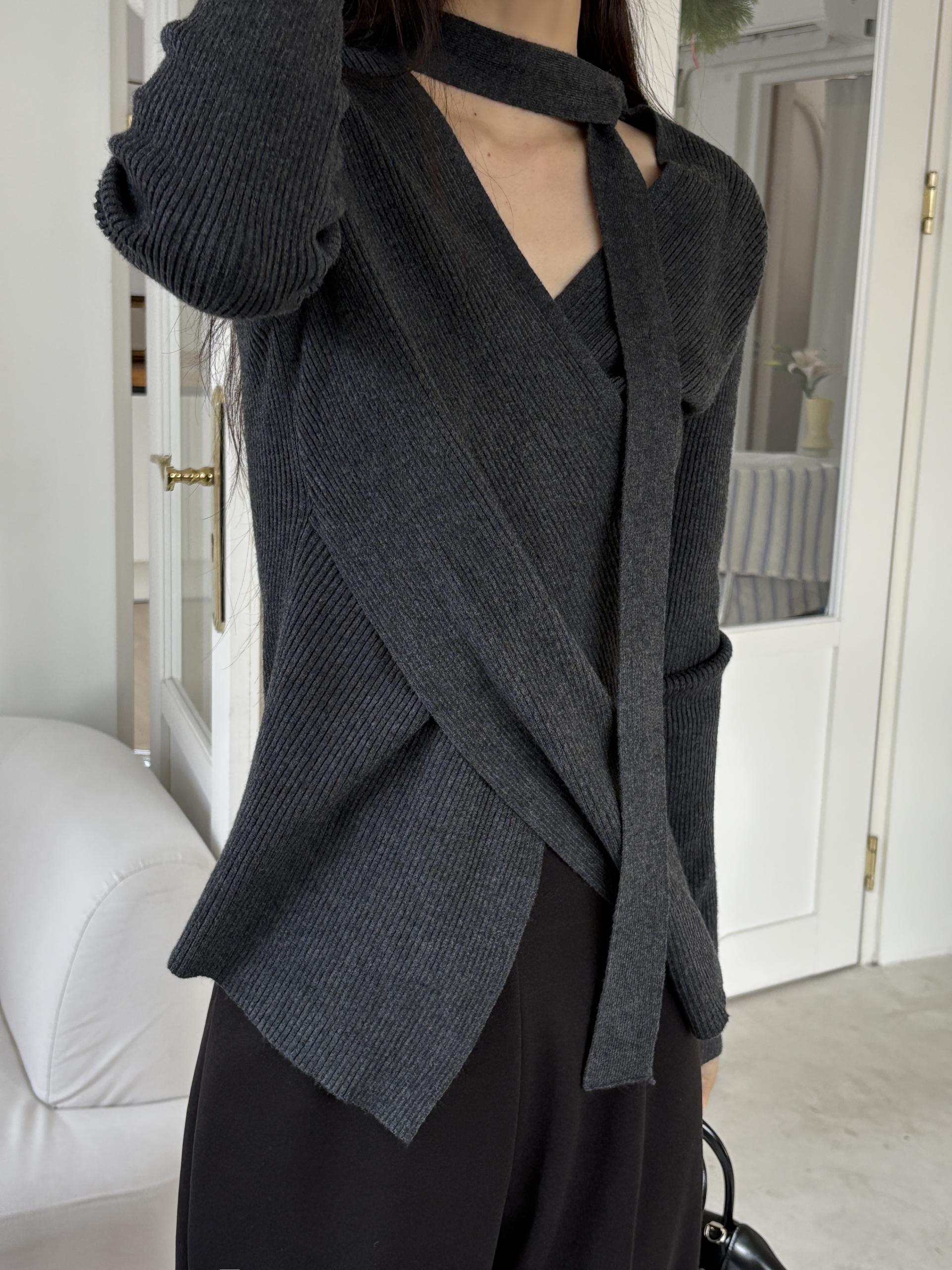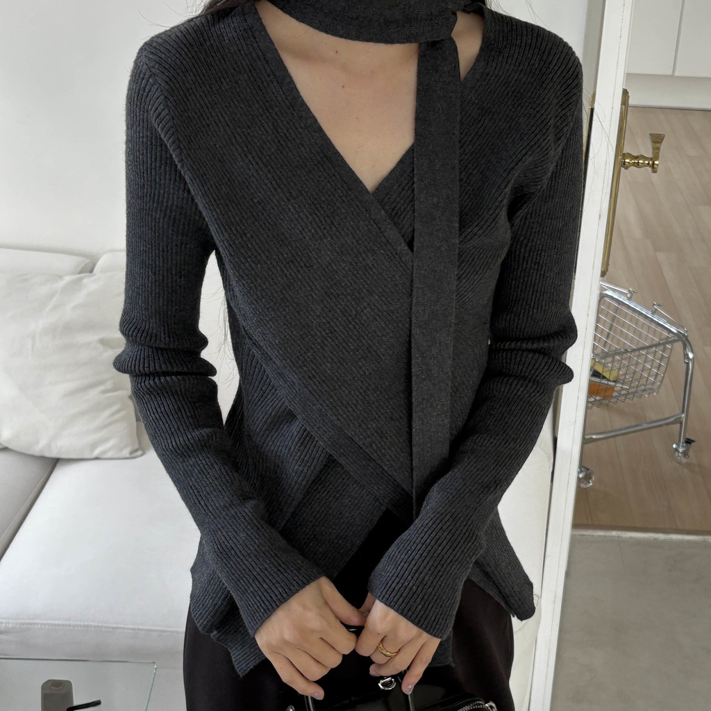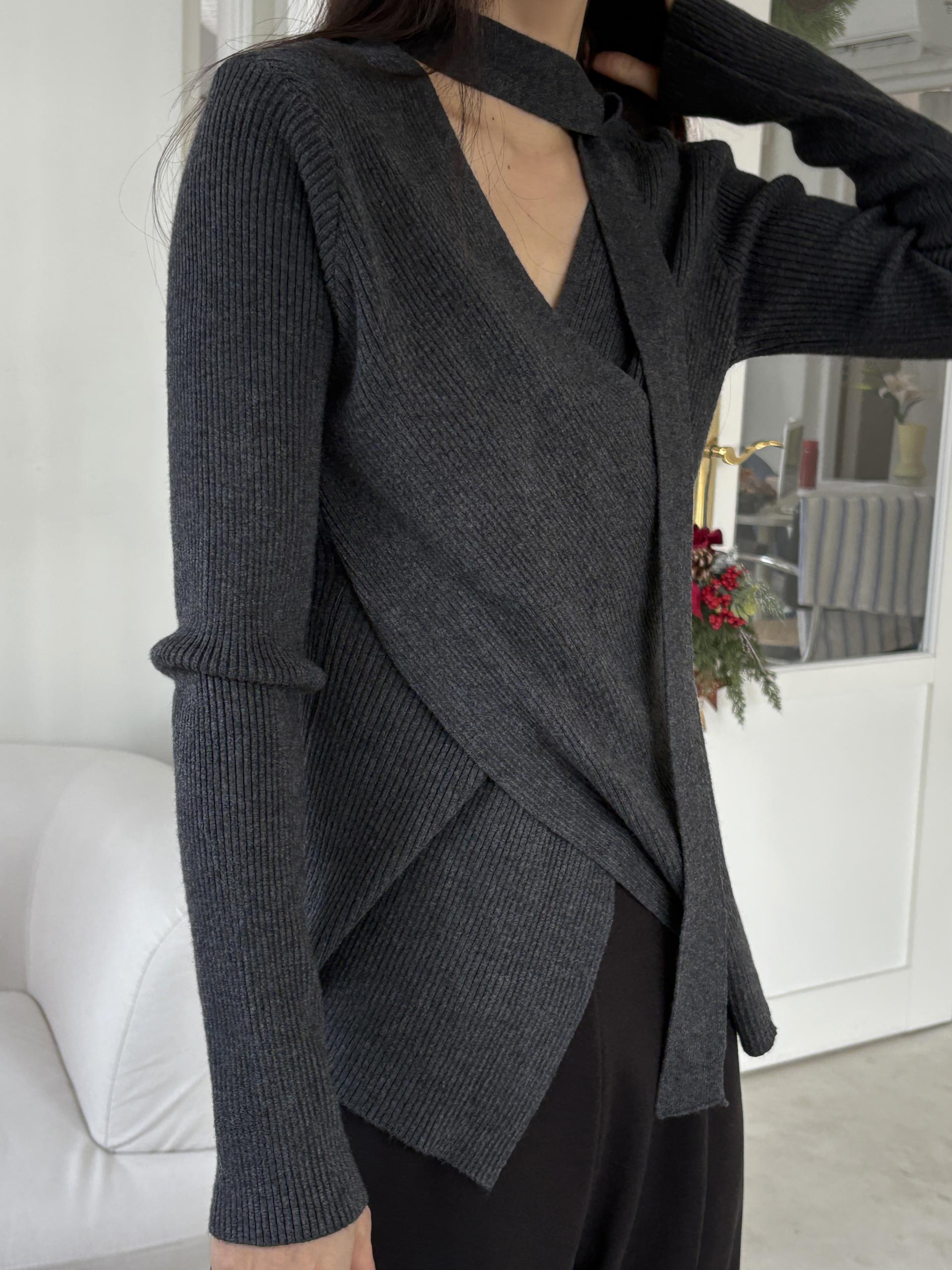 자연스러운 V넥에 초커 느낌의 롱 타이가 부착되어 얼굴선을 더욱 슬림하게 만들어주고, 세로 골지 패턴이 바디라인을 탄탄하게 정리해 더욱 날씬한 핏을 연출해요.