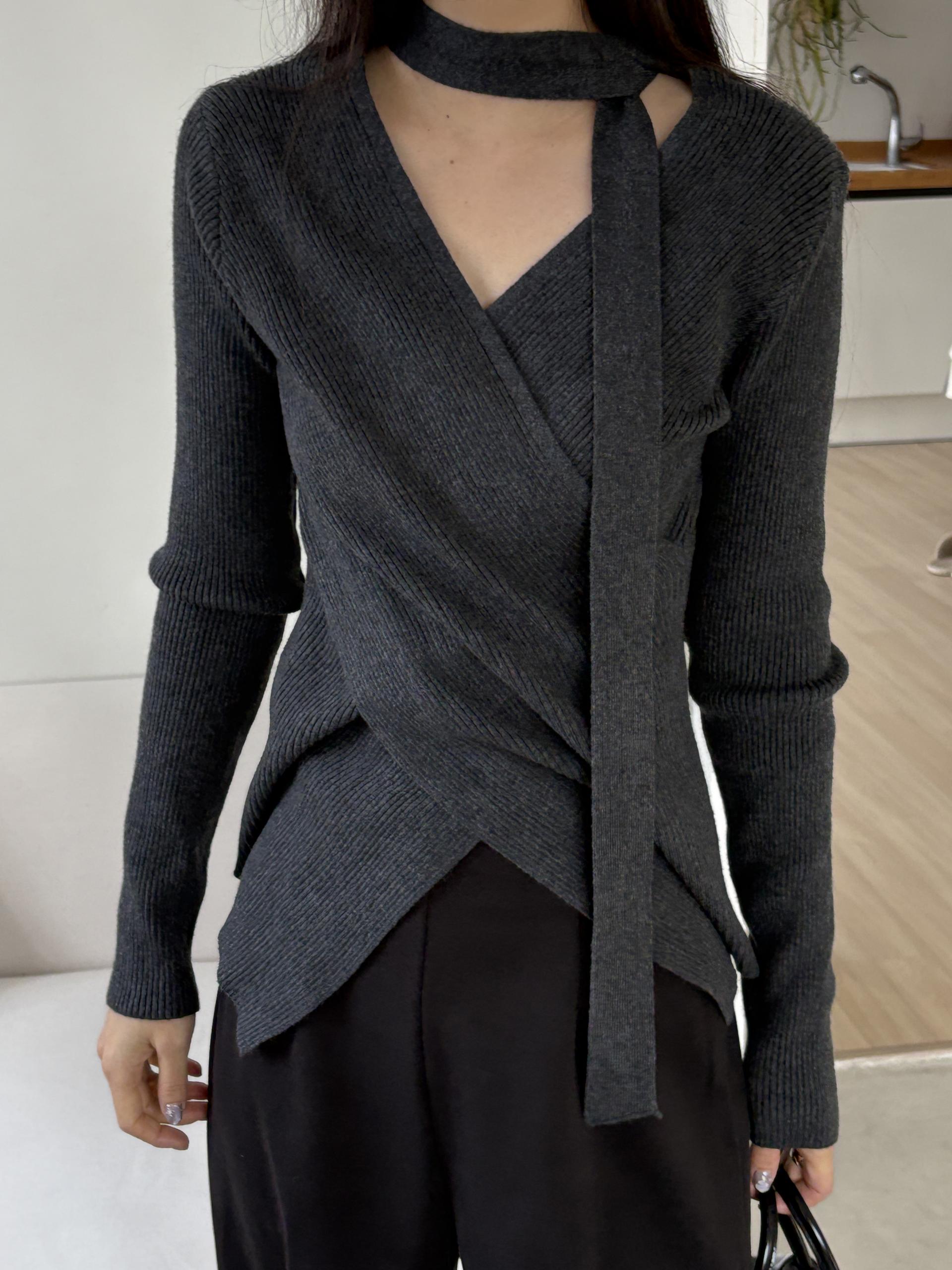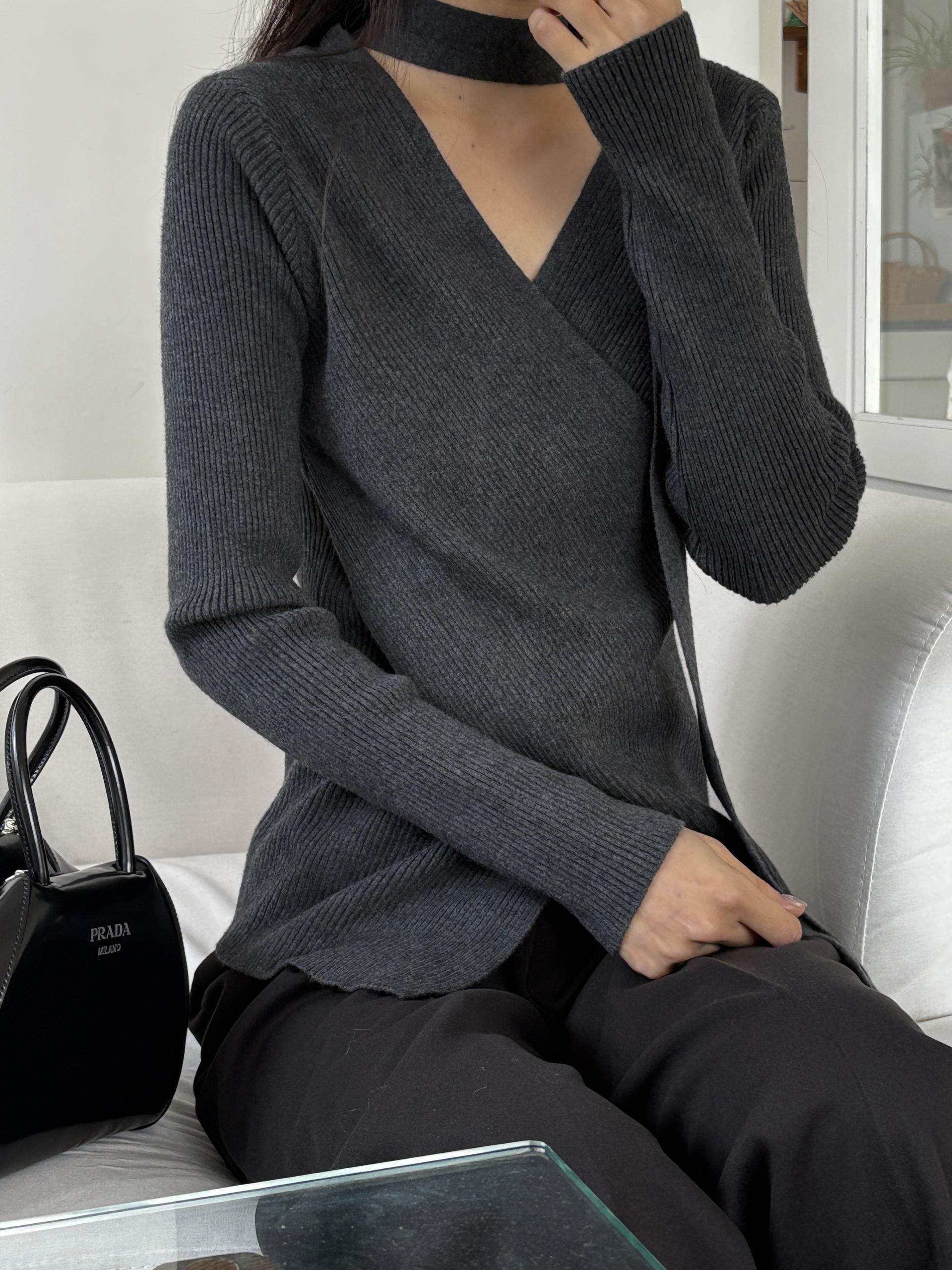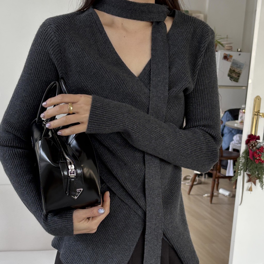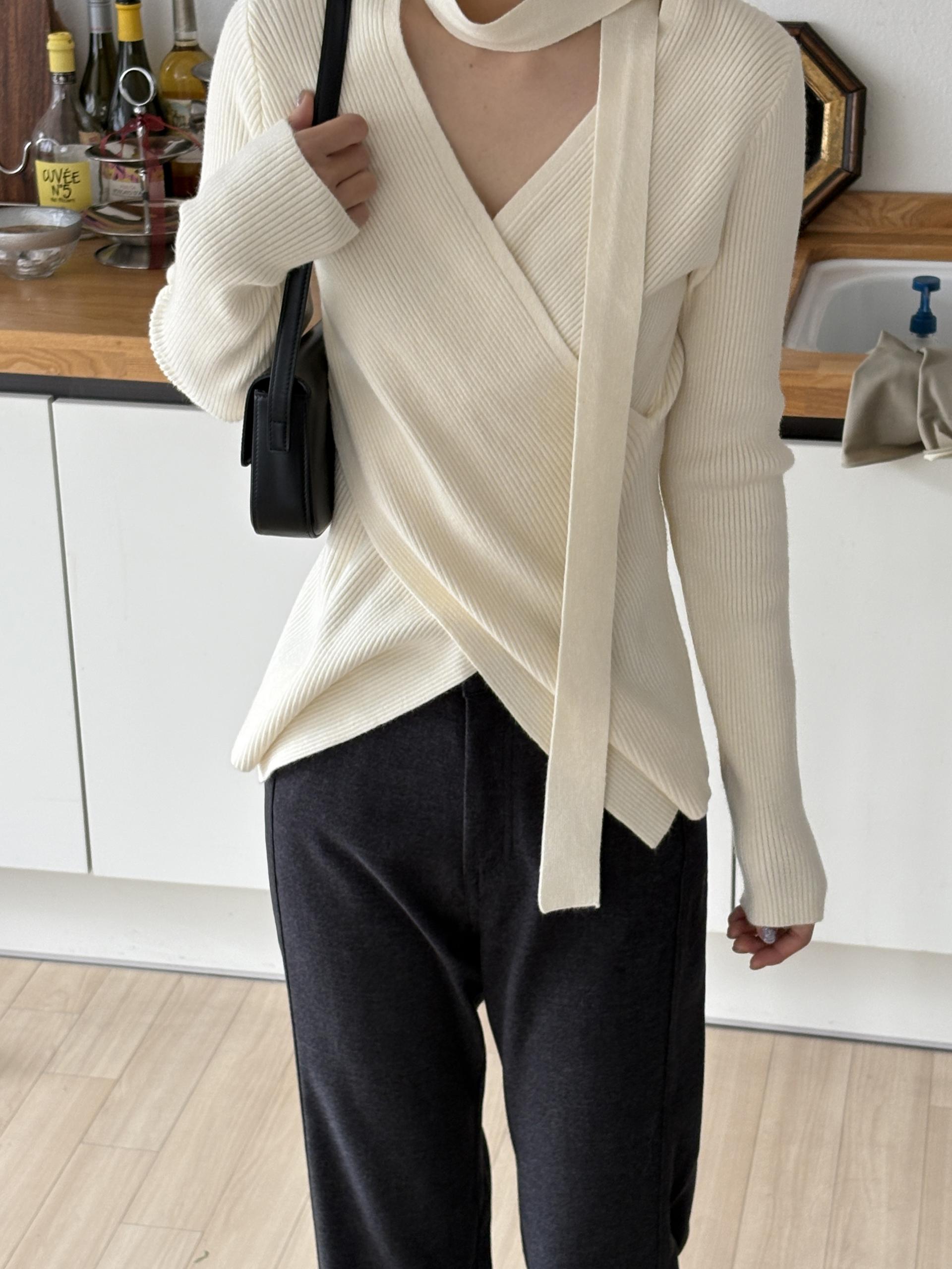 자연스러운 V넥에 초커 느낌의 롱 타이가 부착되어 얼굴선을 더욱 슬림하게 만들어주고, 세로 골지 패턴이 바디라인을 탄탄하게 정리해 더욱 날씬한 핏을 연출해요.