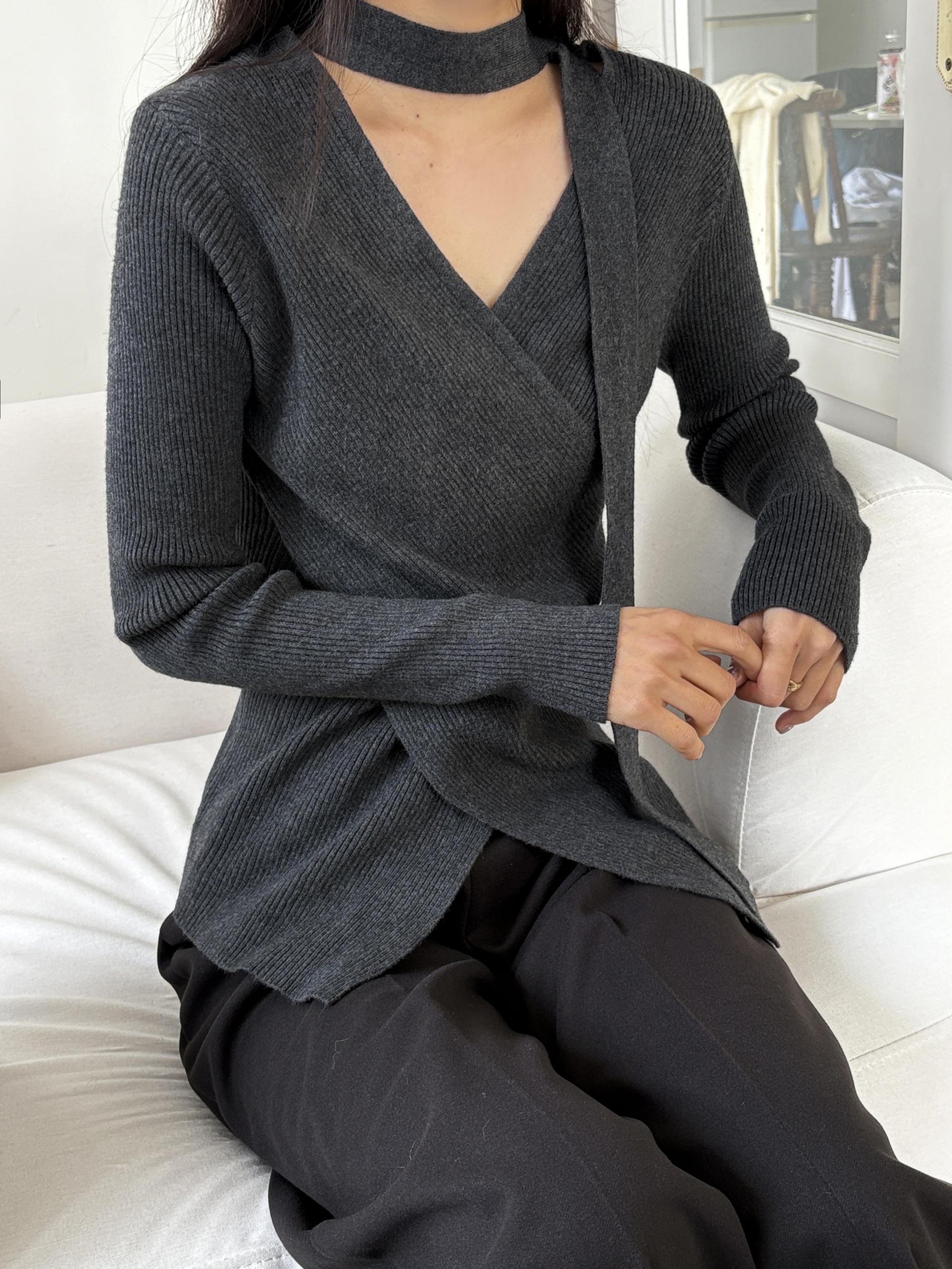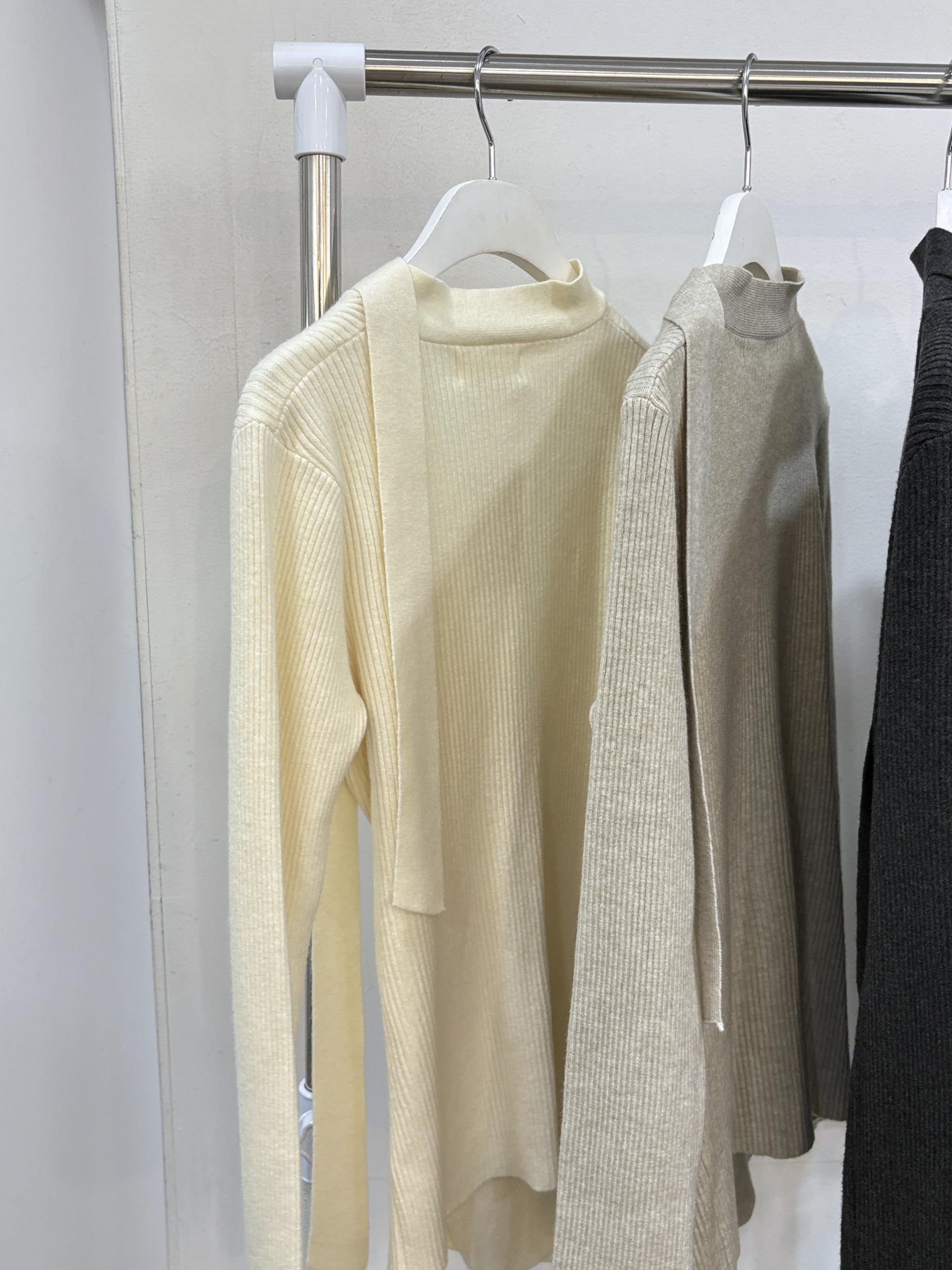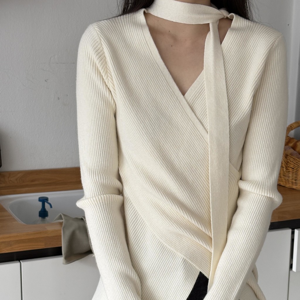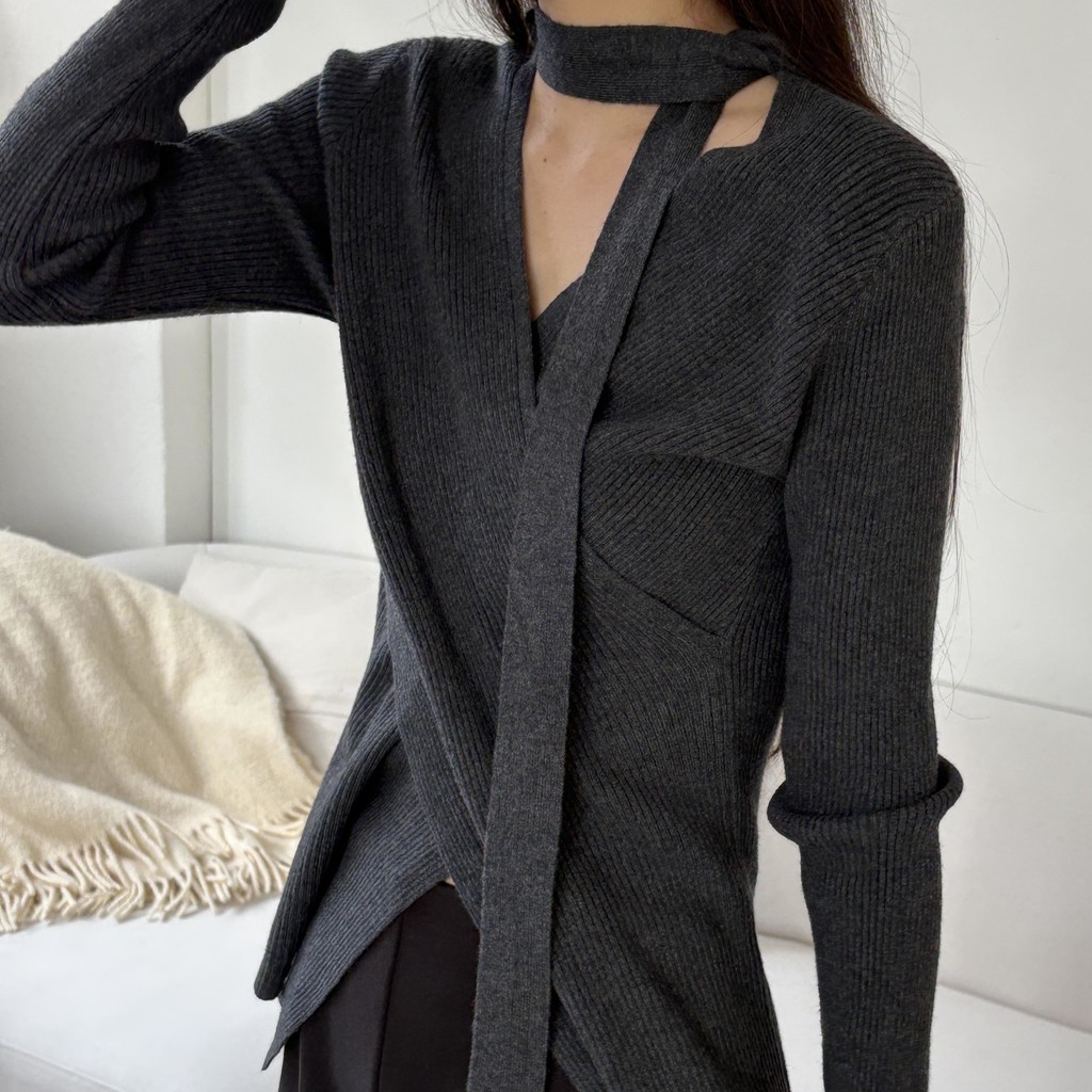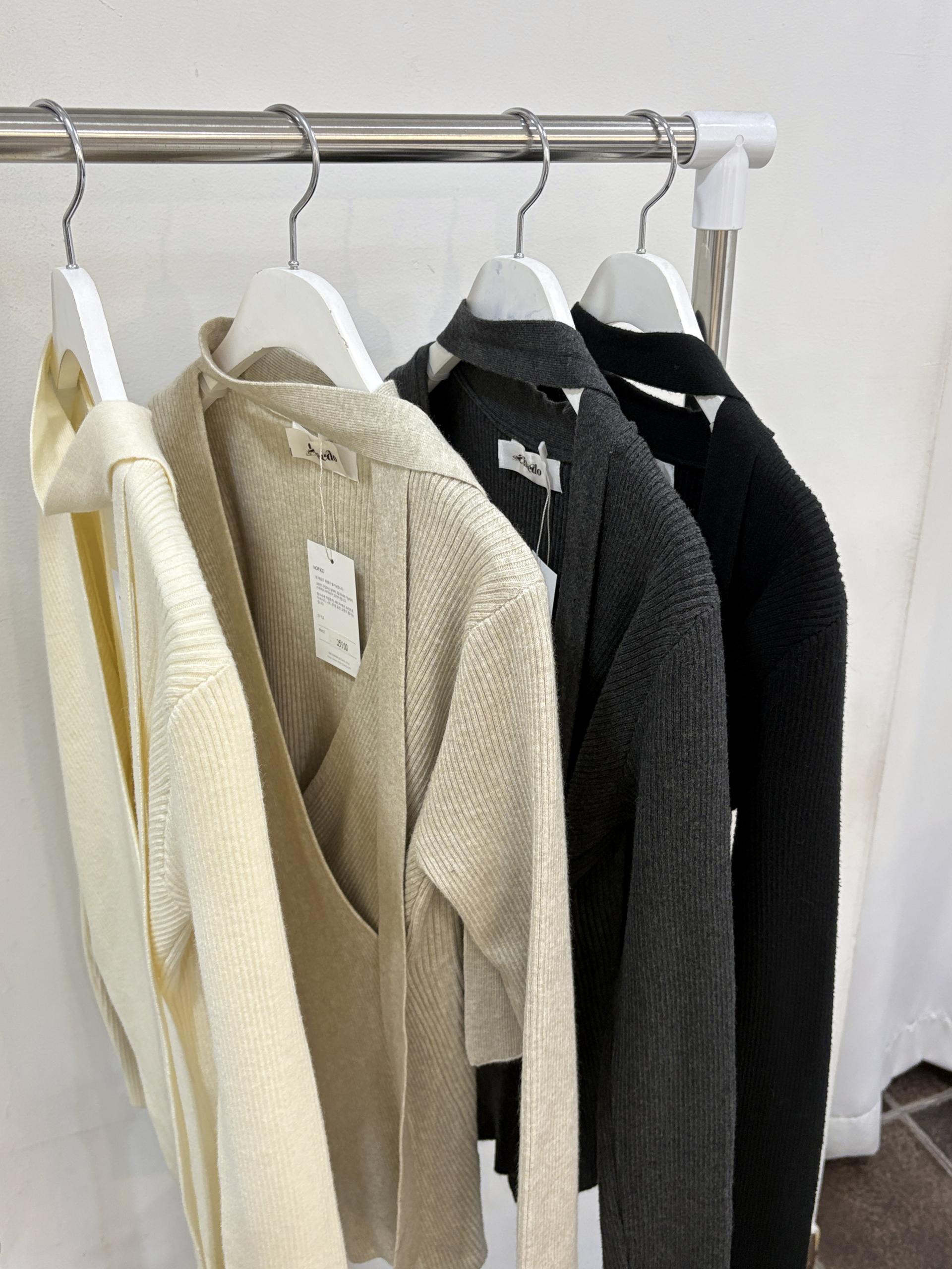 자연스러운 V넥에 초커 느낌의 롱 타이가 부착되어 얼굴선을 더욱 슬림하게 만들어주고, 세로 골지 패턴이 바디라인을 탄탄하게 정리해 더욱 날씬한 핏을 연출해요.