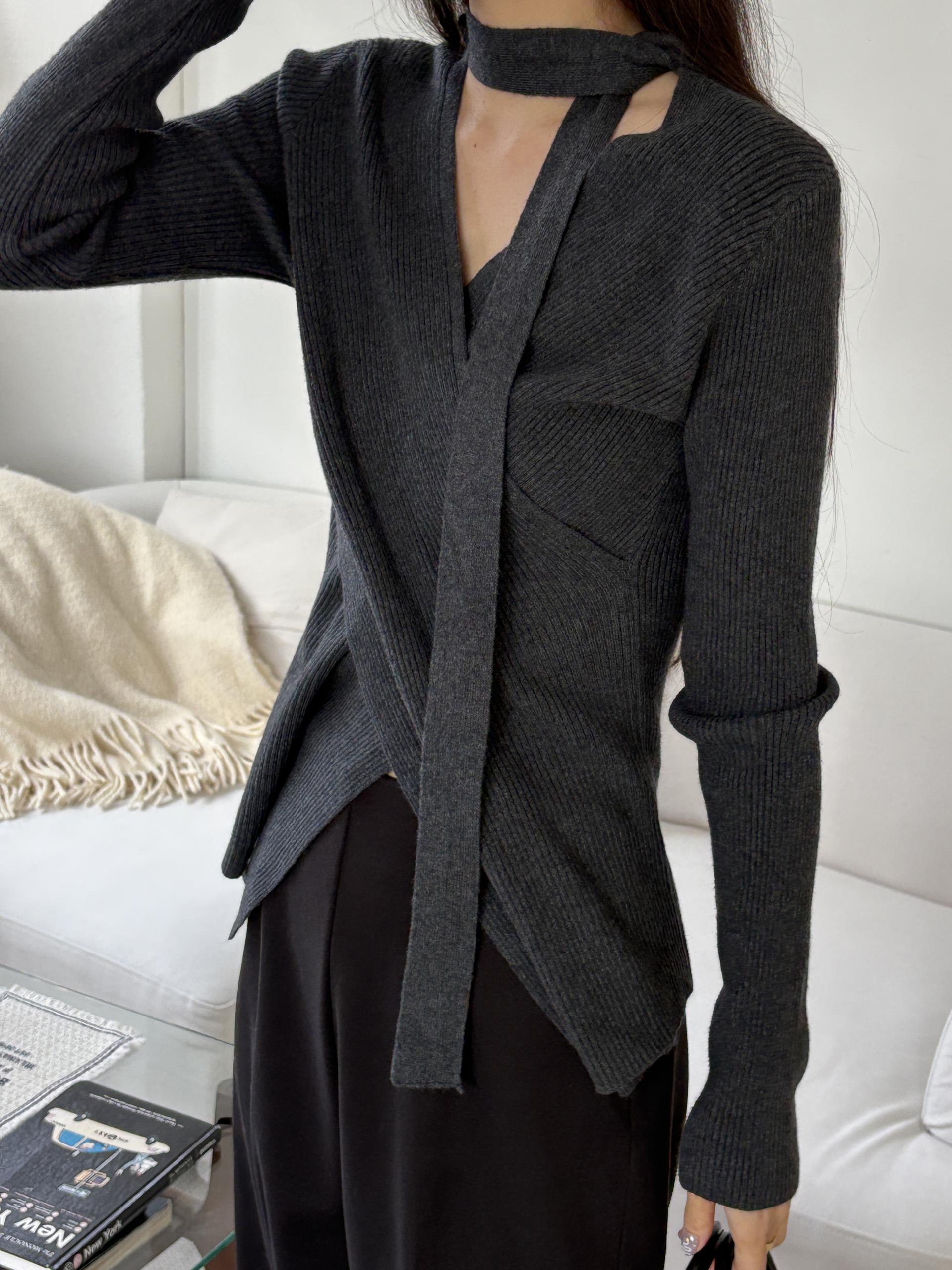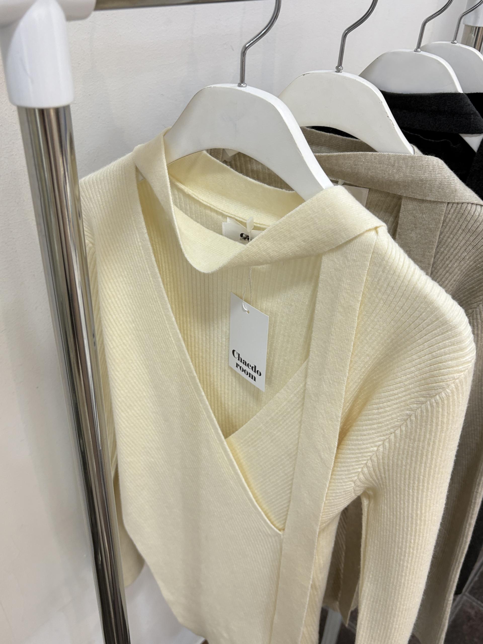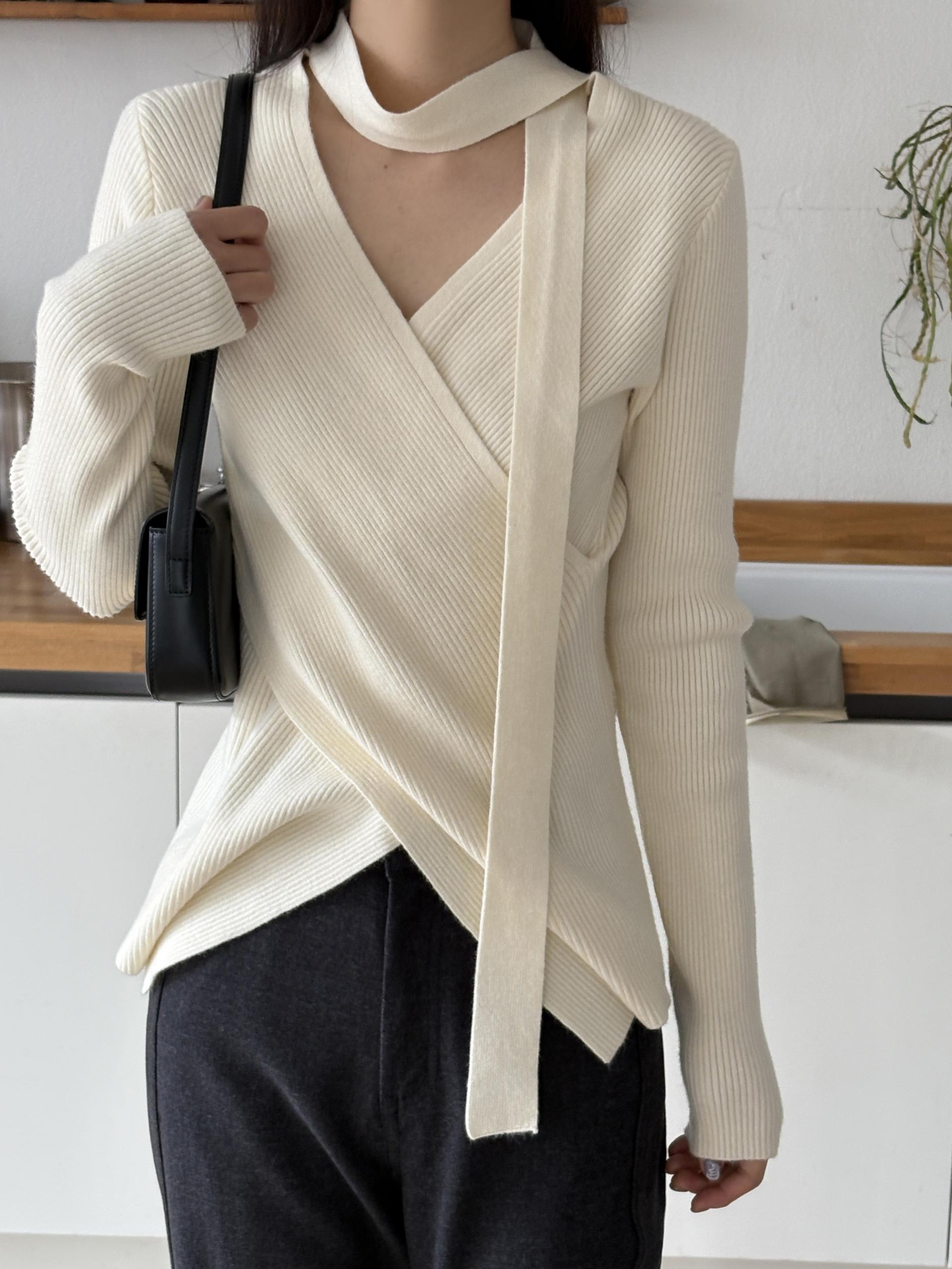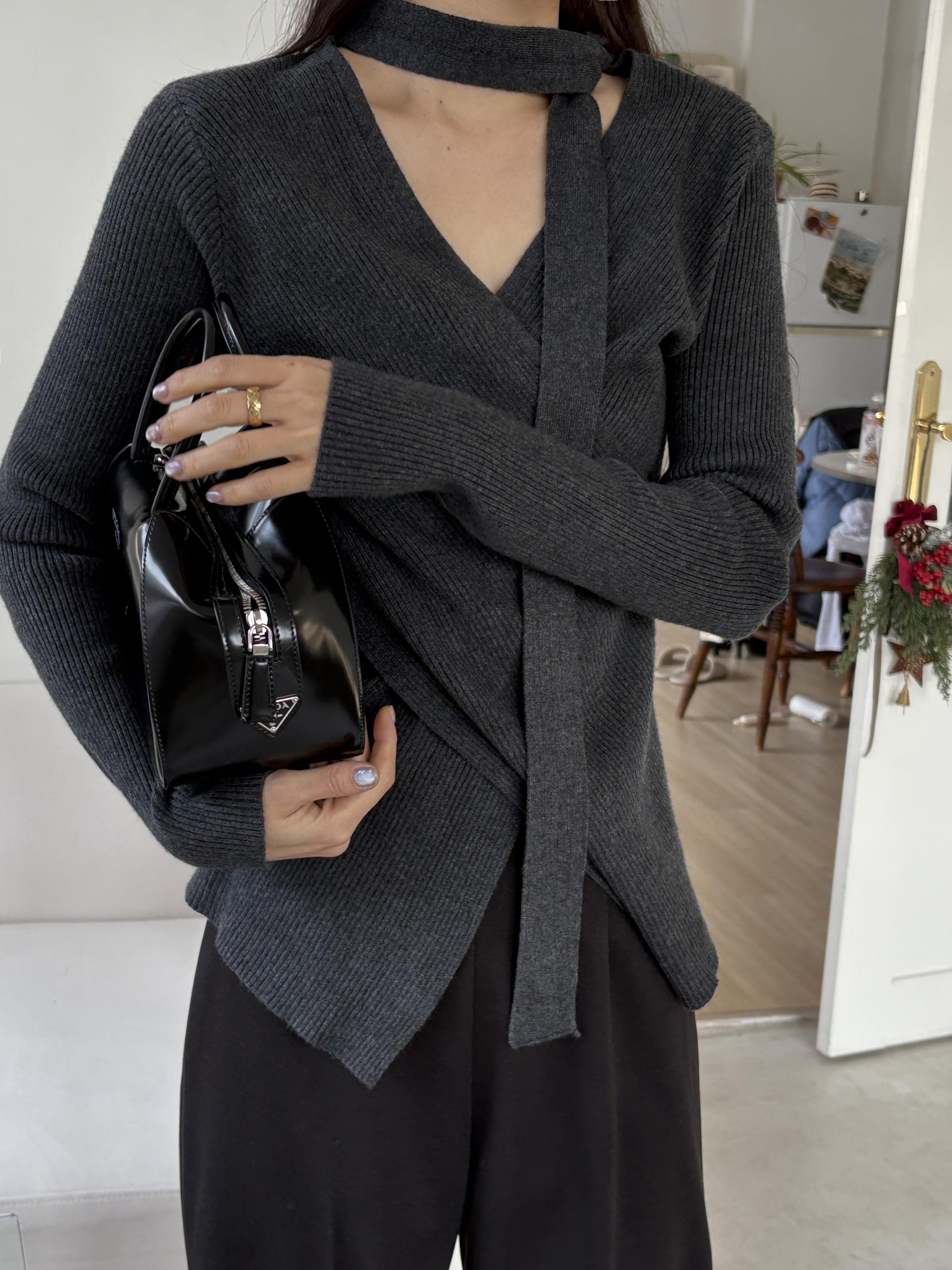 자연스러운 V넥에 초커 느낌의 롱 타이가 부착되어 얼굴선을 더욱 슬림하게 만들어주고, 세로 골지 패턴이 바디라인을 탄탄하게 정리해 더욱 날씬한 핏을 연출해요.