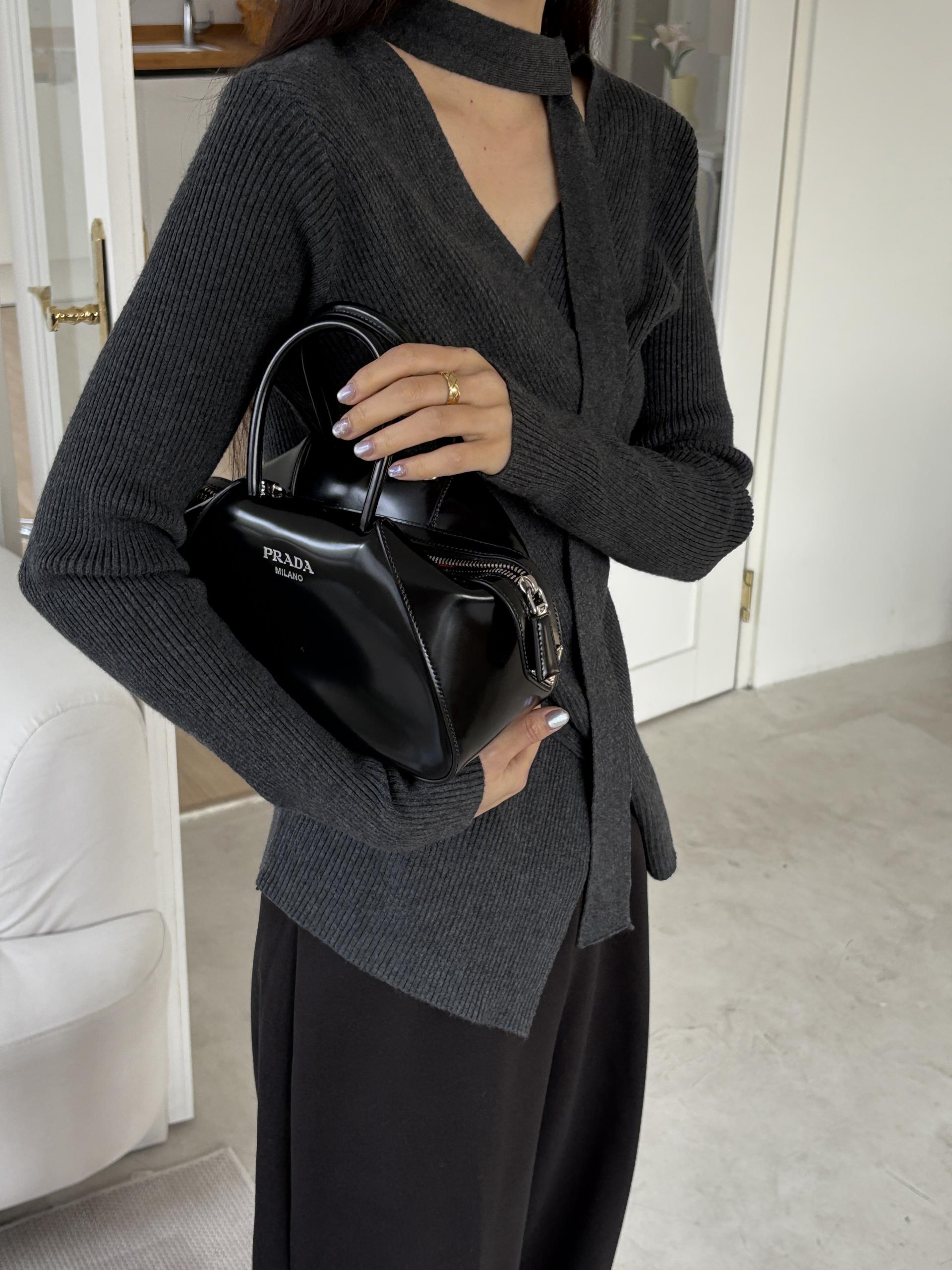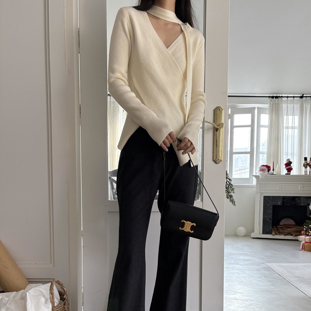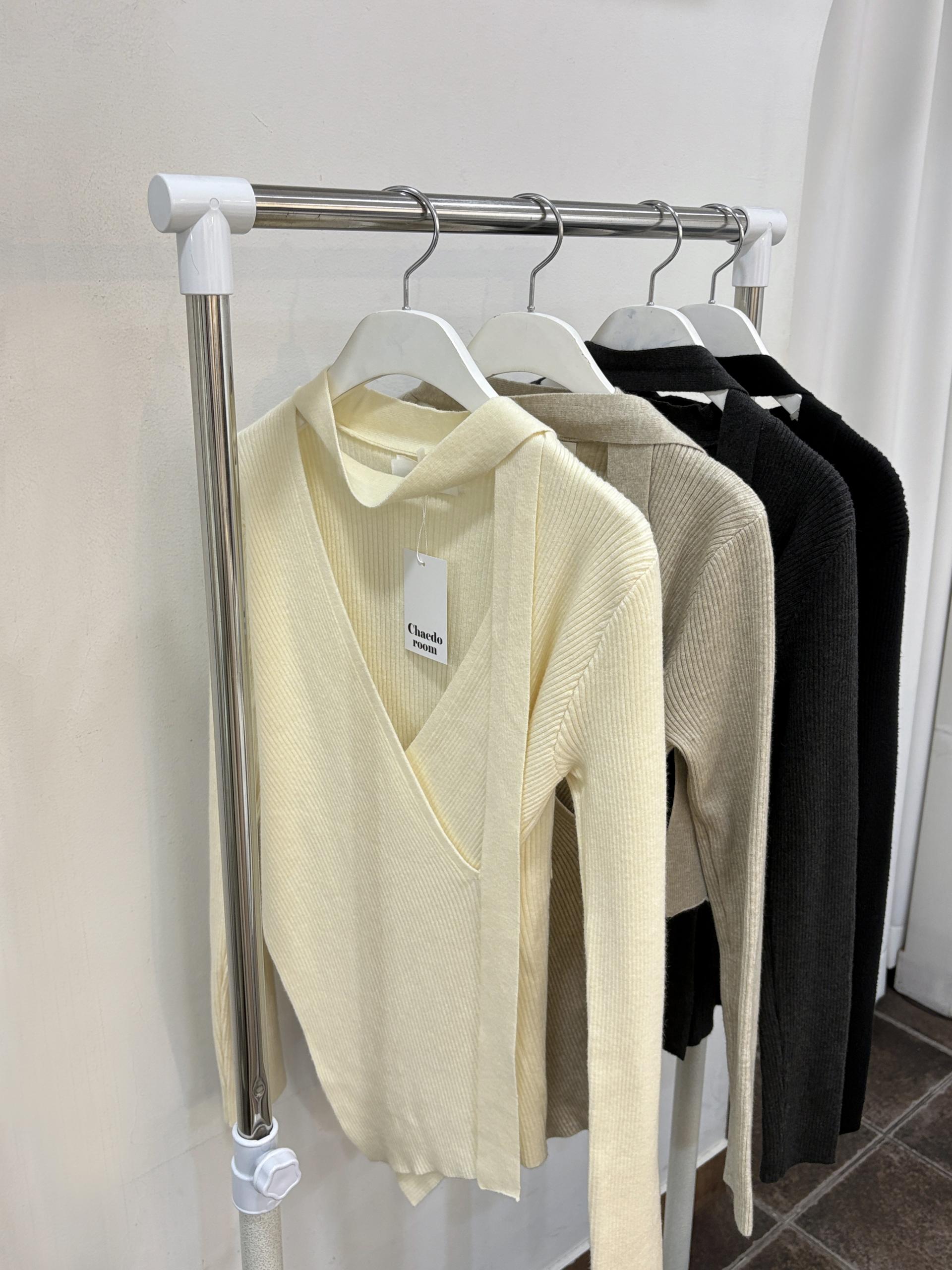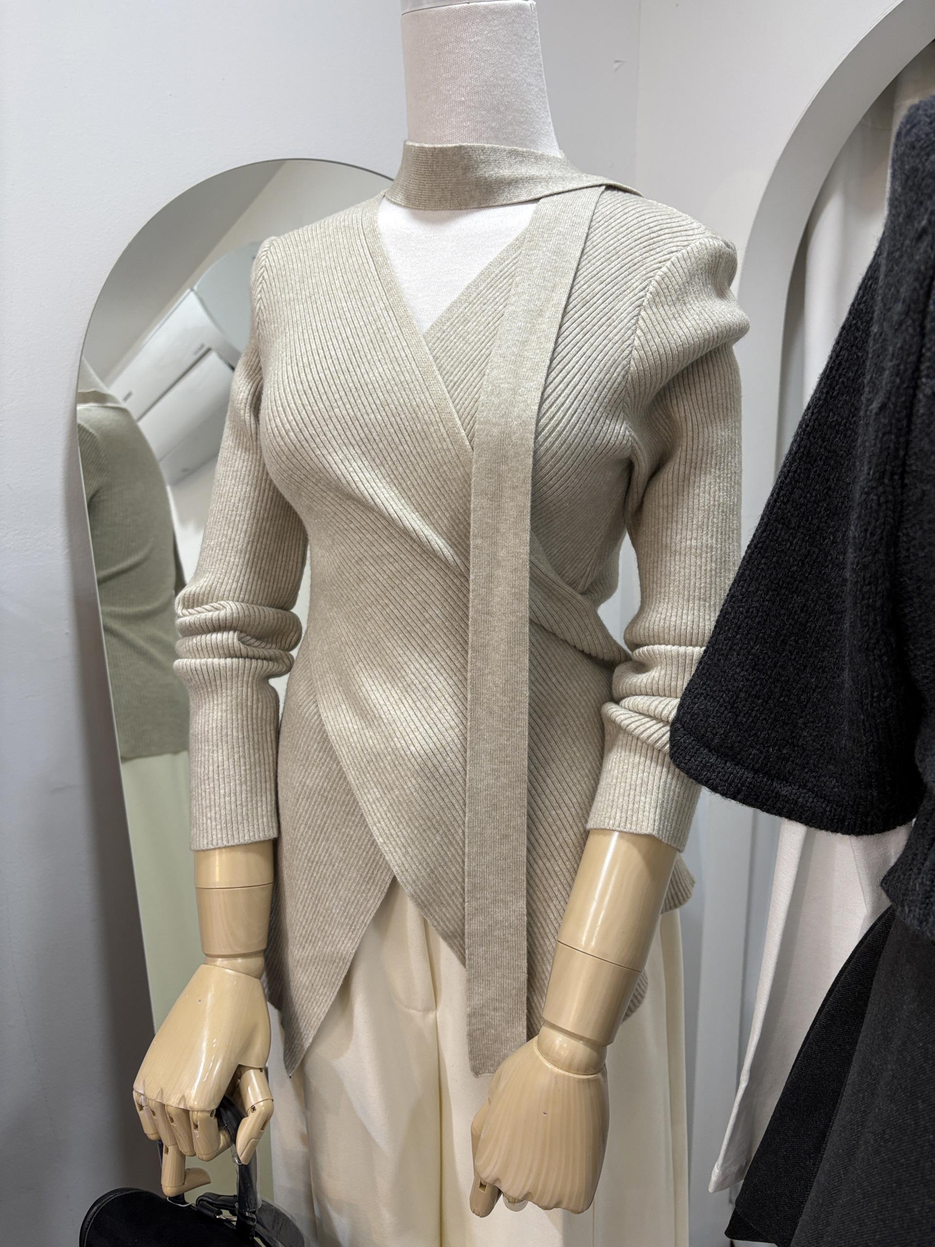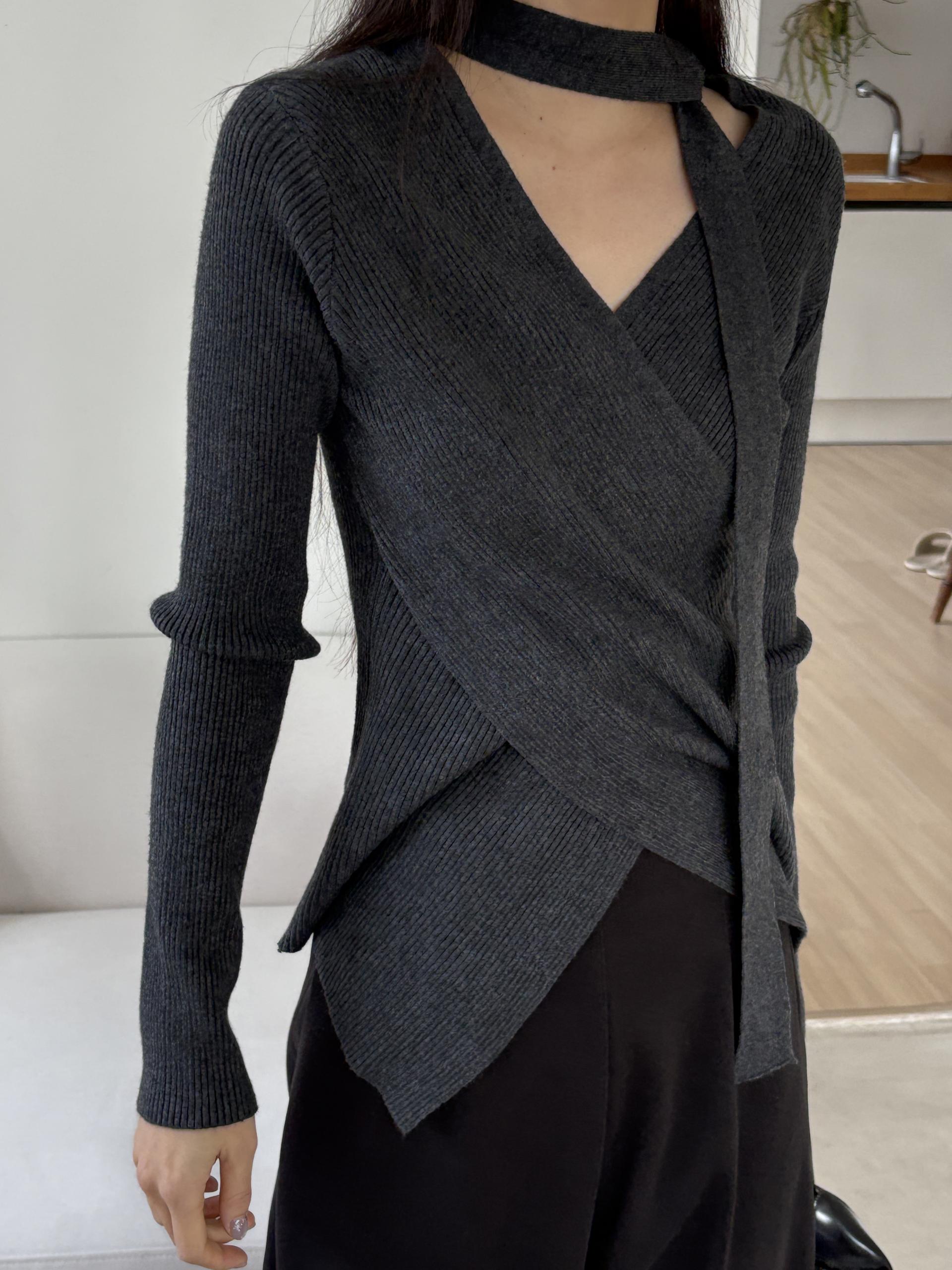 자연스러운 V넥에 초커 느낌의 롱 타이가 부착되어 얼굴선을 더욱 슬림하게 만들어주고, 세로 골지 패턴이 바디라인을 탄탄하게 정리해 더욱 날씬한 핏을 연출해요.