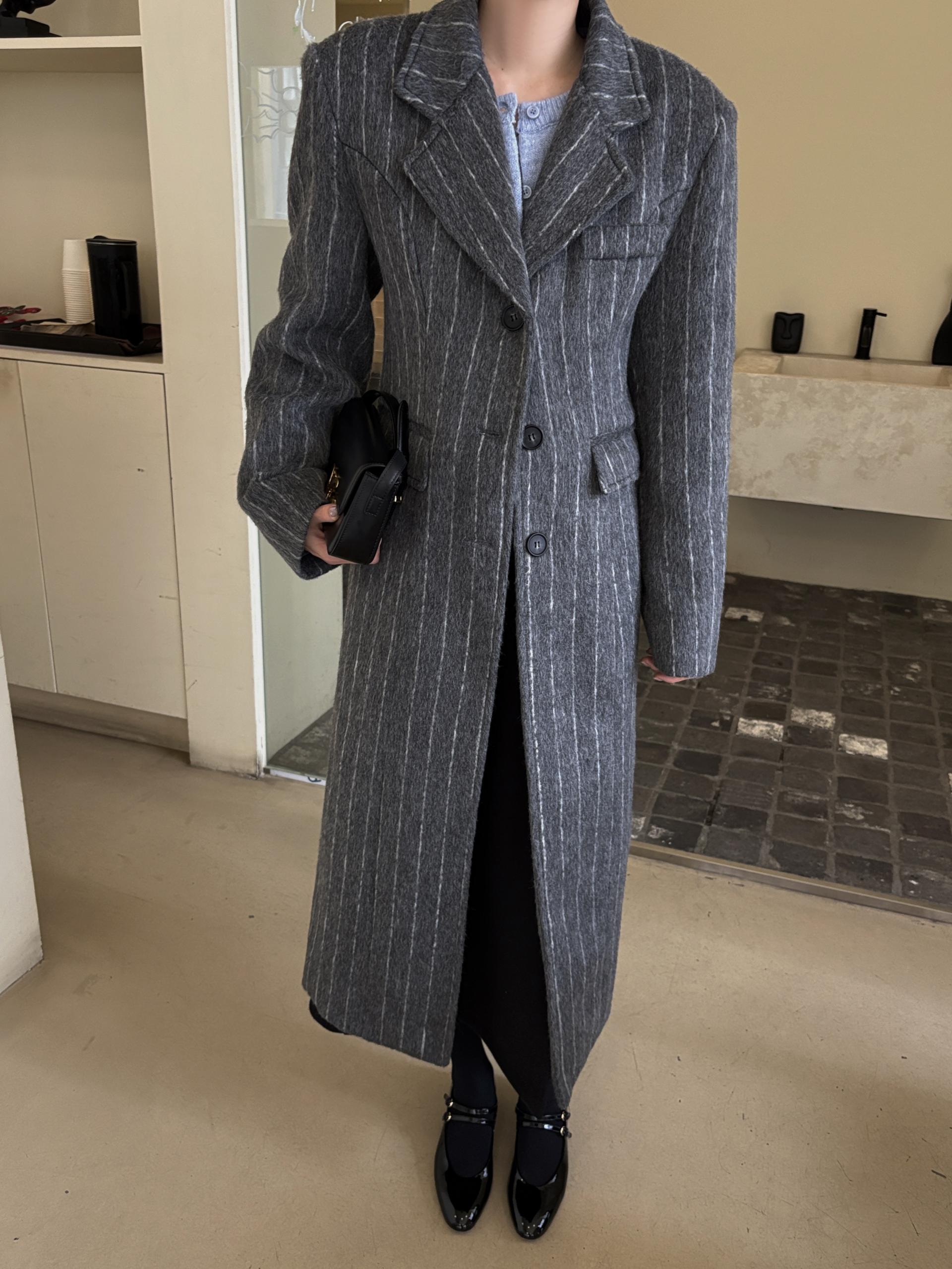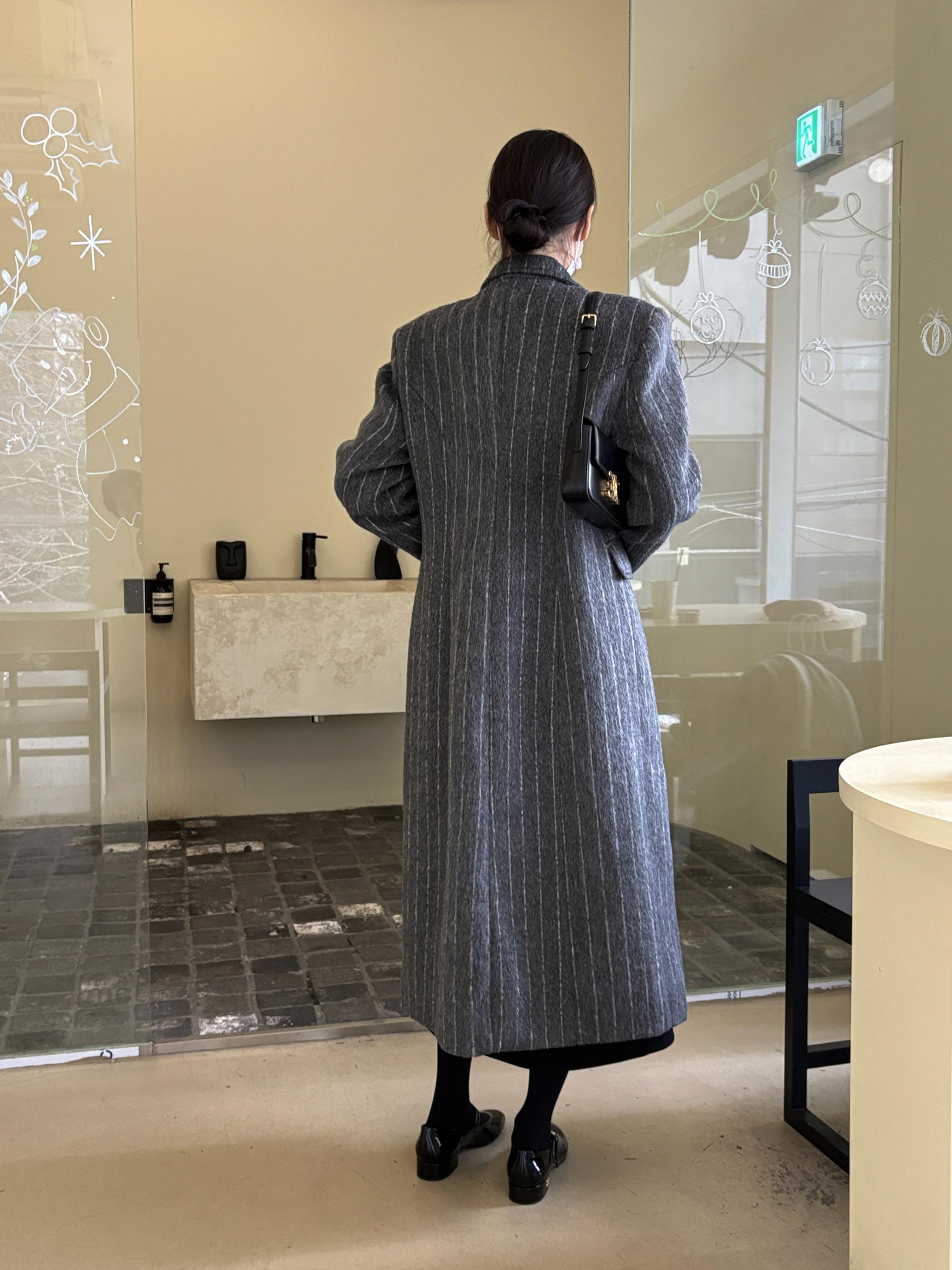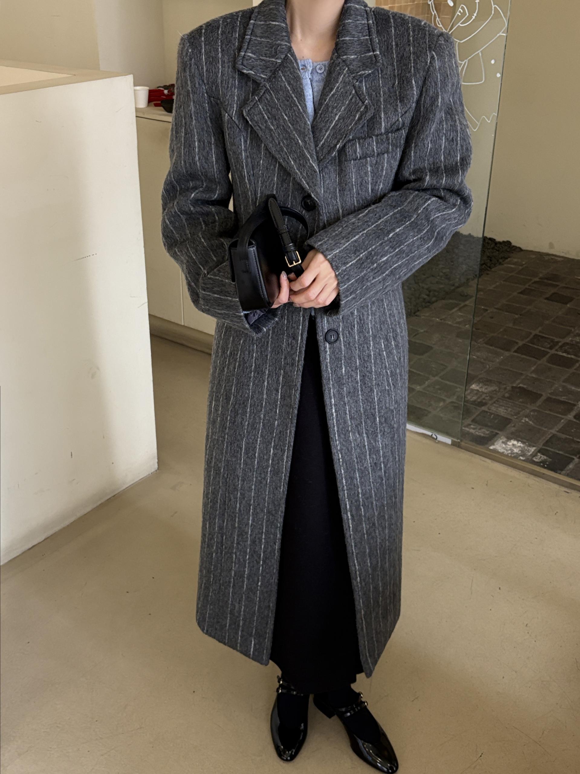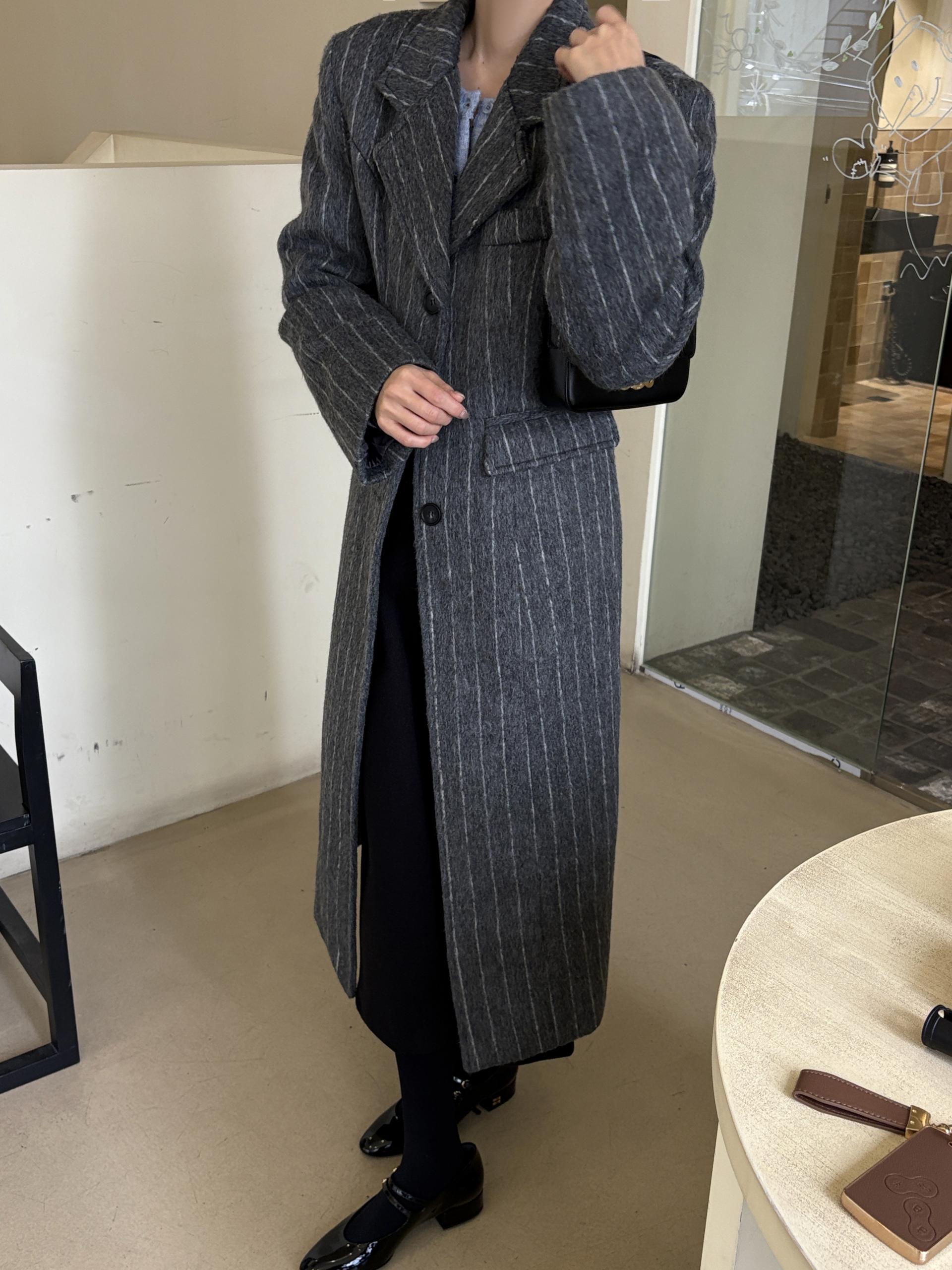 코트에는 흔하지 않게 핀스트라이프 패턴이 들어가 더욱 멋스럽고 소장 가치 높은 맥시 롱 코트입니다.
