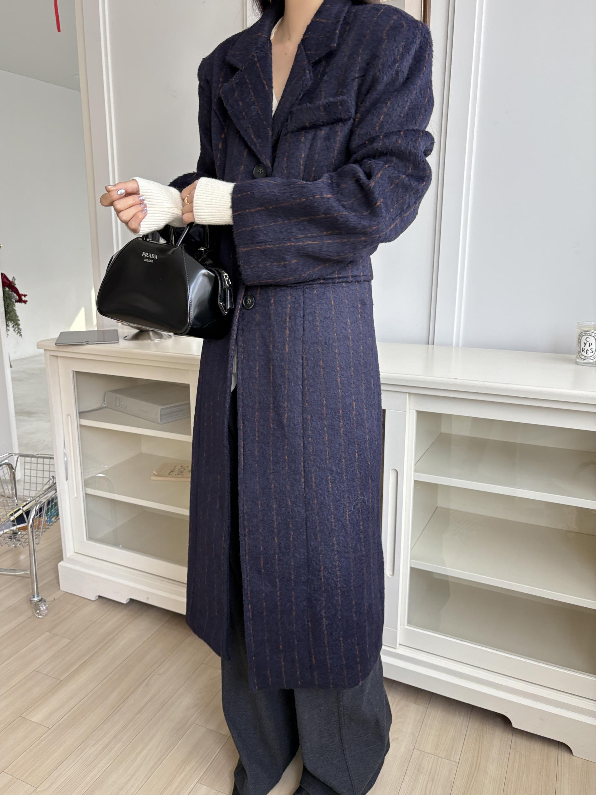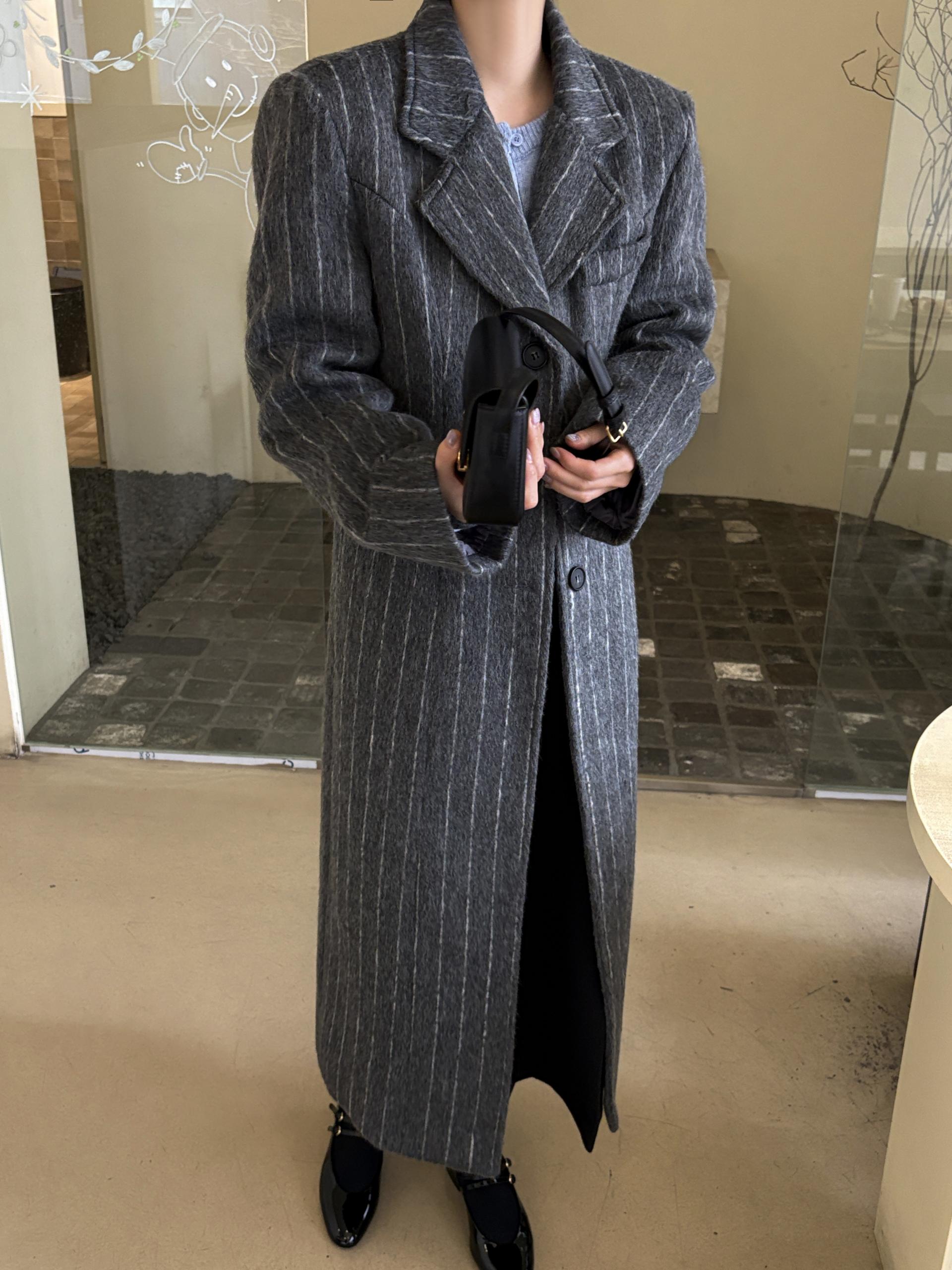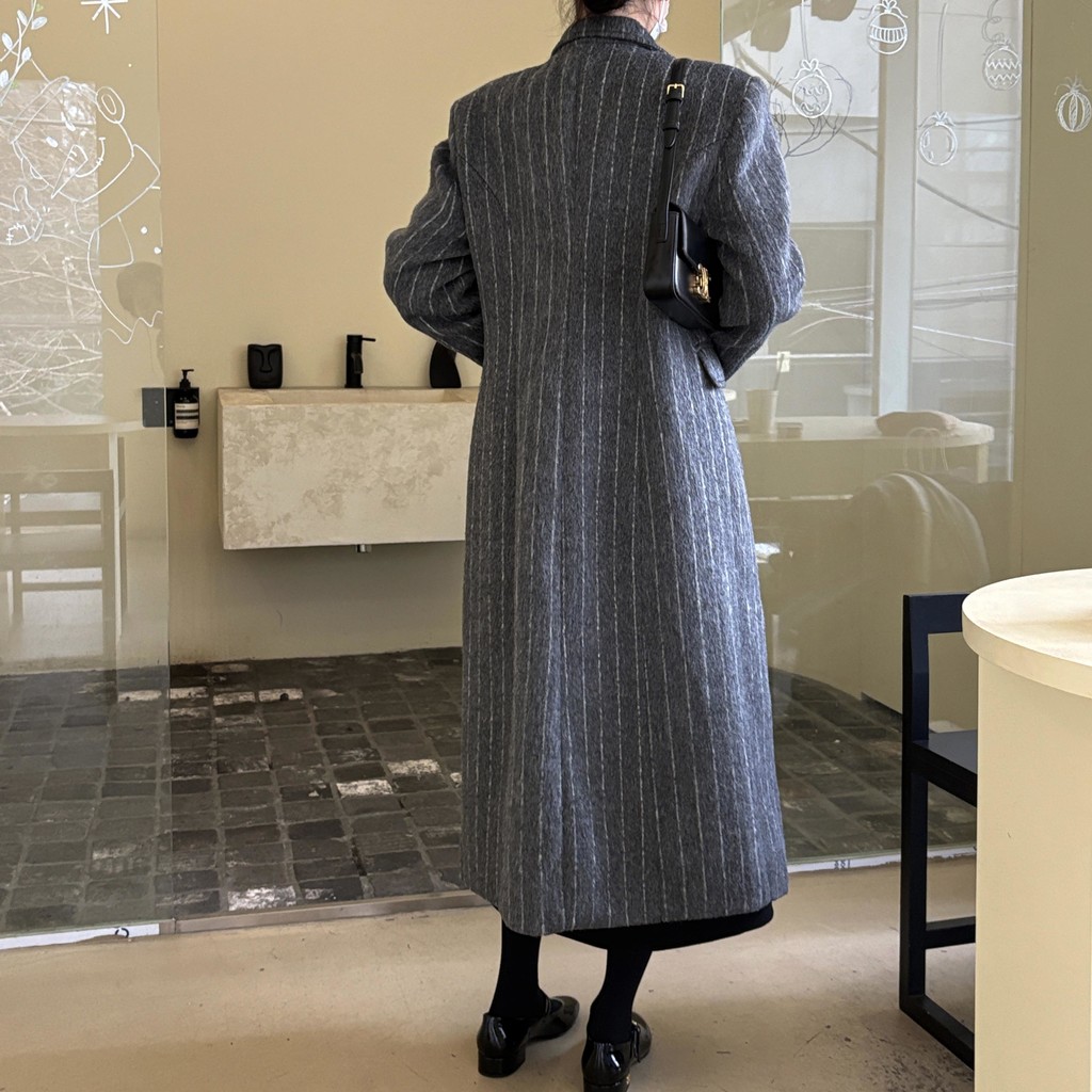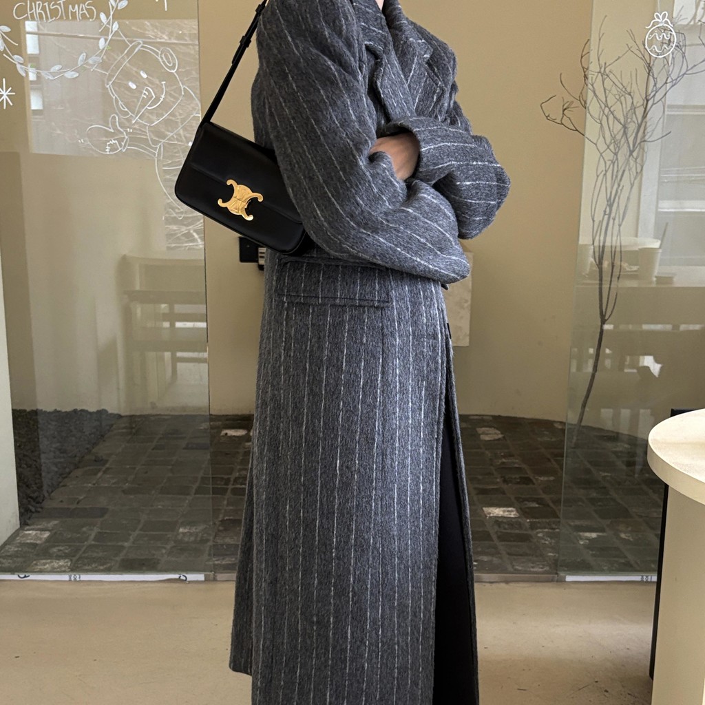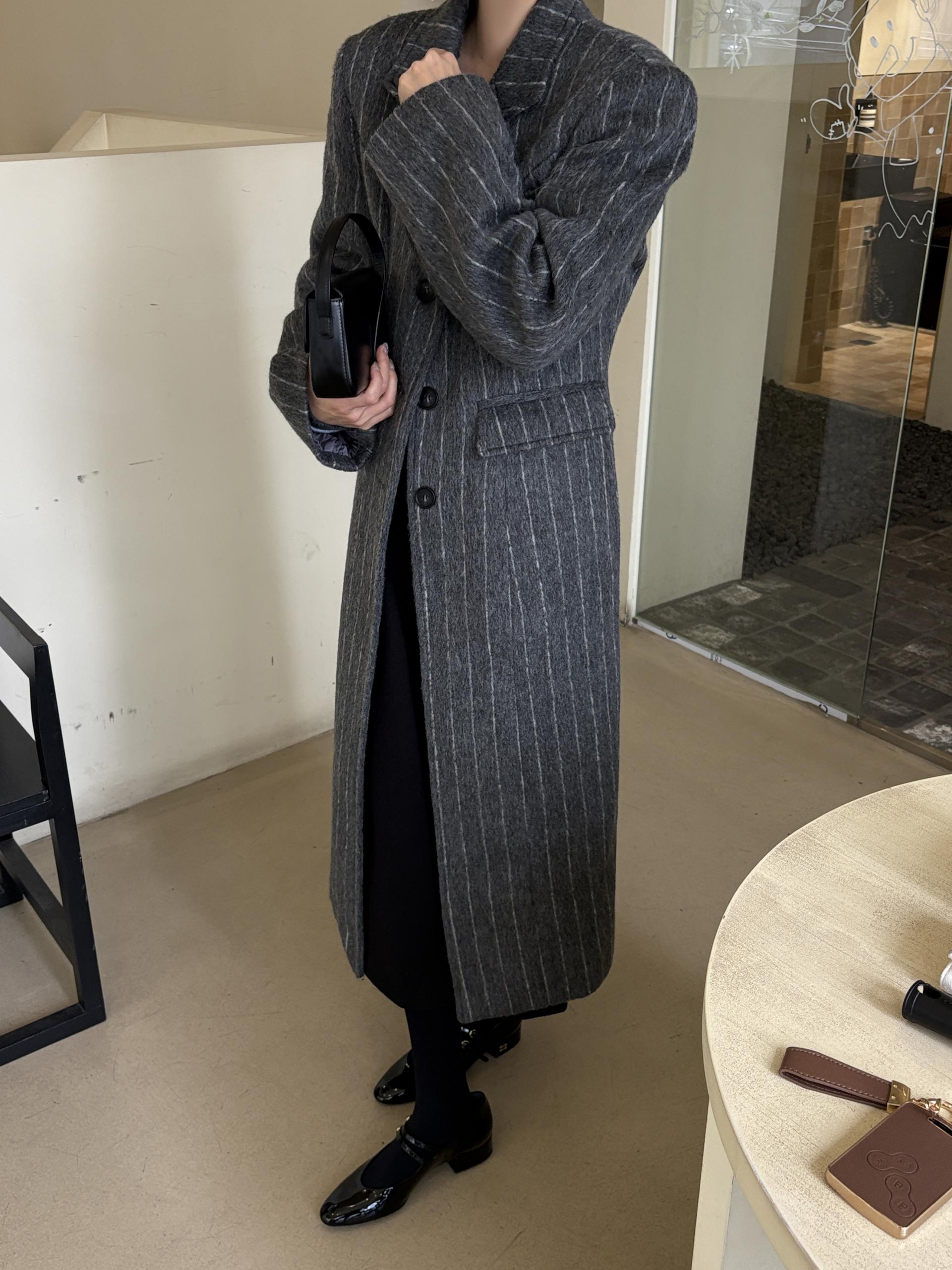 코트에는 흔하지 않게 핀스트라이프 패턴이 들어가 더욱 멋스럽고 소장 가치 높은 맥시 롱 코트입니다.