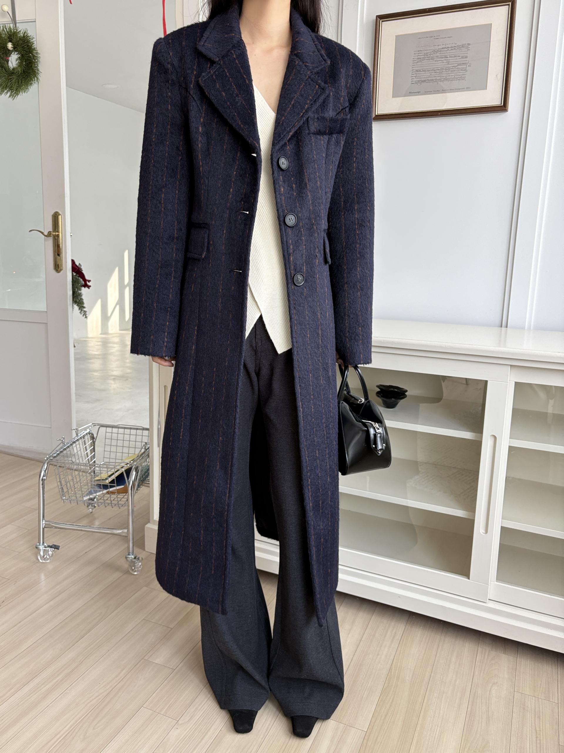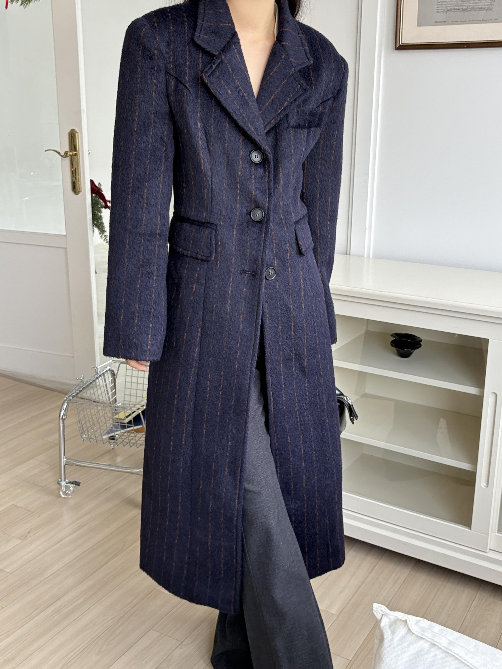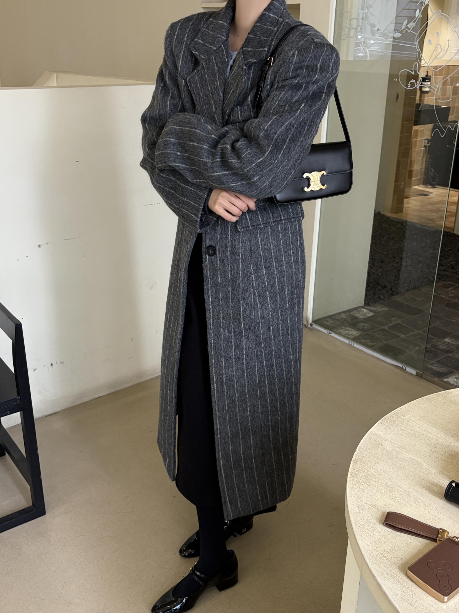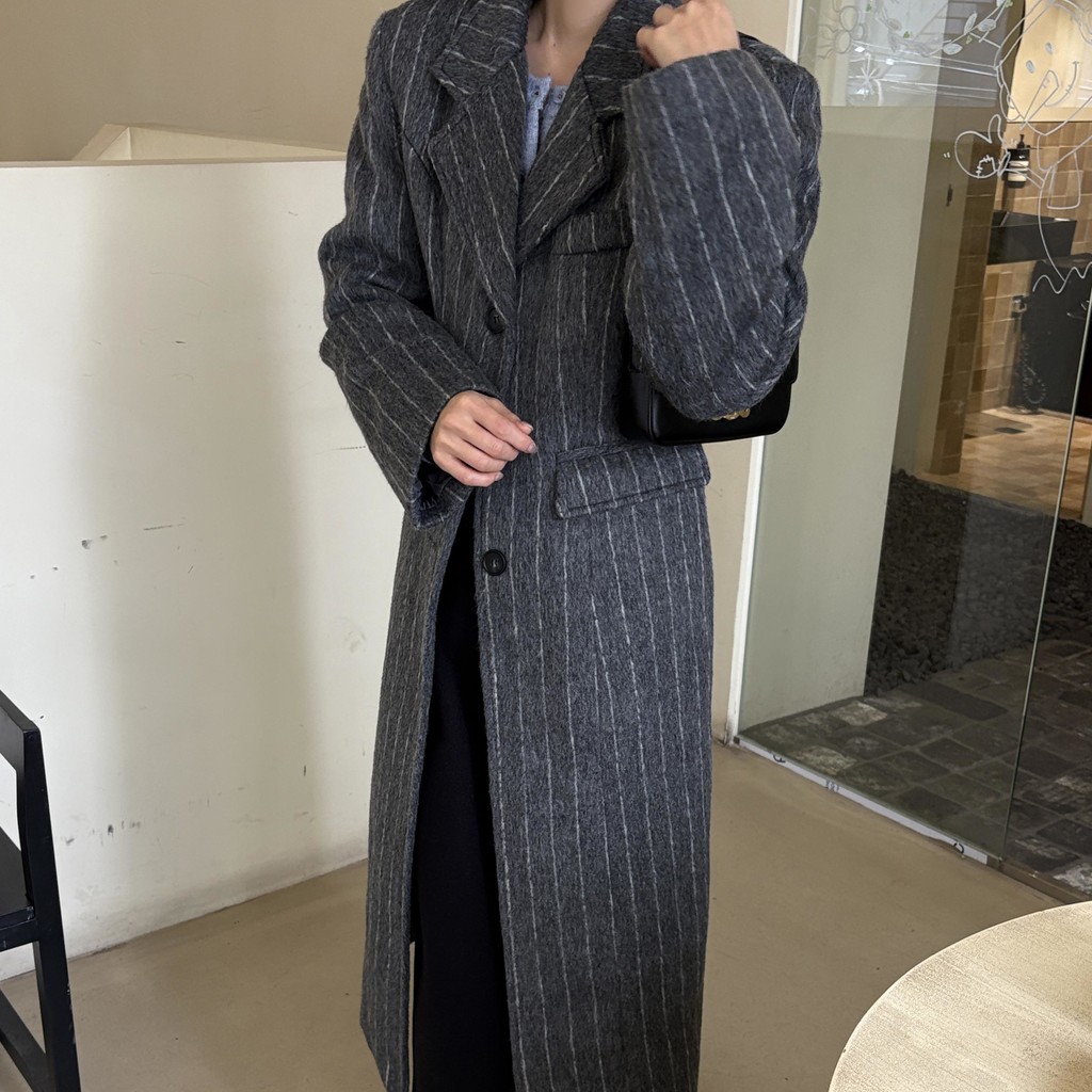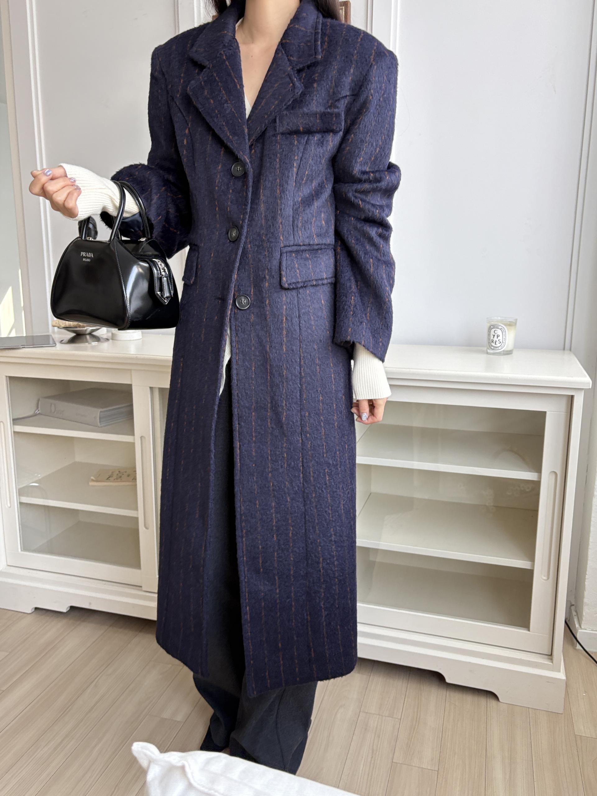 코트에는 흔하지 않게 핀스트라이프 패턴이 들어가 더욱 멋스럽고 소장 가치 높은 맥시 롱 코트입니다.