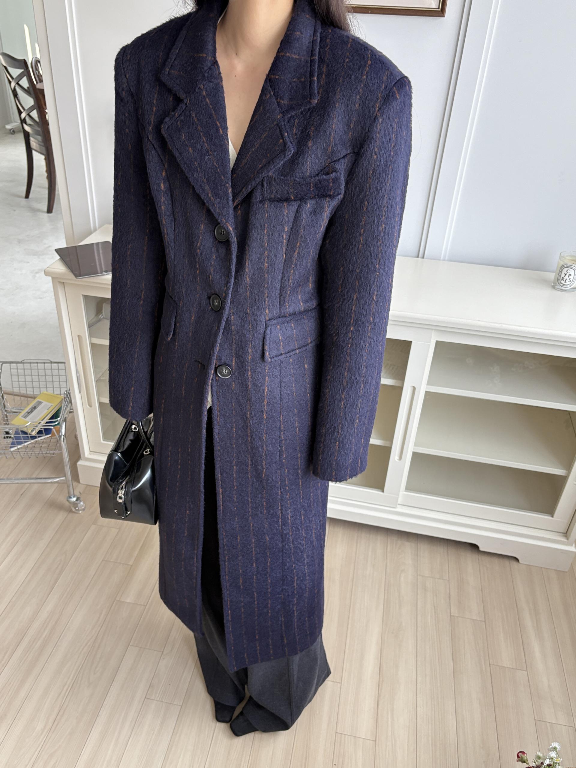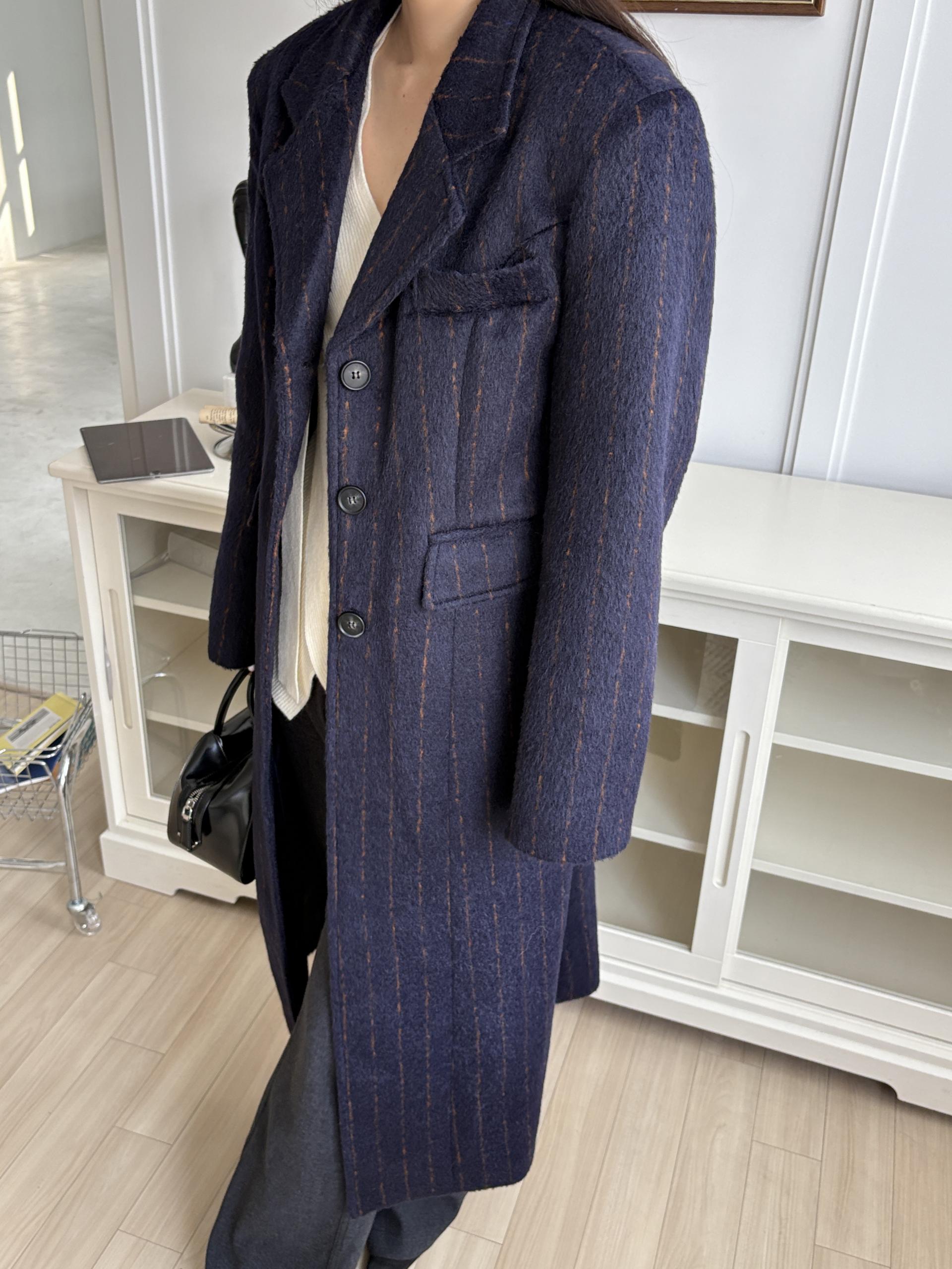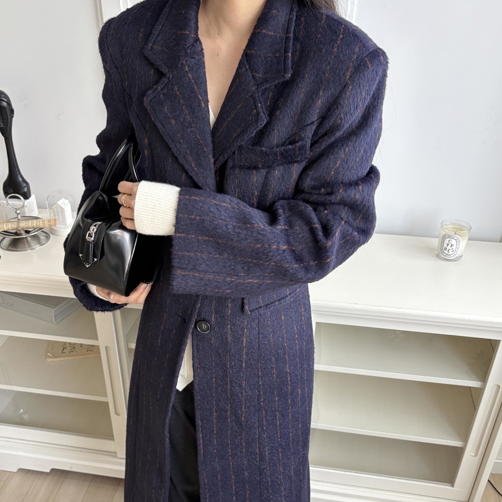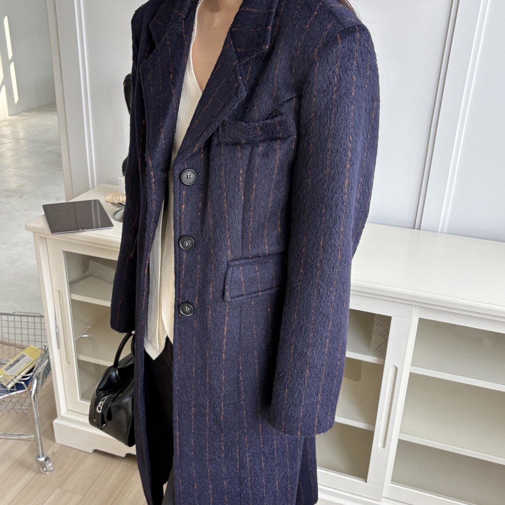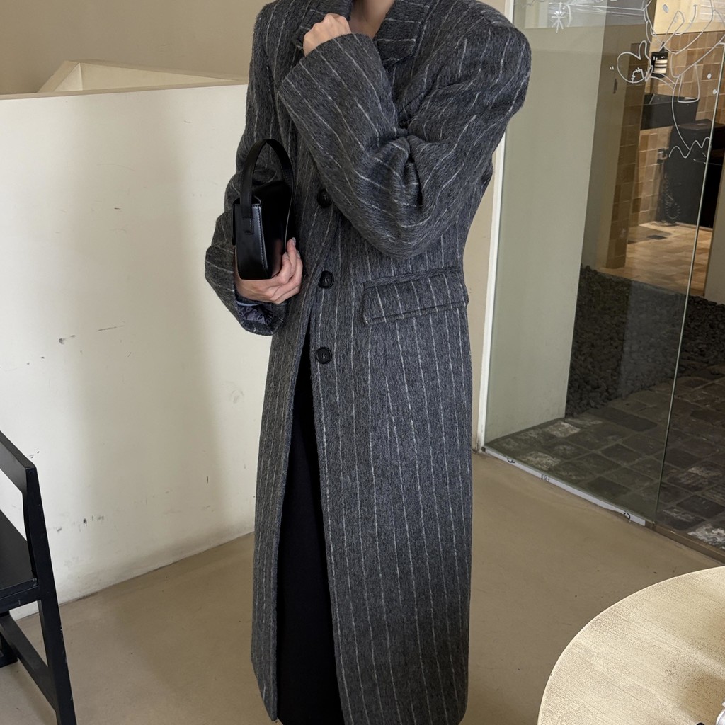 코트에는 흔하지 않게 핀스트라이프 패턴이 들어가 더욱 멋스럽고 소장 가치 높은 맥시 롱 코트입니다.