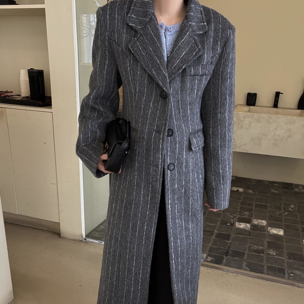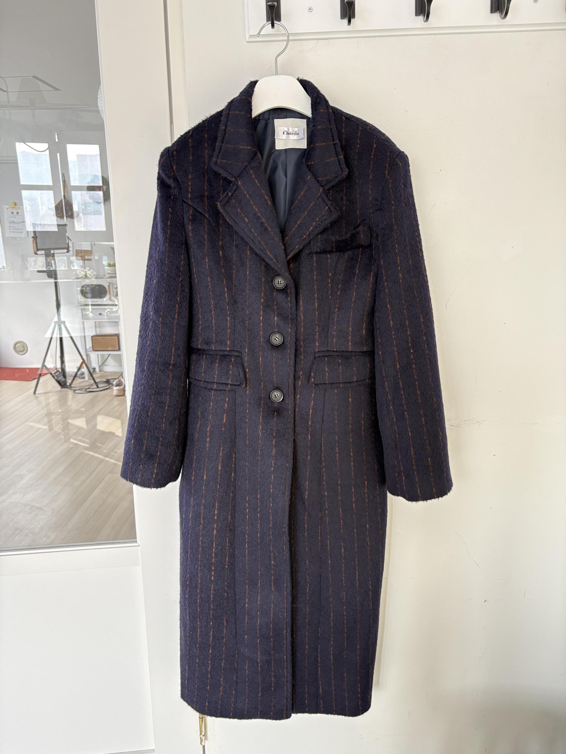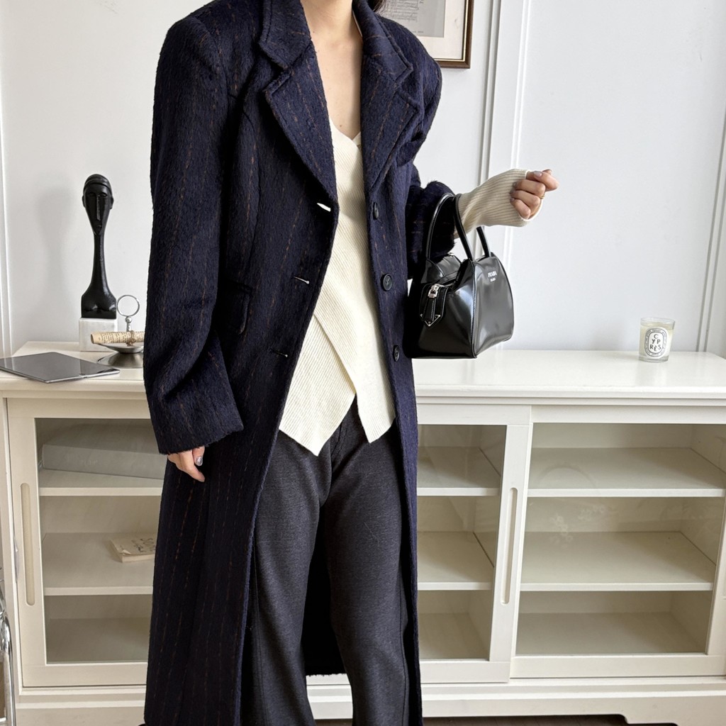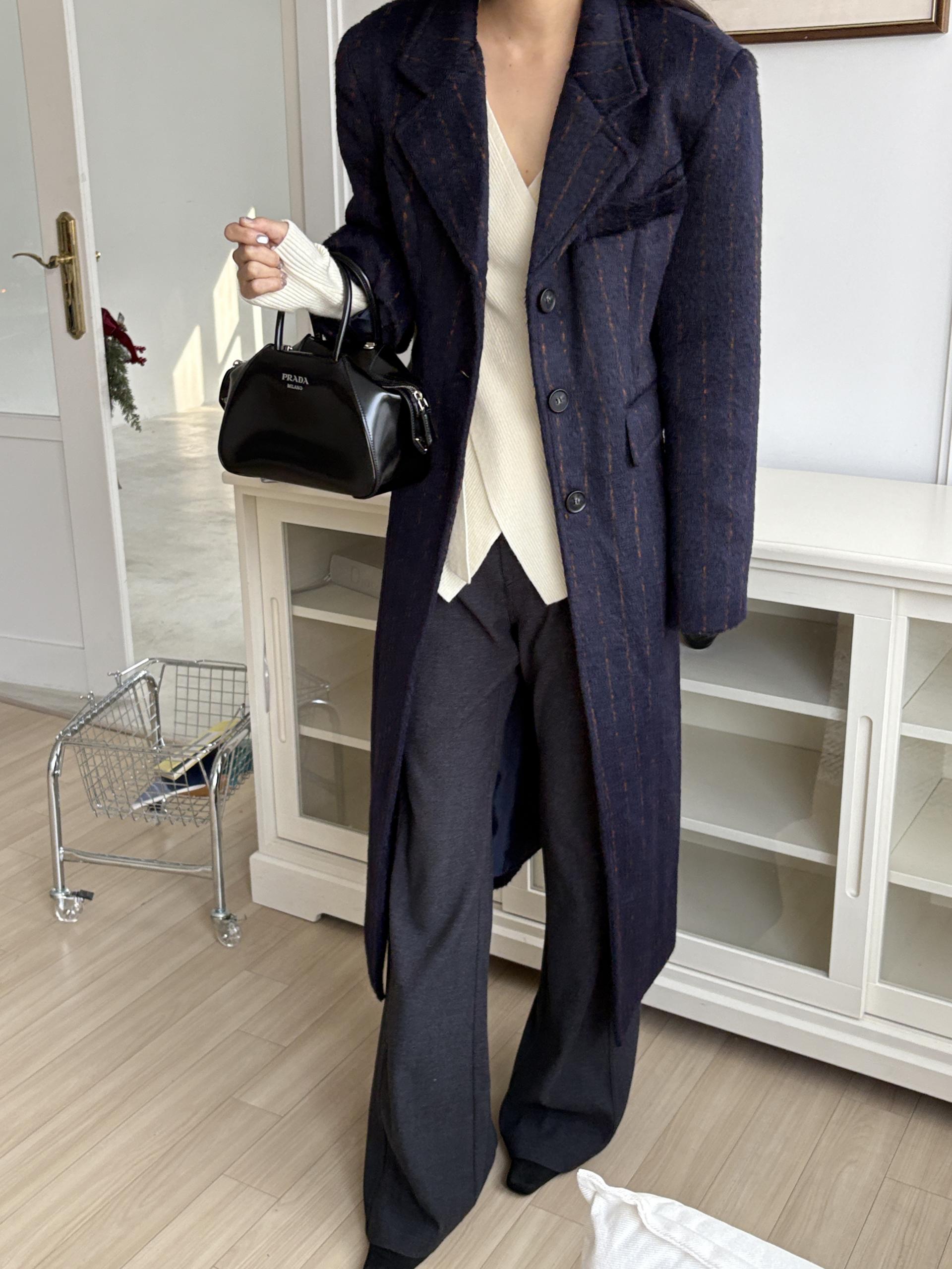코트에는 흔하지 않게 핀스트라이프 패턴이 들어가 더욱 멋스럽고 소장 가치 높은 맥시 롱 코트입니다.