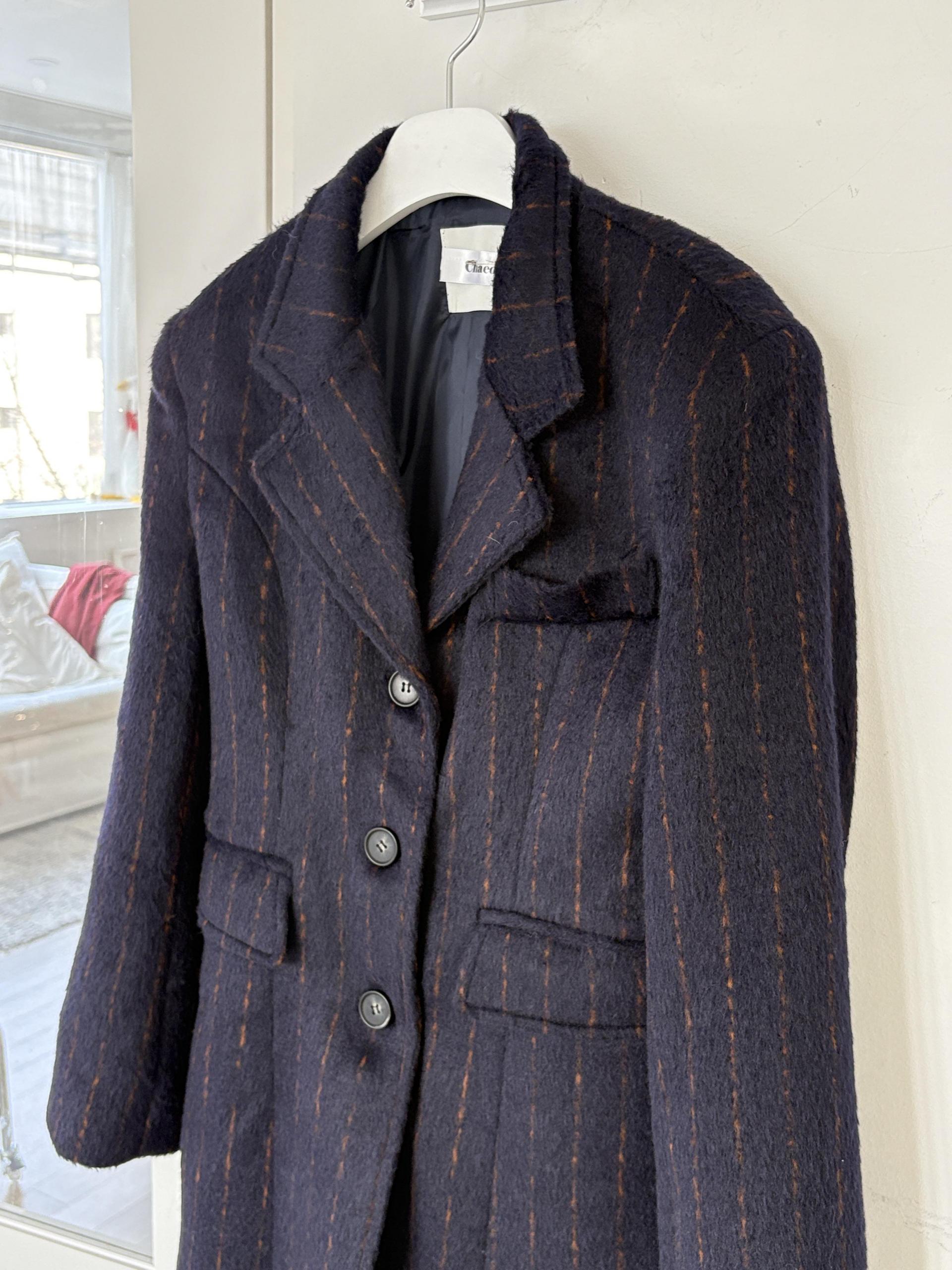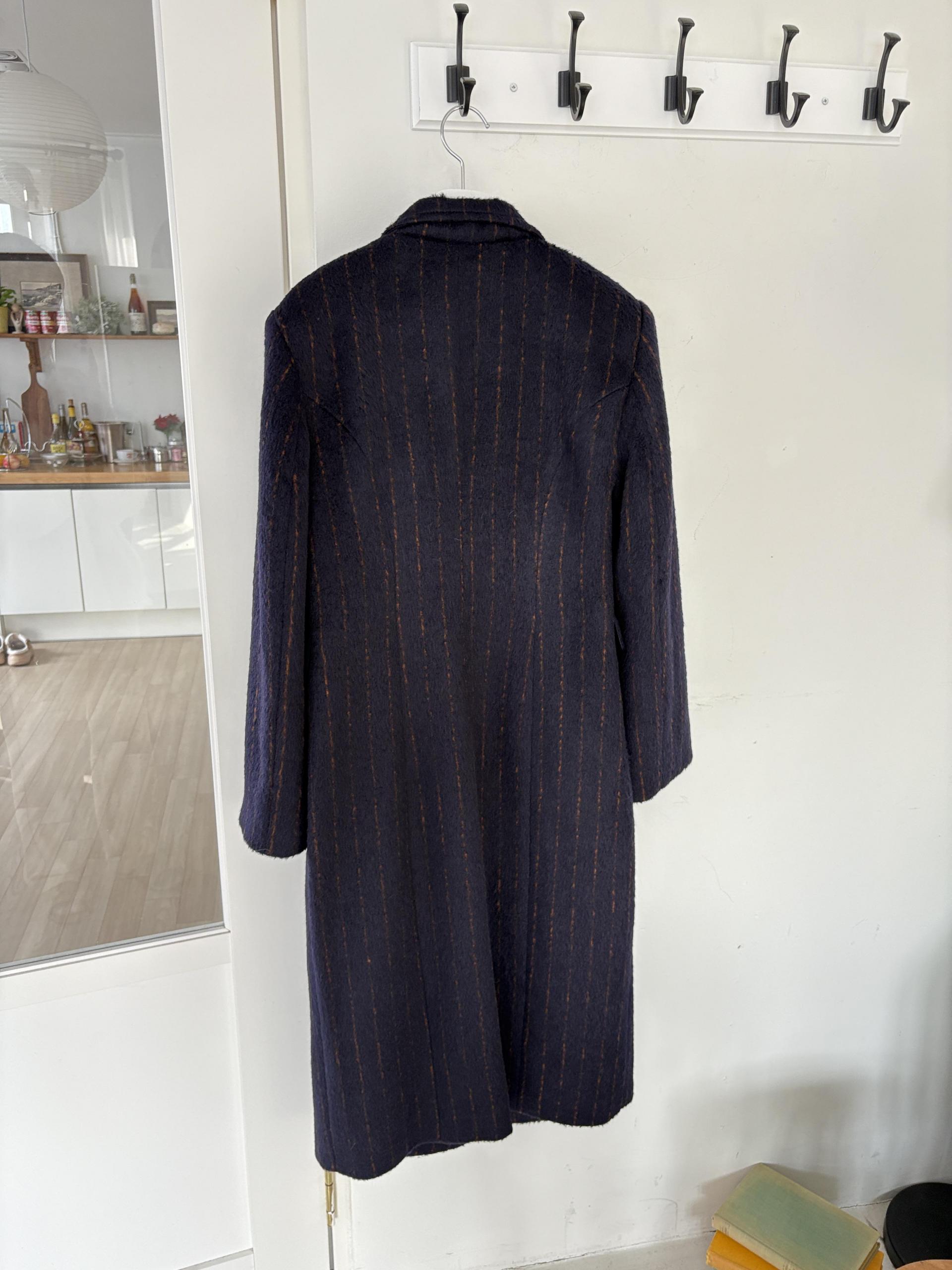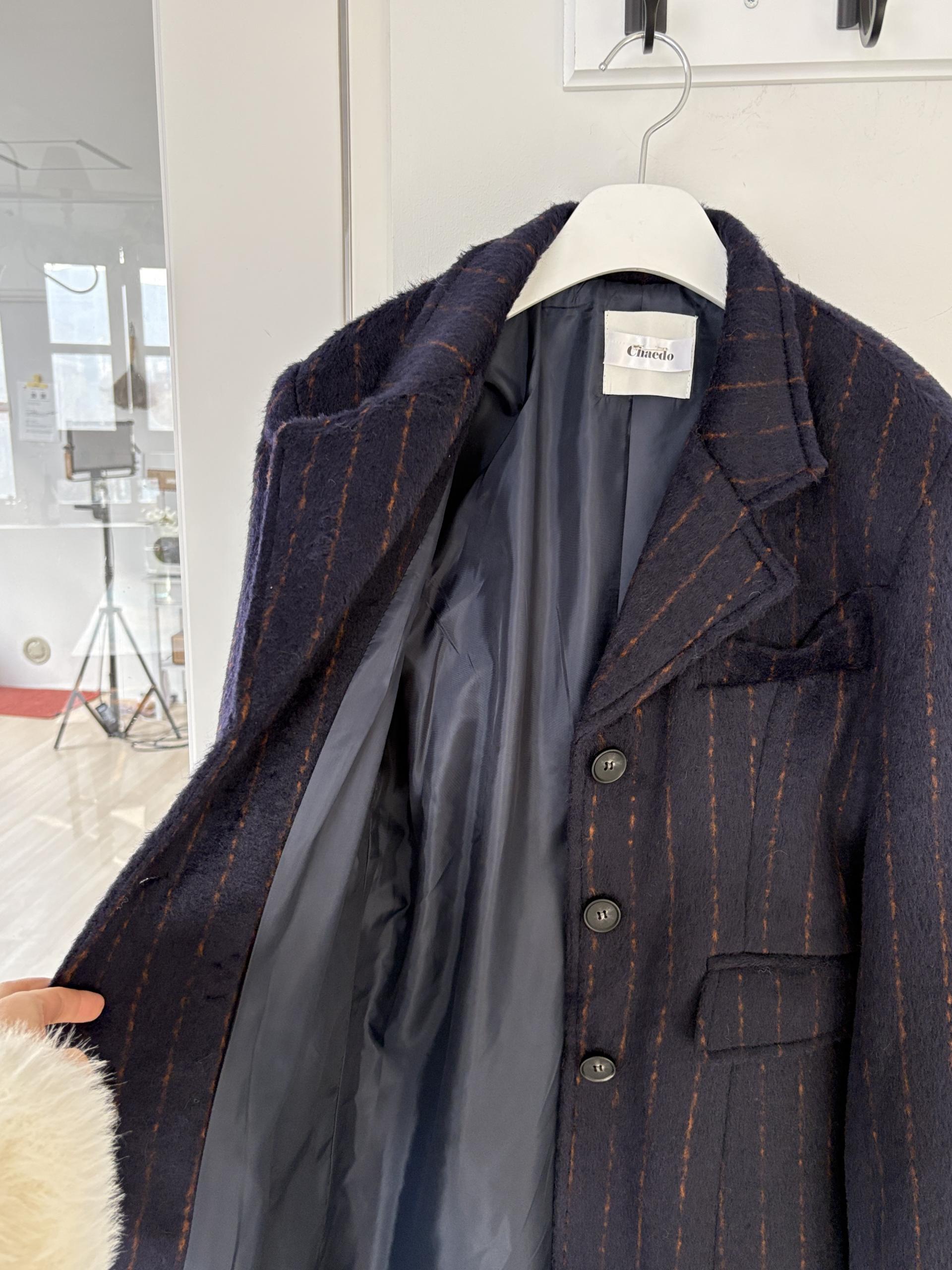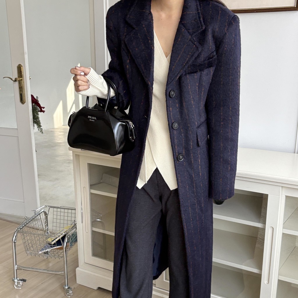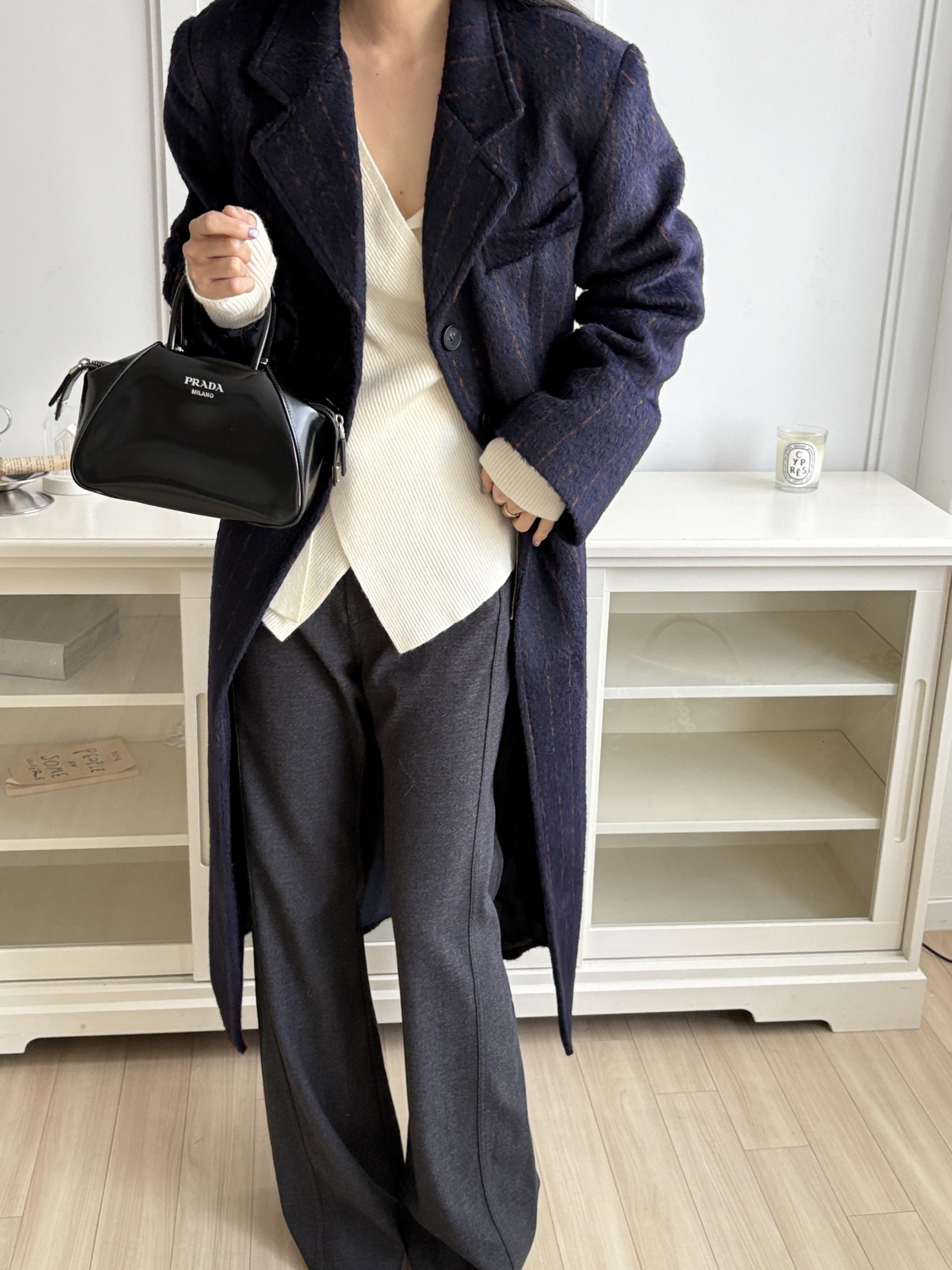 코트에는 흔하지 않게 핀스트라이프 패턴이 들어가 더욱 멋스럽고 소장 가치 높은 맥시 롱 코트입니다.