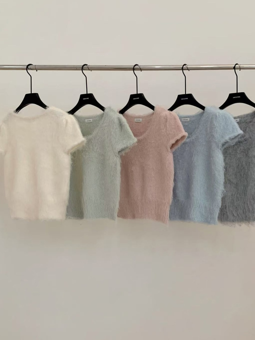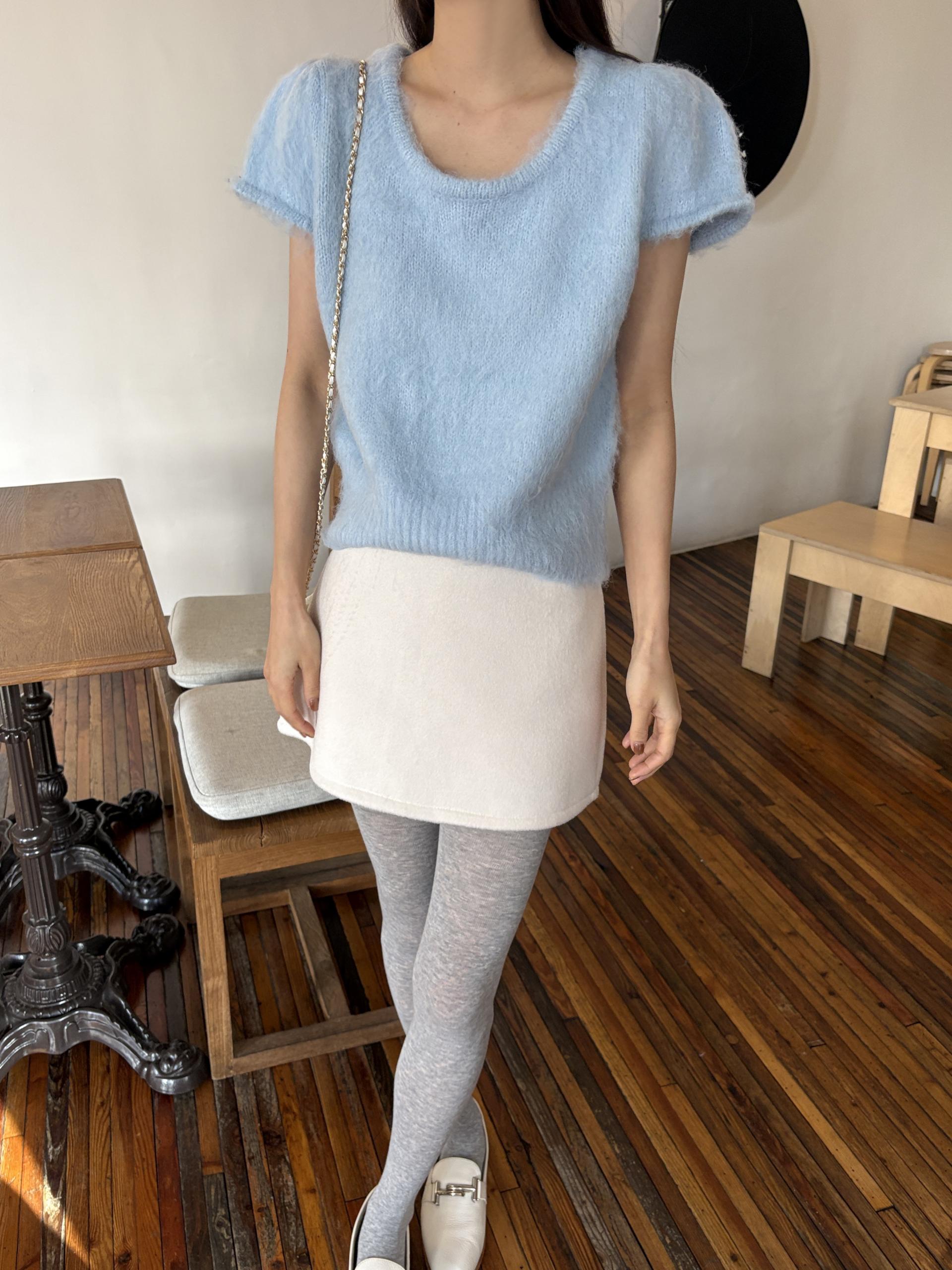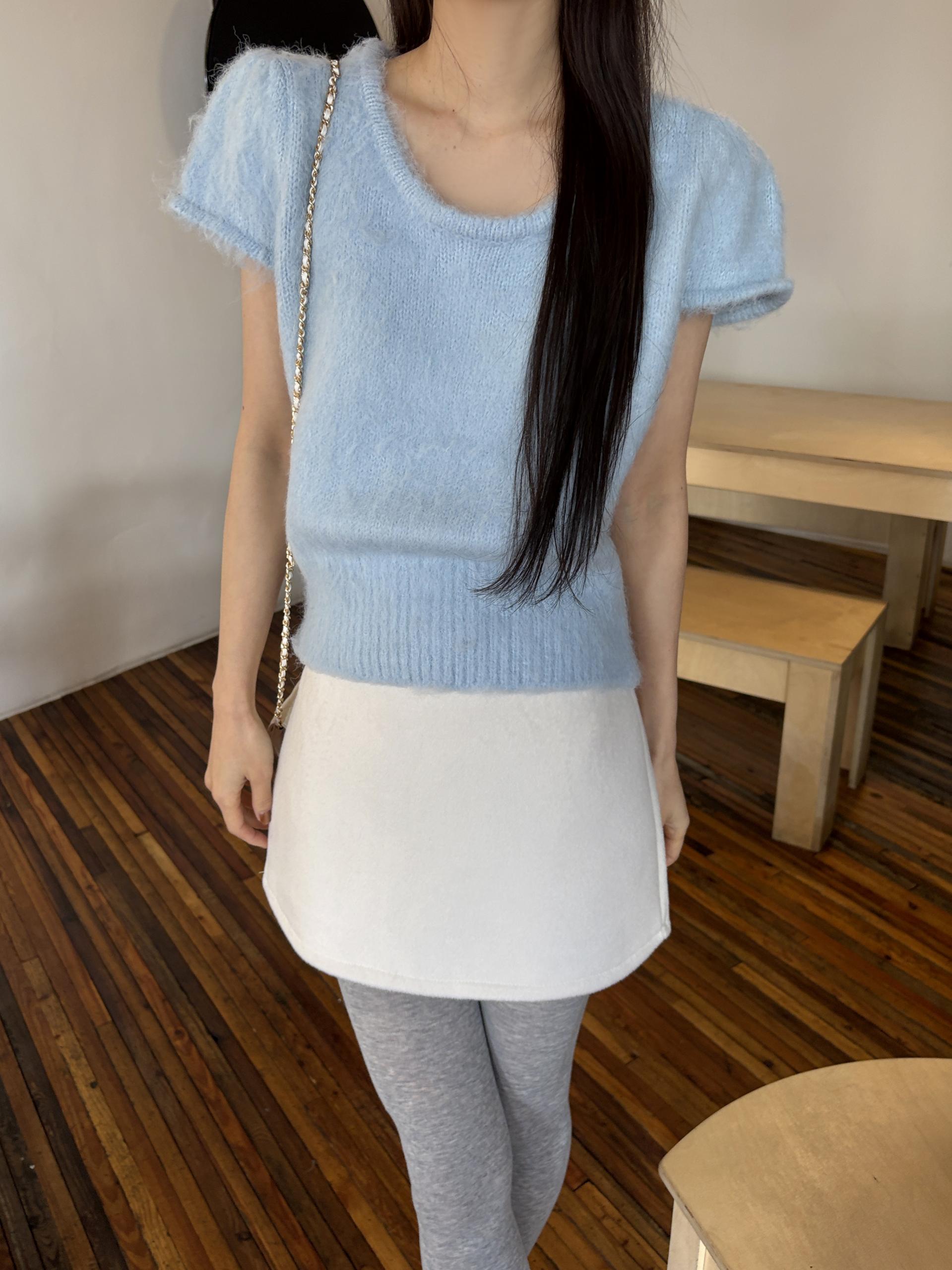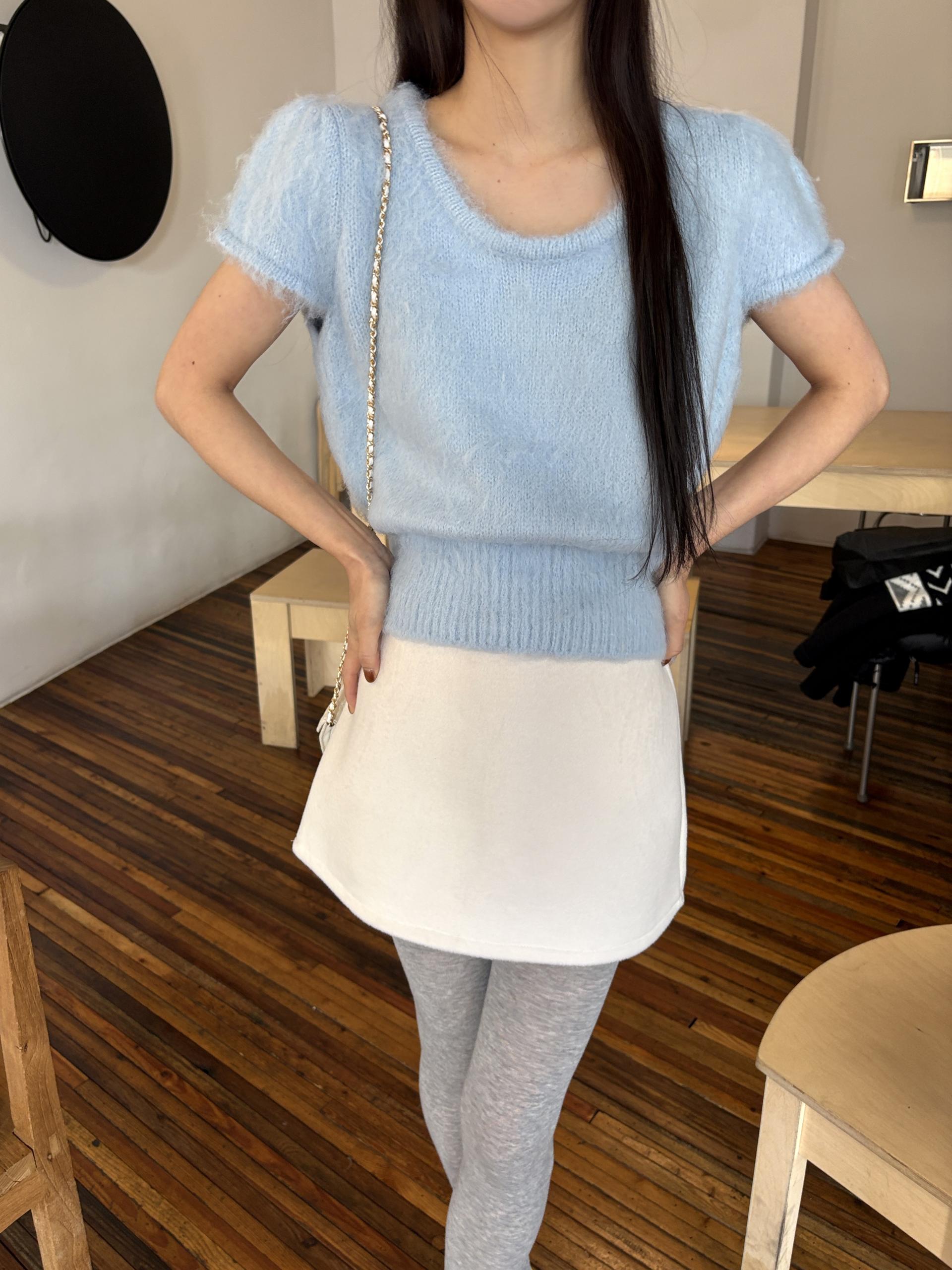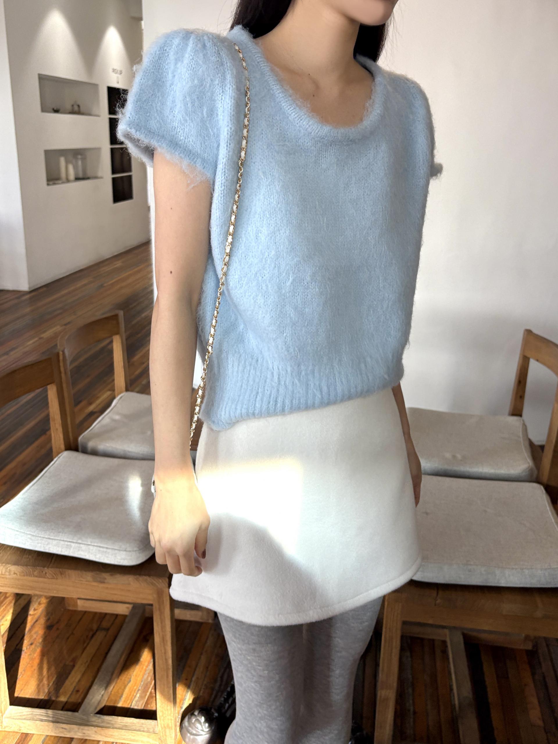 보송하게 결이 살아있는 헤어리 텍스처가 매력적인 반팔 니트입니다.