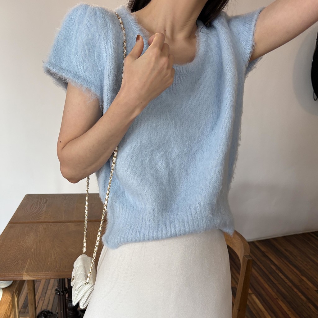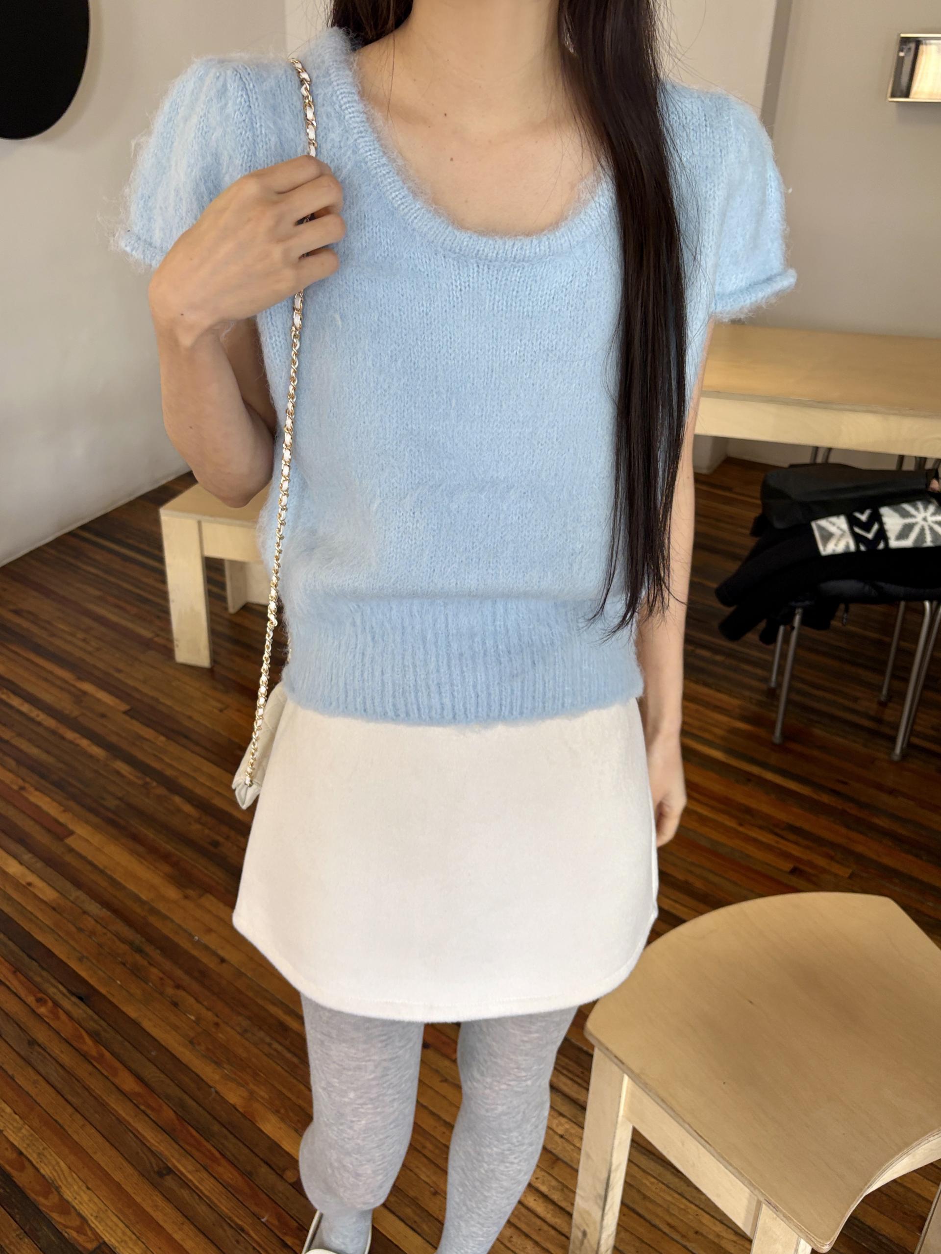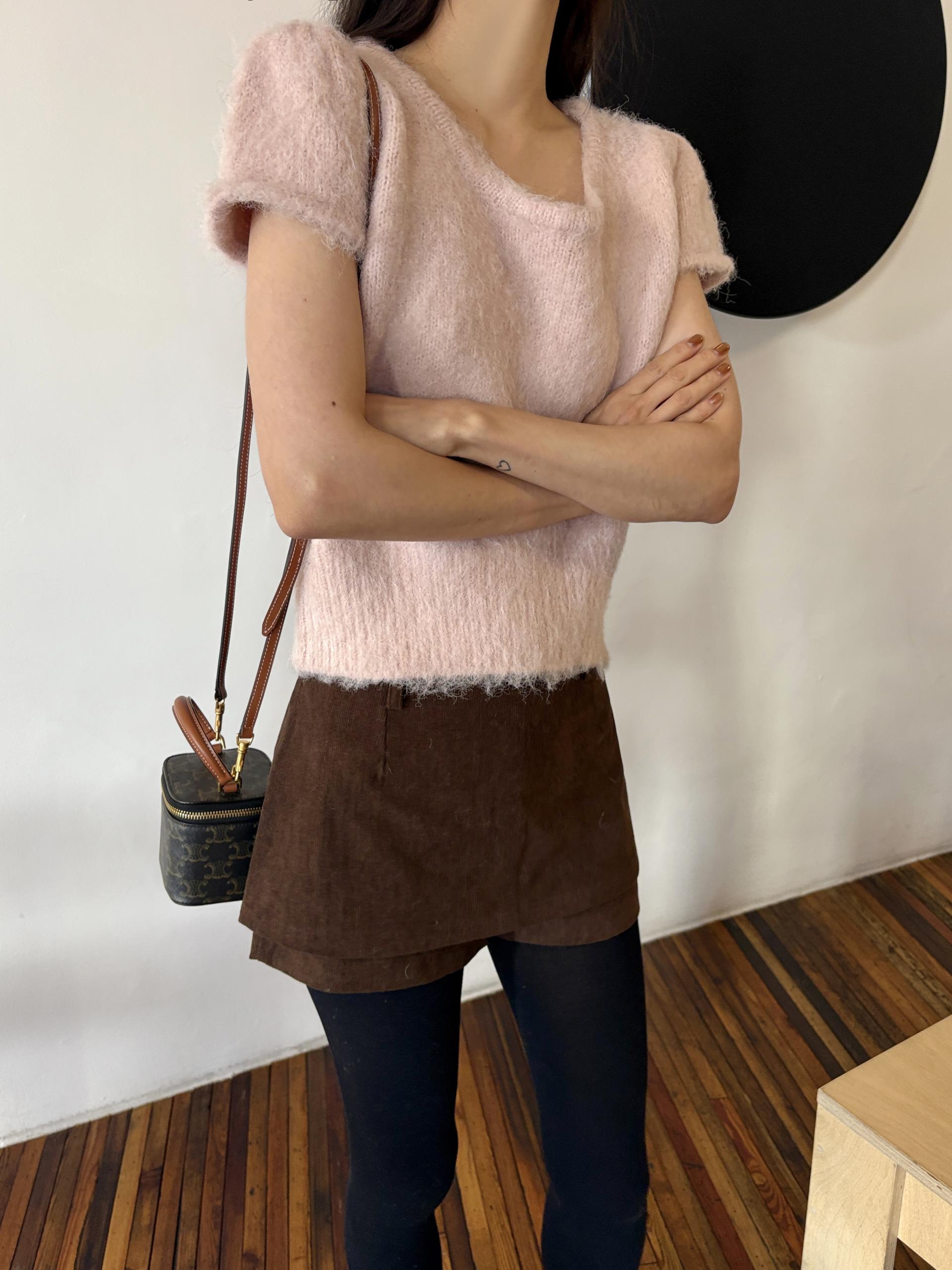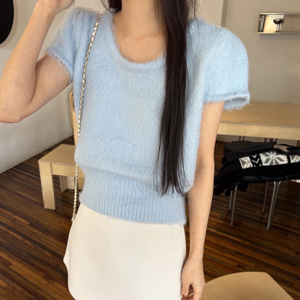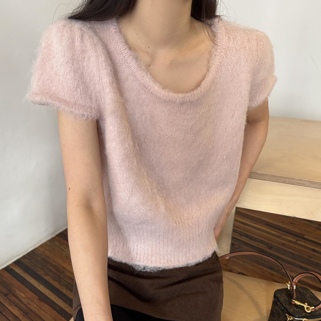 보송하게 결이 살아있는 헤어리 텍스처가 매력적인 반팔 니트입니다.