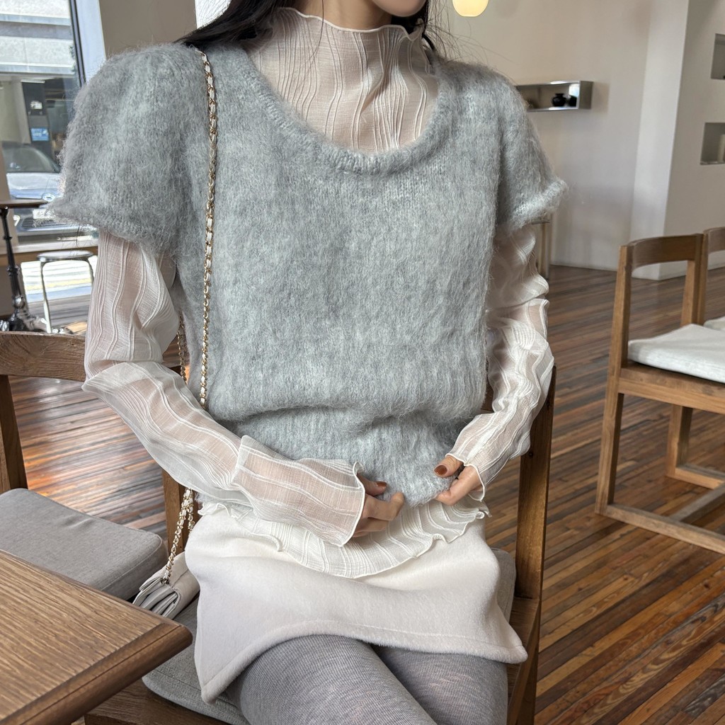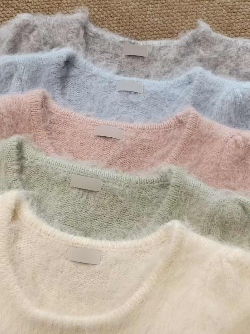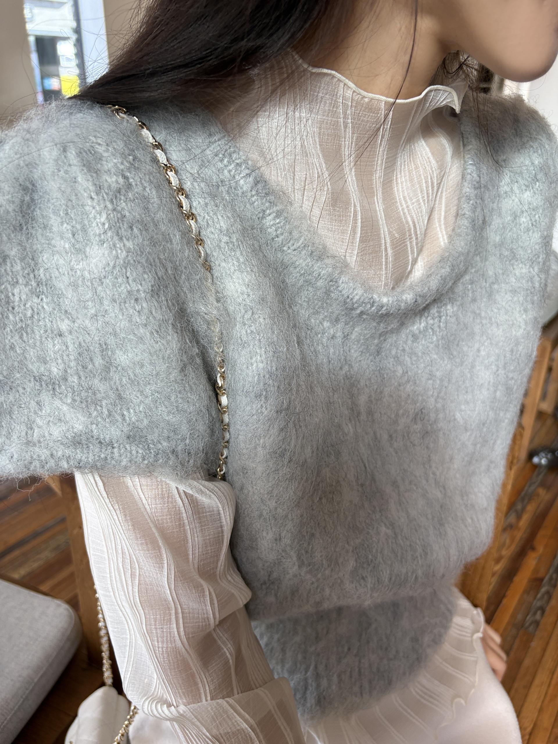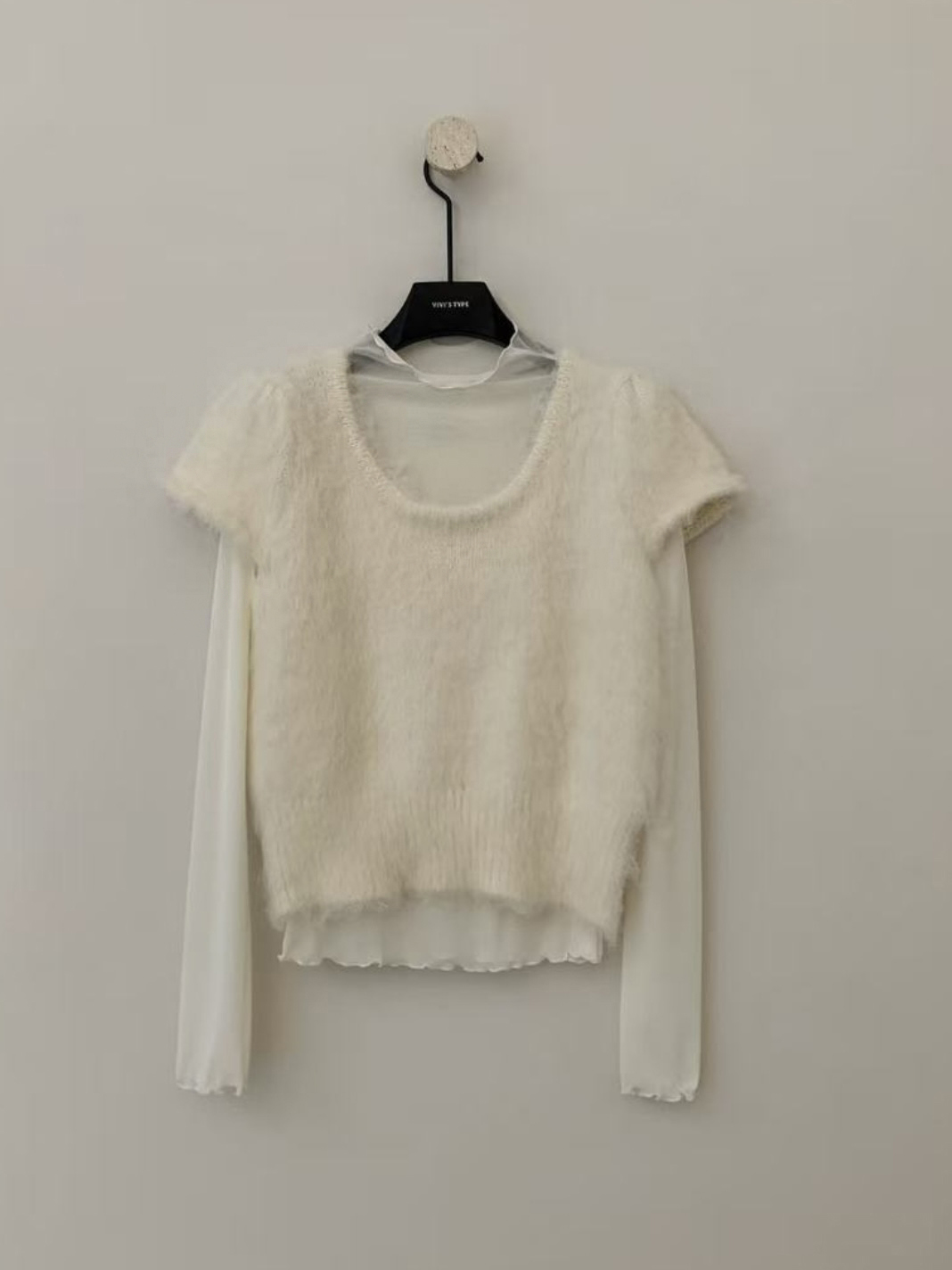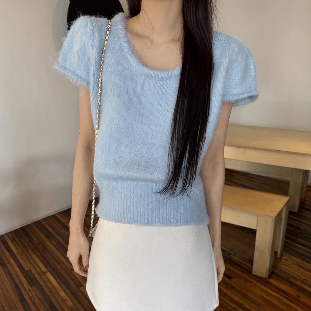 보송하게 결이 살아있는 헤어리 텍스처가 매력적인 반팔 니트입니다.
