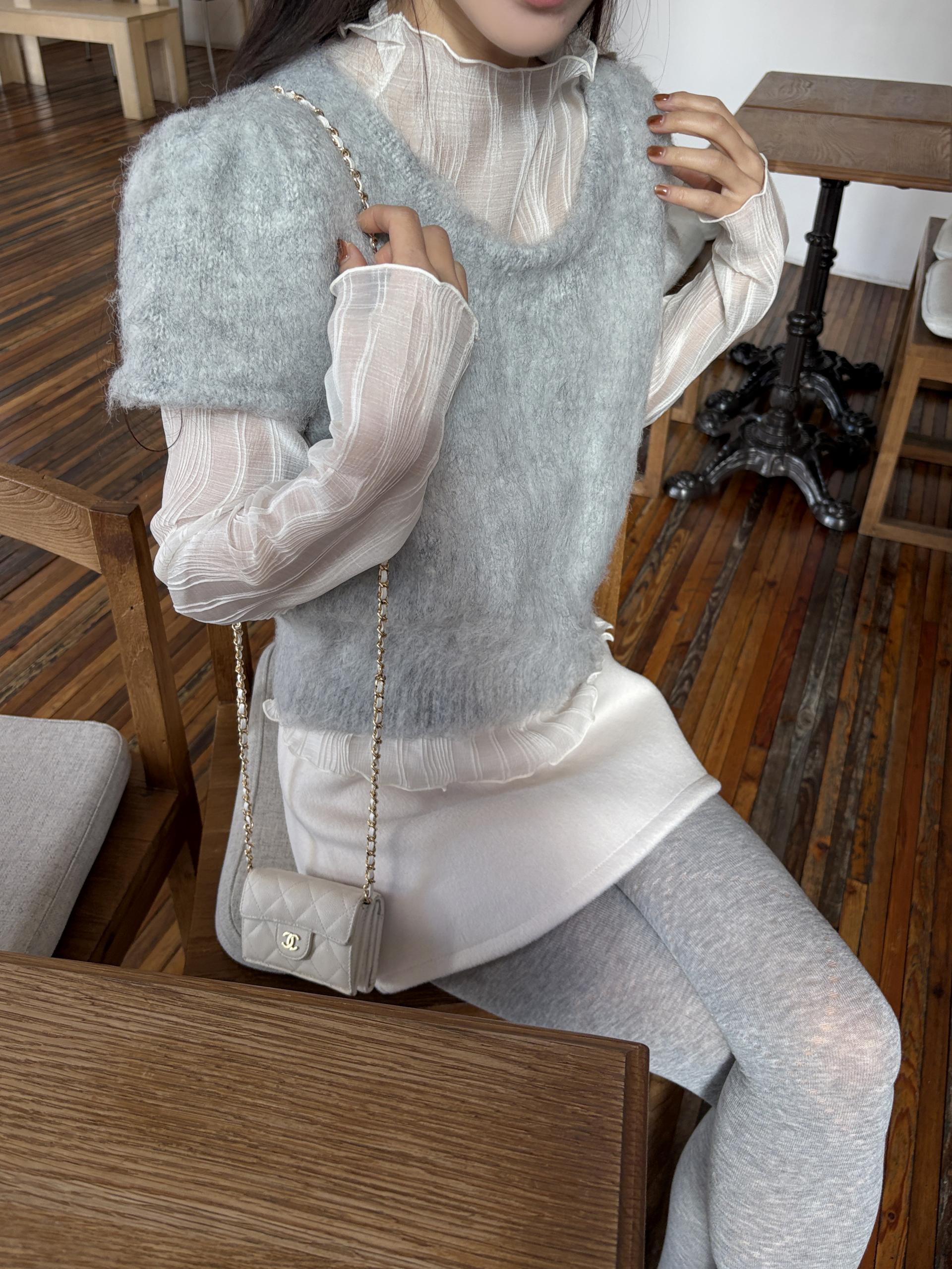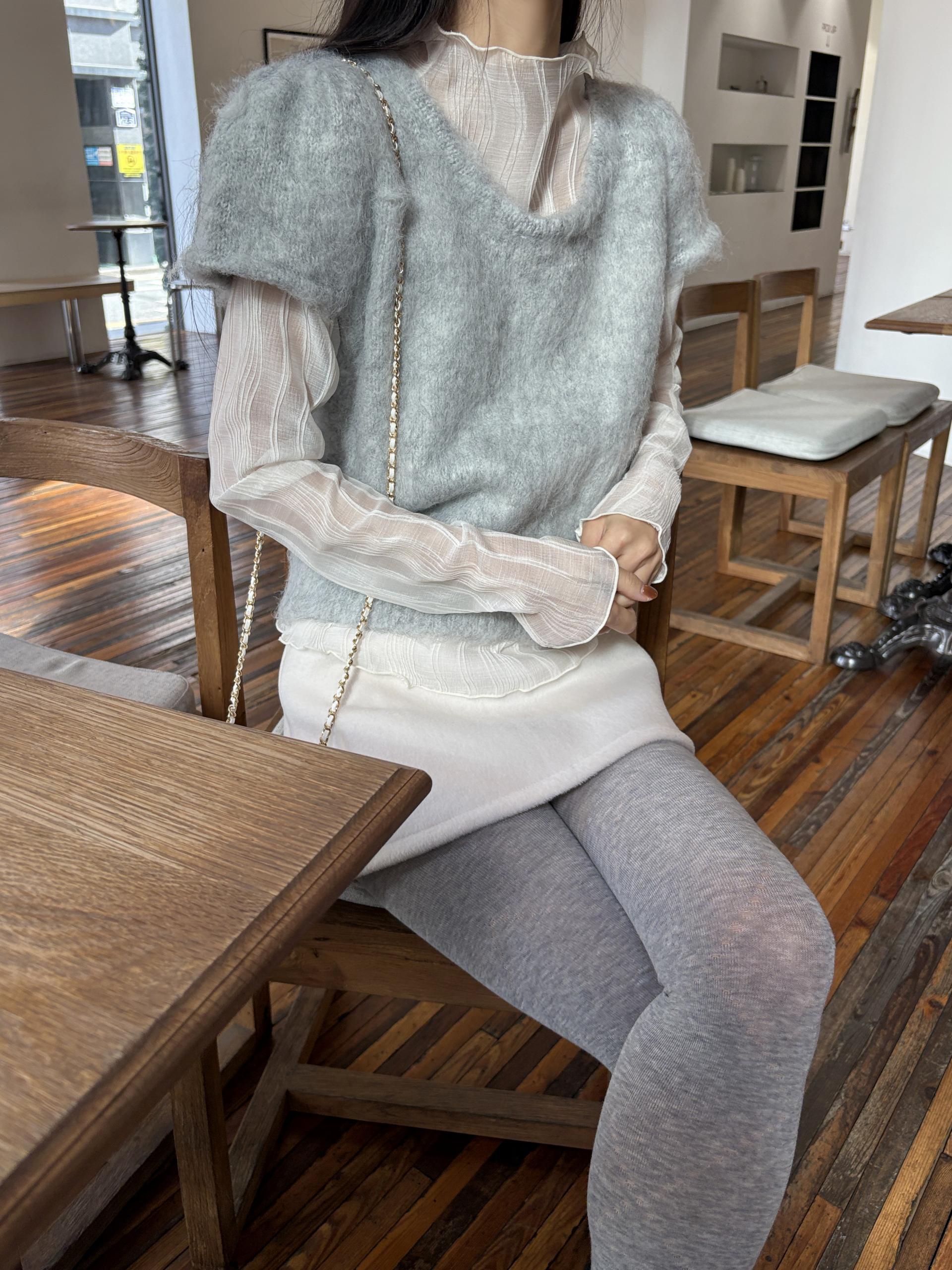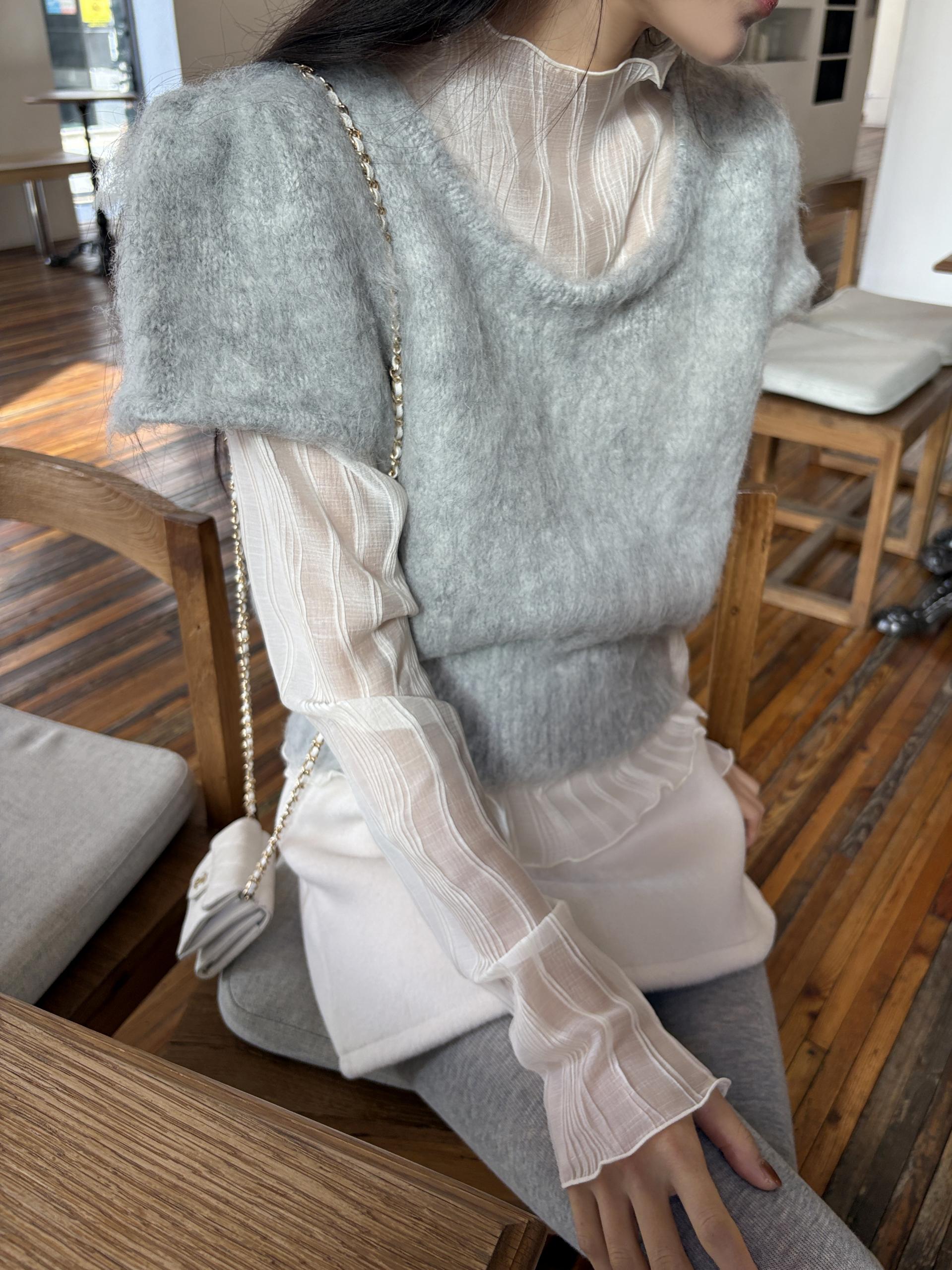 과하지 않고 여성스러운 퍼프소매에 쫀쫀한 밑단 시보리가 부하지 않게 허리 라인을 잡아줍니다. 쇄골 라인을 예쁘게 드러내는 라운드 U넥 디자인으로 단독 착용만으로도 여성스럽고 여리한 분위기를 연출하며, 블라우스나 티셔츠와 레이어드하기도 좋아요.